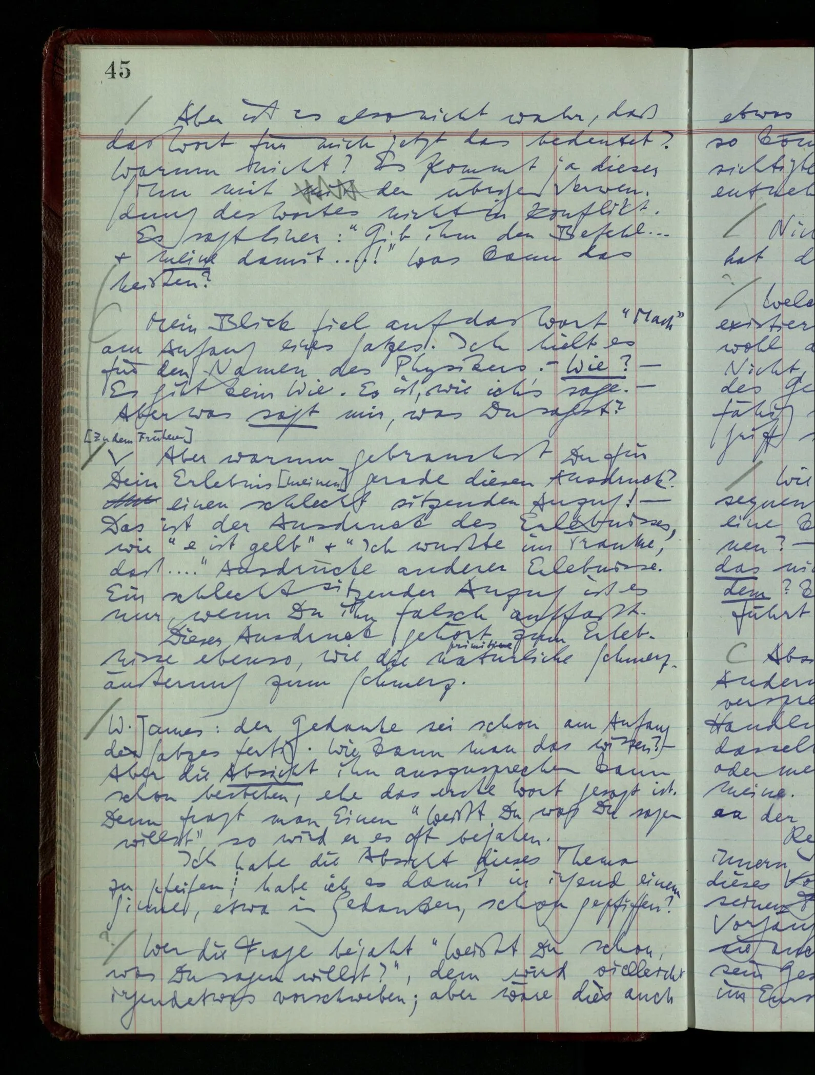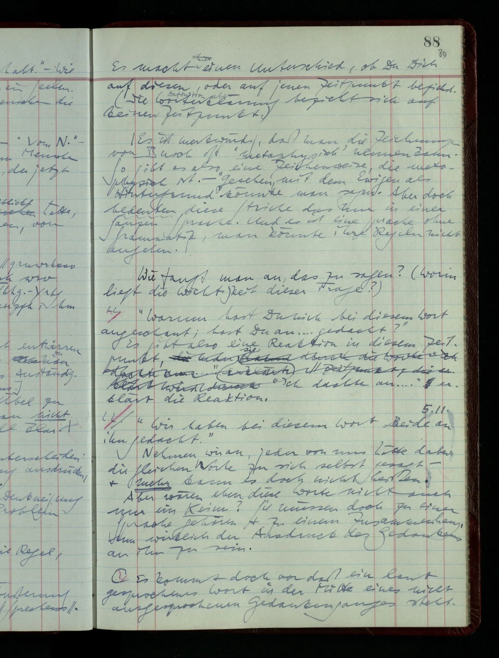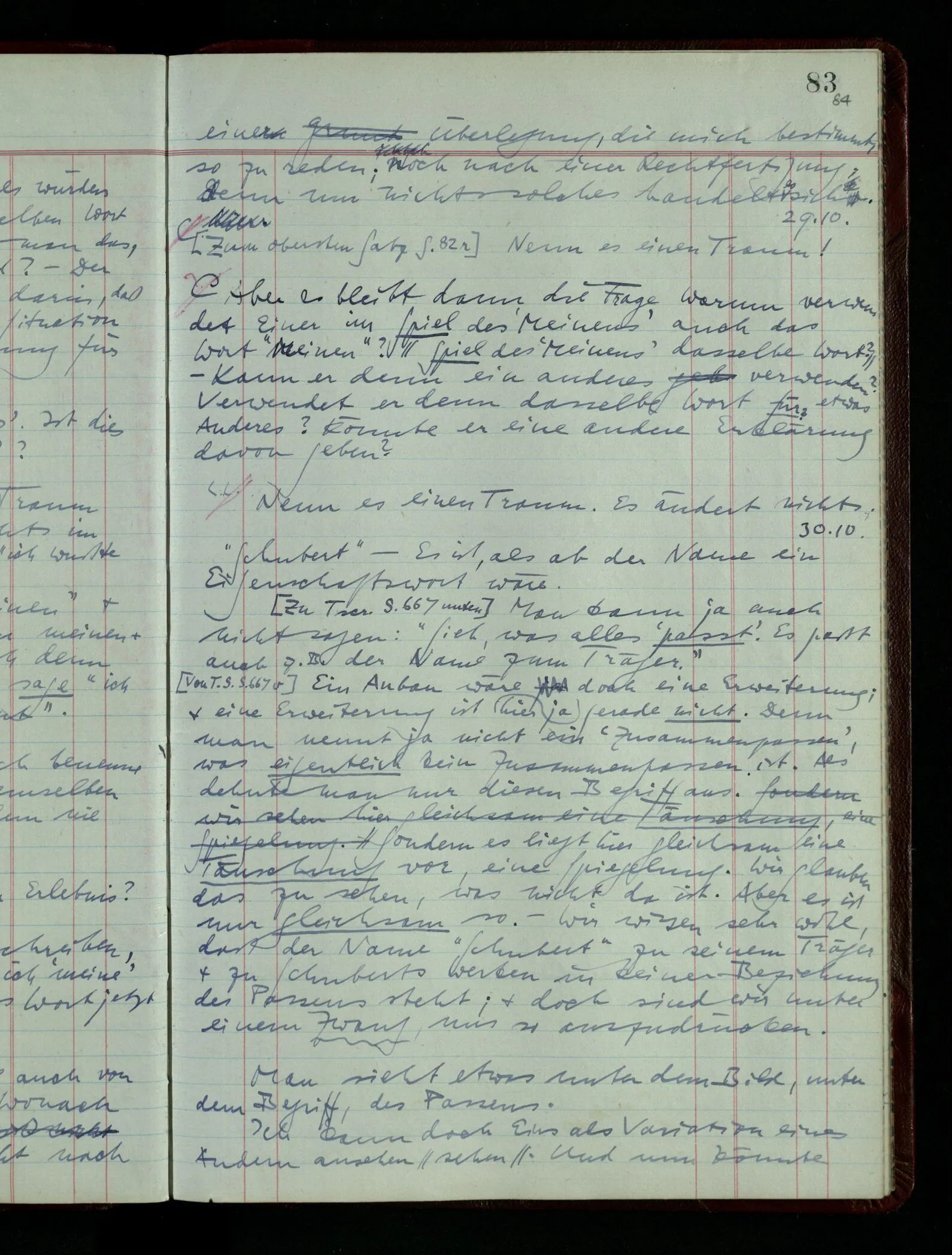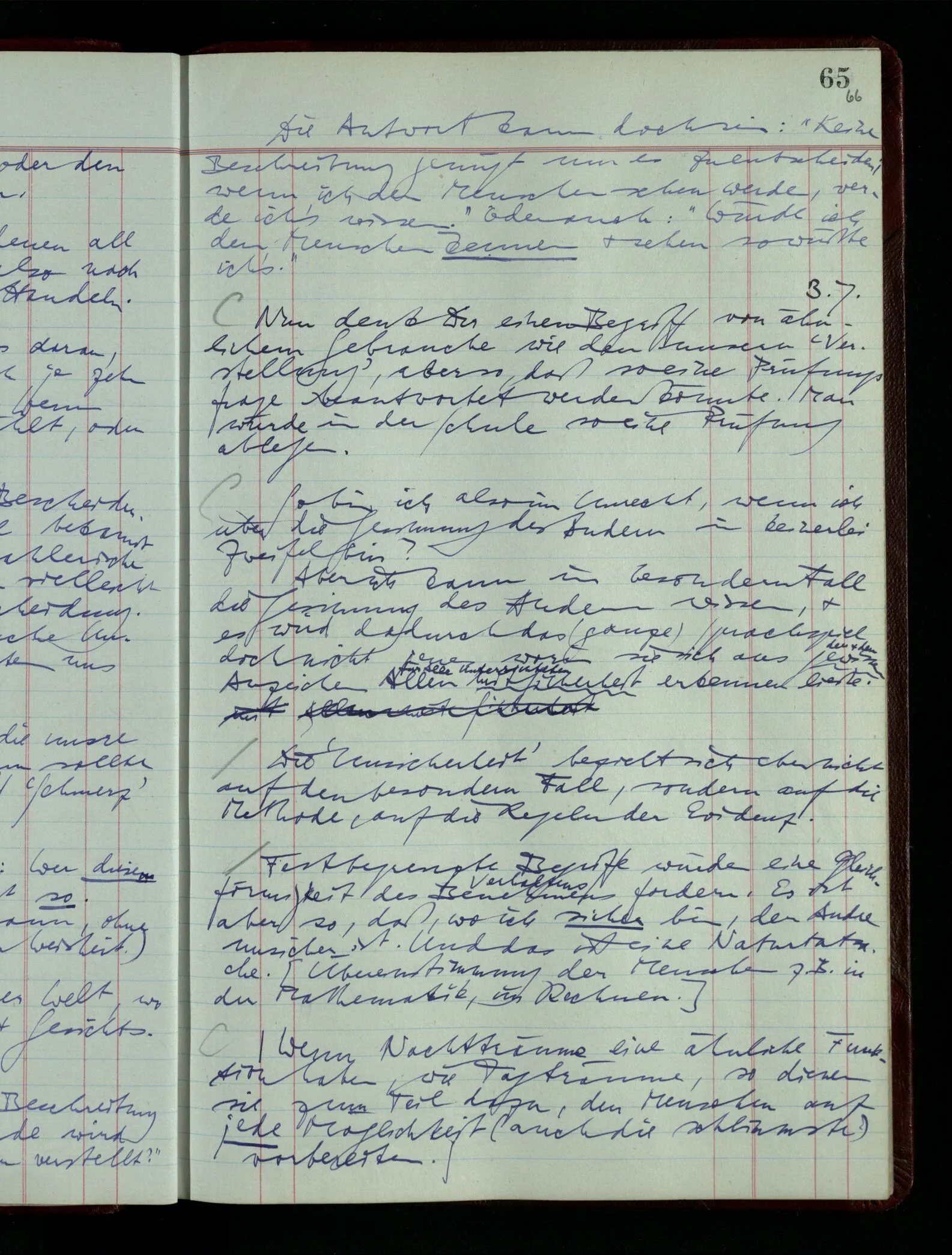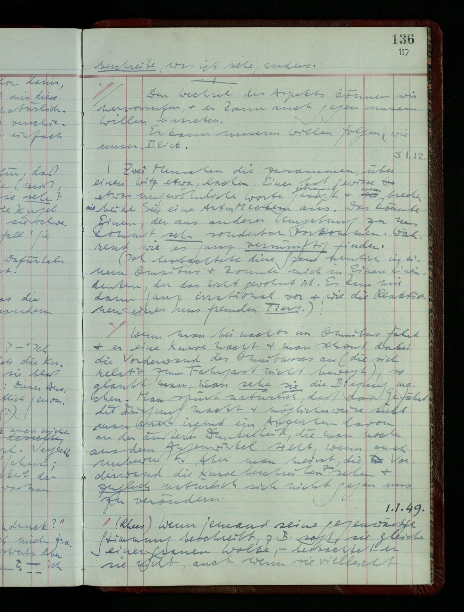 03.02.1948 Denken wir uns, das Ausrufen der Züge auf unsern Bahnhöfen würde durch eine Maschine besorgt, die die Meldungen von draußen erhält & verarbeitet. – Hätte es Sinn wenn sie ausriefe “Ich glaube, der Zug ‥‥‥”? Man könnte es als ein Zeichen einer Unsicherheit der Situation auffassen. Wenn sie aber ausriefe “Der Zug ‥․ wird nun … eintreffen; ich glaube es nicht” – daraus könnten wir gar nichts machen. Wenn ein menschlicher Ausrufer dies sagte, könnte man es so auffassen: “Den Meldungen entsprechend wird der Zug um ‥‥ ankommen, aber ich glaube (vielleicht ohne Grund), daß es nicht geschehen wird.” Der Ausrufer muß also pflichtgemäß das eine ausrufen, sagt aber, inoffiziell, er habe eine Ahnung, es werde nicht geschehen.