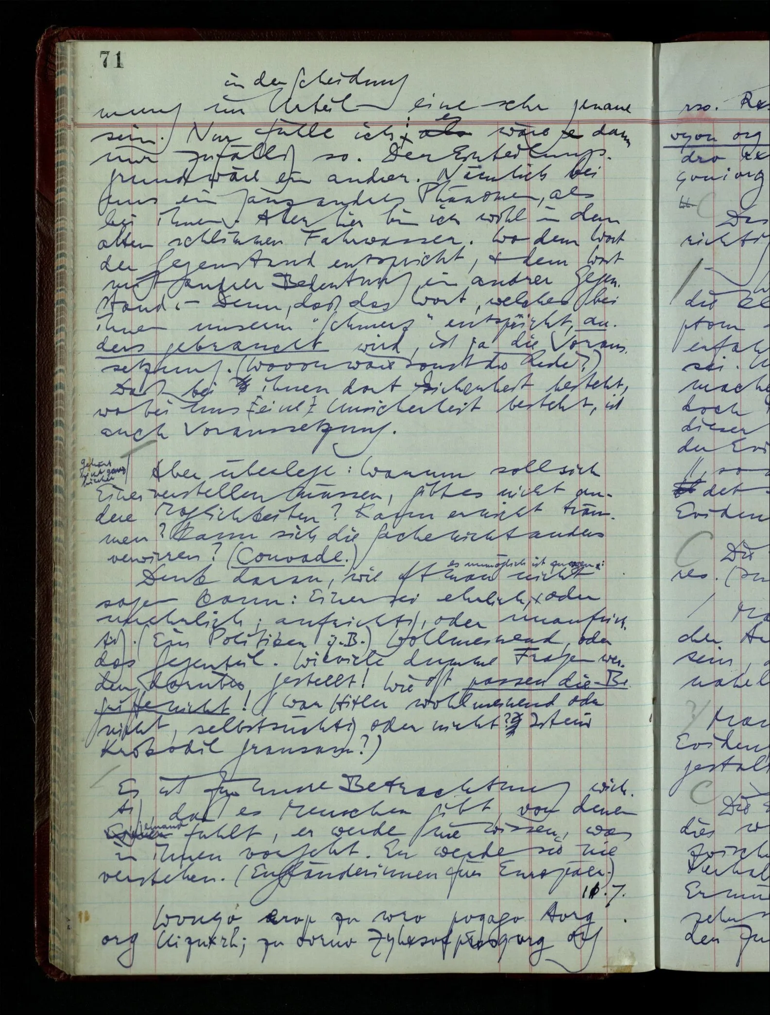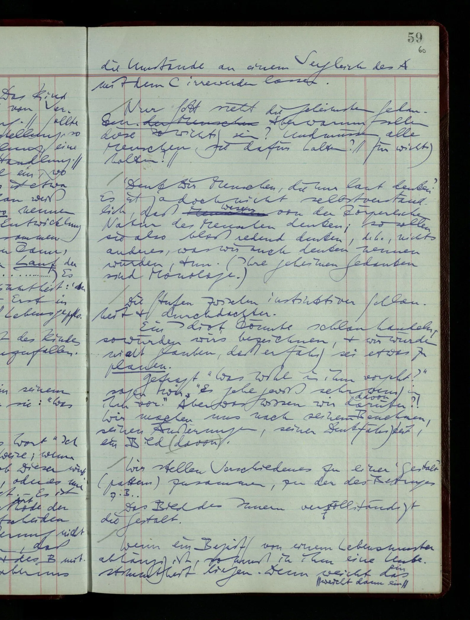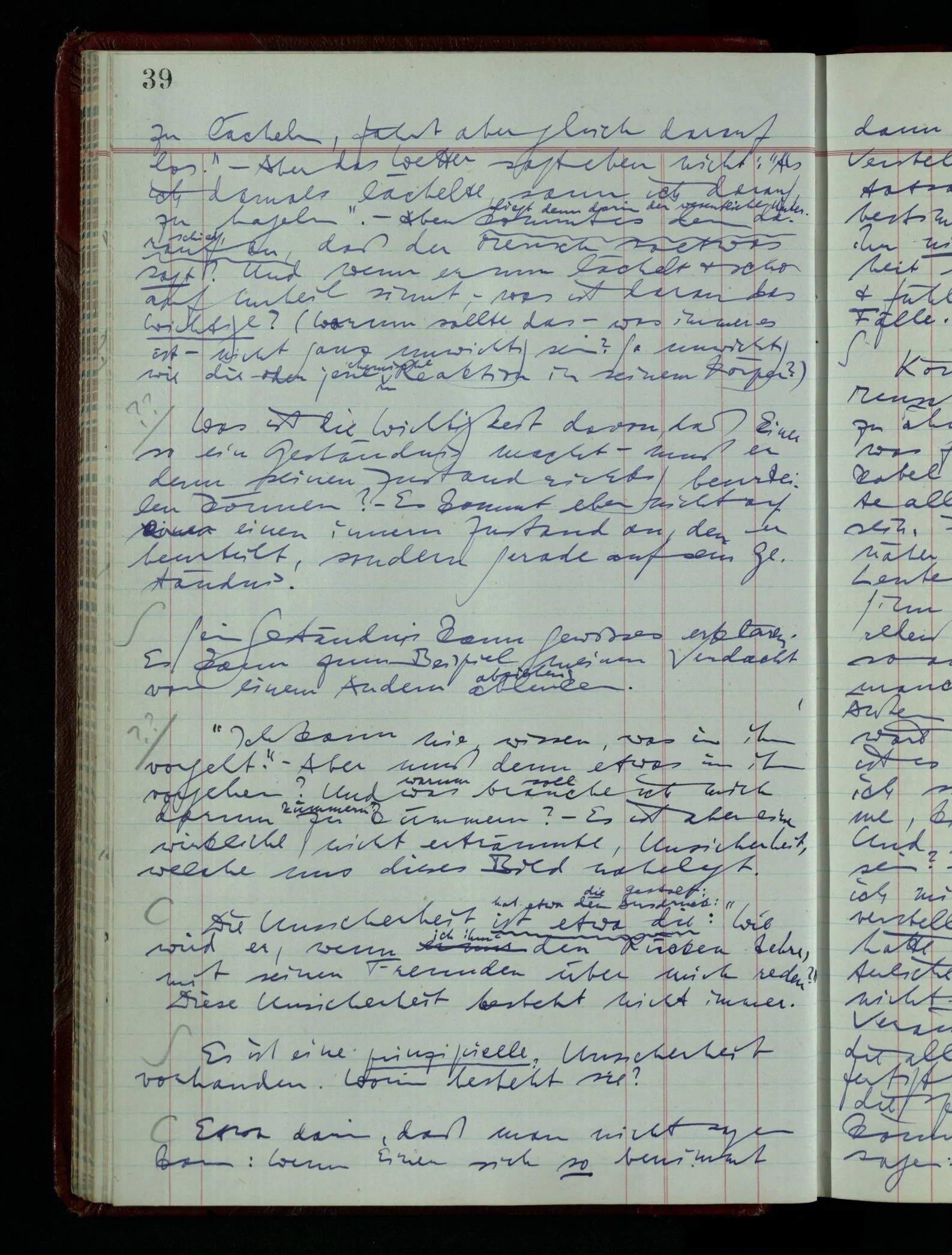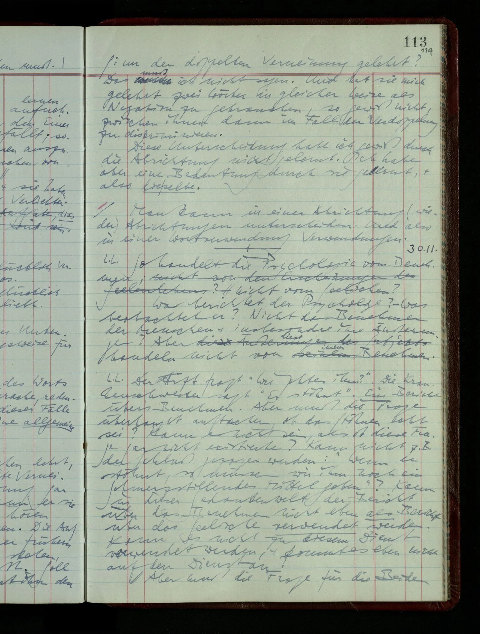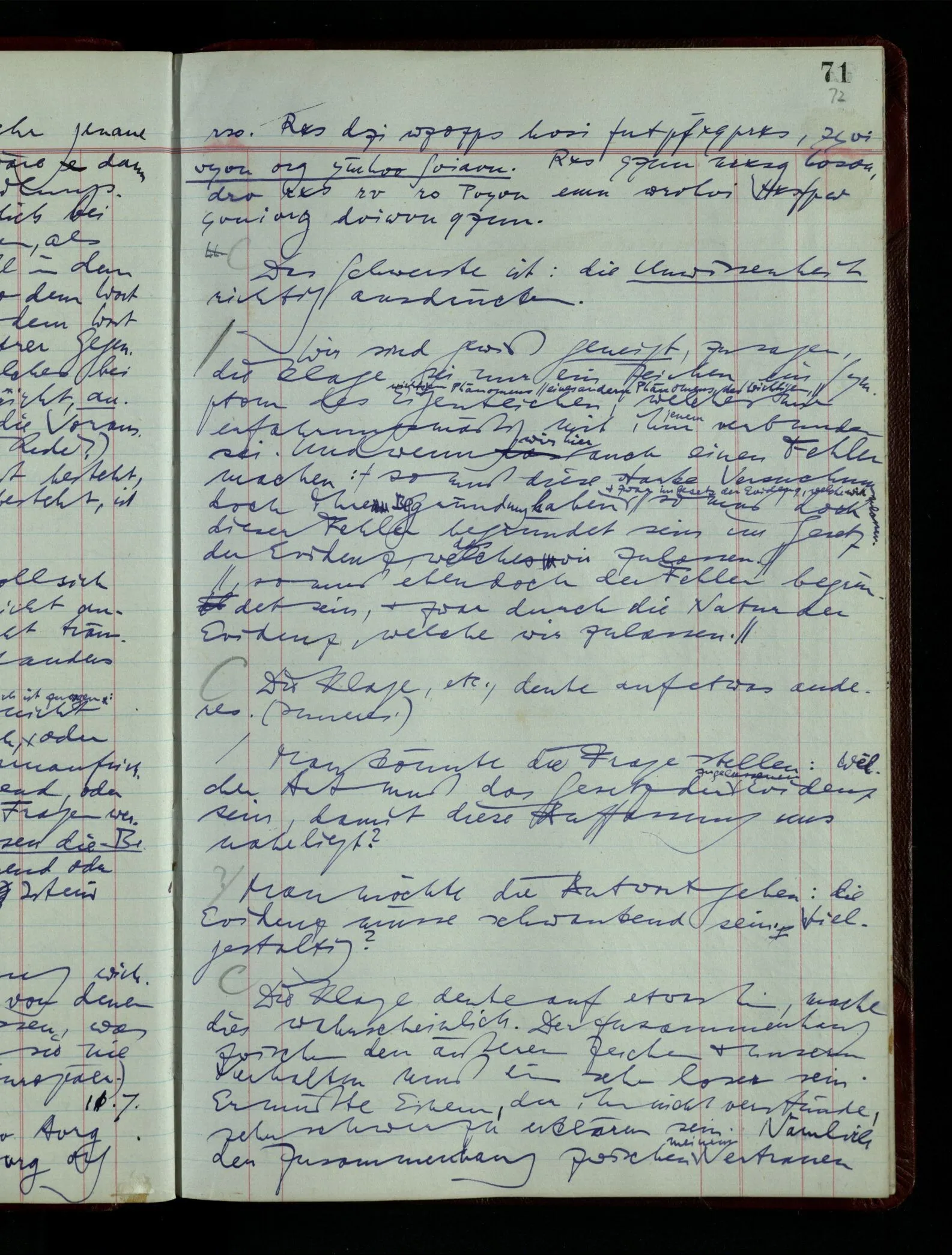 03.02.1948 Denken wir uns, das Ausrufen der Züge auf unsern Bahnhöfen würde durch eine Maschine besorgt, die die Meldungen von draußen erhält & verarbeitet. – Hätte es Sinn wenn sie ausriefe “Ich glaube, der Zug ‥‥‥”? Man könnte es als ein Zeichen einer Unsicherheit der Situation auffassen. Wenn sie aber ausriefe “Der Zug ‥․ wird nun … eintreffen; ich glaube es nicht” – daraus könnten wir gar nichts machen. Wenn ein menschlicher Ausrufer dies sagte, könnte man es so auffassen: “Den Meldungen entsprechend wird der Zug um ‥‥ ankommen, aber ich glaube (vielleicht ohne Grund), daß es nicht geschehen wird.” Der Ausrufer muß also pflichtgemäß das eine ausrufen, sagt aber, inoffiziell, er habe eine Ahnung, es werde nicht geschehen.