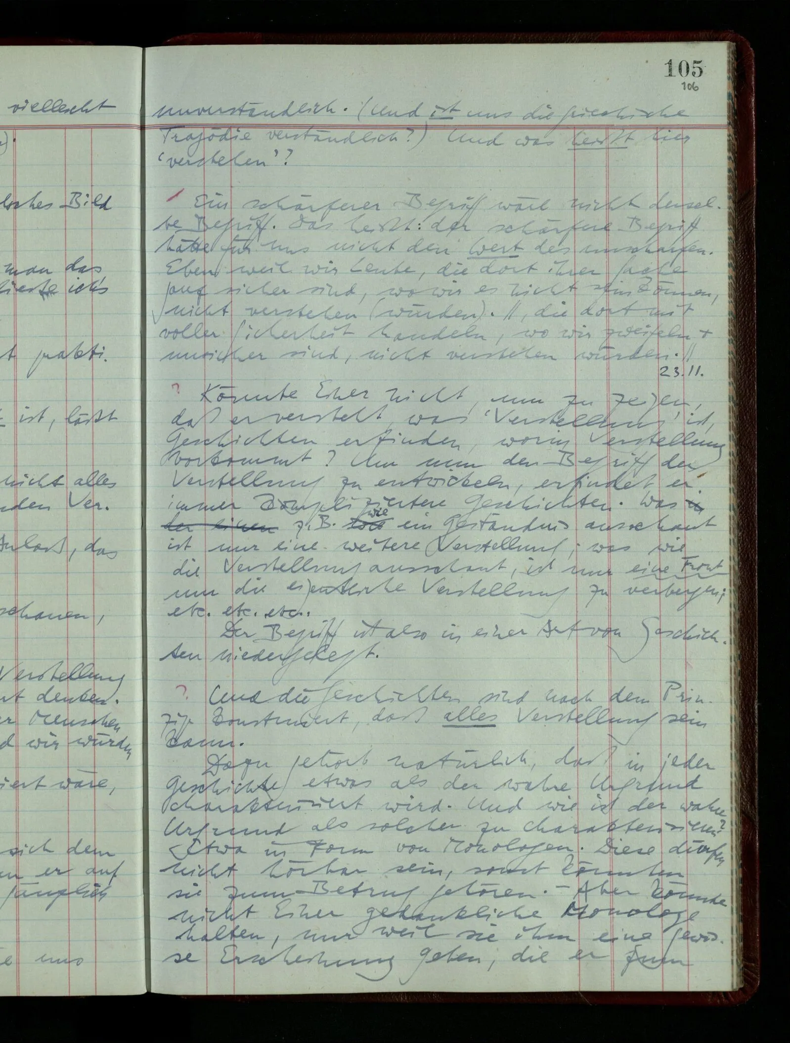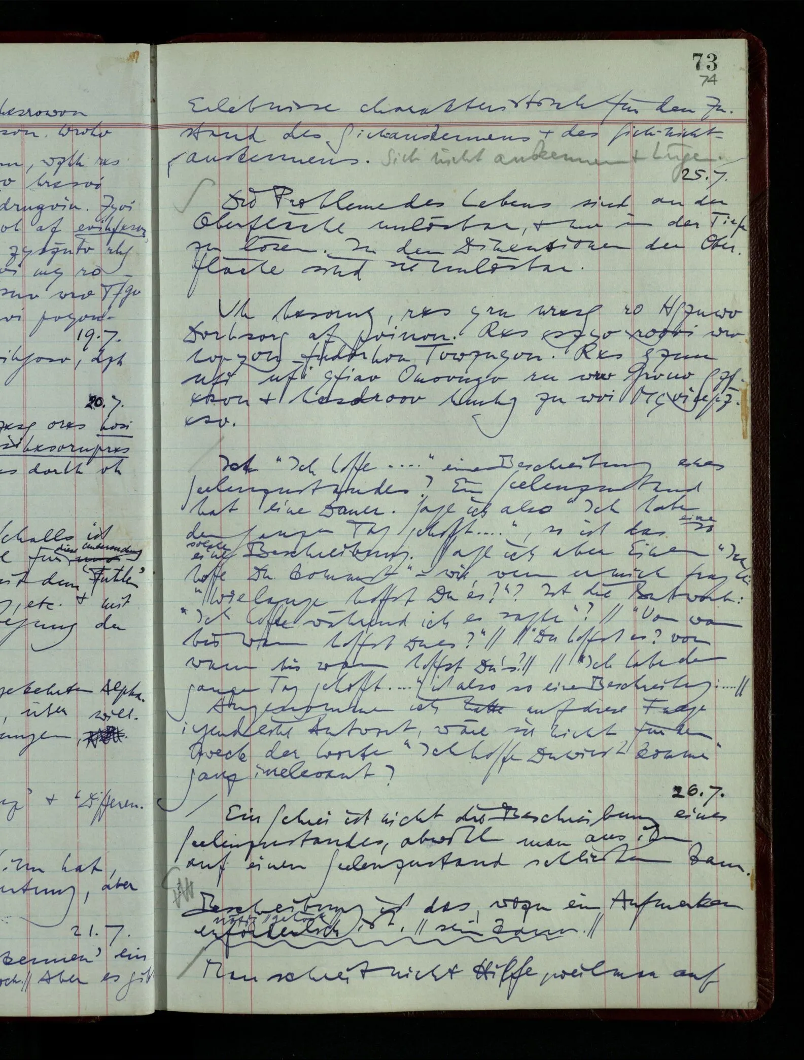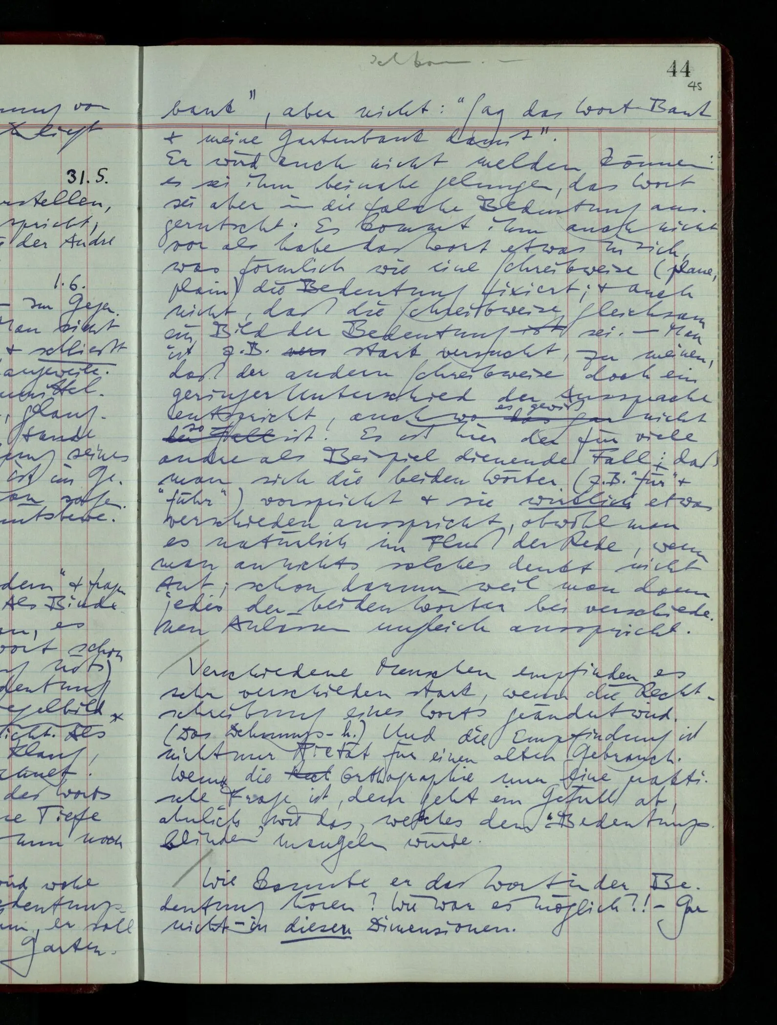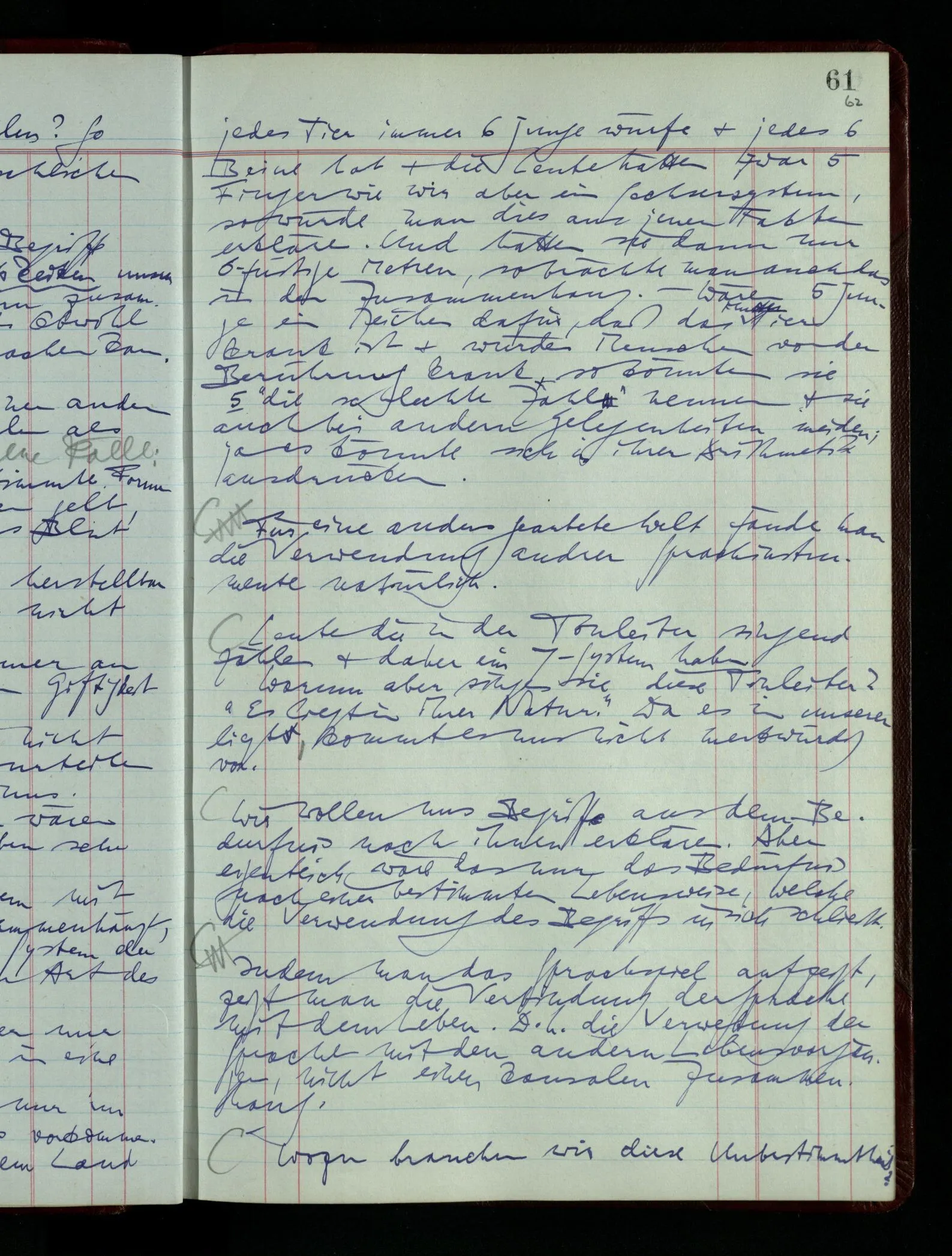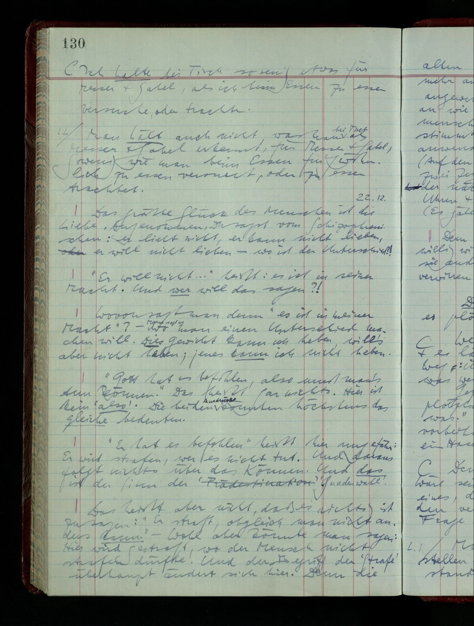 03.02.1948 Denken wir uns, das Ausrufen der Züge auf unsern Bahnhöfen würde durch eine Maschine besorgt, die die Meldungen von draußen erhält & verarbeitet. – Hätte es Sinn wenn sie ausriefe “Ich glaube, der Zug ‥‥‥”? Man könnte es als ein Zeichen einer Unsicherheit der Situation auffassen. Wenn sie aber ausriefe “Der Zug ‥․ wird nun … eintreffen; ich glaube es nicht” – daraus könnten wir gar nichts machen. Wenn ein menschlicher Ausrufer dies sagte, könnte man es so auffassen: “Den Meldungen entsprechend wird der Zug um ‥‥ ankommen, aber ich glaube (vielleicht ohne Grund), daß es nicht geschehen wird.” Der Ausrufer muß also pflichtgemäß das eine ausrufen, sagt aber, inoffiziell, er habe eine Ahnung, es werde nicht geschehen.