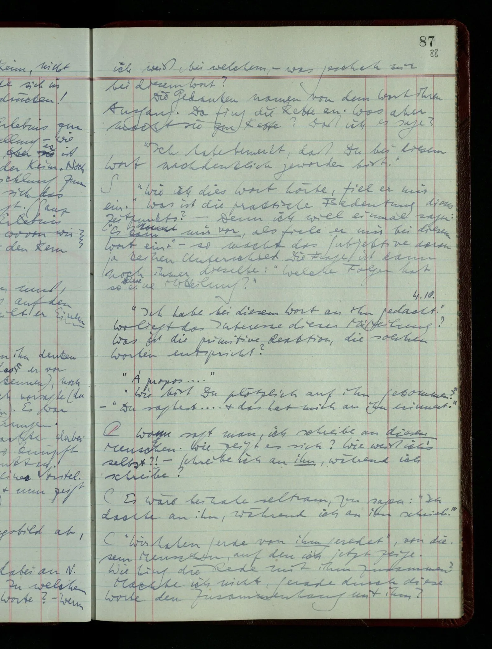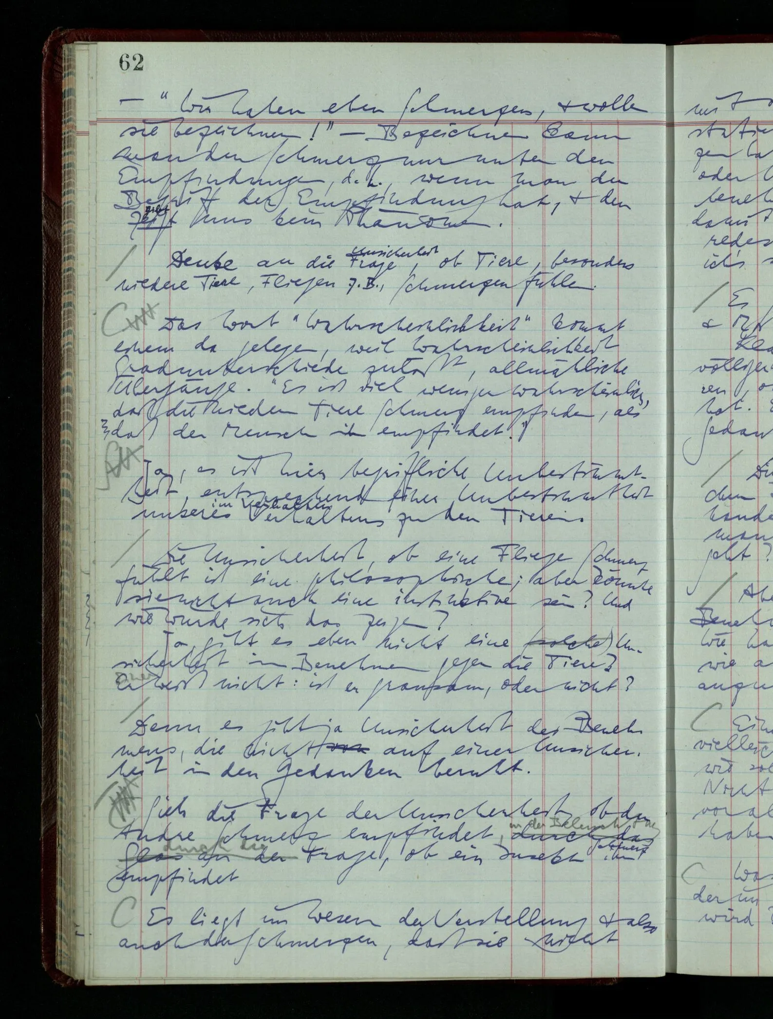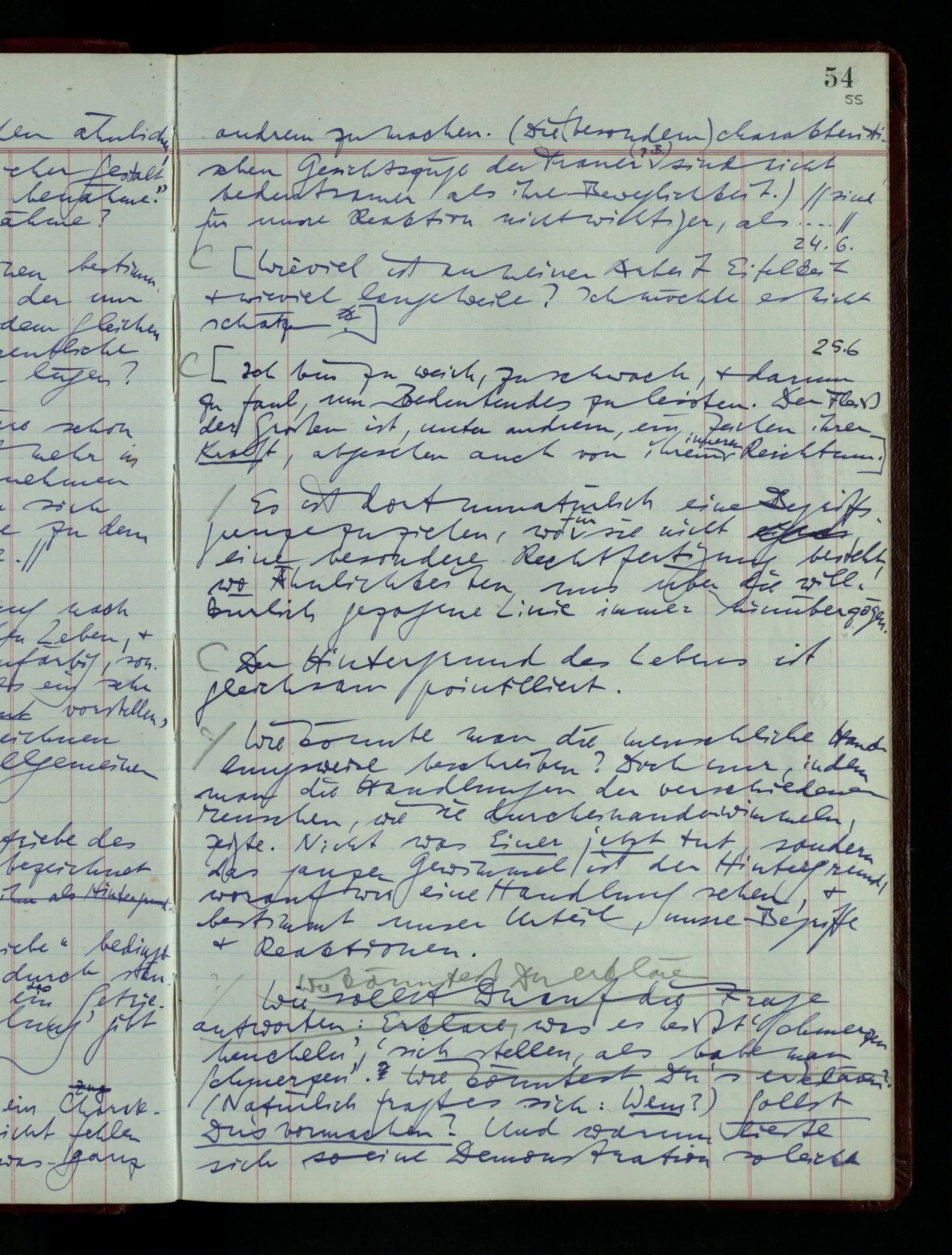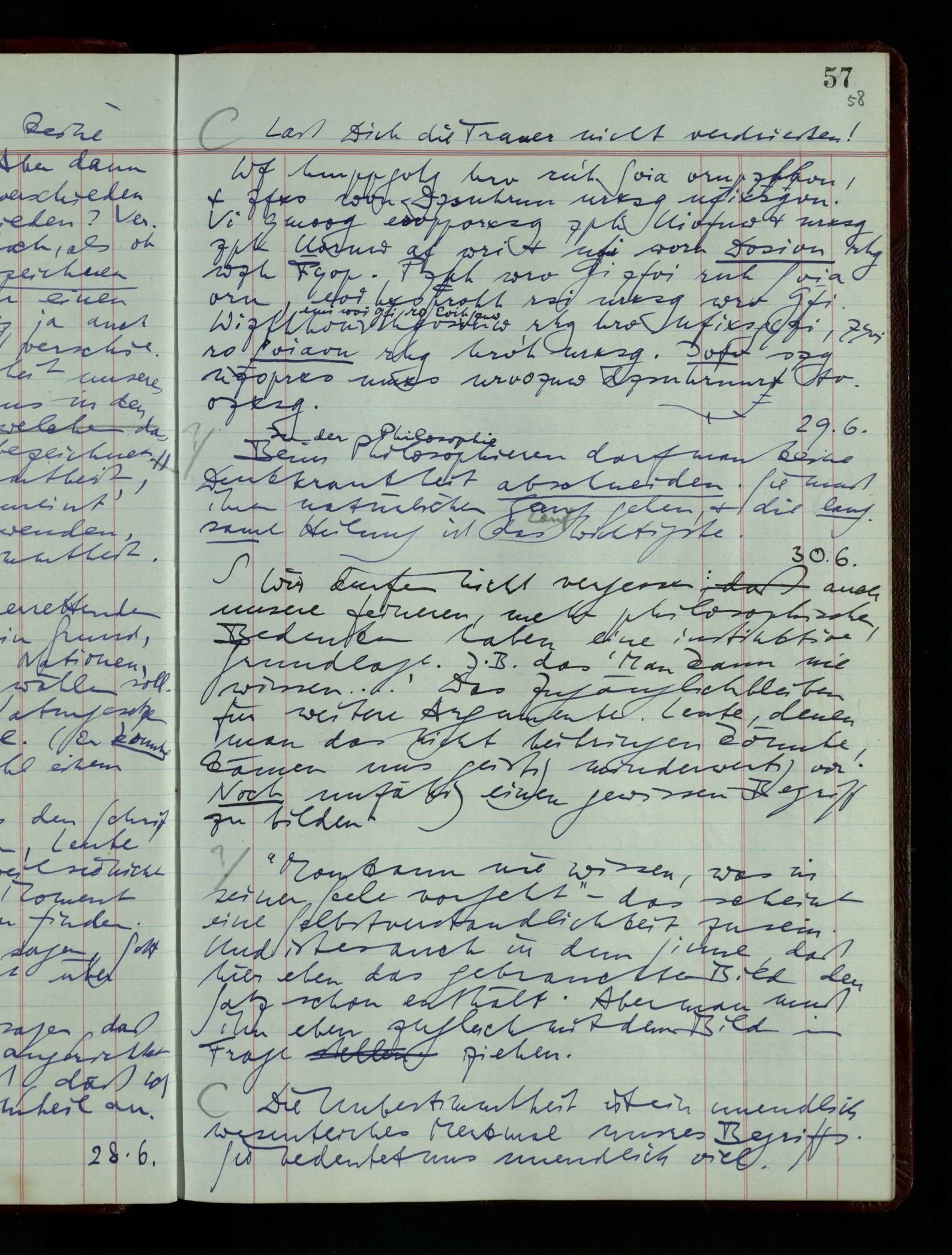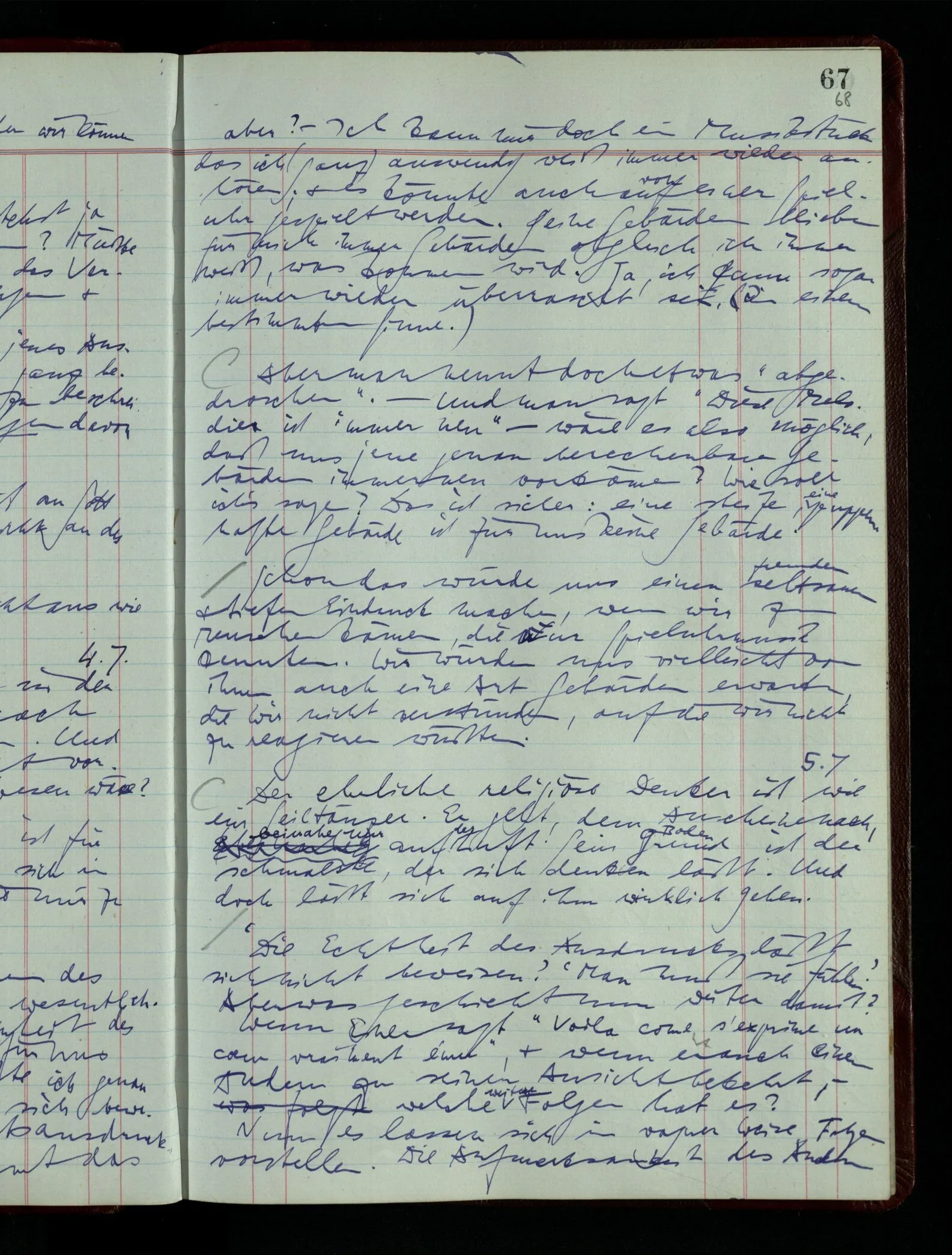 03.02.1948 Denken wir uns, das Ausrufen der Züge auf unsern Bahnhöfen würde durch eine Maschine besorgt, die die Meldungen von draußen erhält & verarbeitet. – Hätte es Sinn wenn sie ausriefe “Ich glaube, der Zug ‥‥‥”? Man könnte es als ein Zeichen einer Unsicherheit der Situation auffassen. Wenn sie aber ausriefe “Der Zug ‥․ wird nun … eintreffen; ich glaube es nicht” – daraus könnten wir gar nichts machen. Wenn ein menschlicher Ausrufer dies sagte, könnte man es so auffassen: “Den Meldungen entsprechend wird der Zug um ‥‥ ankommen, aber ich glaube (vielleicht ohne Grund), daß es nicht geschehen wird.” Der Ausrufer muß also pflichtgemäß das eine ausrufen, sagt aber, inoffiziell, er habe eine Ahnung, es werde nicht geschehen.