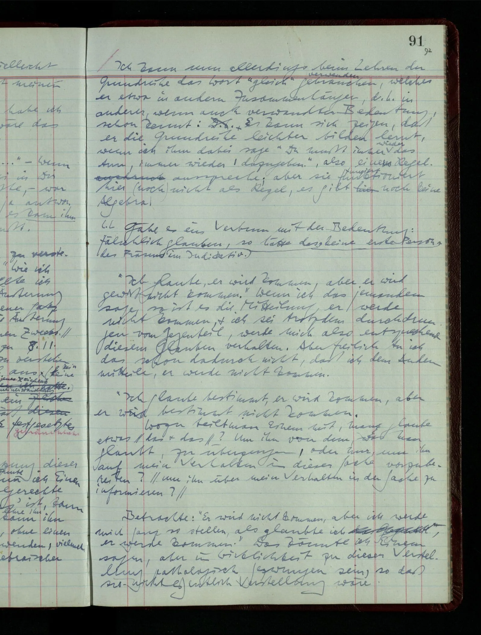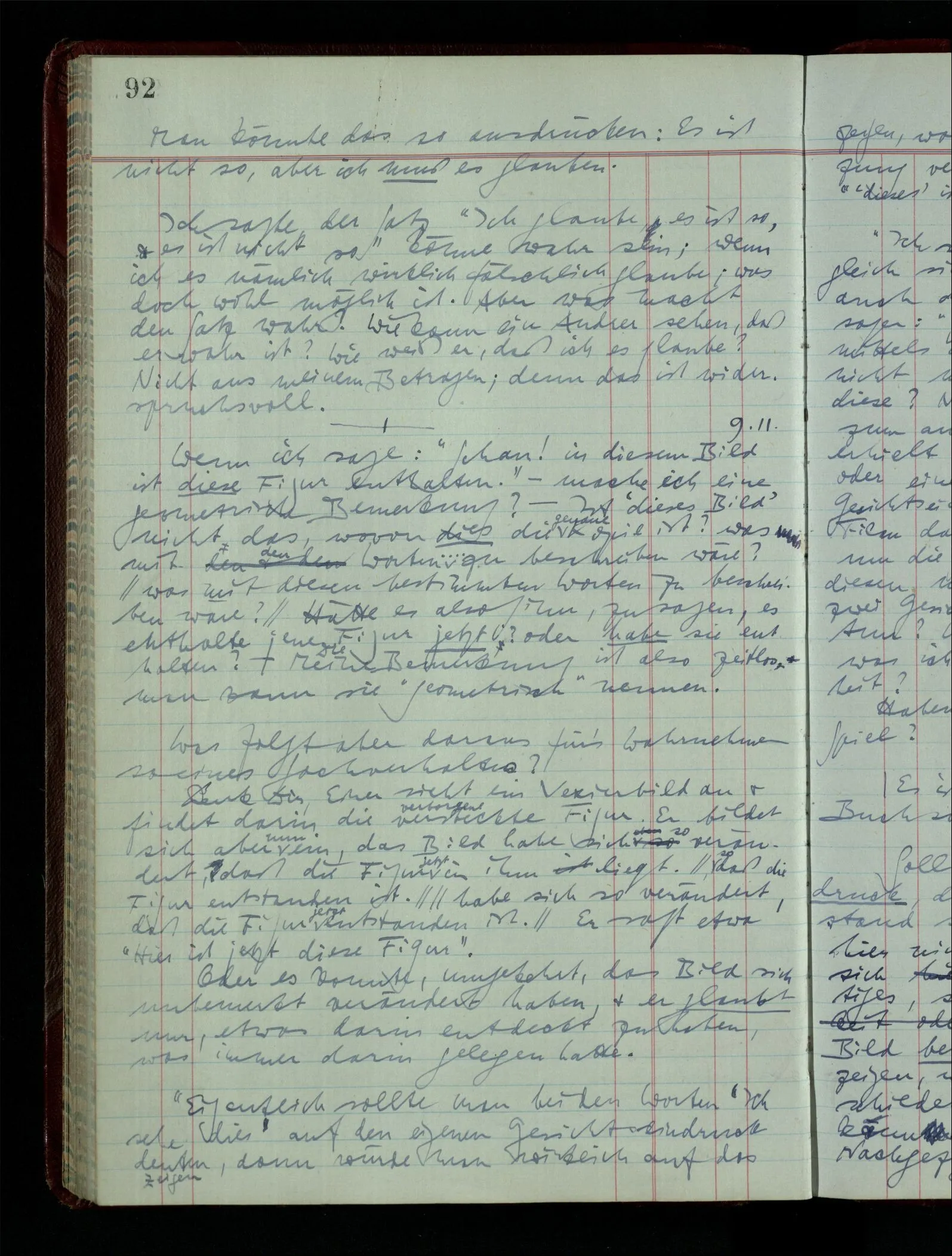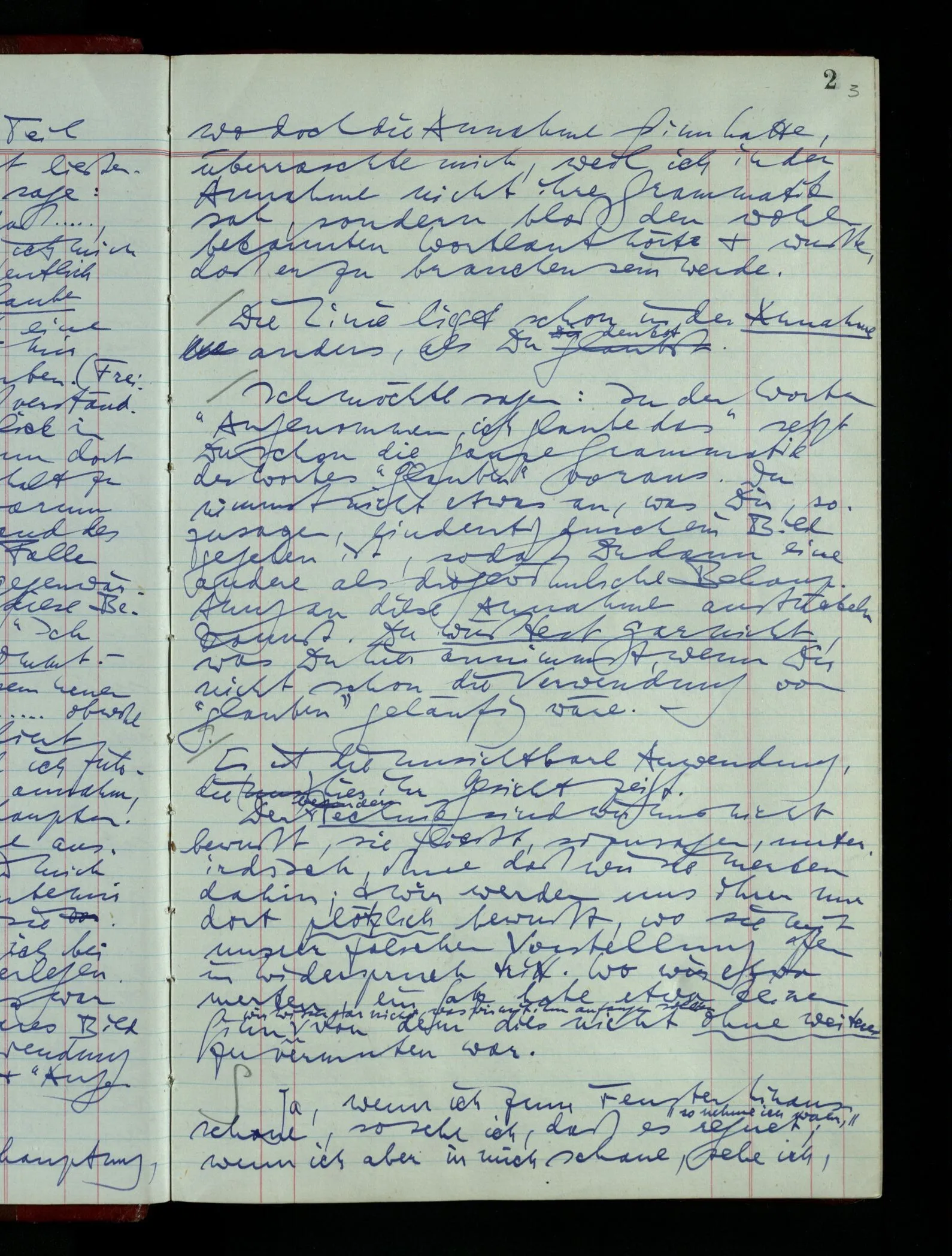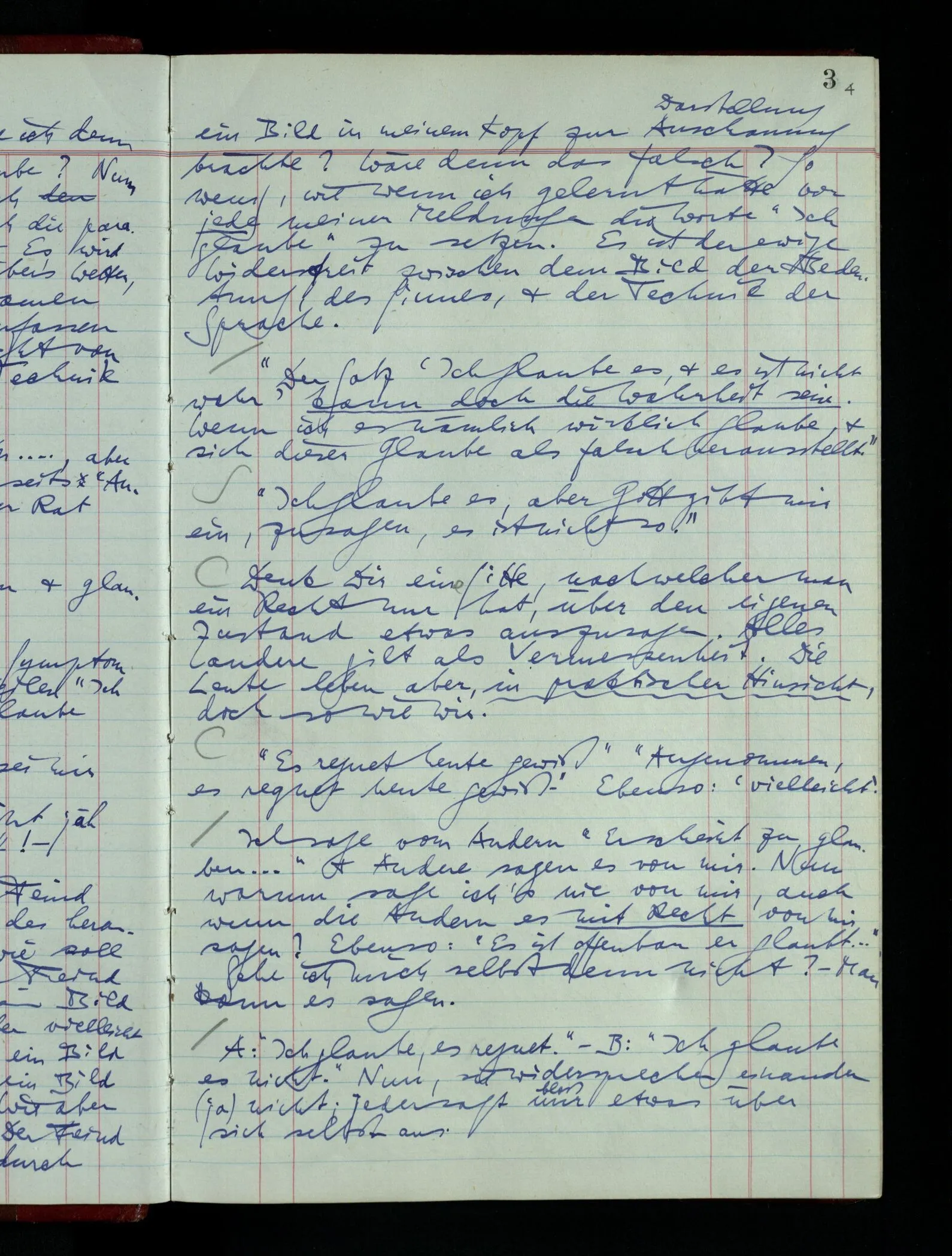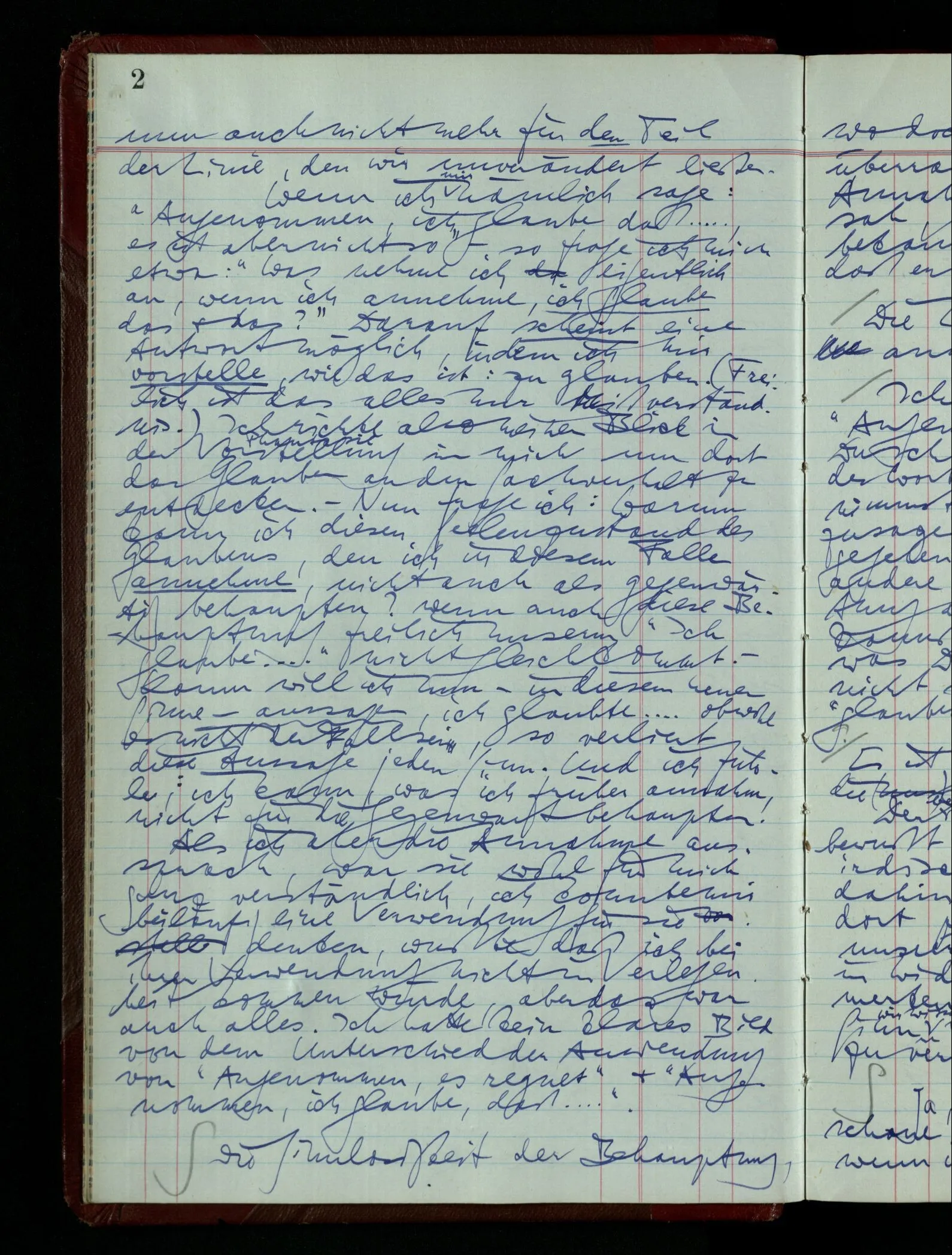 Was ich sagen will, fällt mir sehr schwer auszudrücken: Das ist unser Begriff vom ‘glauben’ – so setzen wir die Linie von der Annahme zur Behauptung fort. Nun versuchen wir eine andere Fortsetzung, wir verändern die Linie des Begriffs & sagen nun “Das ist ja garnicht mehr derselbe!” Das heißt: das Wort “glauben” paßt nun auch nicht mehr für den Teil der Linie, den wir unverändert ließen. Wenn ich mir nämlich sage: “Angenommen, ich glaube daß ‥‥․, es ist aber nicht so” –, so frage ich mich etwa: “Was nehme ich eigentlich an, wenn ich annehme, ich glaube das & das?” Darauf scheint eine Antwort möglich, indem ich mir vorstelle, wie das ist: zu glauben. (Freilich ist das alles nur Mißverständnis) Ich richte also meinen Blick in der Vorstellung in mich um dort das Glauben an den Sachverhalt zu entdecken. – Nun frage ich: Warum kann ich diesen Seelenzustand des Glaubens, den ich in diesem Falle annehme, nicht auch als gegenwärtig behaupten? wenn auch diese Behauptung freilich unserm “Ich glaube ‥‥” nicht gleichkommt. – Kaum will ich nun – in diesem neuen Sinne – aussagen, ich glaubte‥‥ obwohl es nicht der Fall sei, so verliert diese Aussage jeden Sinn. Und ich fühle, ich kann, was ich früher annahm, nicht für die Gegenwart behaupten. Als ich aber die Annahme aussprach, war sie wohl für mich ganz verständlich, ich konnte mir beiläufig eine Verwendung für sie denken, wußte daß ich bei ihrer Verwendung nicht in Verlegenheit kommen würde, aber das war auch alles. Ich hatte kein klares Bild von dem Unterschied der Anwendung von “Angenommen, es regnet” & “Angenommen, ich glaube, daß ‥‥”.