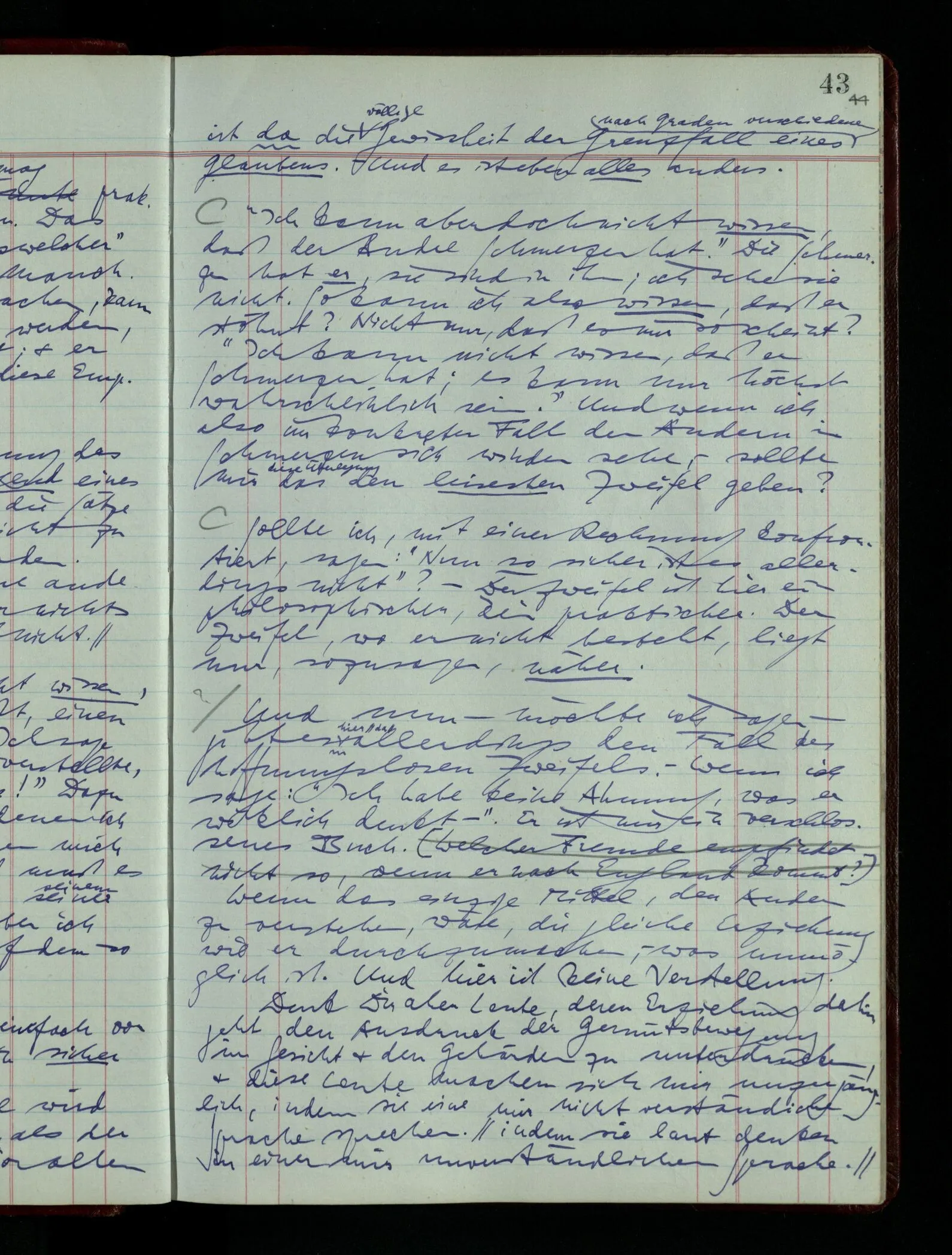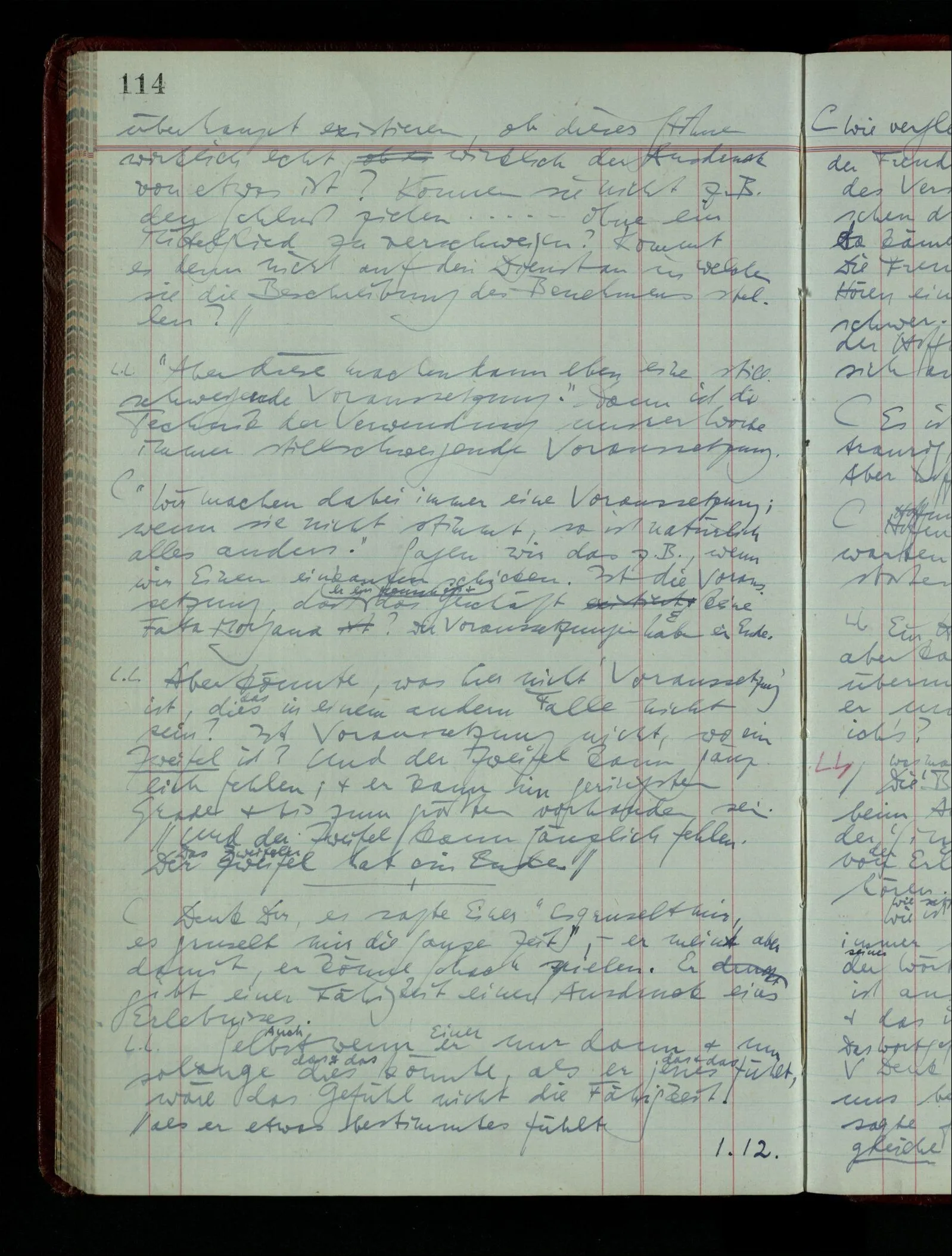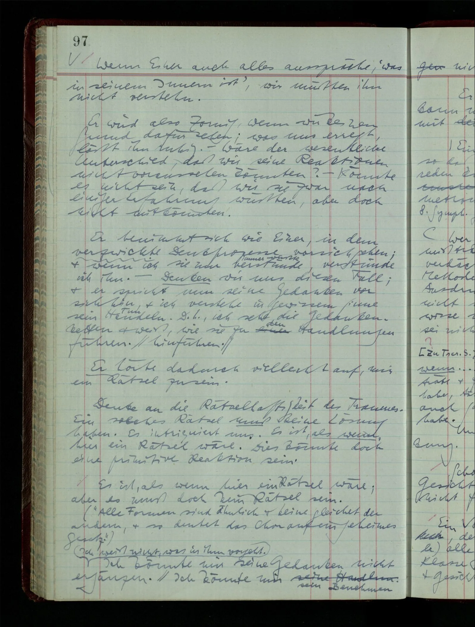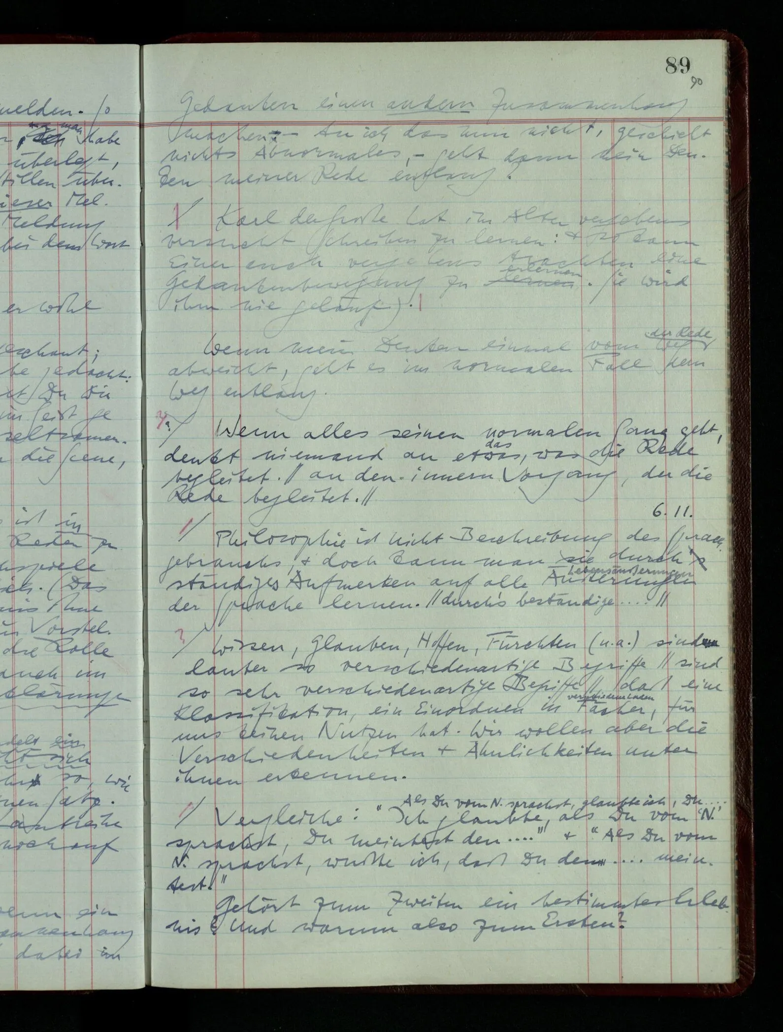 Was ich sagen will, fällt mir sehr schwer auszudrücken: Das ist unser Begriff vom ‘glauben’ – so setzen wir die Linie von der Annahme zur Behauptung fort. Nun versuchen wir eine andere Fortsetzung, wir verändern die Linie des Begriffs & sagen nun “Das ist ja garnicht mehr derselbe!” Das heißt: das Wort “glauben” paßt nun auch nicht mehr für den Teil der Linie, den wir unverändert ließen. Wenn ich mir nämlich sage: “Angenommen, ich glaube daß ‥‥․, es ist aber nicht so” –, so frage ich mich etwa: “Was nehme ich eigentlich an, wenn ich annehme, ich glaube das & das?” Darauf scheint eine Antwort möglich, indem ich mir vorstelle, wie das ist: zu glauben. (Freilich ist das alles nur Mißverständnis) Ich richte also meinen Blick in der Vorstellung in mich um dort das Glauben an den Sachverhalt zu entdecken. – Nun frage ich: Warum kann ich diesen Seelenzustand des Glaubens, den ich in diesem Falle annehme, nicht auch als gegenwärtig behaupten? wenn auch diese Behauptung freilich unserm “Ich glaube ‥‥” nicht gleichkommt. – Kaum will ich nun – in diesem neuen Sinne – aussagen, ich glaubte‥‥ obwohl es nicht der Fall sei, so verliert diese Aussage jeden Sinn. Und ich fühle, ich kann, was ich früher annahm, nicht für die Gegenwart behaupten. Als ich aber die Annahme aussprach, war sie wohl für mich ganz verständlich, ich konnte mir beiläufig eine Verwendung für sie denken, wußte daß ich bei ihrer Verwendung nicht in Verlegenheit kommen würde, aber das war auch alles. Ich hatte kein klares Bild von dem Unterschied der Anwendung von “Angenommen, es regnet” & “Angenommen, ich glaube, daß ‥‥”.