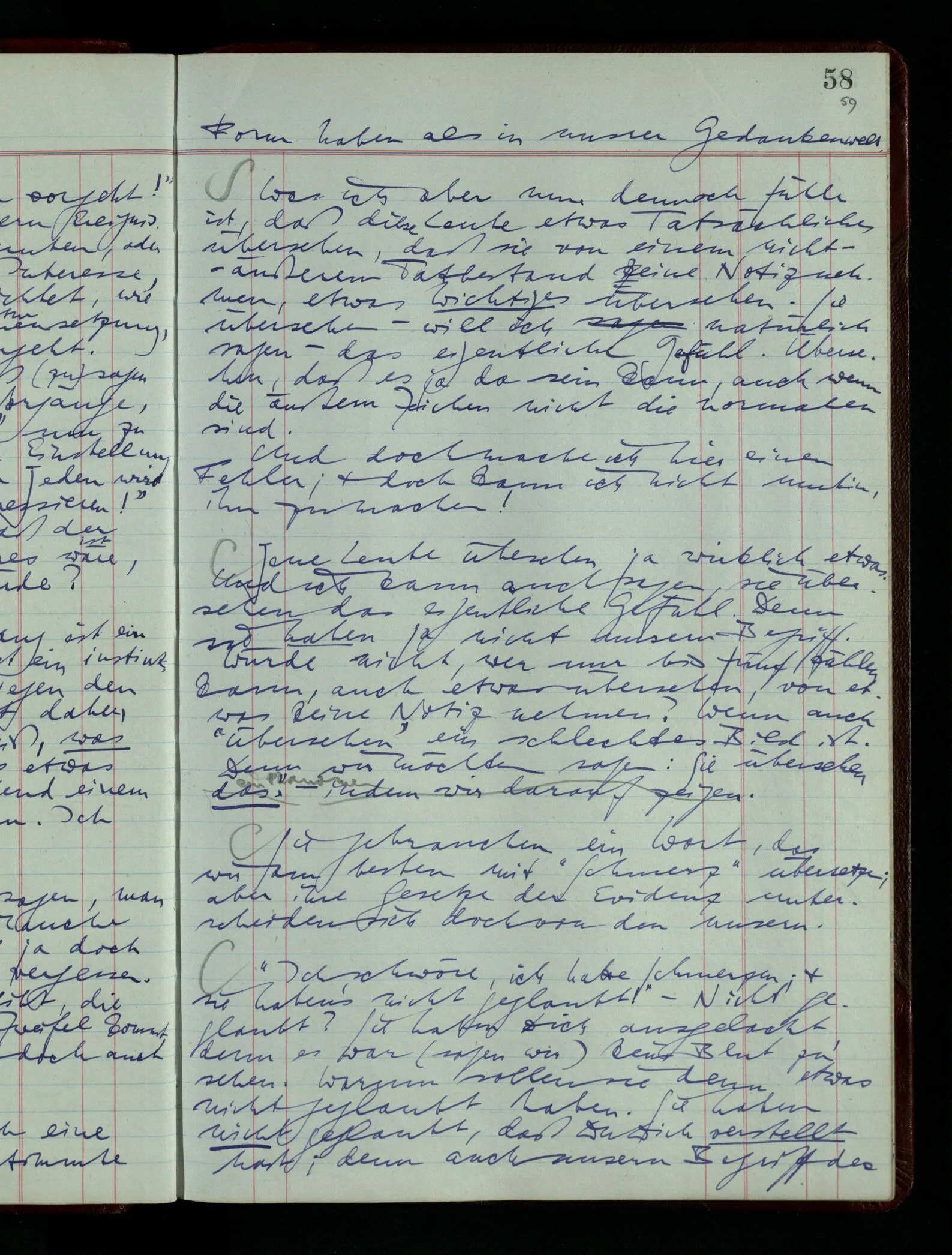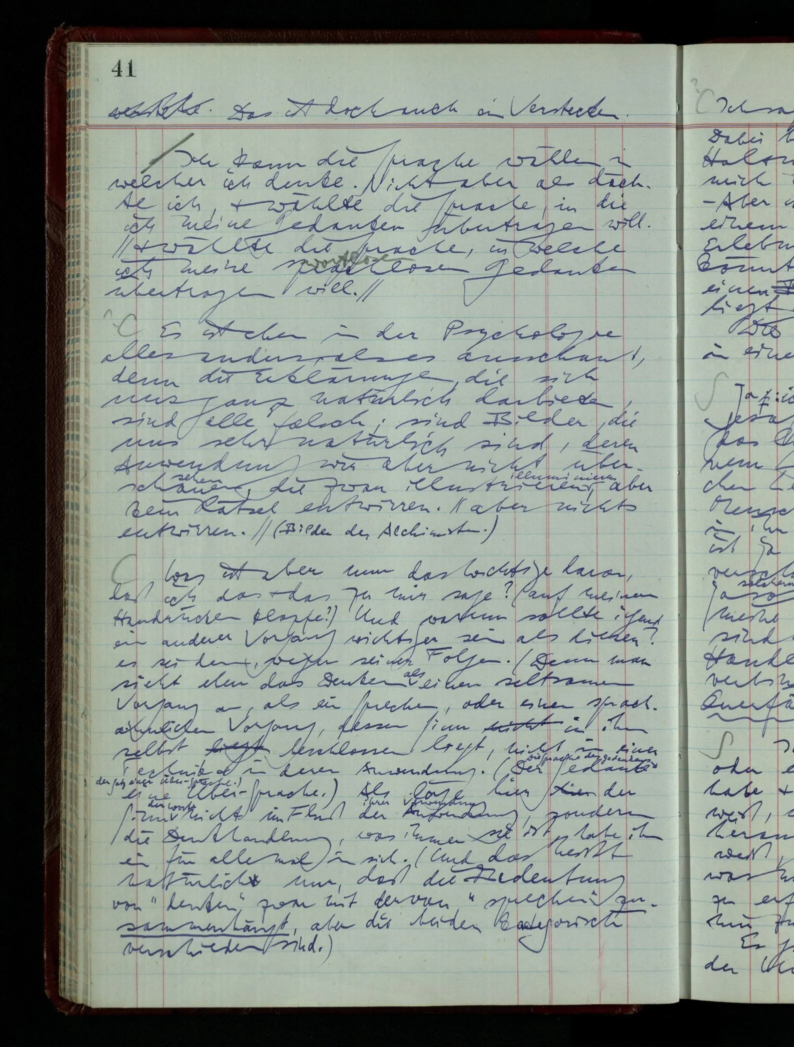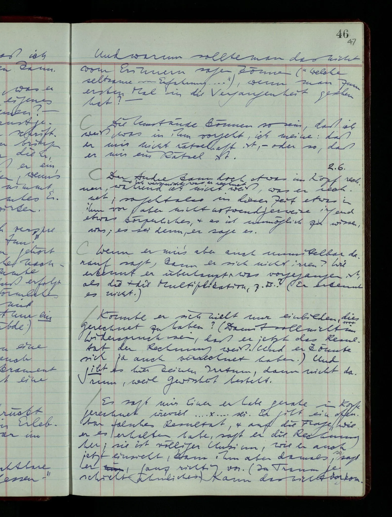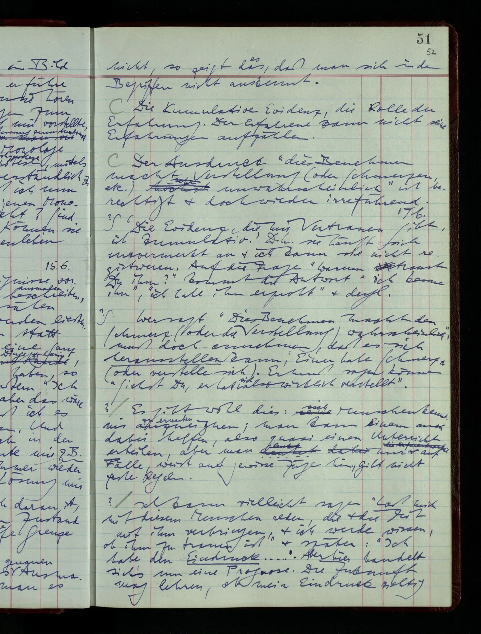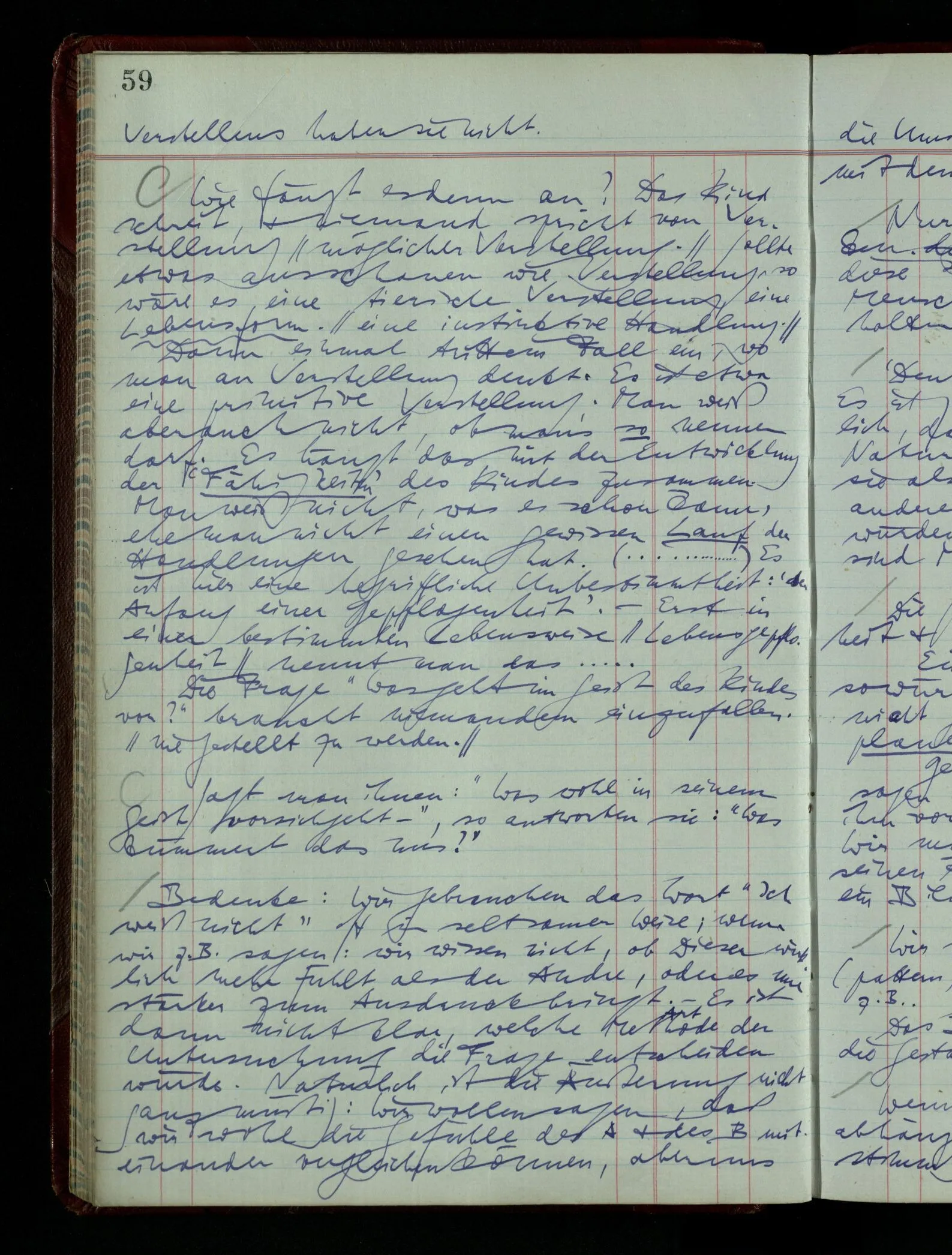 Was ich sagen will, fällt mir sehr schwer auszudrücken: Das ist unser Begriff vom ‘glauben’ – so setzen wir die Linie von der Annahme zur Behauptung fort. Nun versuchen wir eine andere Fortsetzung, wir verändern die Linie des Begriffs & sagen nun “Das ist ja garnicht mehr derselbe!” Das heißt: das Wort “glauben” paßt nun auch nicht mehr für den Teil der Linie, den wir unverändert ließen. Wenn ich mir nämlich sage: “Angenommen, ich glaube daß ‥‥․, es ist aber nicht so” –, so frage ich mich etwa: “Was nehme ich eigentlich an, wenn ich annehme, ich glaube das & das?” Darauf scheint eine Antwort möglich, indem ich mir vorstelle, wie das ist: zu glauben. (Freilich ist das alles nur Mißverständnis) Ich richte also meinen Blick in der Vorstellung in mich um dort das Glauben an den Sachverhalt zu entdecken. – Nun frage ich: Warum kann ich diesen Seelenzustand des Glaubens, den ich in diesem Falle annehme, nicht auch als gegenwärtig behaupten? wenn auch diese Behauptung freilich unserm “Ich glaube ‥‥” nicht gleichkommt. – Kaum will ich nun – in diesem neuen Sinne – aussagen, ich glaubte‥‥ obwohl es nicht der Fall sei, so verliert diese Aussage jeden Sinn. Und ich fühle, ich kann, was ich früher annahm, nicht für die Gegenwart behaupten. Als ich aber die Annahme aussprach, war sie wohl für mich ganz verständlich, ich konnte mir beiläufig eine Verwendung für sie denken, wußte daß ich bei ihrer Verwendung nicht in Verlegenheit kommen würde, aber das war auch alles. Ich hatte kein klares Bild von dem Unterschied der Anwendung von “Angenommen, es regnet” & “Angenommen, ich glaube, daß ‥‥”.
