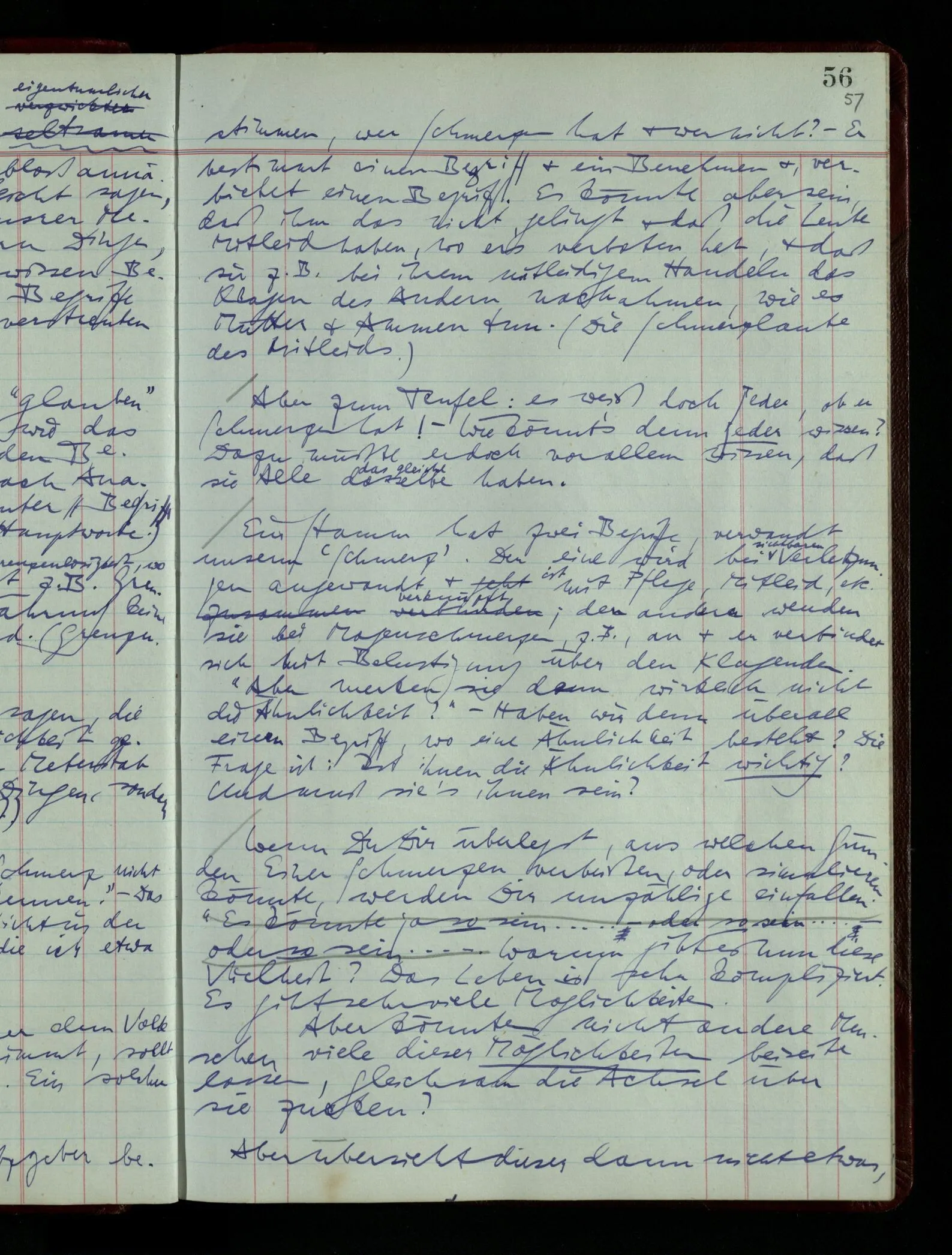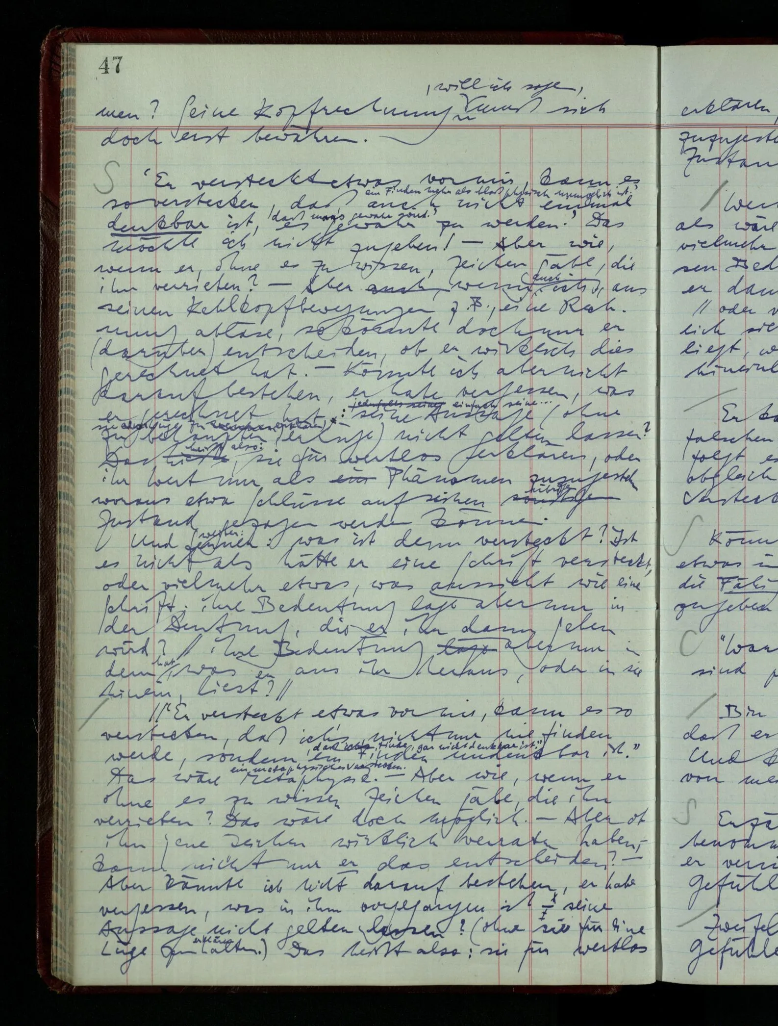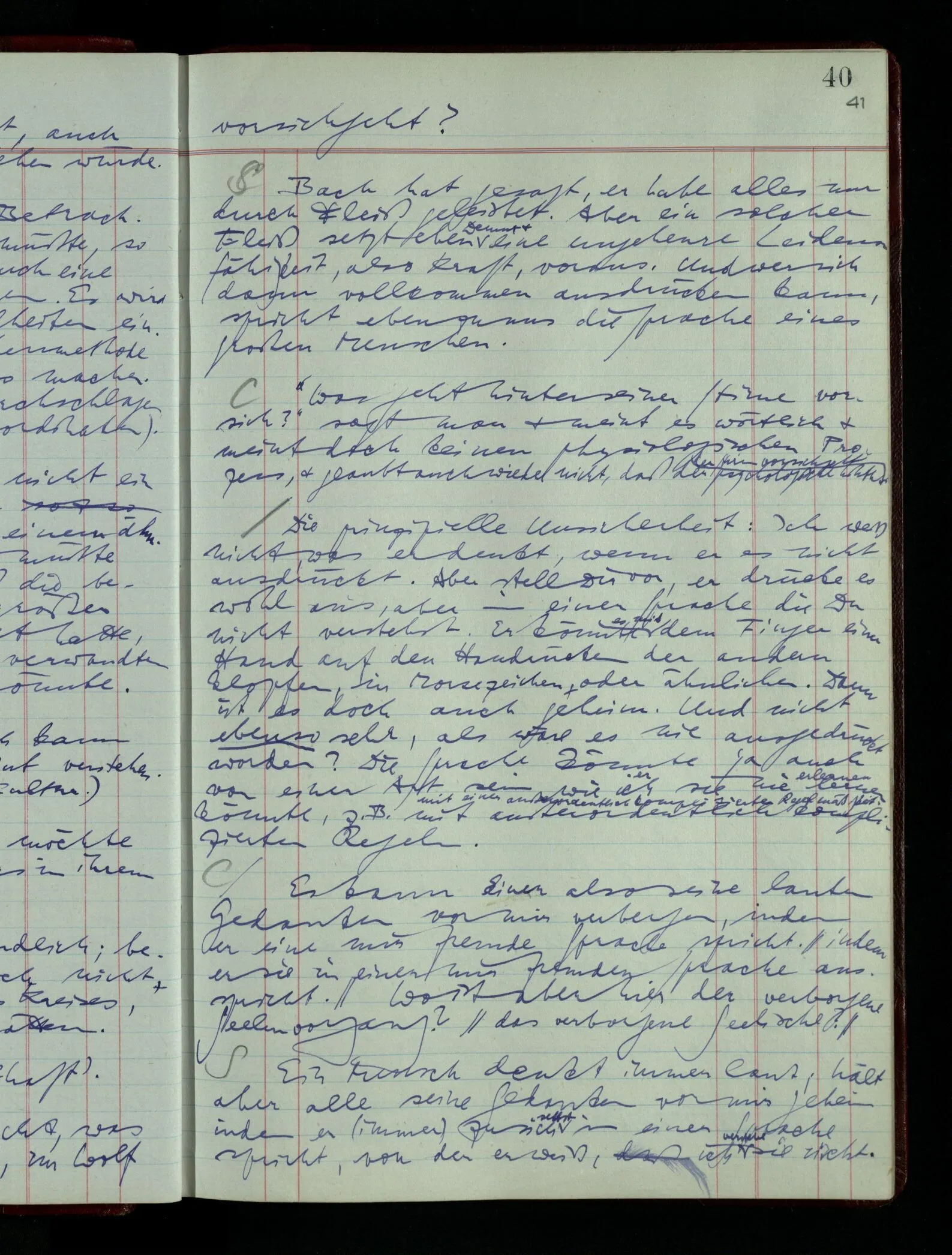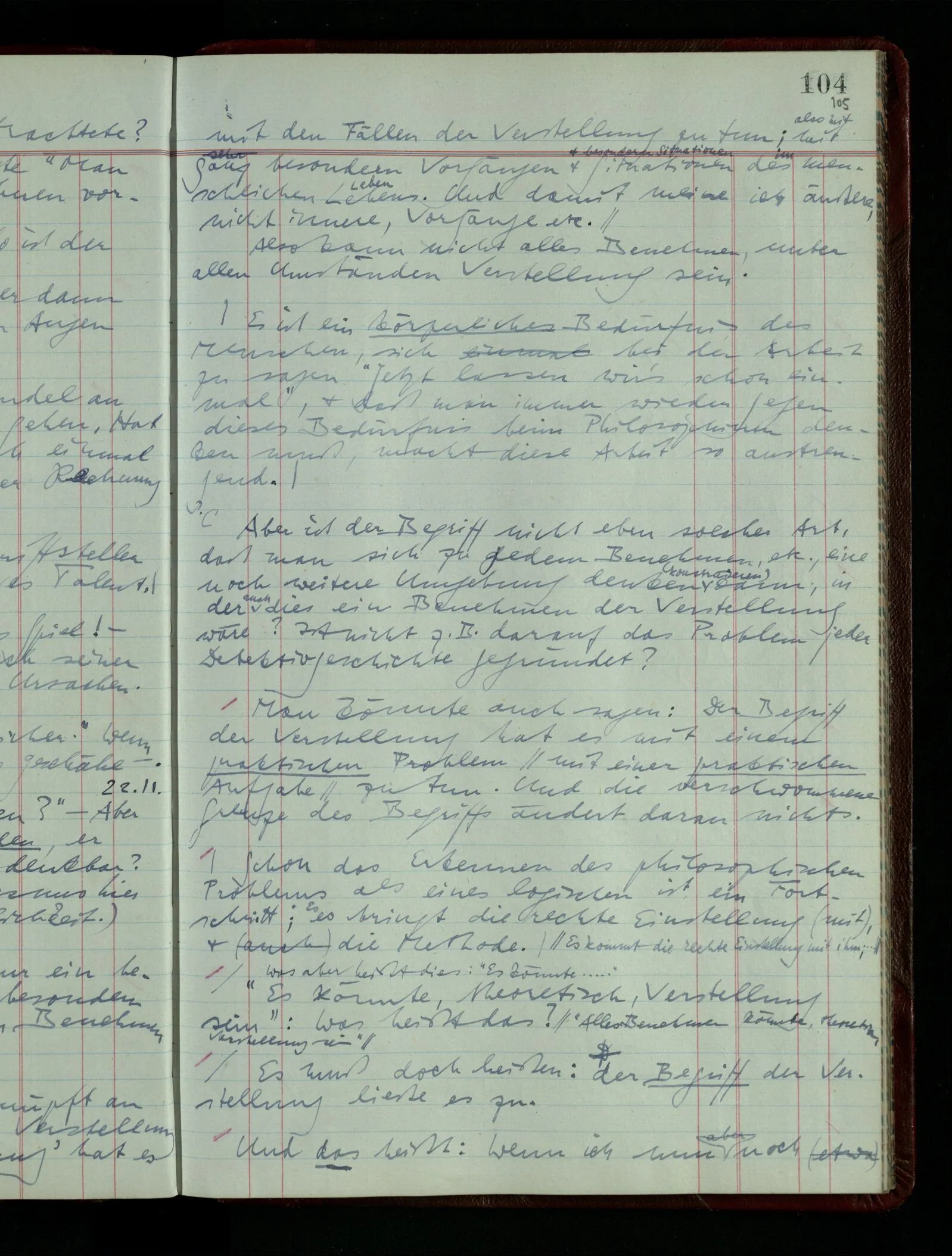 Was ich sagen will, fällt mir sehr schwer auszudrücken: Das ist unser Begriff vom ‘glauben’ – so setzen wir die Linie von der Annahme zur Behauptung fort. Nun versuchen wir eine andere Fortsetzung, wir verändern die Linie des Begriffs & sagen nun “Das ist ja garnicht mehr derselbe!” Das heißt: das Wort “glauben” paßt nun auch nicht mehr für den Teil der Linie, den wir unverändert ließen. Wenn ich mir nämlich sage: “Angenommen, ich glaube daß ‥‥․, es ist aber nicht so” –, so frage ich mich etwa: “Was nehme ich eigentlich an, wenn ich annehme, ich glaube das & das?” Darauf scheint eine Antwort möglich, indem ich mir vorstelle, wie das ist: zu glauben. (Freilich ist das alles nur Mißverständnis) Ich richte also meinen Blick in der Vorstellung in mich um dort das Glauben an den Sachverhalt zu entdecken. – Nun frage ich: Warum kann ich diesen Seelenzustand des Glaubens, den ich in diesem Falle annehme, nicht auch als gegenwärtig behaupten? wenn auch diese Behauptung freilich unserm “Ich glaube ‥‥” nicht gleichkommt. – Kaum will ich nun – in diesem neuen Sinne – aussagen, ich glaubte‥‥ obwohl es nicht der Fall sei, so verliert diese Aussage jeden Sinn. Und ich fühle, ich kann, was ich früher annahm, nicht für die Gegenwart behaupten. Als ich aber die Annahme aussprach, war sie wohl für mich ganz verständlich, ich konnte mir beiläufig eine Verwendung für sie denken, wußte daß ich bei ihrer Verwendung nicht in Verlegenheit kommen würde, aber das war auch alles. Ich hatte kein klares Bild von dem Unterschied der Anwendung von “Angenommen, es regnet” & “Angenommen, ich glaube, daß ‥‥”.