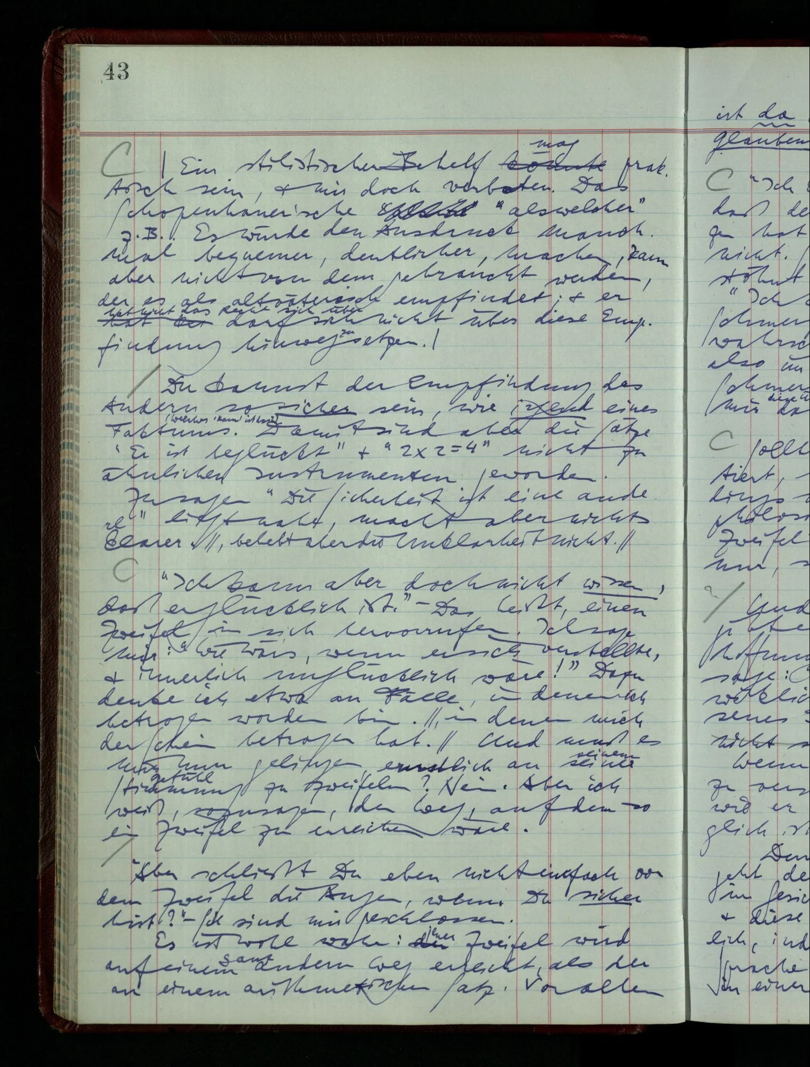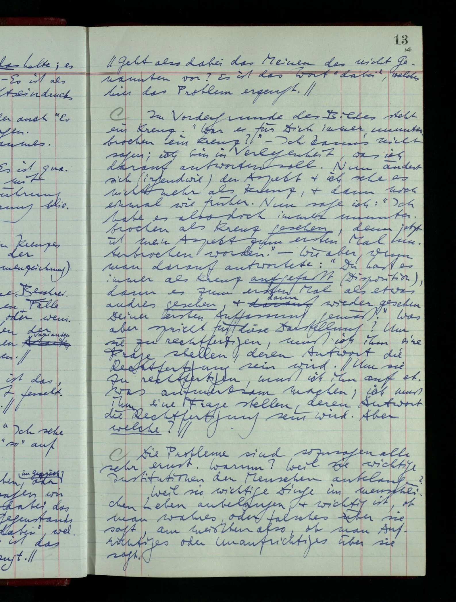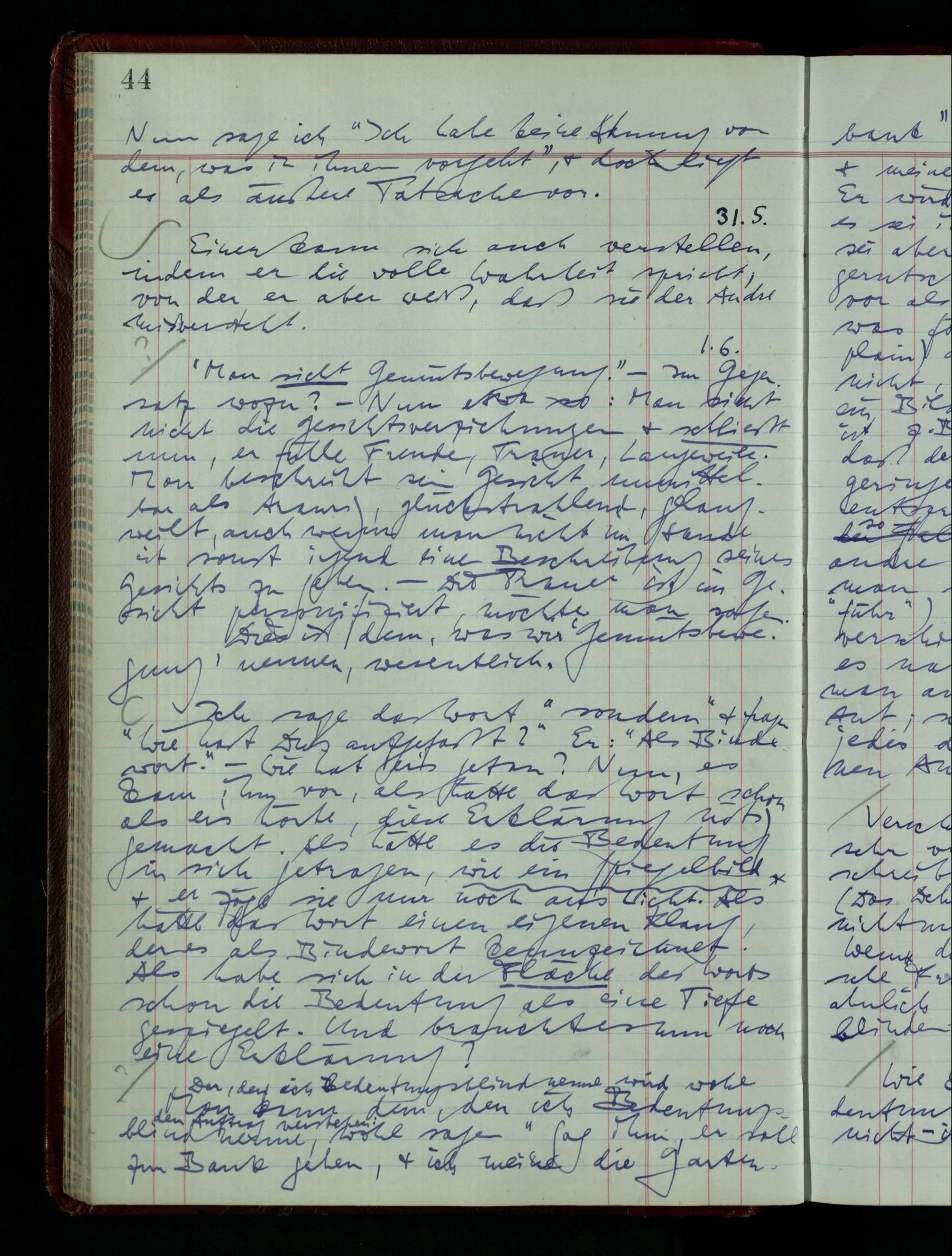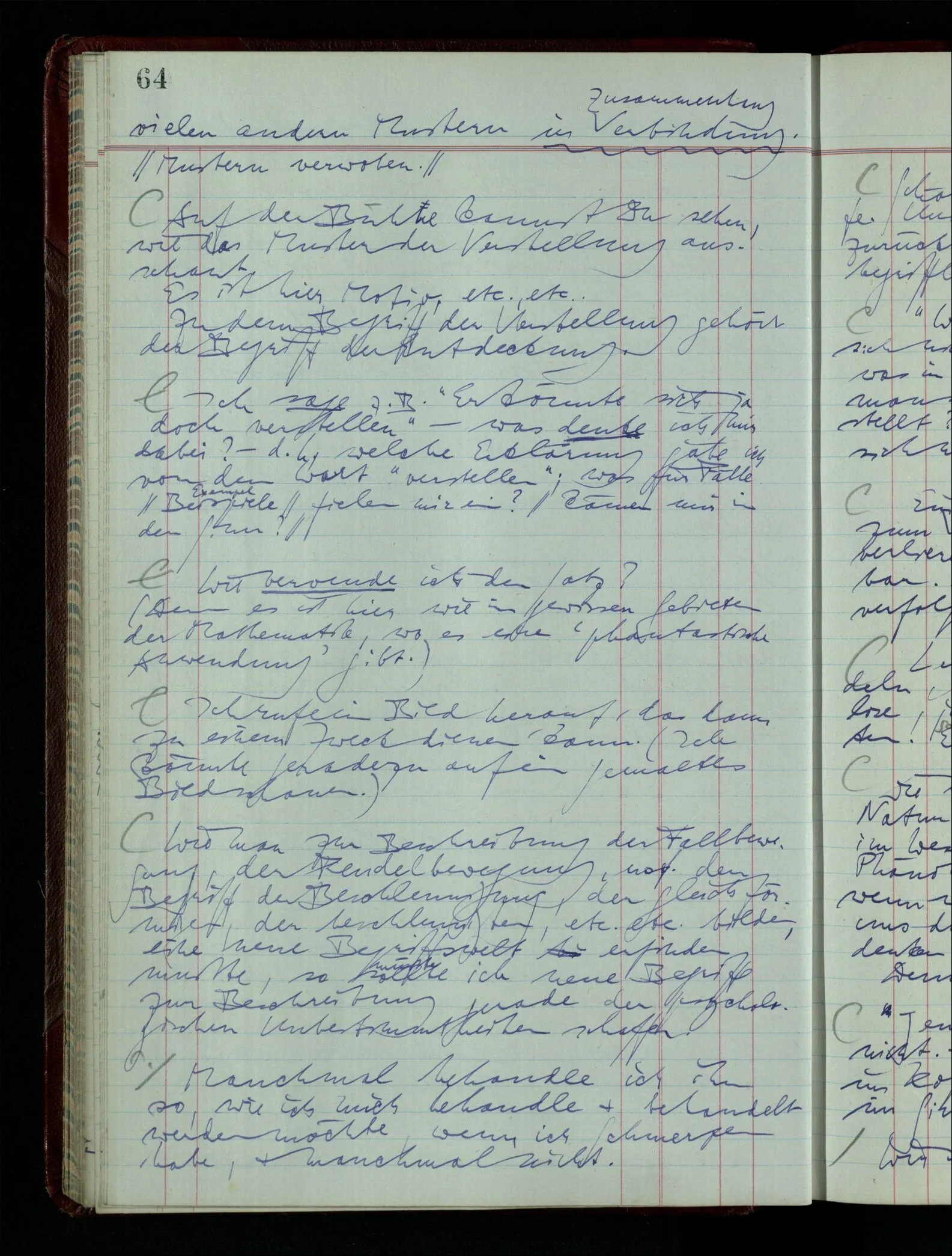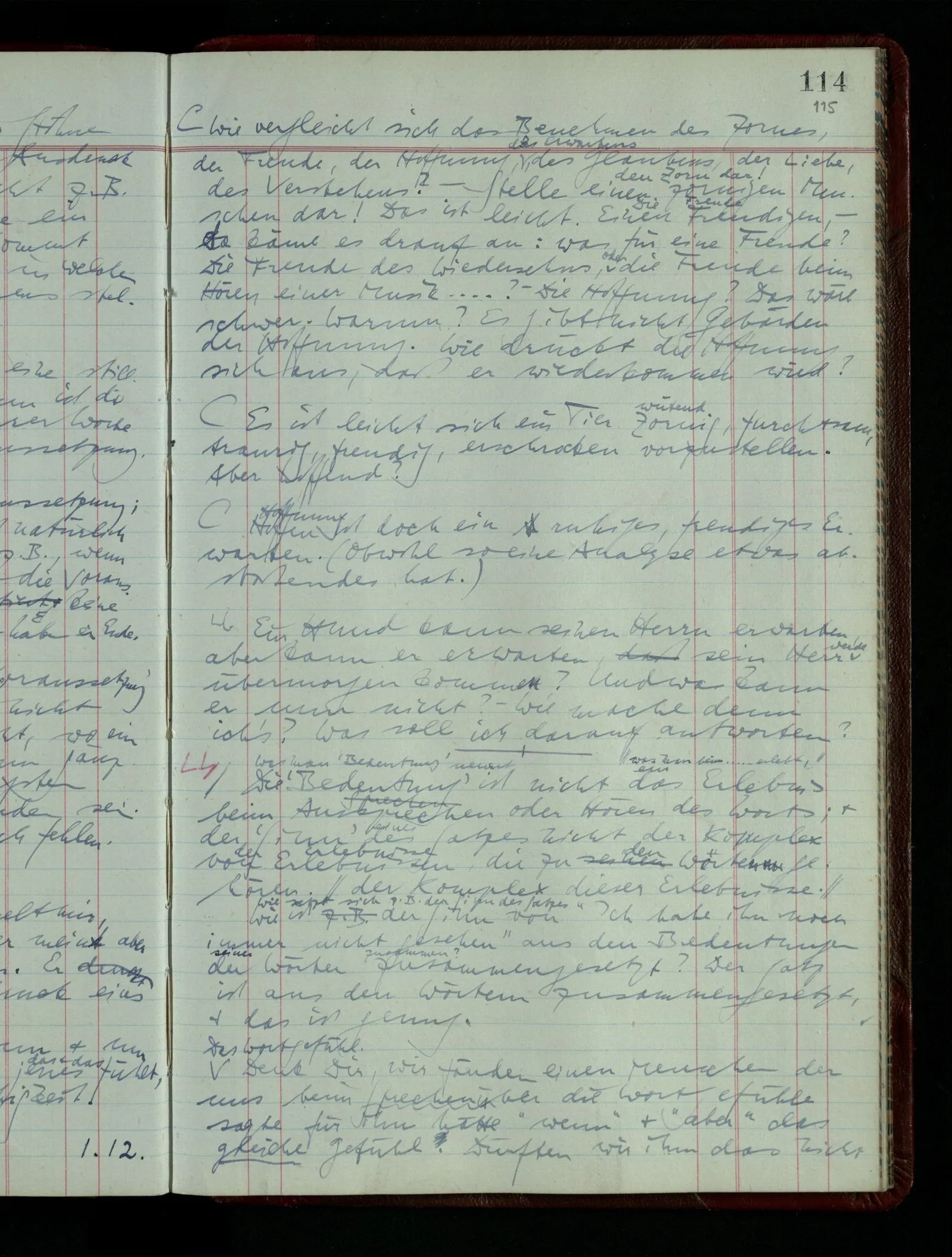 Was ich sagen will, fällt mir sehr schwer auszudrücken: Das ist unser Begriff vom ‘glauben’ – so setzen wir die Linie von der Annahme zur Behauptung fort. Nun versuchen wir eine andere Fortsetzung, wir verändern die Linie des Begriffs & sagen nun “Das ist ja garnicht mehr derselbe!” Das heißt: das Wort “glauben” paßt nun auch nicht mehr für den Teil der Linie, den wir unverändert ließen. Wenn ich mir nämlich sage: “Angenommen, ich glaube daß ‥‥․, es ist aber nicht so” –, so frage ich mich etwa: “Was nehme ich eigentlich an, wenn ich annehme, ich glaube das & das?” Darauf scheint eine Antwort möglich, indem ich mir vorstelle, wie das ist: zu glauben. (Freilich ist das alles nur Mißverständnis) Ich richte also meinen Blick in der Vorstellung in mich um dort das Glauben an den Sachverhalt zu entdecken. – Nun frage ich: Warum kann ich diesen Seelenzustand des Glaubens, den ich in diesem Falle annehme, nicht auch als gegenwärtig behaupten? wenn auch diese Behauptung freilich unserm “Ich glaube ‥‥” nicht gleichkommt. – Kaum will ich nun – in diesem neuen Sinne – aussagen, ich glaubte‥‥ obwohl es nicht der Fall sei, so verliert diese Aussage jeden Sinn. Und ich fühle, ich kann, was ich früher annahm, nicht für die Gegenwart behaupten. Als ich aber die Annahme aussprach, war sie wohl für mich ganz verständlich, ich konnte mir beiläufig eine Verwendung für sie denken, wußte daß ich bei ihrer Verwendung nicht in Verlegenheit kommen würde, aber das war auch alles. Ich hatte kein klares Bild von dem Unterschied der Anwendung von “Angenommen, es regnet” & “Angenommen, ich glaube, daß ‥‥”.