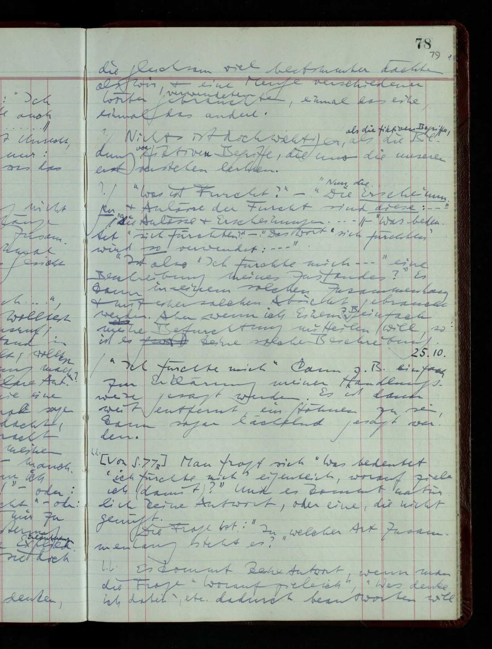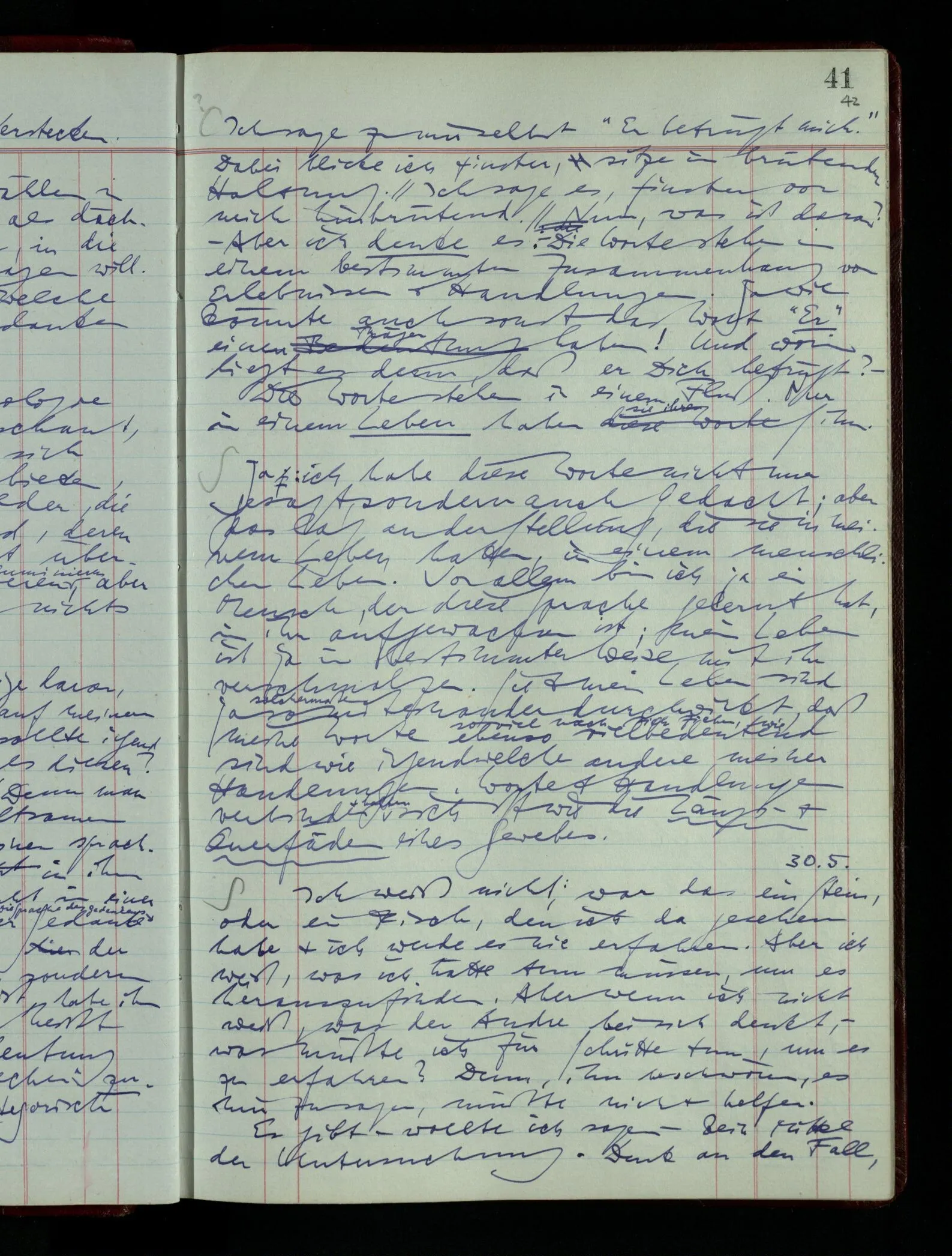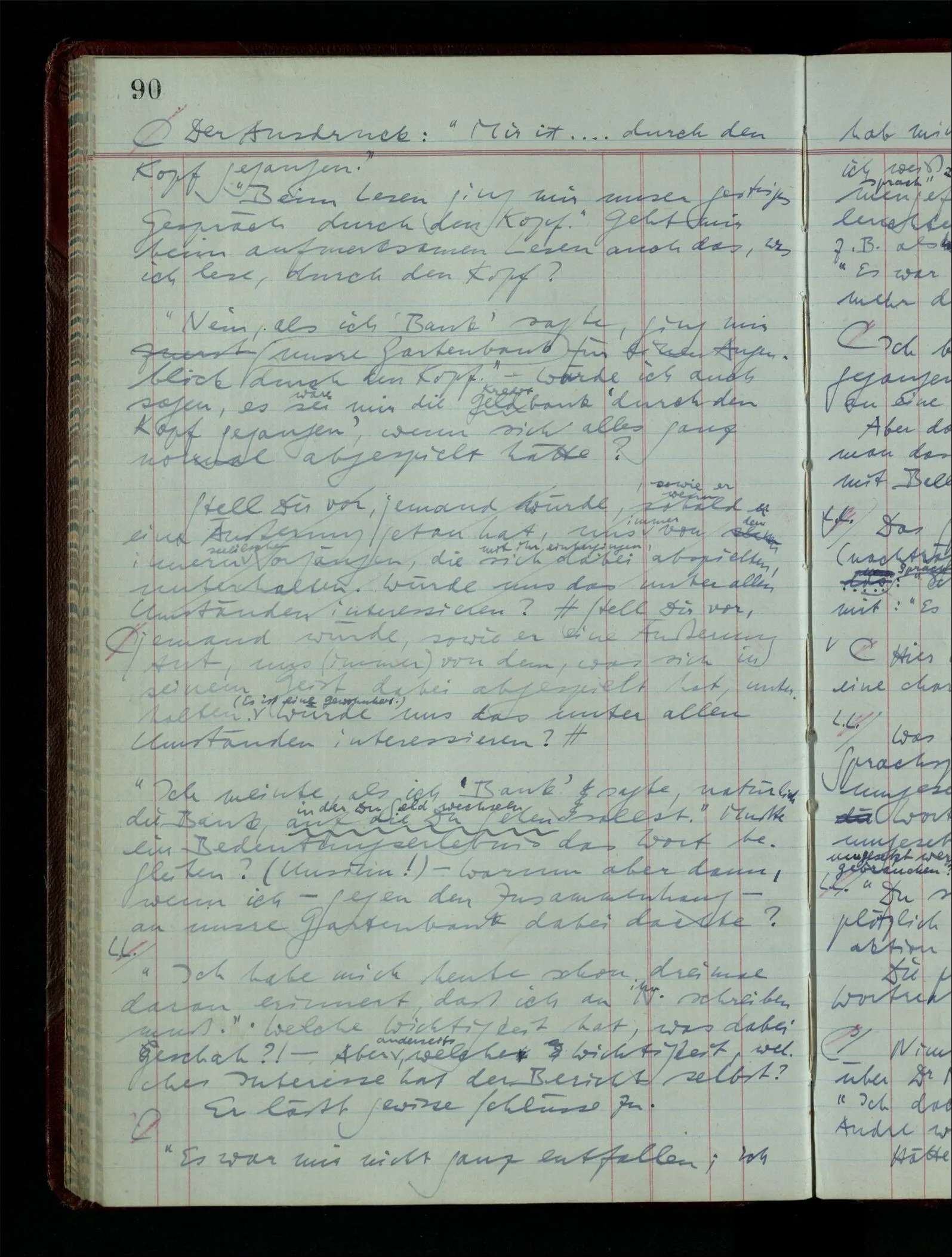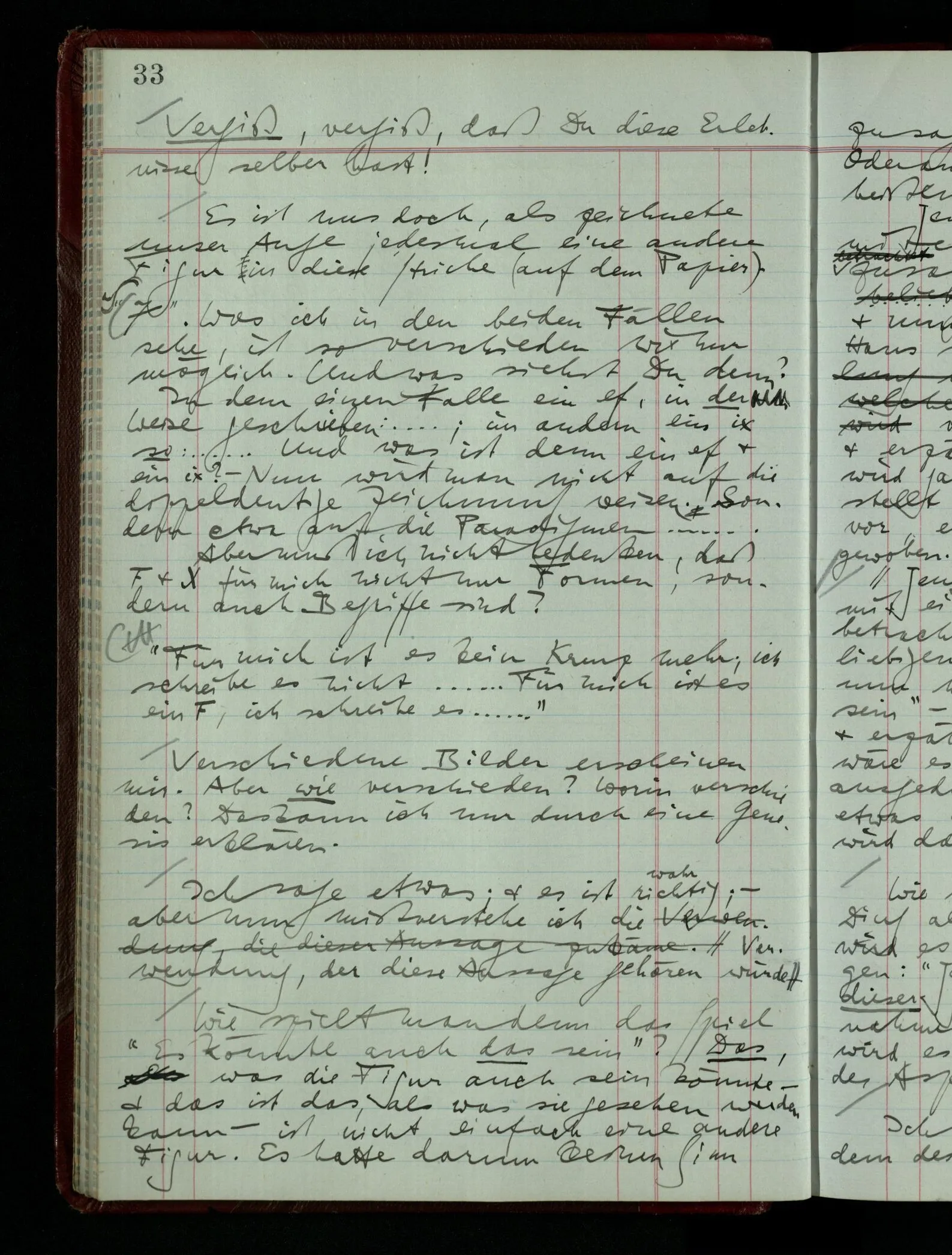 Was ich sagen will, fällt mir sehr schwer auszudrücken: Das ist unser Begriff vom ‘glauben’ – so setzen wir die Linie von der Annahme zur Behauptung fort. Nun versuchen wir eine andere Fortsetzung, wir verändern die Linie des Begriffs & sagen nun “Das ist ja garnicht mehr derselbe!” Das heißt: das Wort “glauben” paßt nun auch nicht mehr für den Teil der Linie, den wir unverändert ließen. Wenn ich mir nämlich sage: “Angenommen, ich glaube daß ‥‥․, es ist aber nicht so” –, so frage ich mich etwa: “Was nehme ich eigentlich an, wenn ich annehme, ich glaube das & das?” Darauf scheint eine Antwort möglich, indem ich mir vorstelle, wie das ist: zu glauben. (Freilich ist das alles nur Mißverständnis) Ich richte also meinen Blick in der Vorstellung in mich um dort das Glauben an den Sachverhalt zu entdecken. – Nun frage ich: Warum kann ich diesen Seelenzustand des Glaubens, den ich in diesem Falle annehme, nicht auch als gegenwärtig behaupten? wenn auch diese Behauptung freilich unserm “Ich glaube ‥‥” nicht gleichkommt. – Kaum will ich nun – in diesem neuen Sinne – aussagen, ich glaubte‥‥ obwohl es nicht der Fall sei, so verliert diese Aussage jeden Sinn. Und ich fühle, ich kann, was ich früher annahm, nicht für die Gegenwart behaupten. Als ich aber die Annahme aussprach, war sie wohl für mich ganz verständlich, ich konnte mir beiläufig eine Verwendung für sie denken, wußte daß ich bei ihrer Verwendung nicht in Verlegenheit kommen würde, aber das war auch alles. Ich hatte kein klares Bild von dem Unterschied der Anwendung von “Angenommen, es regnet” & “Angenommen, ich glaube, daß ‥‥”.