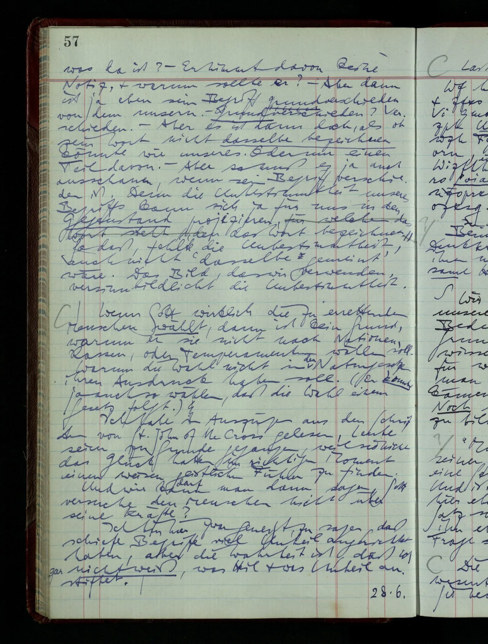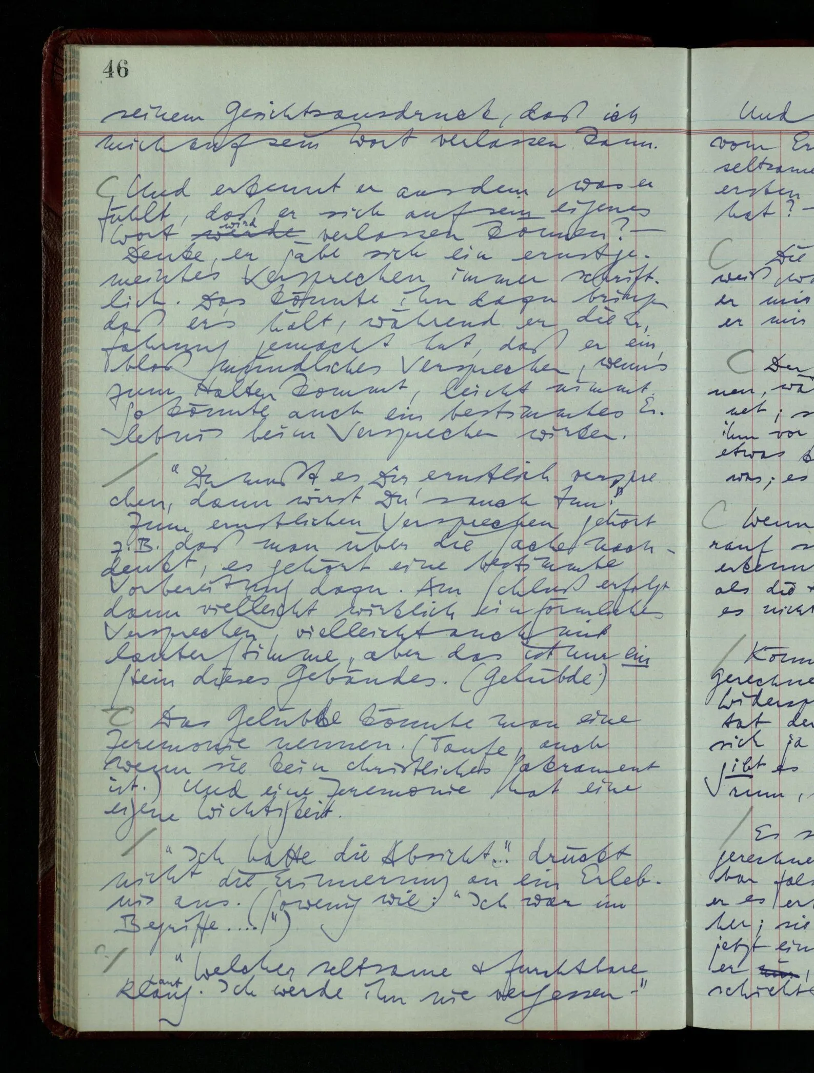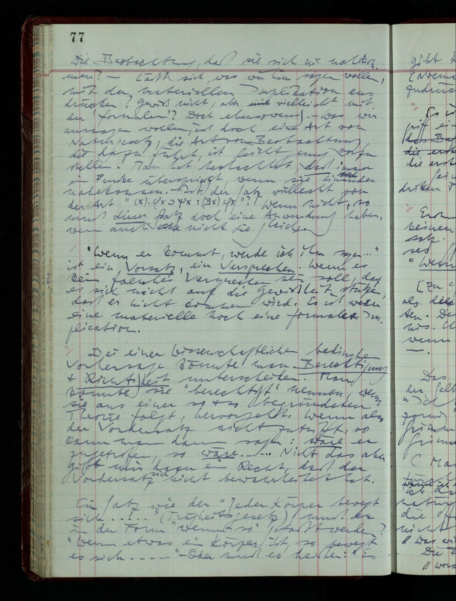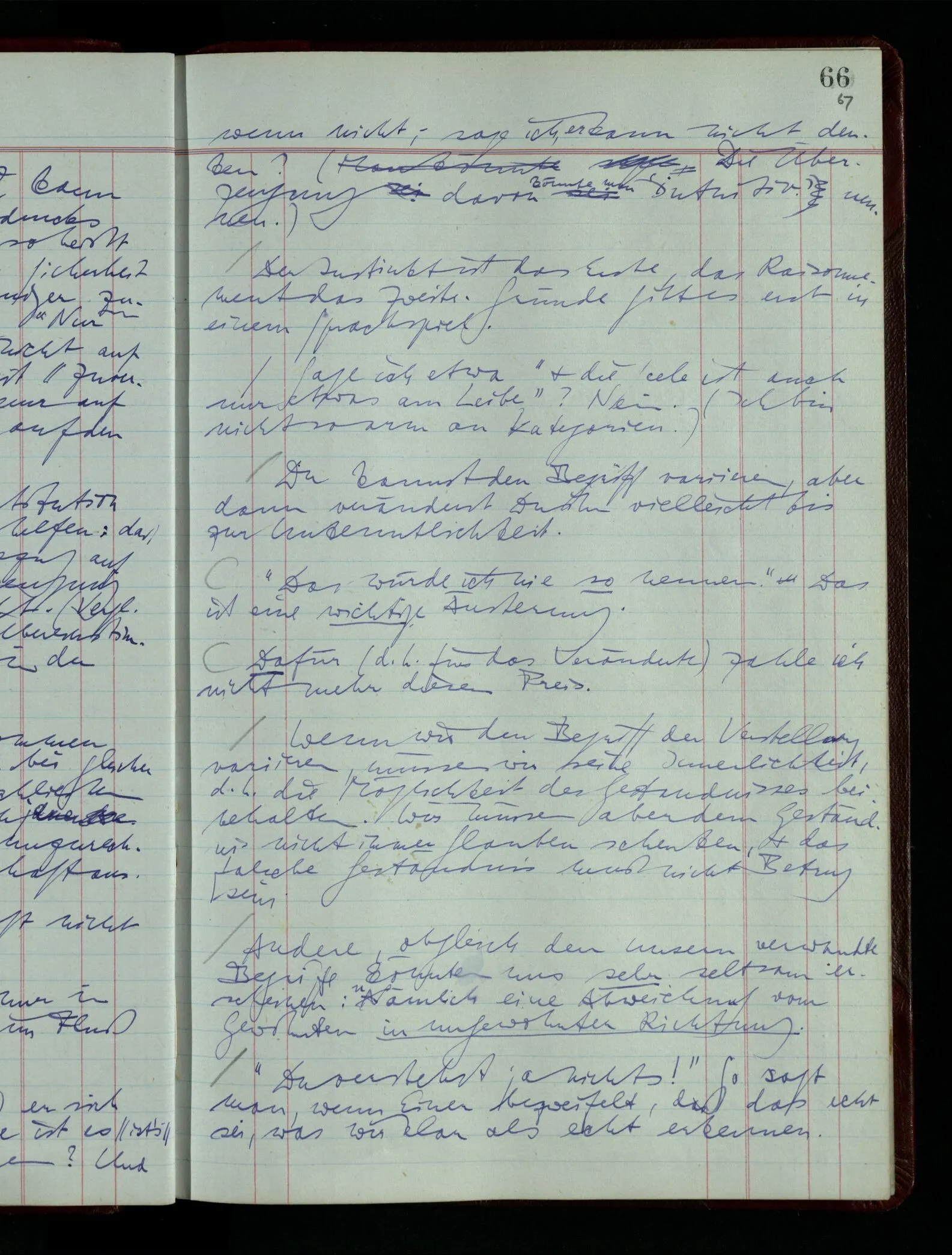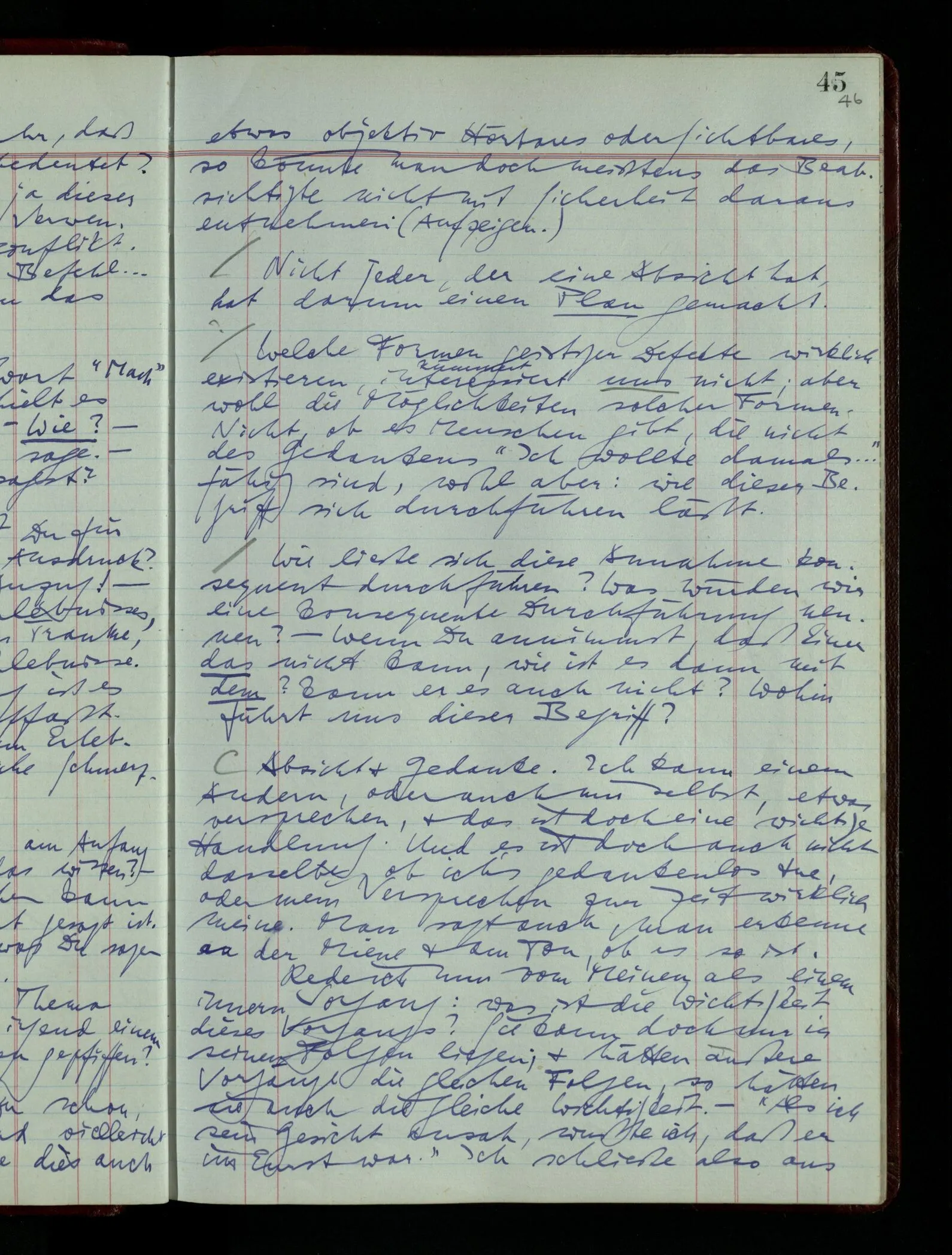 Was ich sagen will, fällt mir sehr schwer auszudrücken: Das ist unser Begriff vom ‘glauben’ – so setzen wir die Linie von der Annahme zur Behauptung fort. Nun versuchen wir eine andere Fortsetzung, wir verändern die Linie des Begriffs & sagen nun “Das ist ja garnicht mehr derselbe!” Das heißt: das Wort “glauben” paßt nun auch nicht mehr für den Teil der Linie, den wir unverändert ließen. Wenn ich mir nämlich sage: “Angenommen, ich glaube daß ‥‥․, es ist aber nicht so” –, so frage ich mich etwa: “Was nehme ich eigentlich an, wenn ich annehme, ich glaube das & das?” Darauf scheint eine Antwort möglich, indem ich mir vorstelle, wie das ist: zu glauben. (Freilich ist das alles nur Mißverständnis) Ich richte also meinen Blick in der Vorstellung in mich um dort das Glauben an den Sachverhalt zu entdecken. – Nun frage ich: Warum kann ich diesen Seelenzustand des Glaubens, den ich in diesem Falle annehme, nicht auch als gegenwärtig behaupten? wenn auch diese Behauptung freilich unserm “Ich glaube ‥‥” nicht gleichkommt. – Kaum will ich nun – in diesem neuen Sinne – aussagen, ich glaubte‥‥ obwohl es nicht der Fall sei, so verliert diese Aussage jeden Sinn. Und ich fühle, ich kann, was ich früher annahm, nicht für die Gegenwart behaupten. Als ich aber die Annahme aussprach, war sie wohl für mich ganz verständlich, ich konnte mir beiläufig eine Verwendung für sie denken, wußte daß ich bei ihrer Verwendung nicht in Verlegenheit kommen würde, aber das war auch alles. Ich hatte kein klares Bild von dem Unterschied der Anwendung von “Angenommen, es regnet” & “Angenommen, ich glaube, daß ‥‥”.