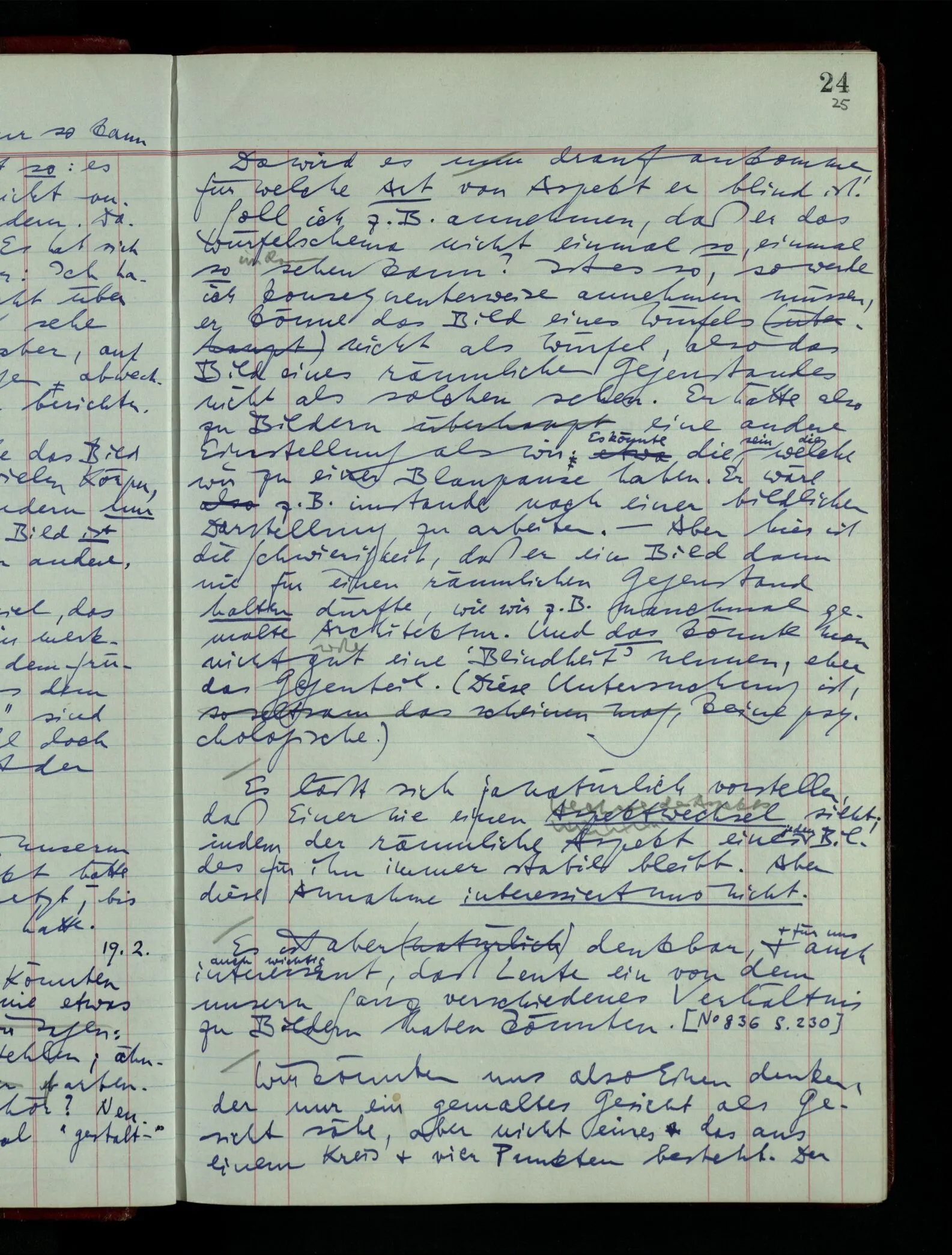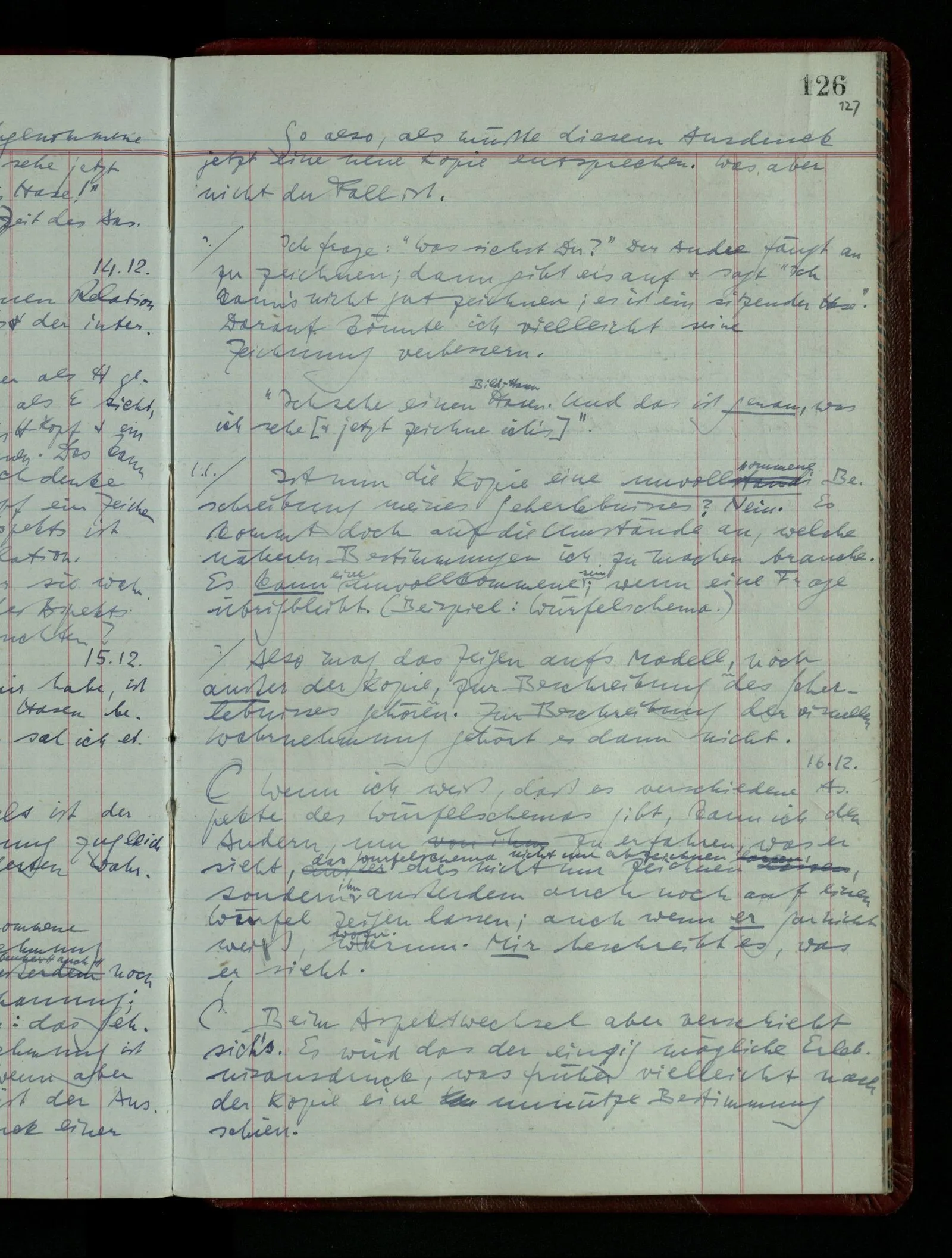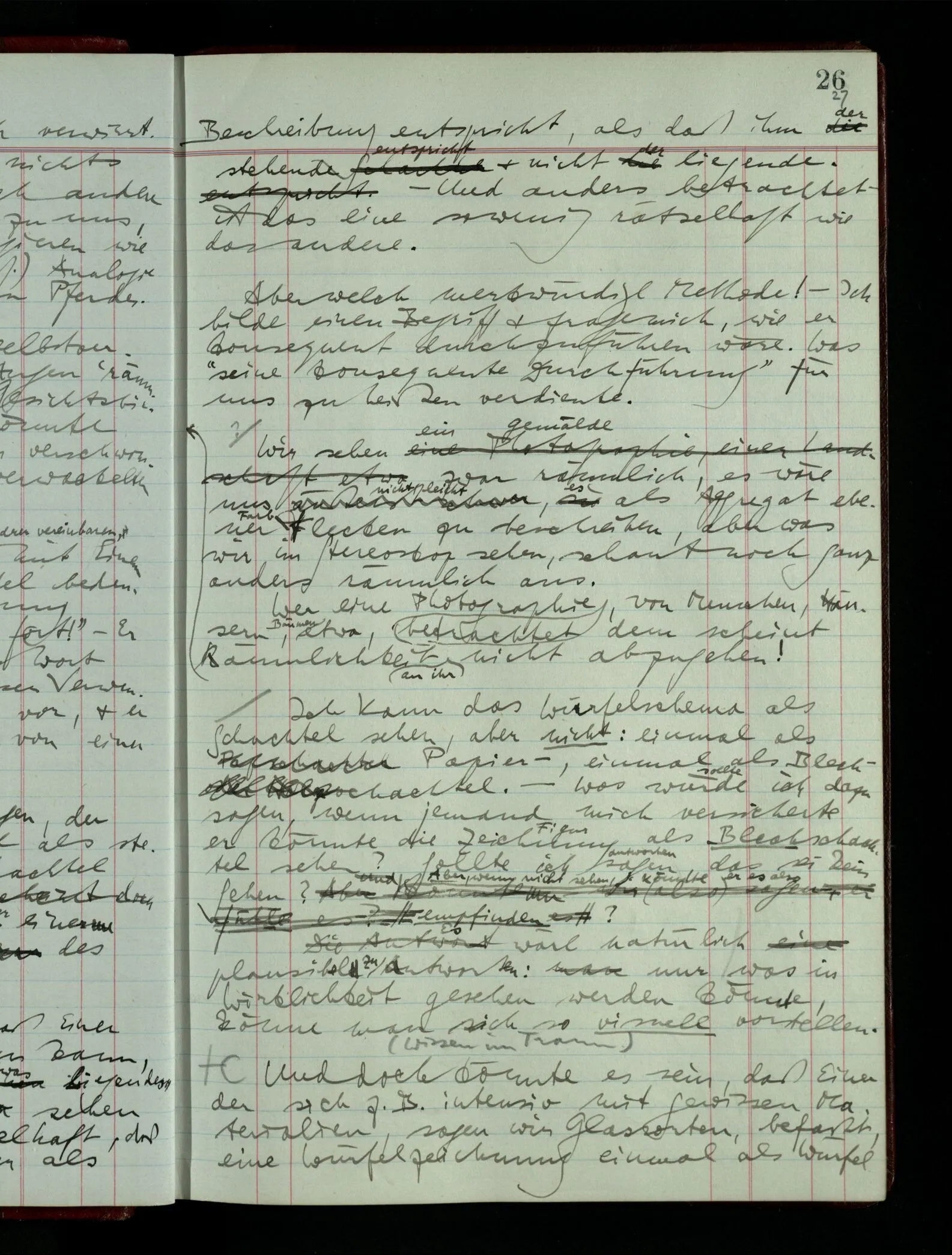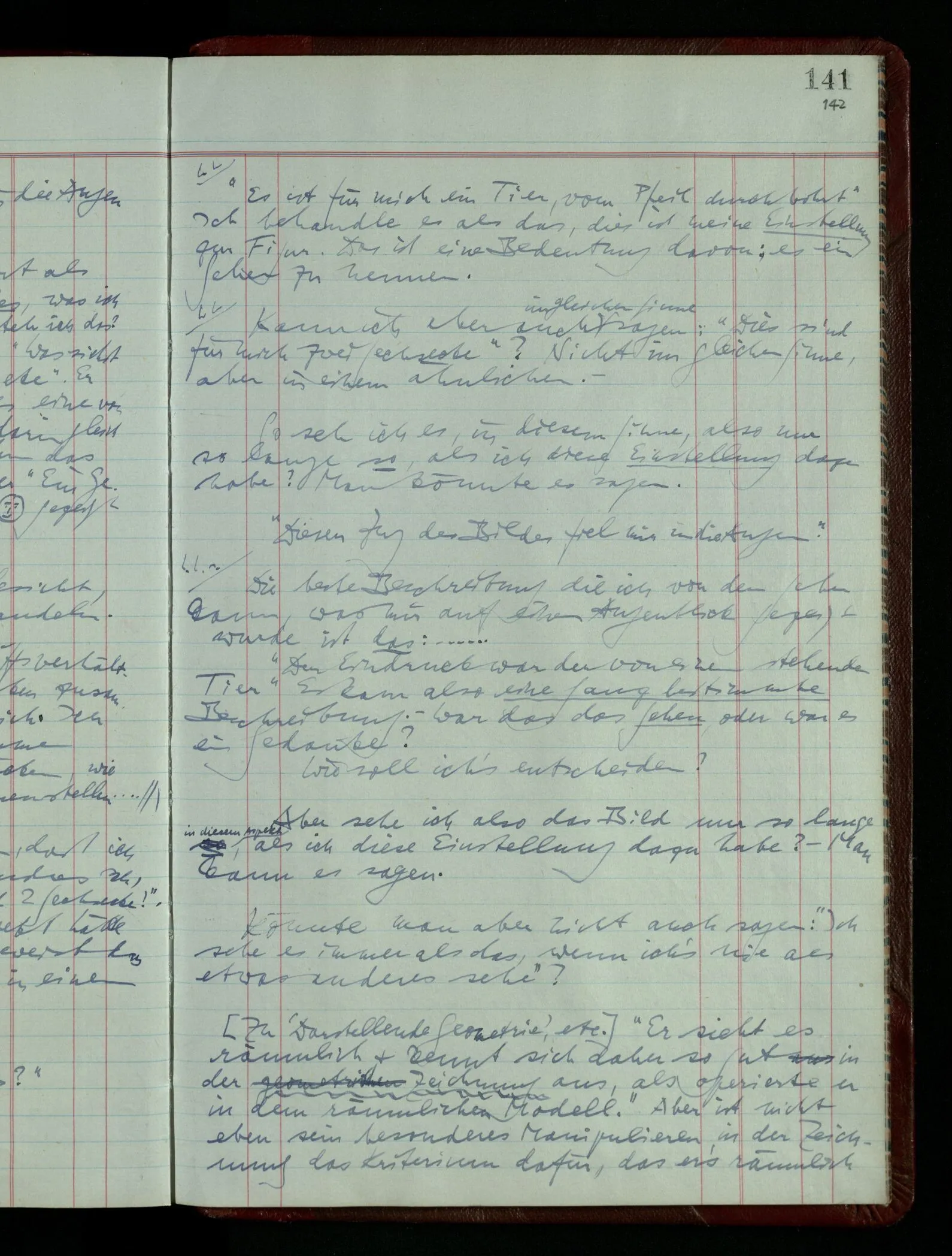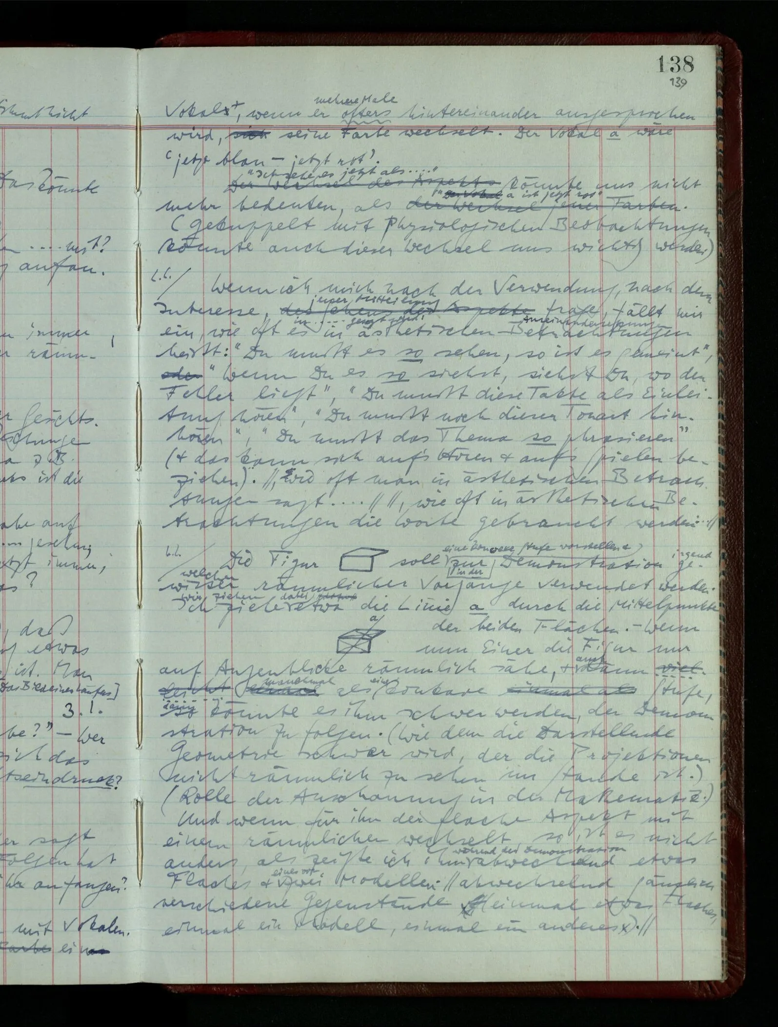 [] “Er sieht es räumlich & kennt sich daher so gut in der Zeichnung aus, als operierte er in dem räumlichen Modell.” Aber ist nicht eben sein besonderes Manipulieren in der Zeichnung das Kriterium dafür, daß er’s räumlich sieht? (Denn was weiß ich sonst von seinem Eindruck?)