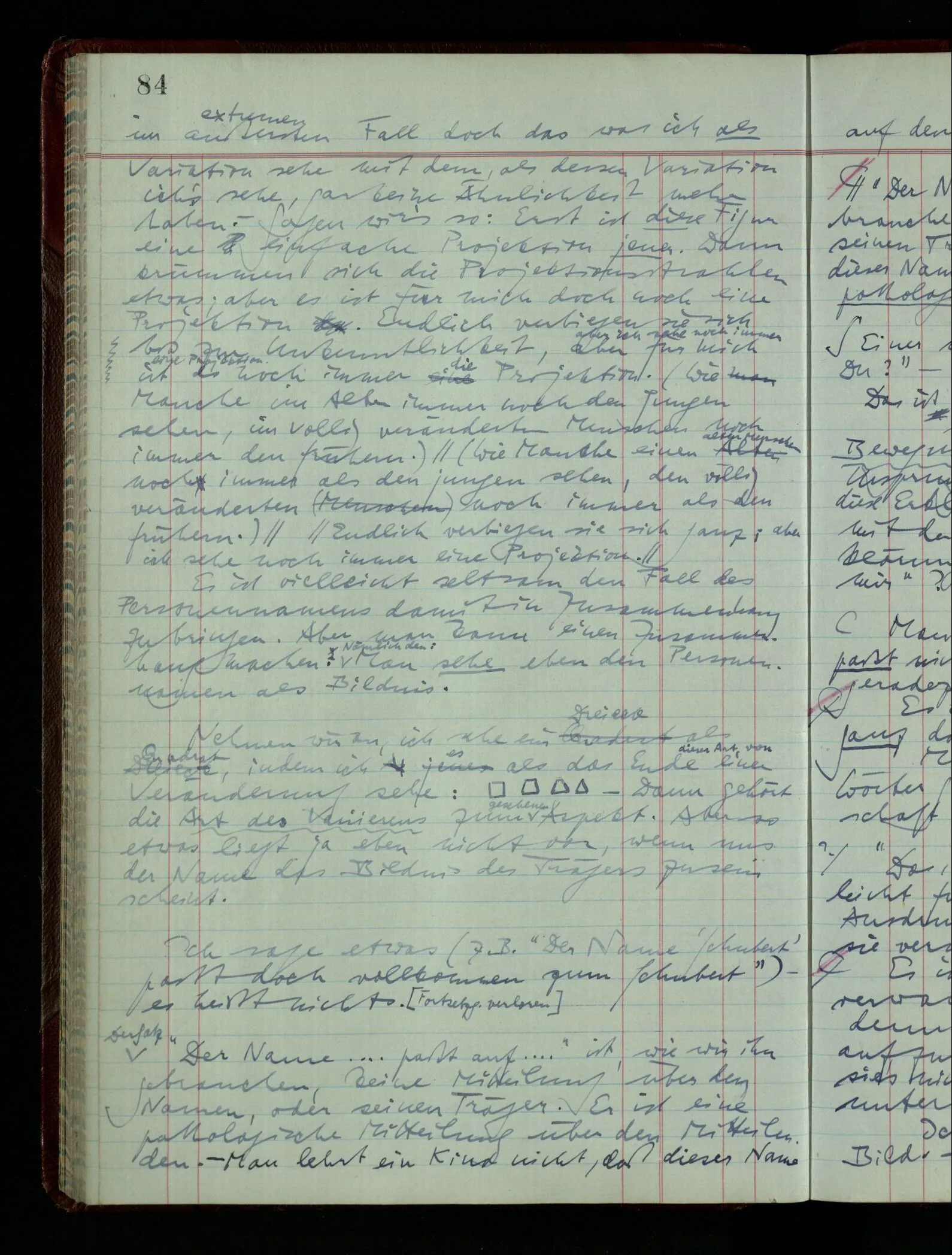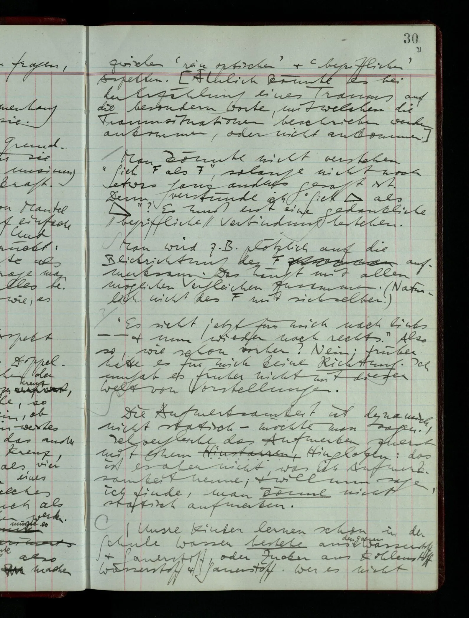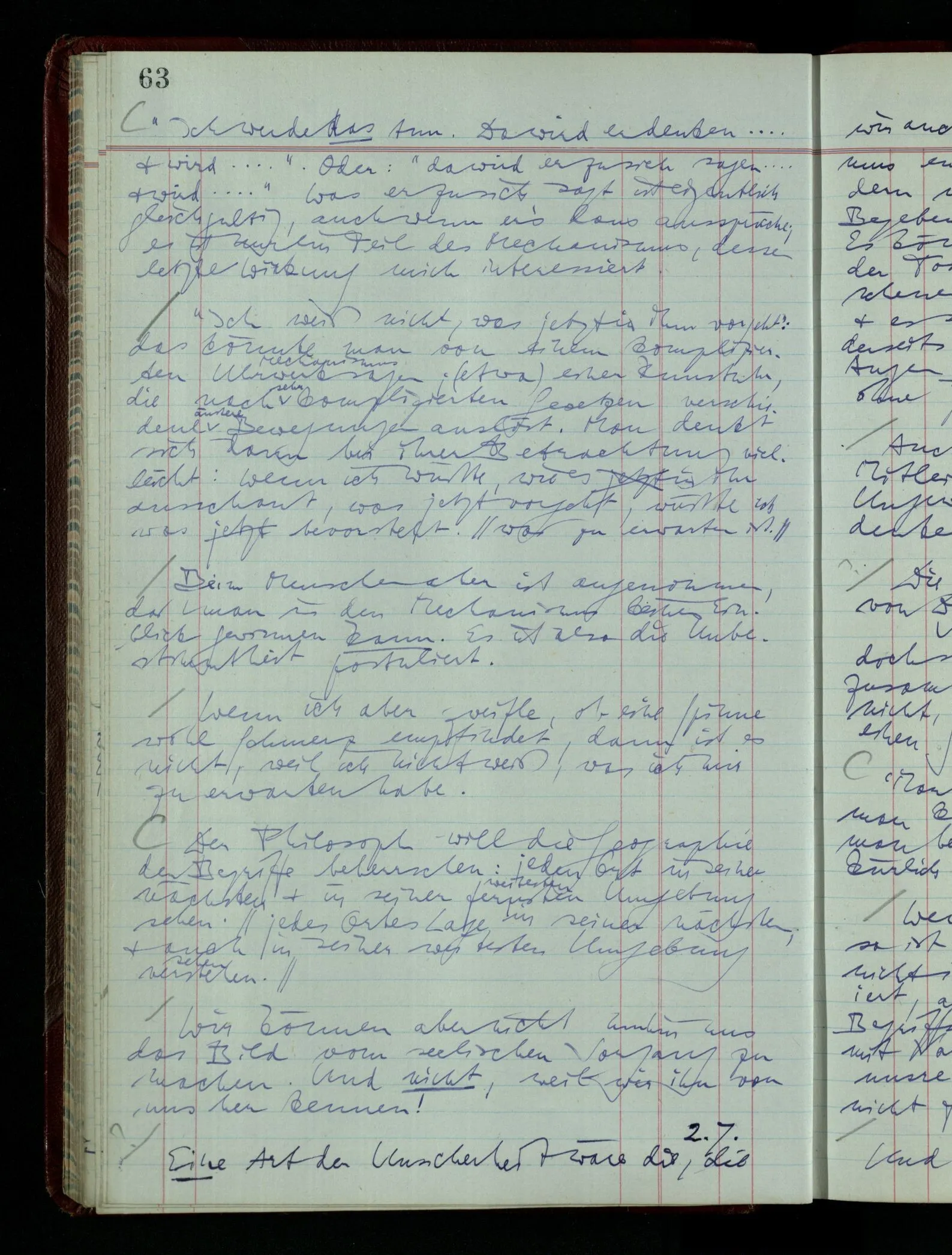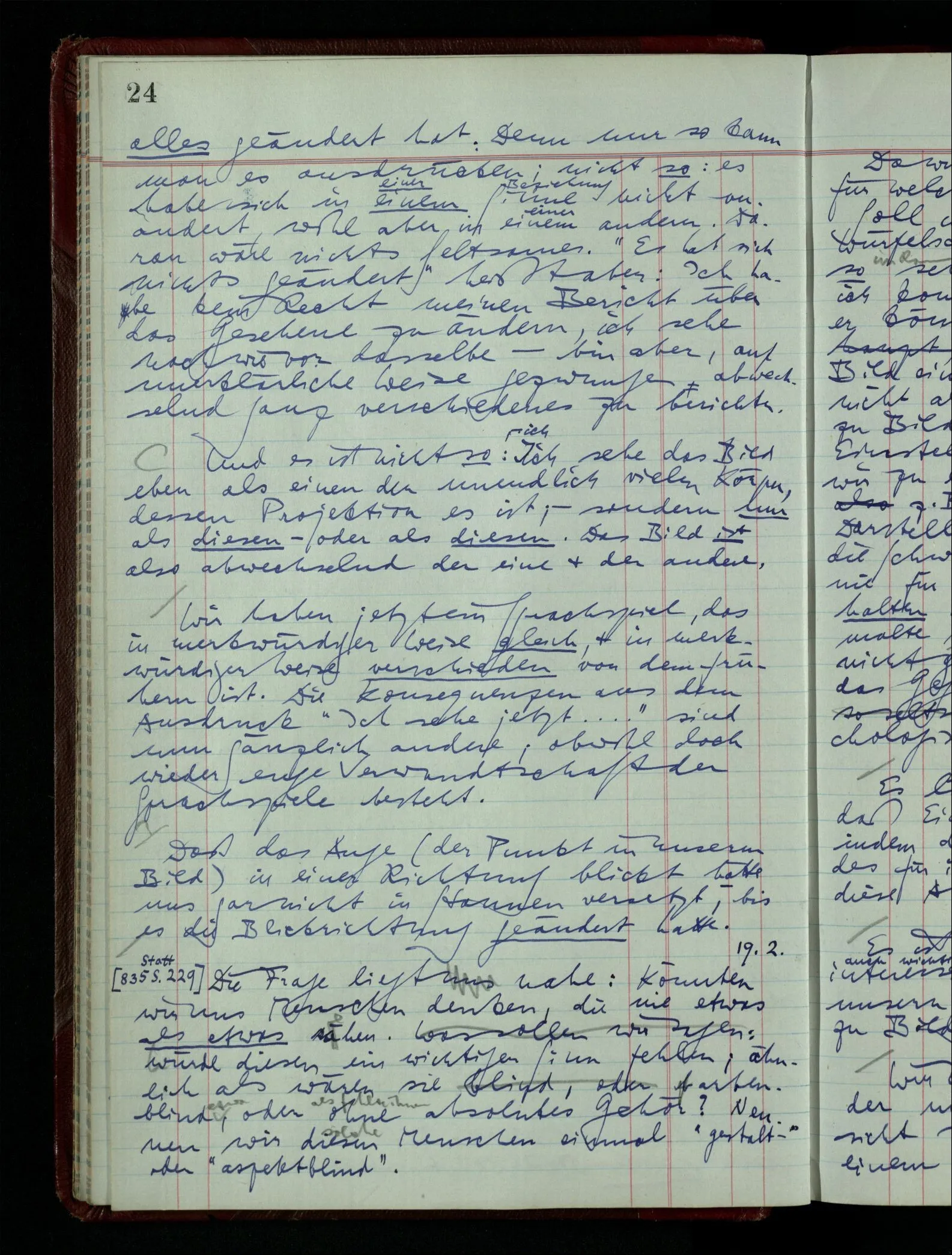 [] “Er sieht es räumlich & kennt sich daher so gut in der Zeichnung aus, als operierte er in dem räumlichen Modell.” Aber ist nicht eben sein besonderes Manipulieren in der Zeichnung das Kriterium dafür, daß er’s räumlich sieht? (Denn was weiß ich sonst von seinem Eindruck?)