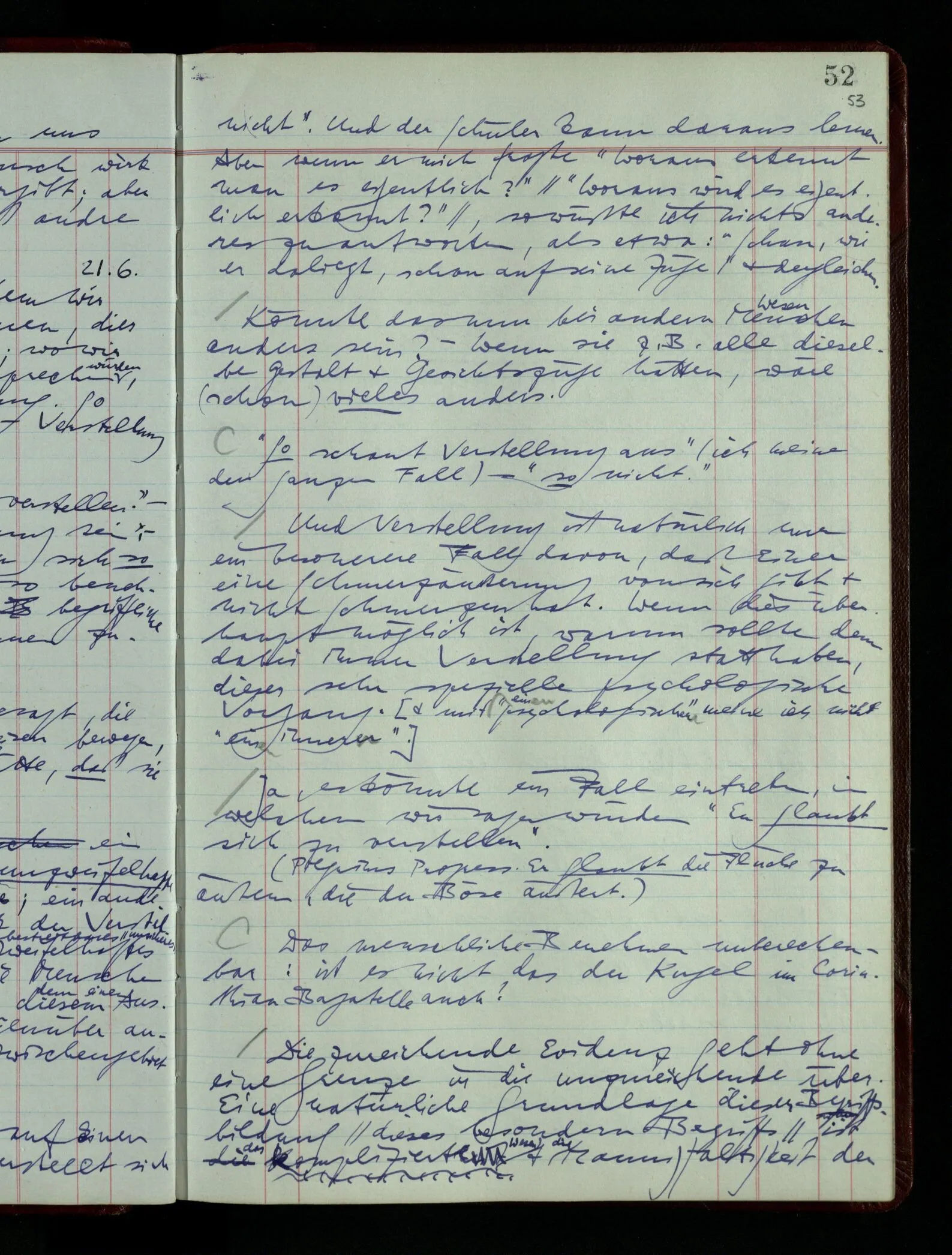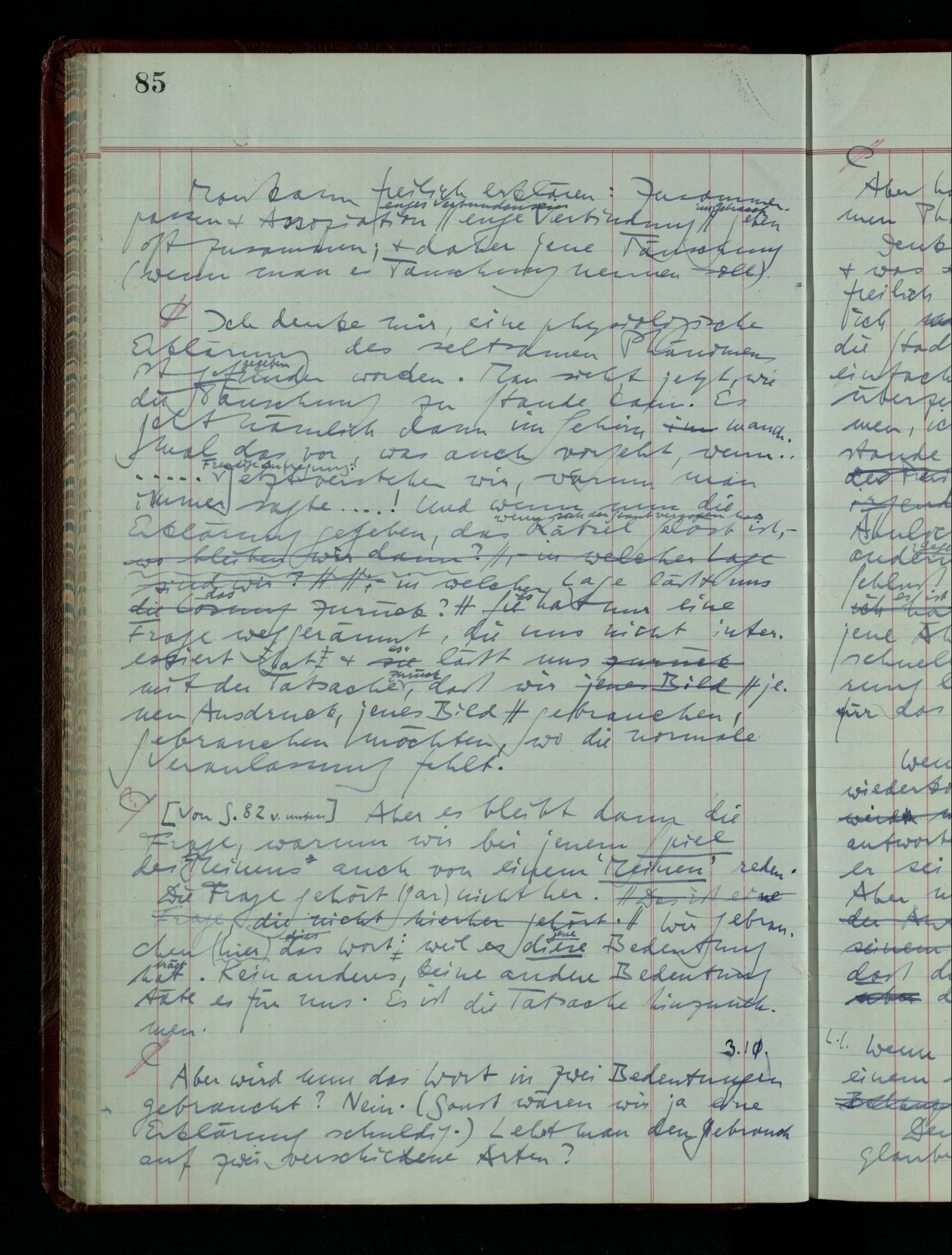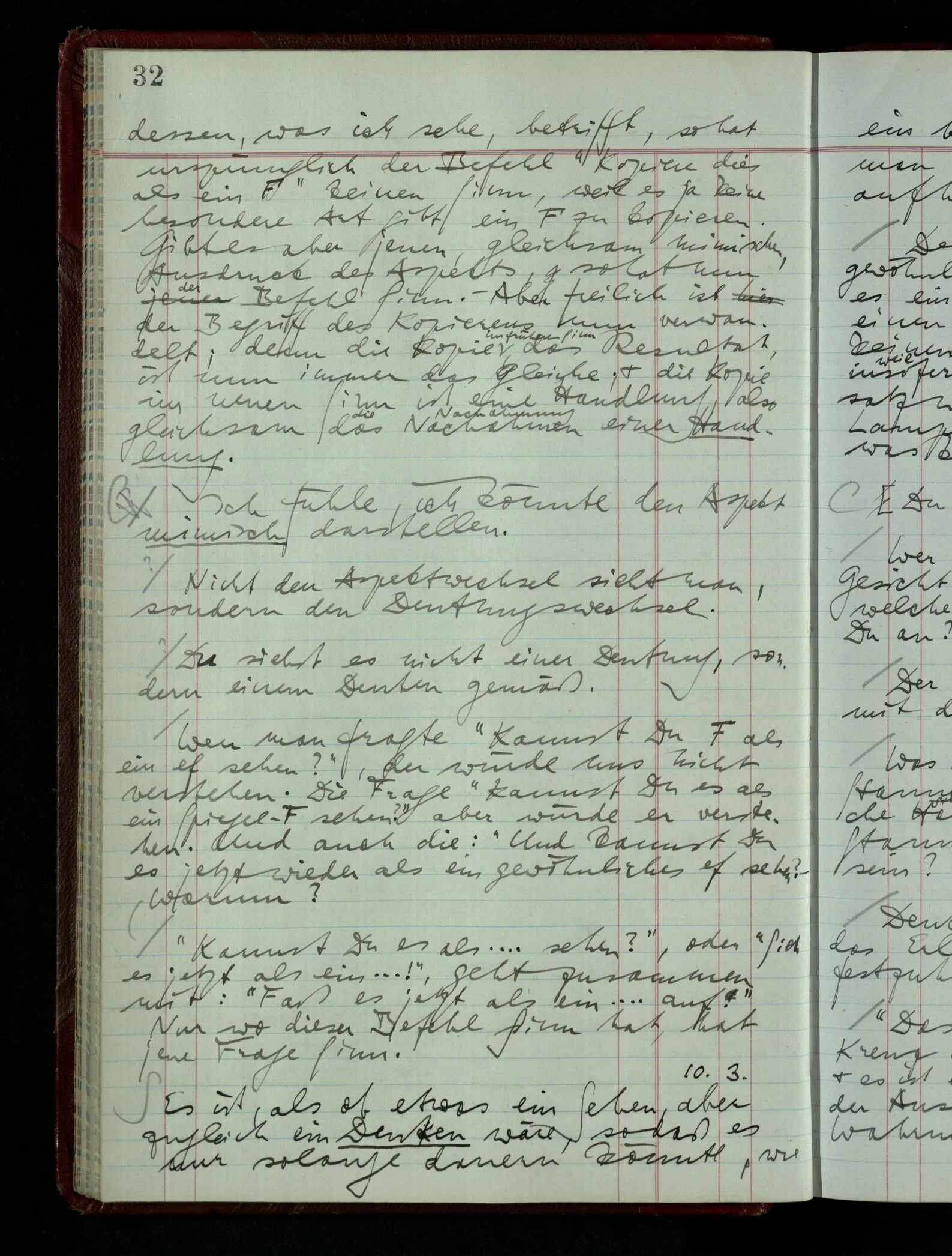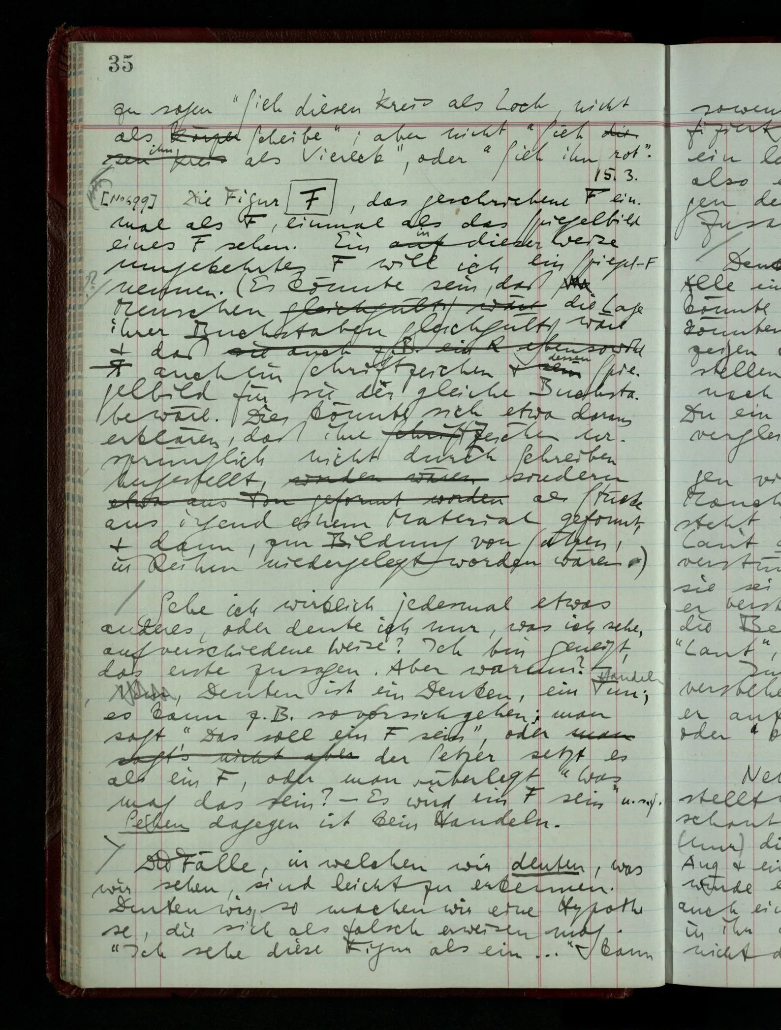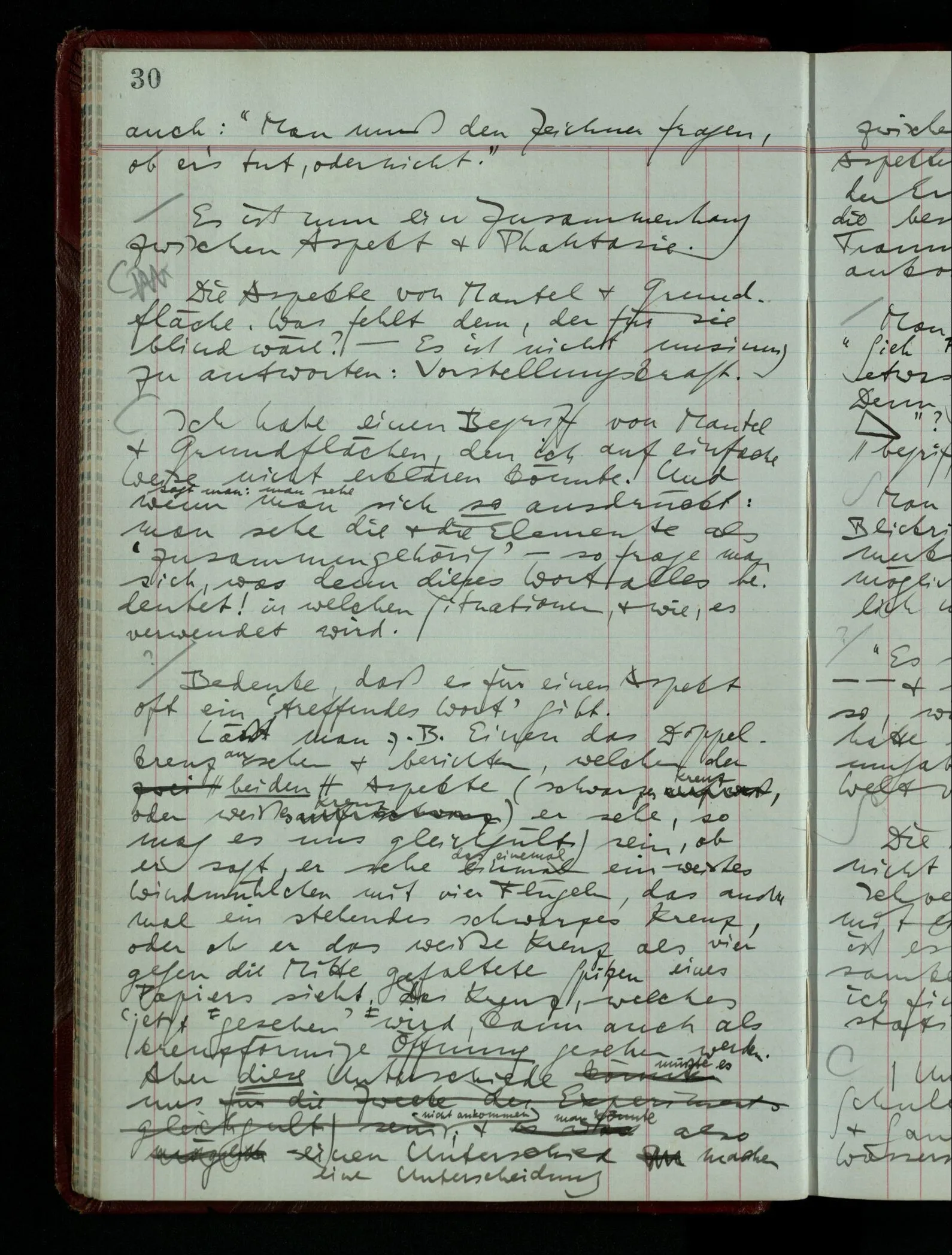 [] “Er sieht es räumlich & kennt sich daher so gut in der Zeichnung aus, als operierte er in dem räumlichen Modell.” Aber ist nicht eben sein besonderes Manipulieren in der Zeichnung das Kriterium dafür, daß er’s räumlich sieht? (Denn was weiß ich sonst von seinem Eindruck?)