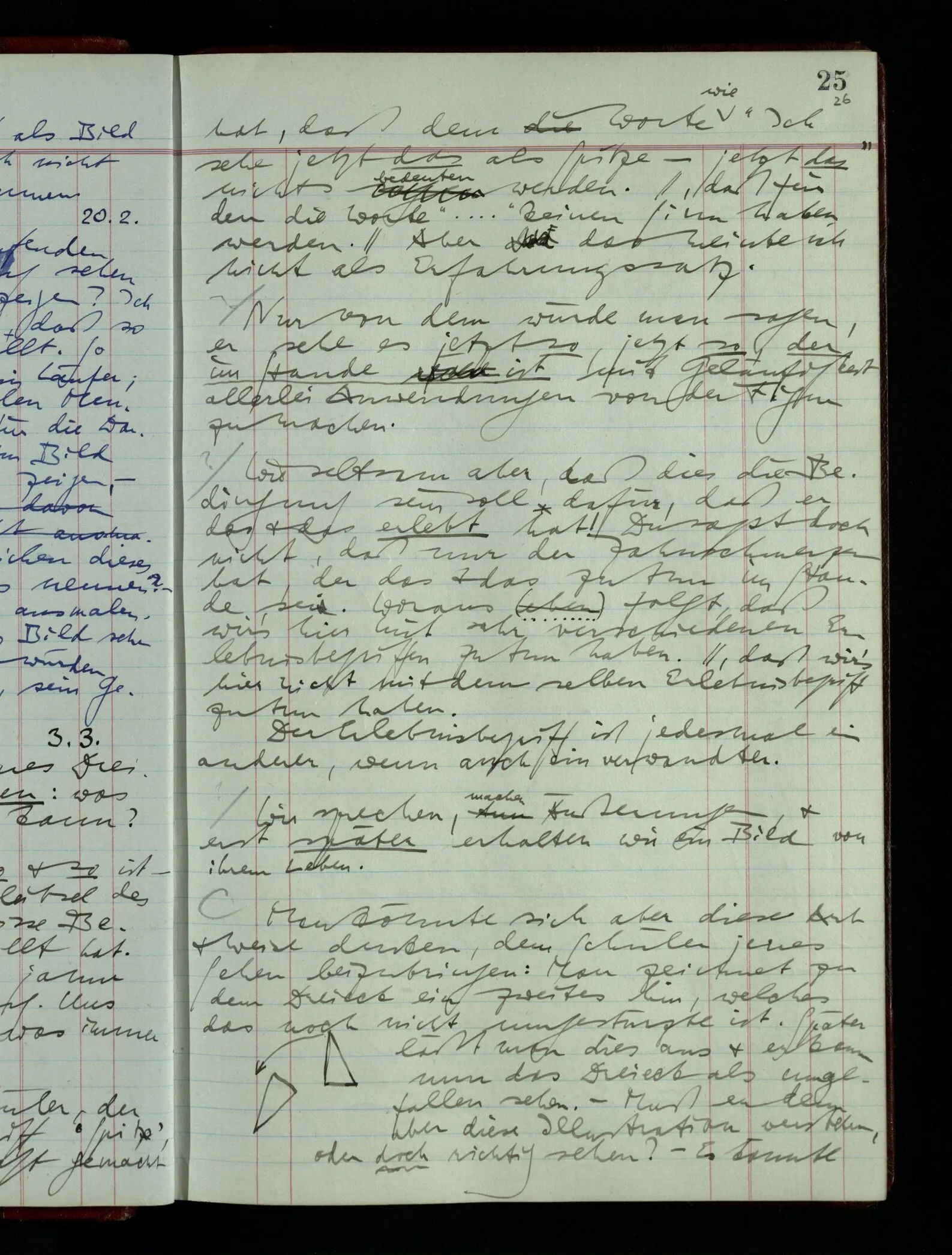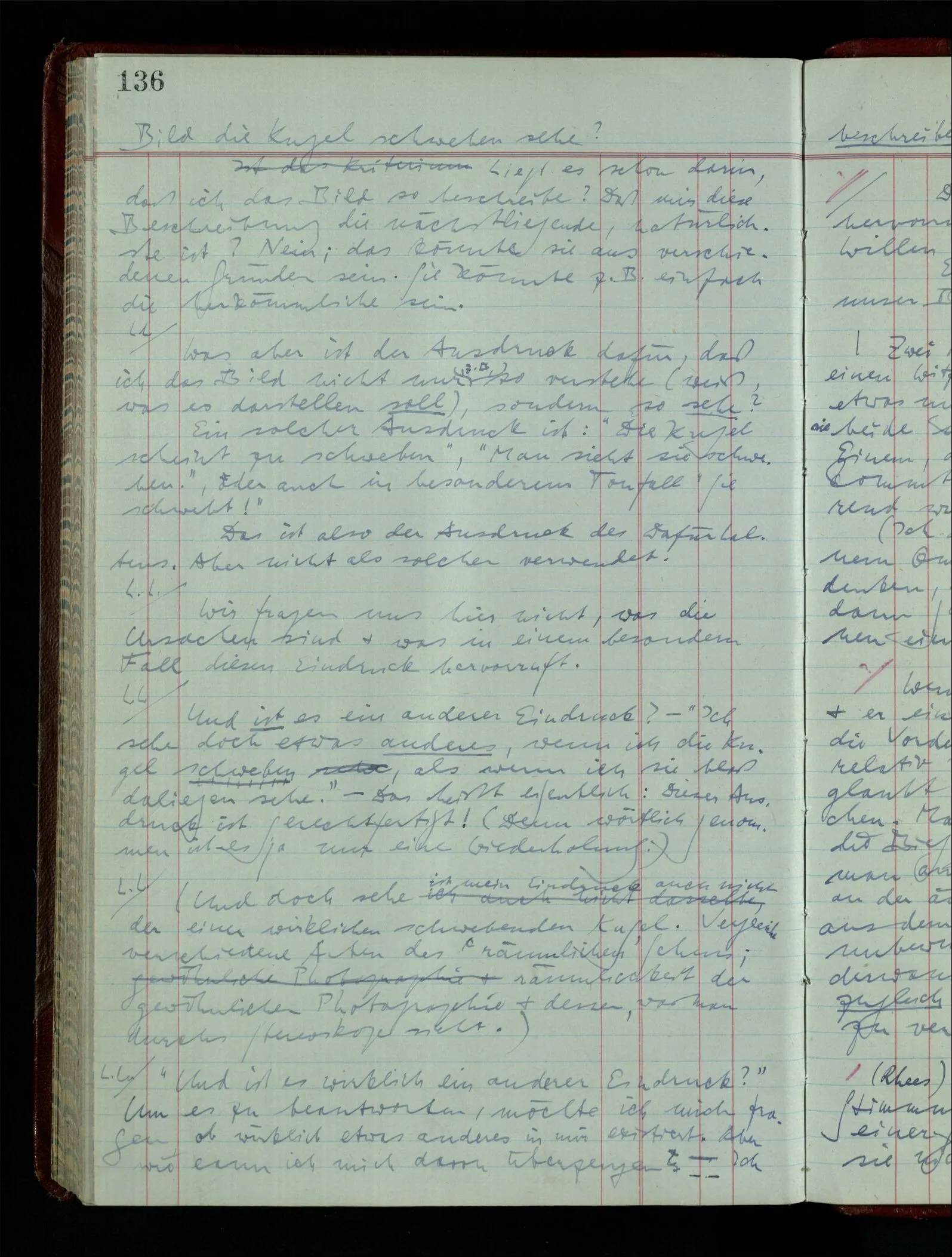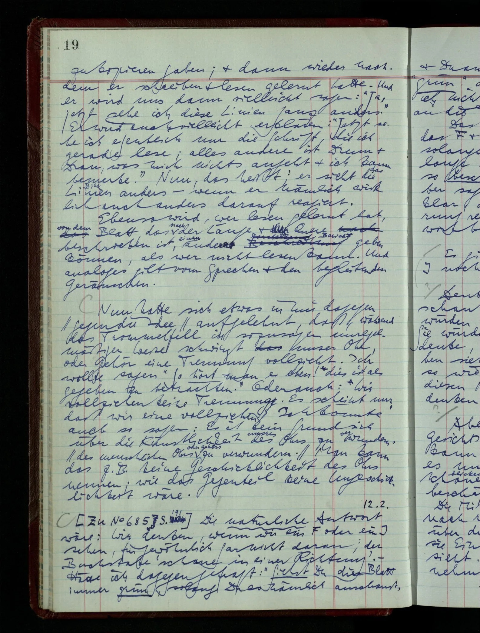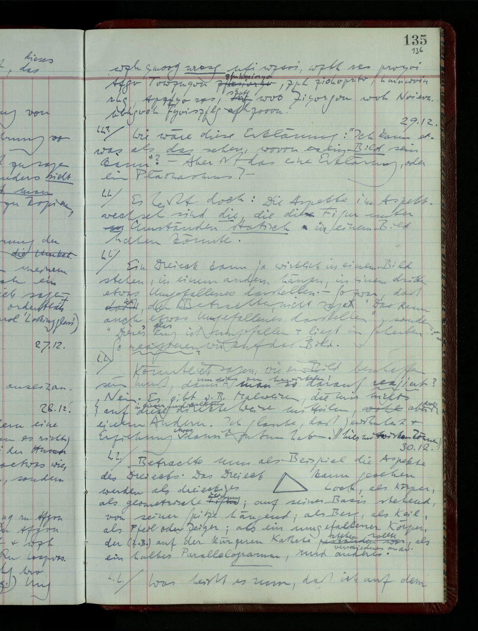 [] “Er sieht es räumlich & kennt sich daher so gut in der Zeichnung aus, als operierte er in dem räumlichen Modell.” Aber ist nicht eben sein besonderes Manipulieren in der Zeichnung das Kriterium dafür, daß er’s räumlich sieht? (Denn was weiß ich sonst von seinem Eindruck?)