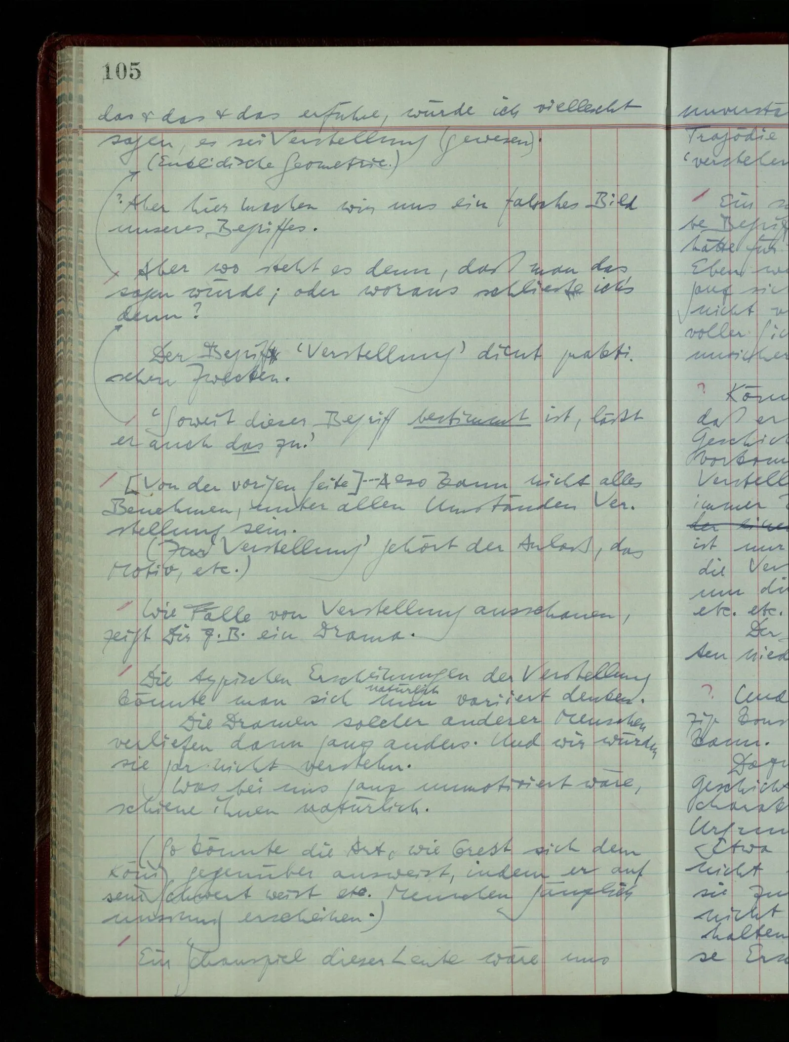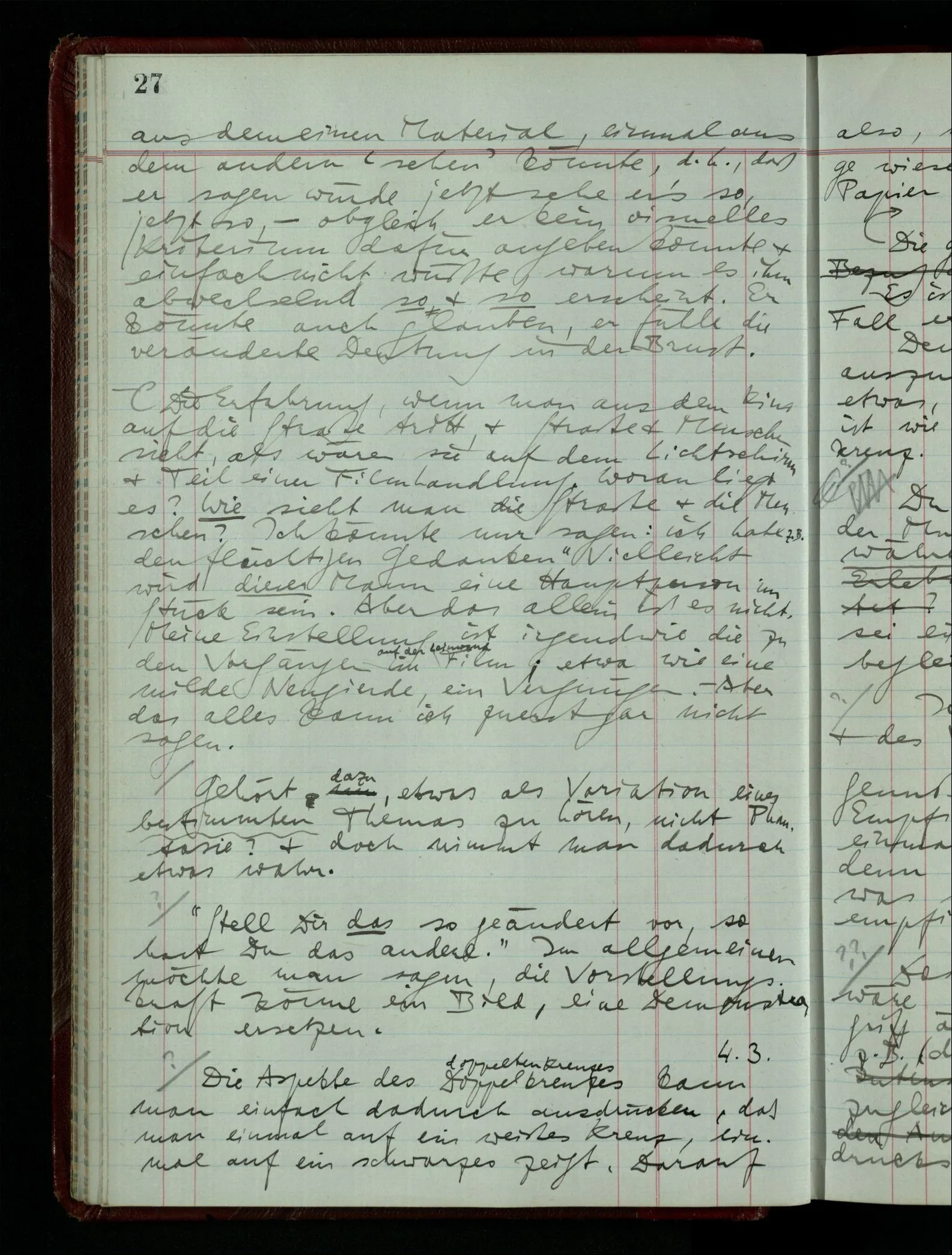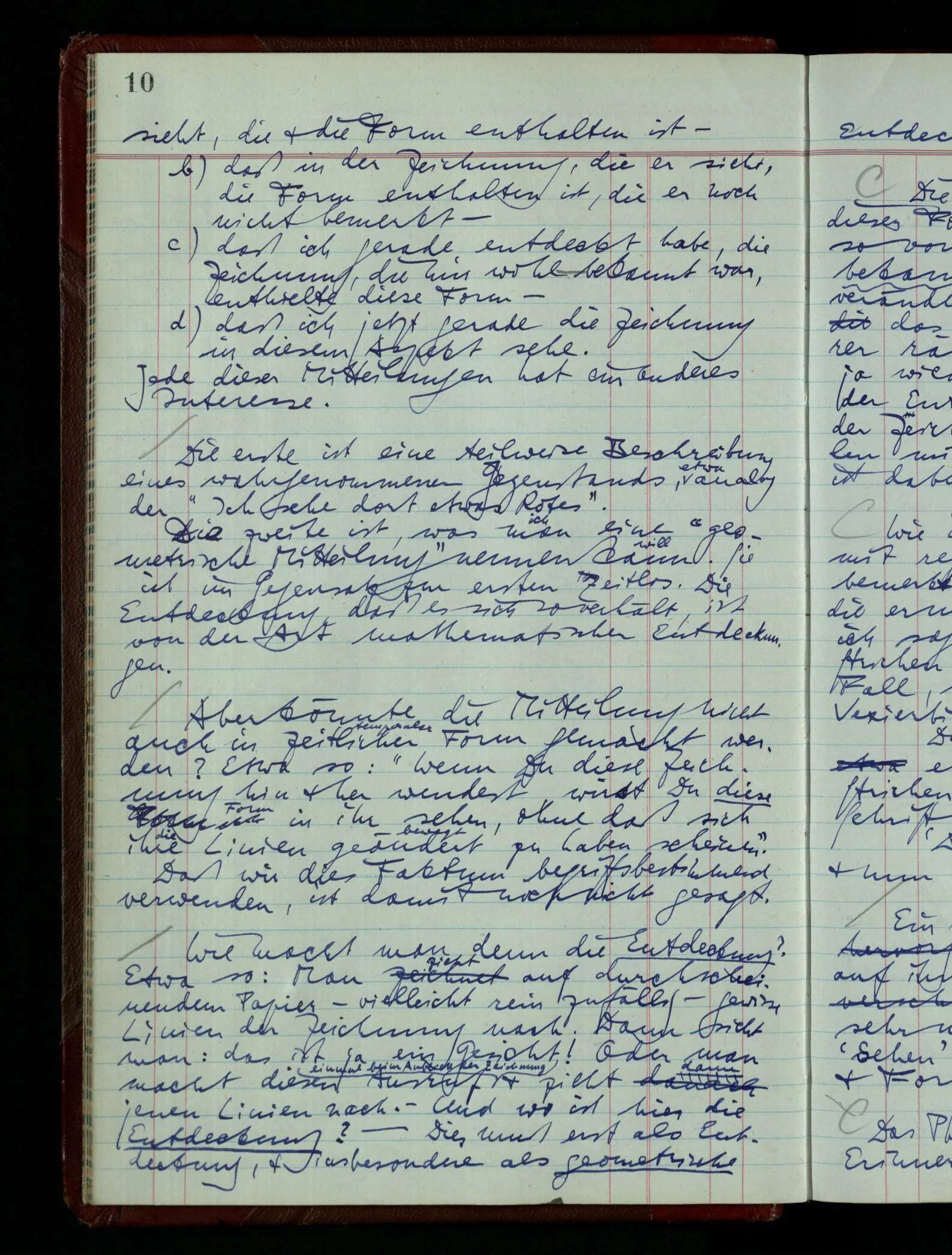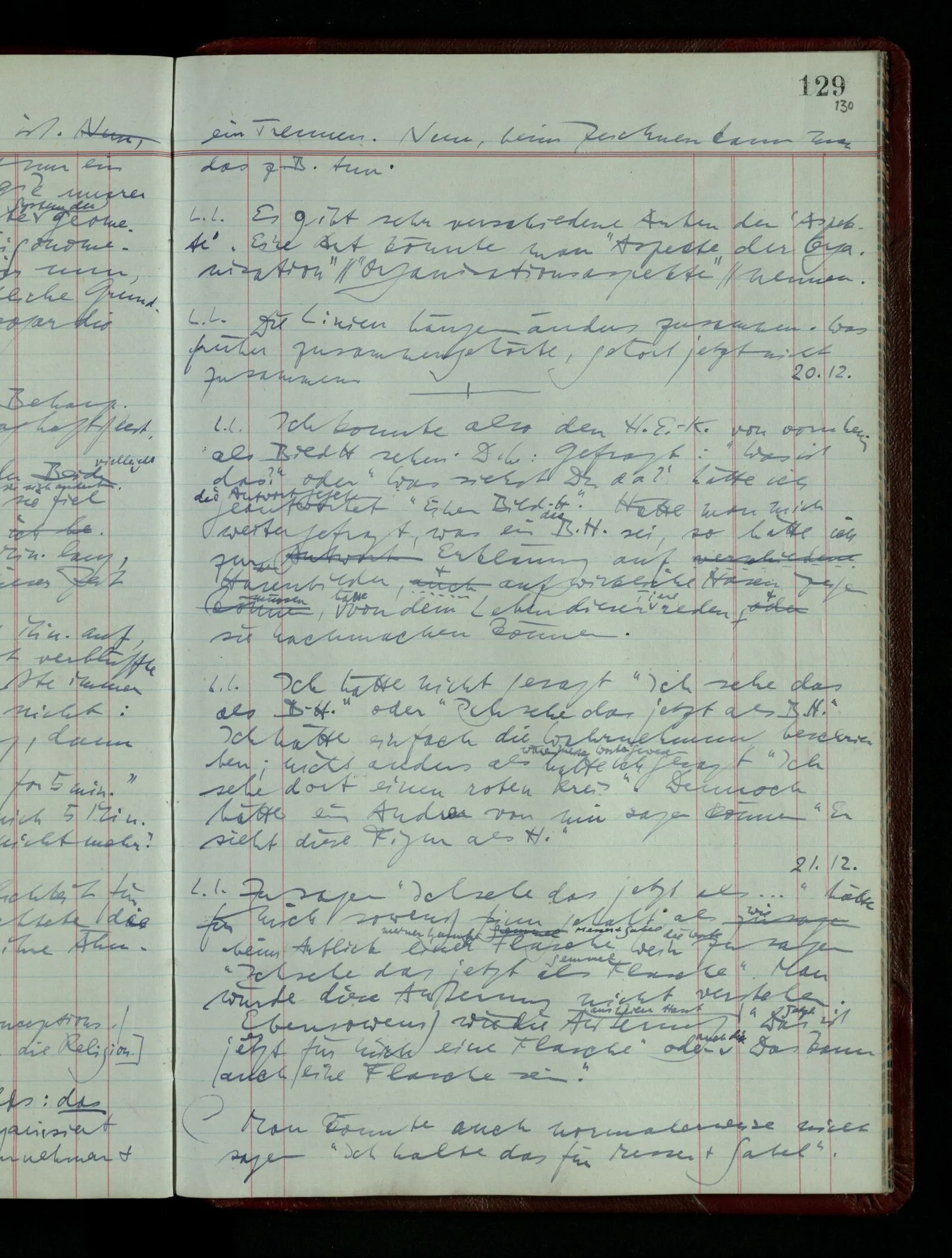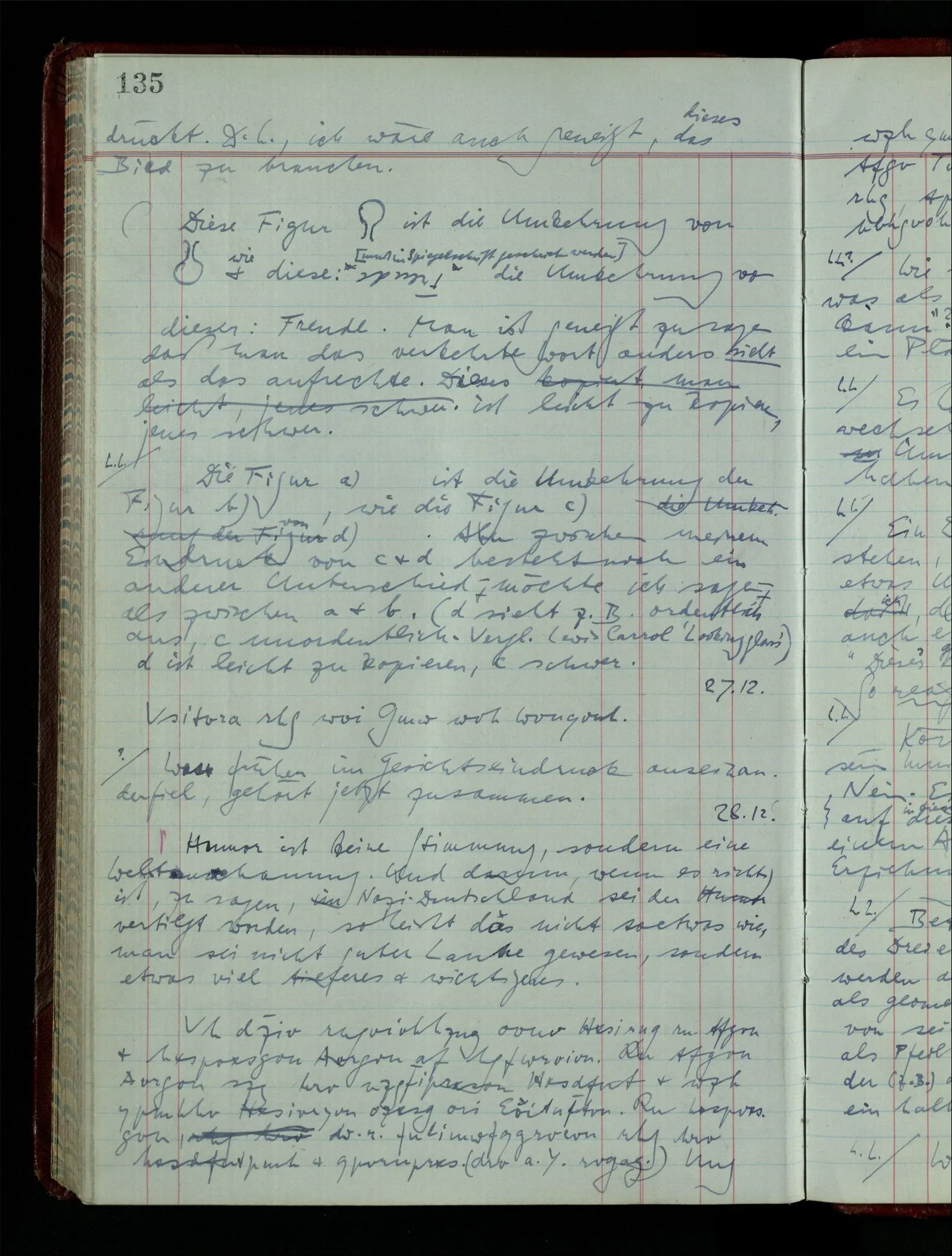 [] “Er sieht es räumlich & kennt sich daher so gut in der Zeichnung aus, als operierte er in dem räumlichen Modell.” Aber ist nicht eben sein besonderes Manipulieren in der Zeichnung das Kriterium dafür, daß er’s räumlich sieht? (Denn was weiß ich sonst von seinem Eindruck?)
