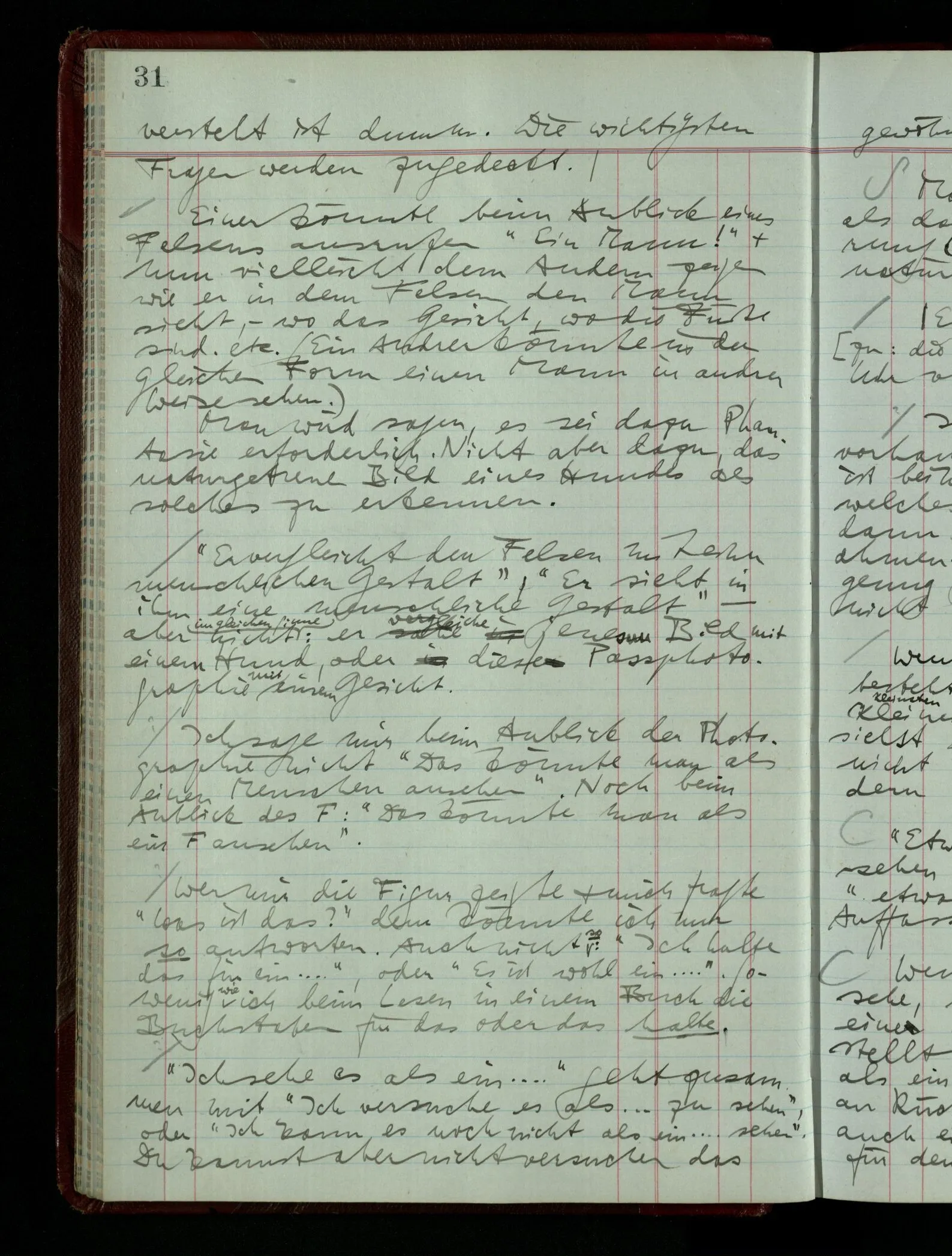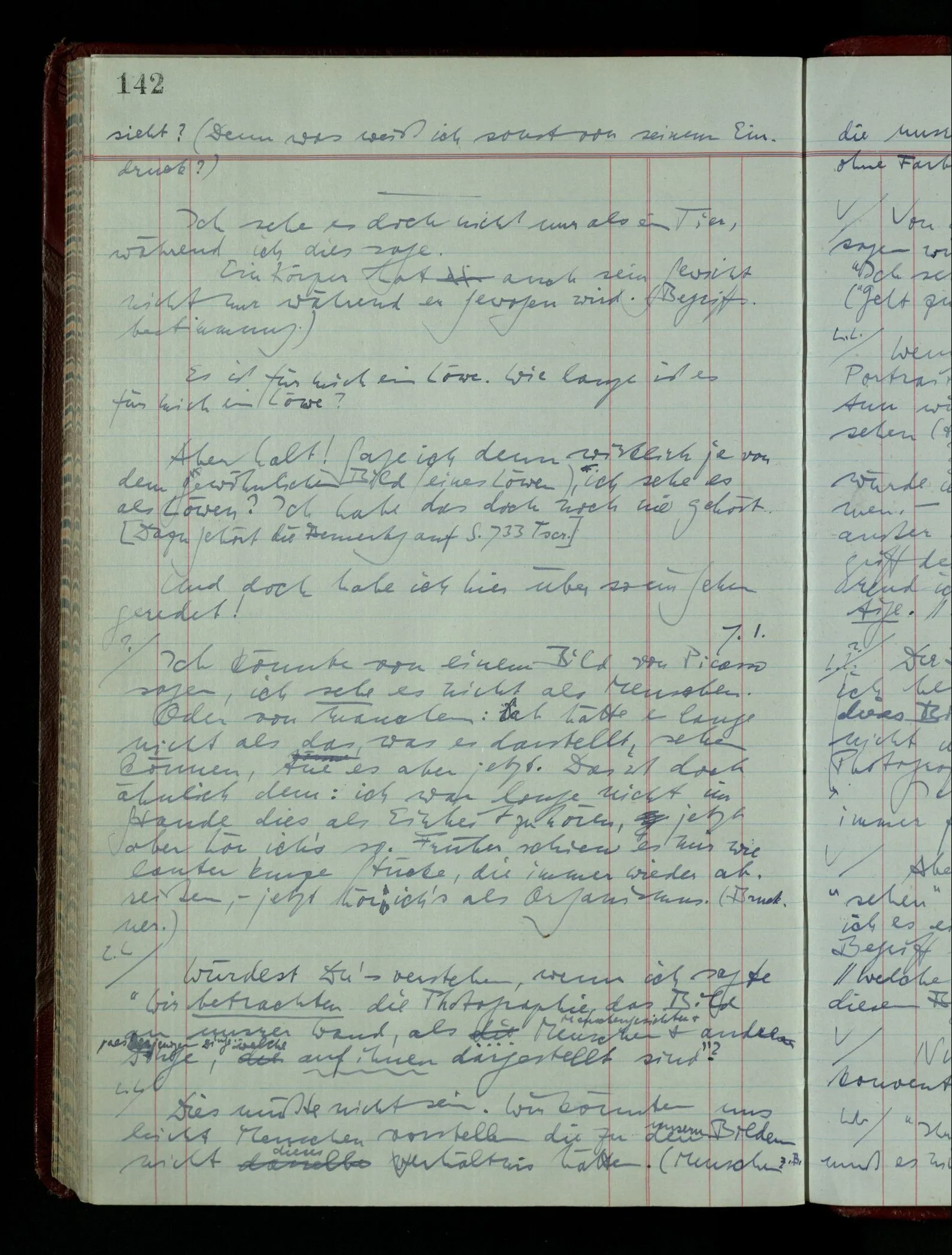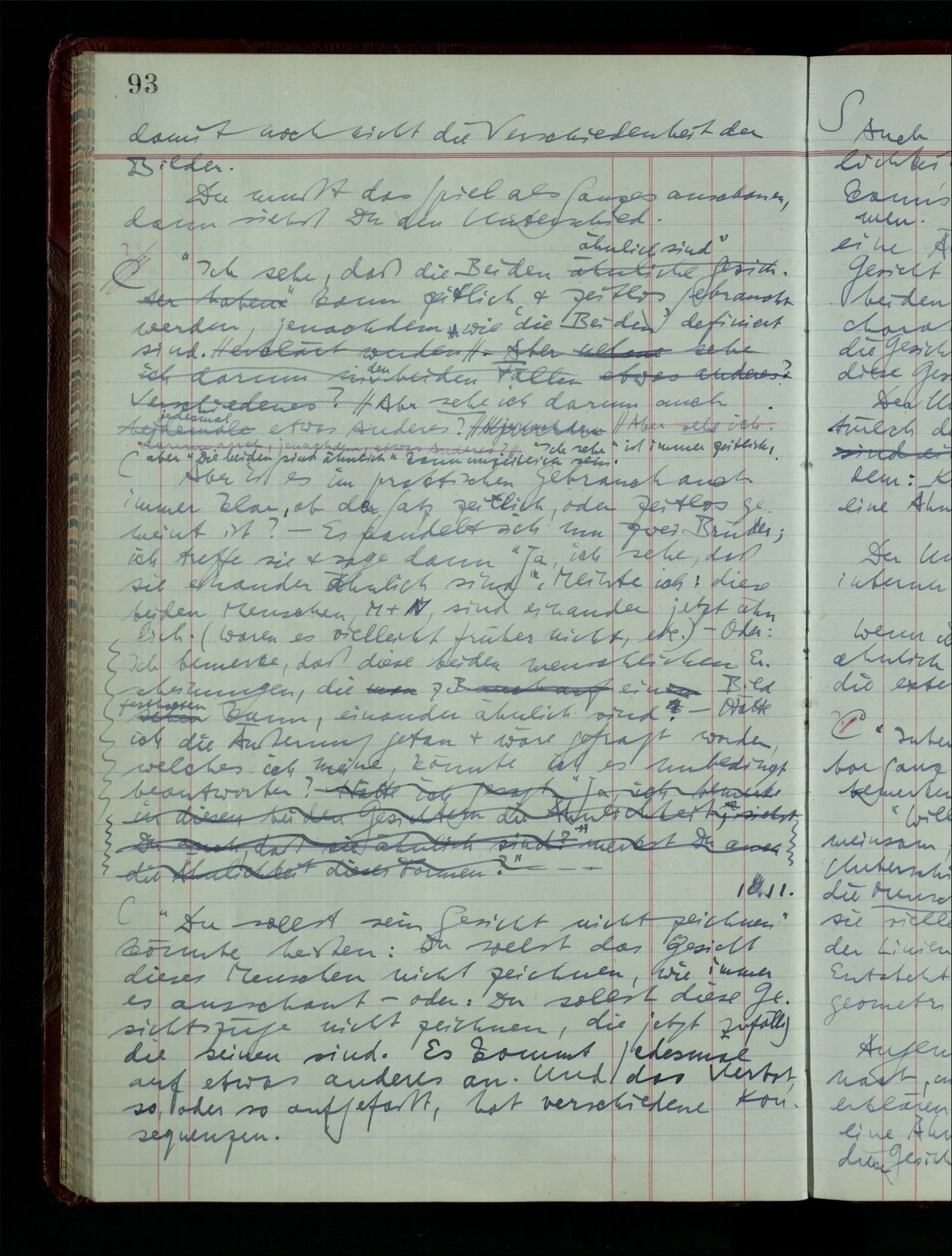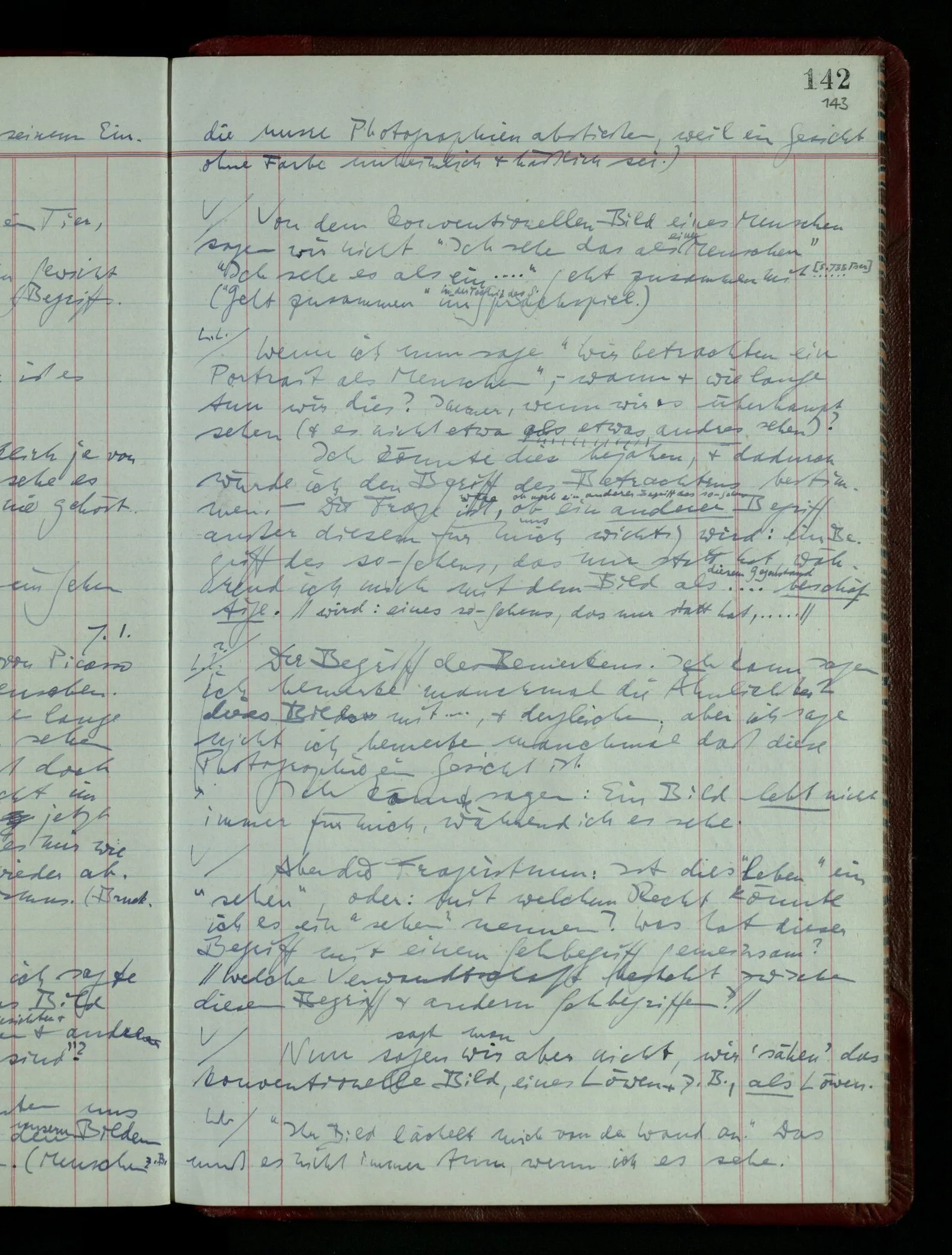 Wenn ich nun sage “Wir betrachten ein Portrait als Menschen”, – wann & wie lange tun wir dies? Immer, wenn wir es überhaupt sehen (& es nicht etwa als etwas andres sehen)? Ich könnte dies bejahen, & dadurch würde ich den Begriff des Betrachtens bestimmen. – Die Frage ist, ob ein anderer Begriff außer diesem für mich wichtig wird: ein Begriff des so-Sehens, das nur statt hat, während ich mich mit dem Bild als ‥‥ beschäftige.