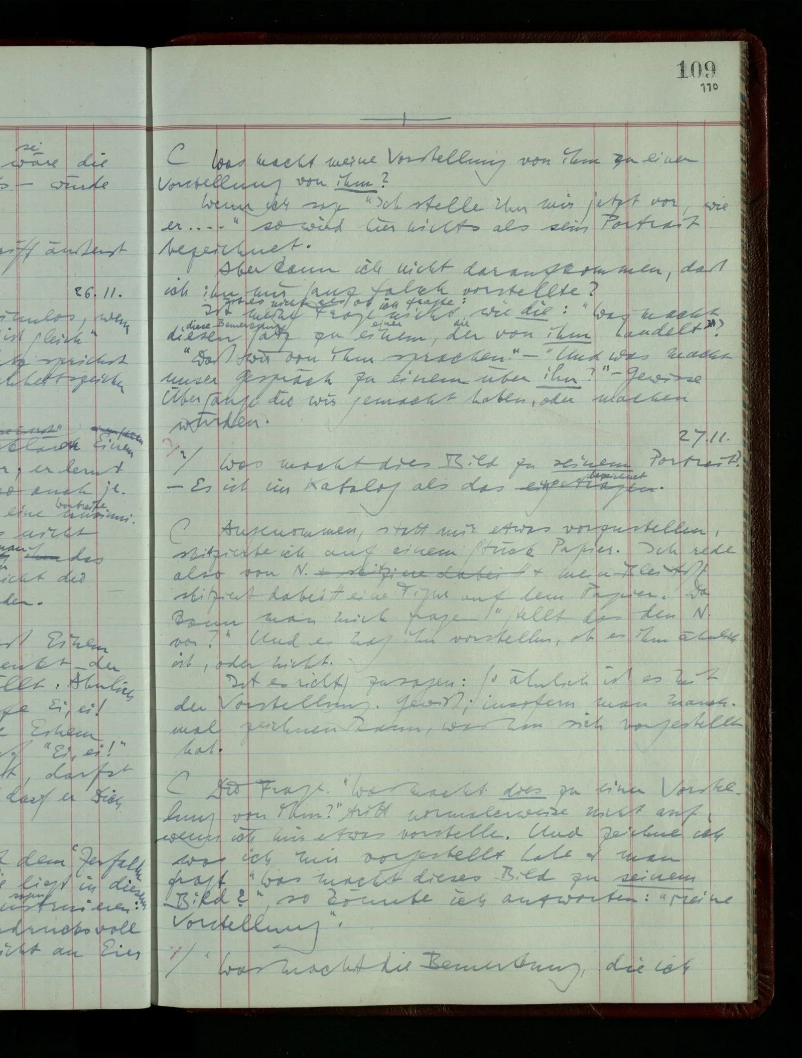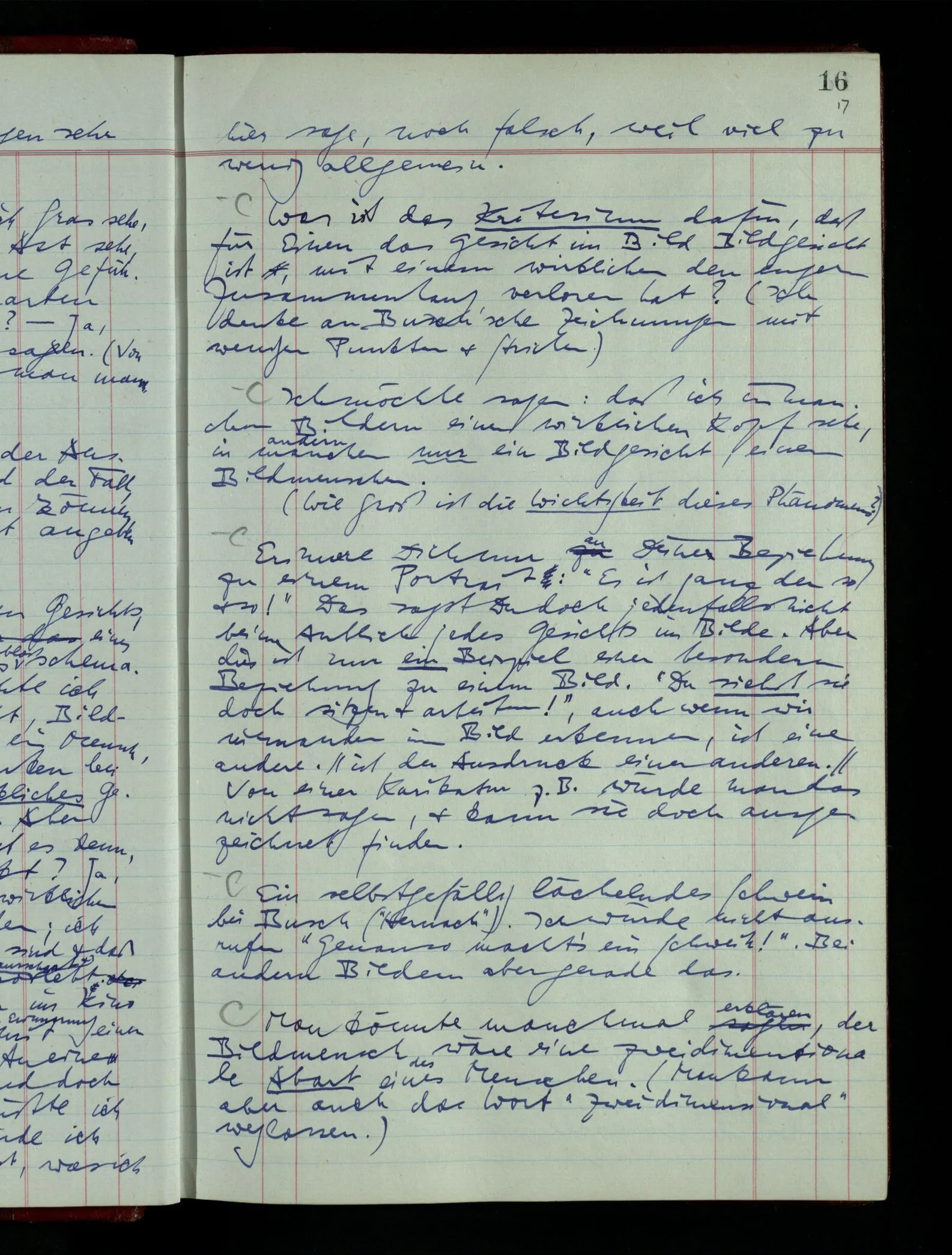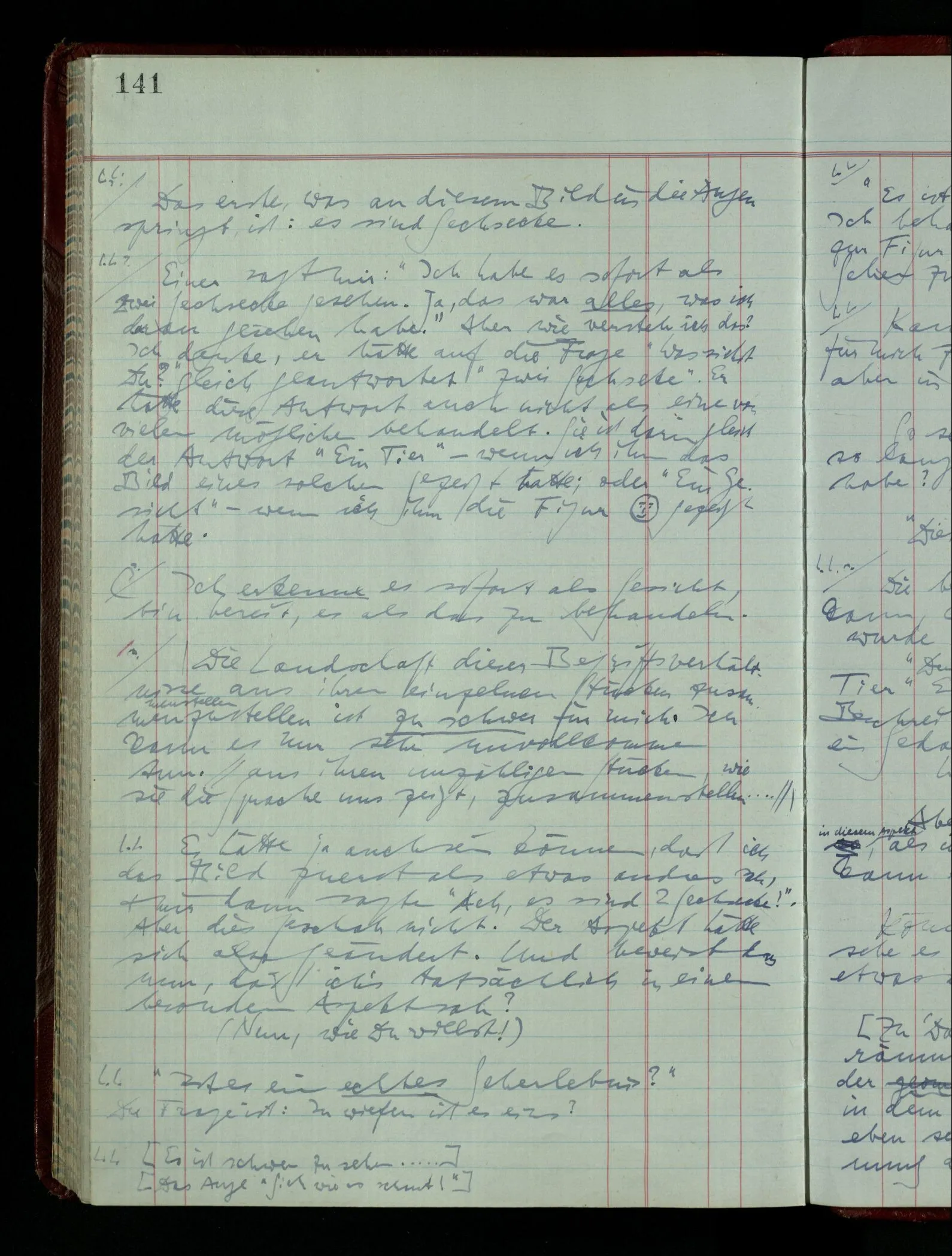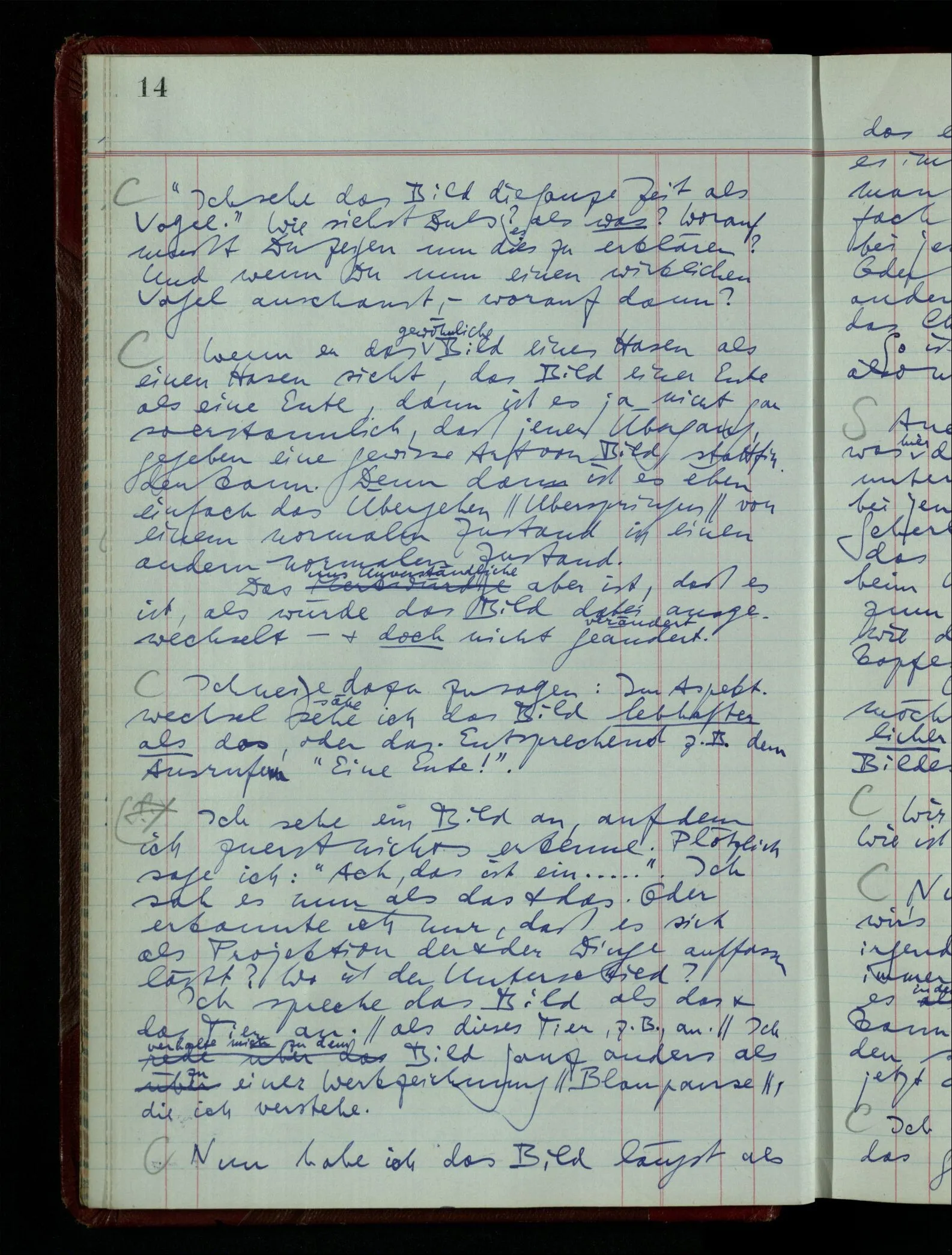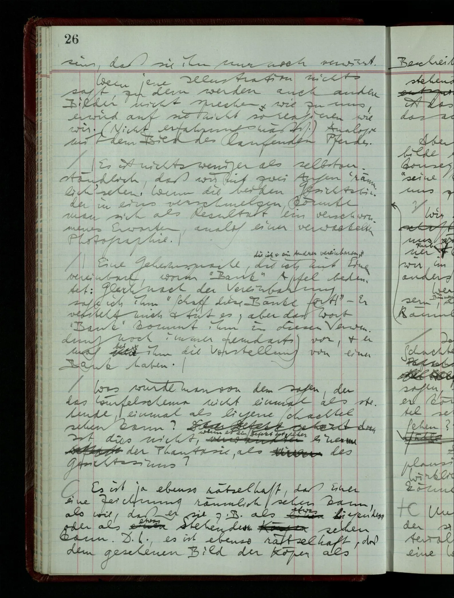 Wenn ich nun sage “Wir betrachten ein Portrait als Menschen”, – wann & wie lange tun wir dies? Immer, wenn wir es überhaupt sehen (& es nicht etwa als etwas andres sehen)? Ich könnte dies bejahen, & dadurch würde ich den Begriff des Betrachtens bestimmen. – Die Frage ist, ob ein anderer Begriff außer diesem für mich wichtig wird: ein Begriff des so-Sehens, das nur statt hat, während ich mich mit dem Bild als ‥‥ beschäftige.