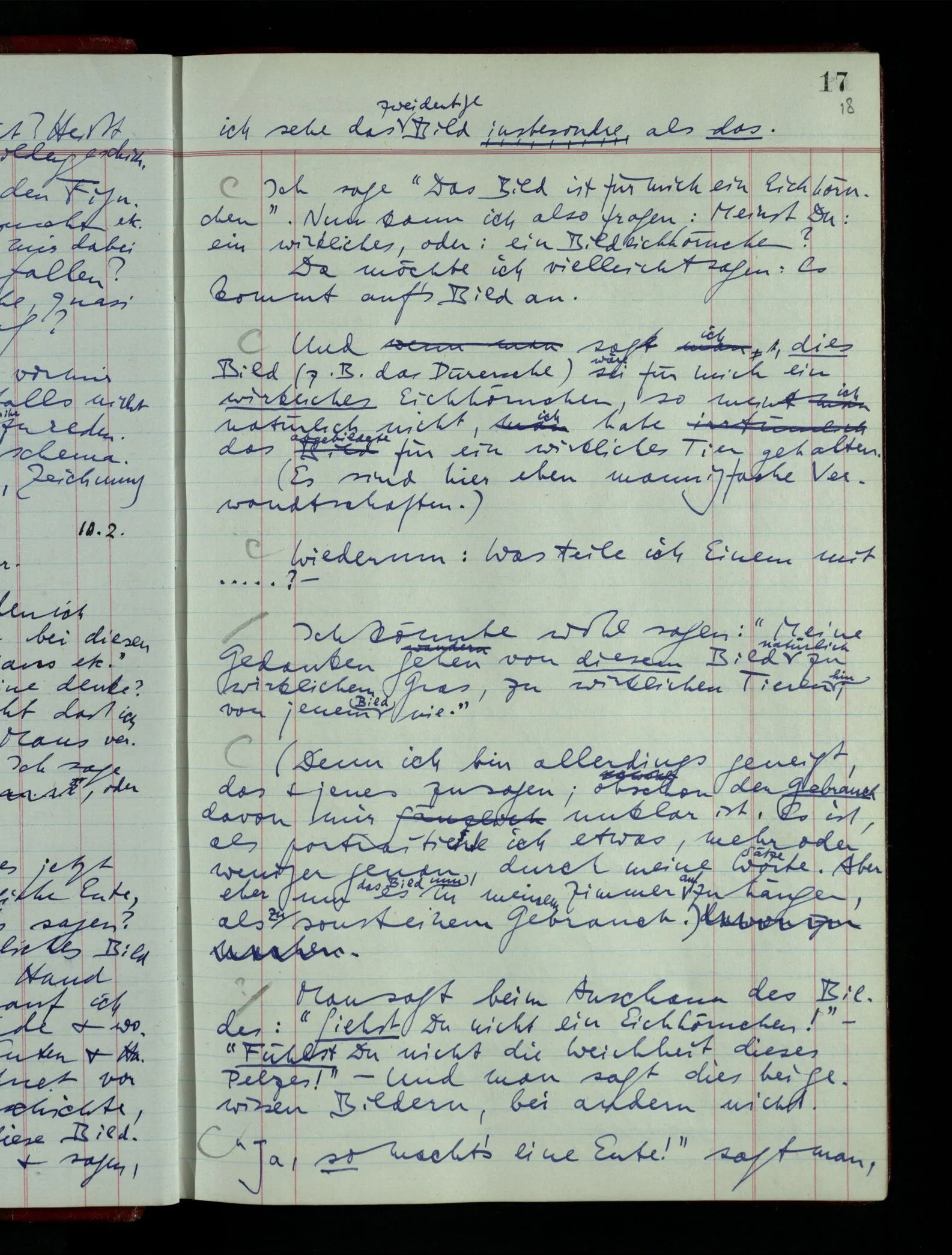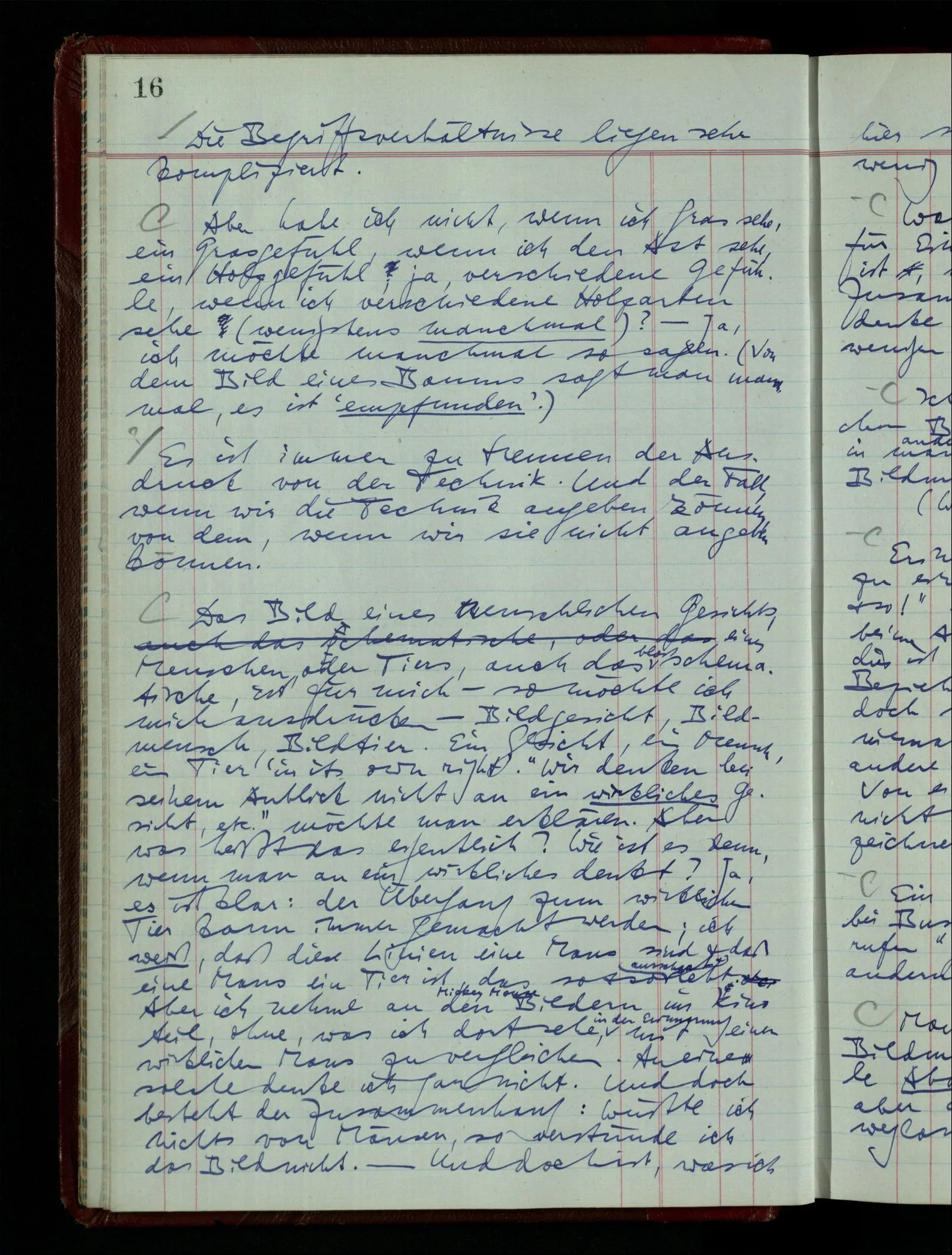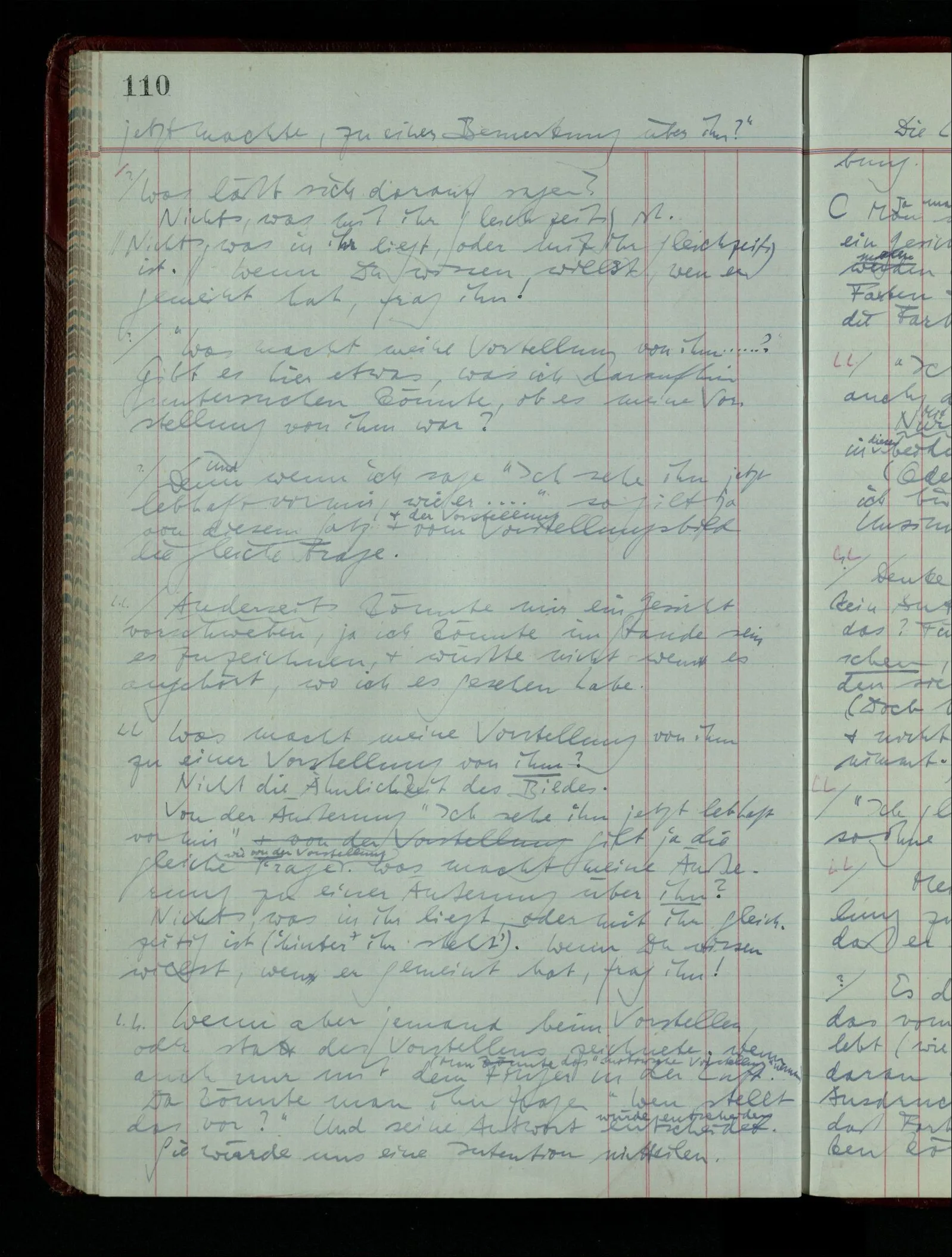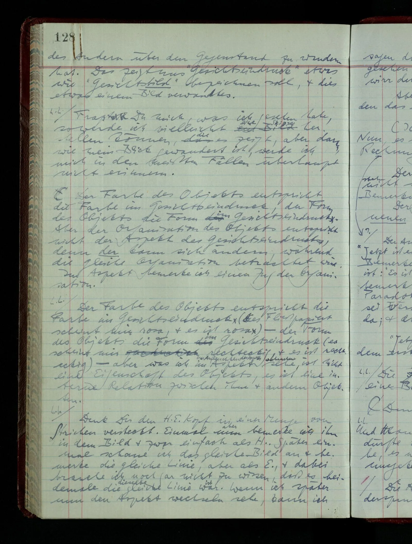 Wenn ich nun sage “Wir betrachten ein Portrait als Menschen”, – wann & wie lange tun wir dies? Immer, wenn wir es überhaupt sehen (& es nicht etwa als etwas andres sehen)? Ich könnte dies bejahen, & dadurch würde ich den Begriff des Betrachtens bestimmen. – Die Frage ist, ob ein anderer Begriff außer diesem für mich wichtig wird: ein Begriff des so-Sehens, das nur statt hat, während ich mich mit dem Bild als ‥‥ beschäftige.