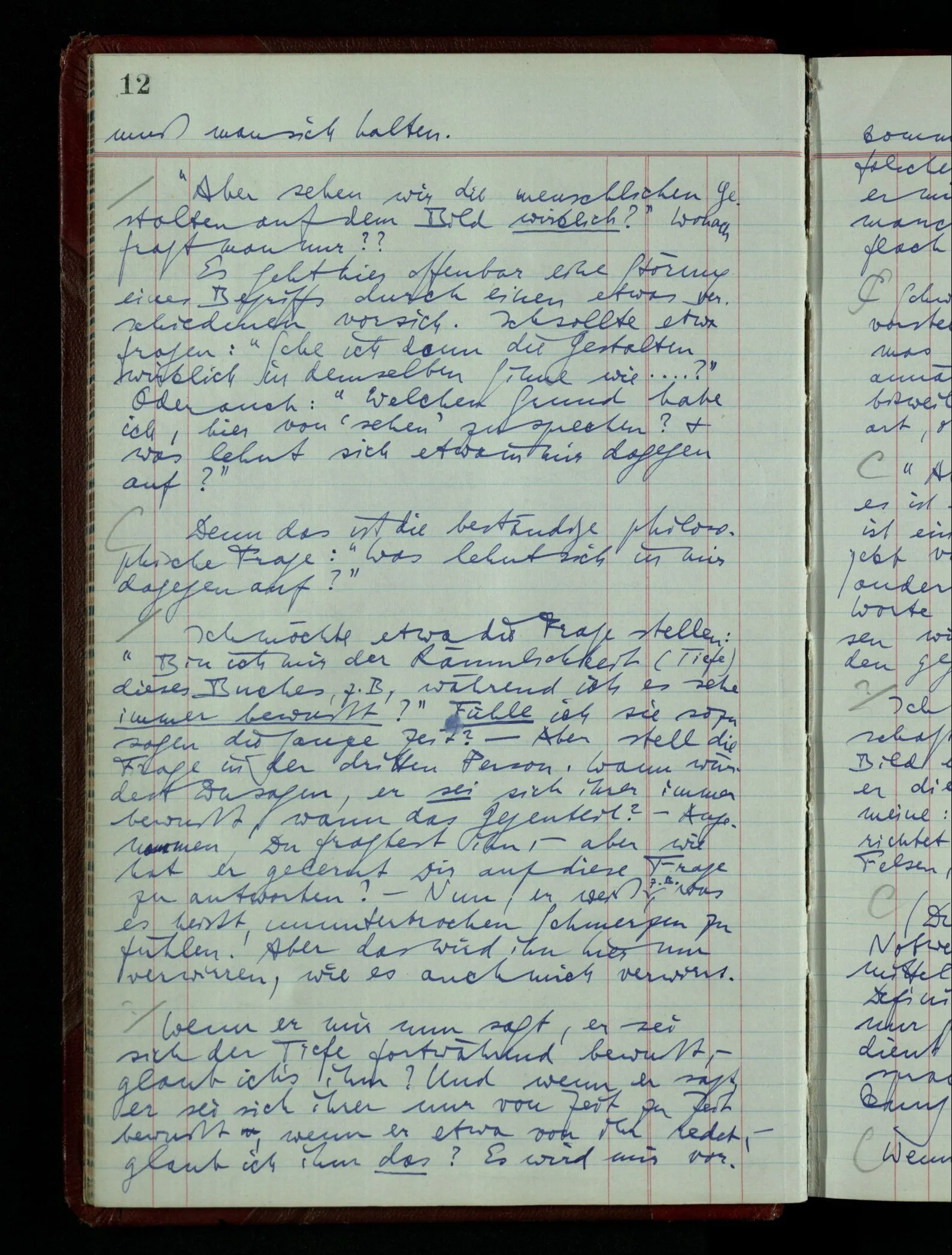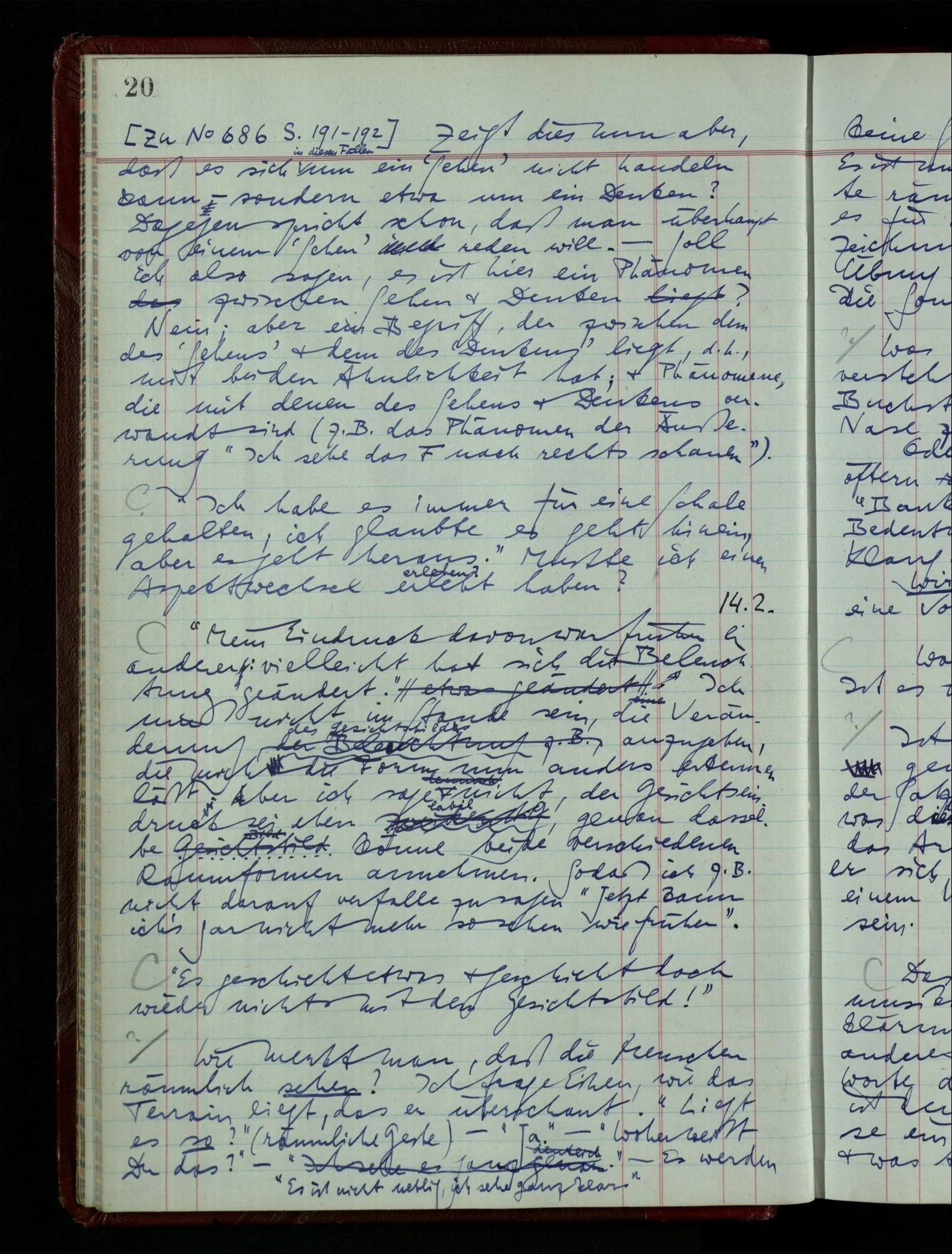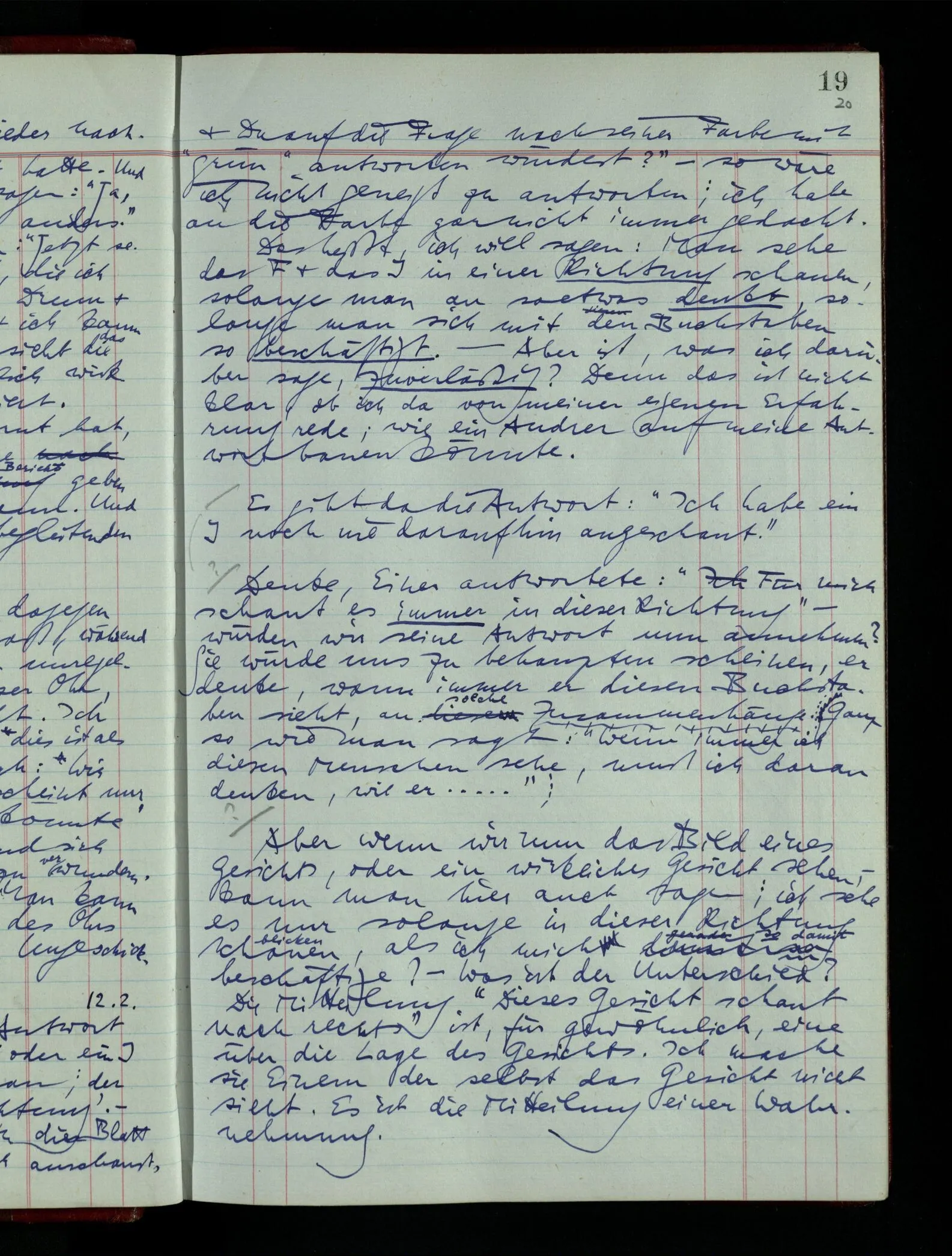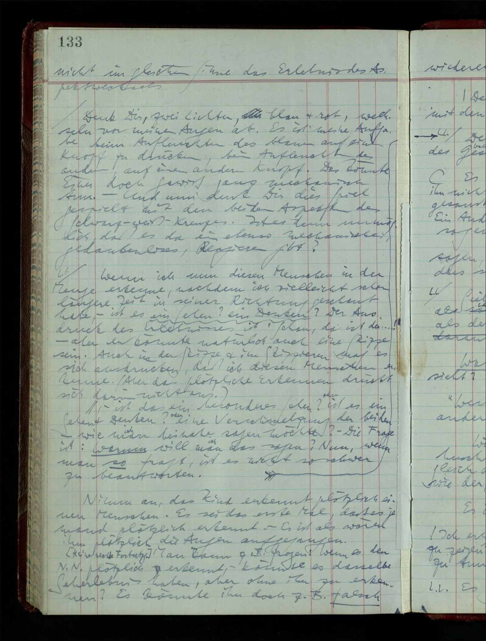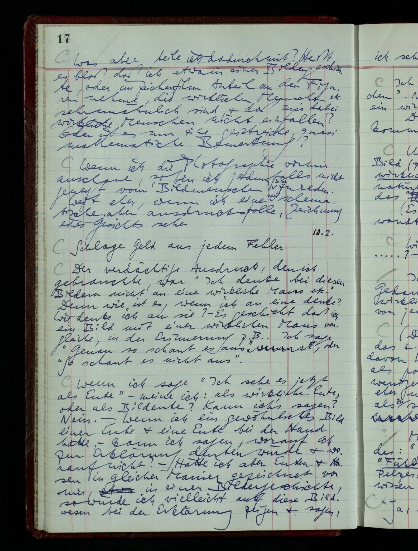 Wenn ich nun sage “Wir betrachten ein Portrait als Menschen”, – wann & wie lange tun wir dies? Immer, wenn wir es überhaupt sehen (& es nicht etwa als etwas andres sehen)? Ich könnte dies bejahen, & dadurch würde ich den Begriff des Betrachtens bestimmen. – Die Frage ist, ob ein anderer Begriff außer diesem für mich wichtig wird: ein Begriff des so-Sehens, das nur statt hat, während ich mich mit dem Bild als ‥‥ beschäftige.