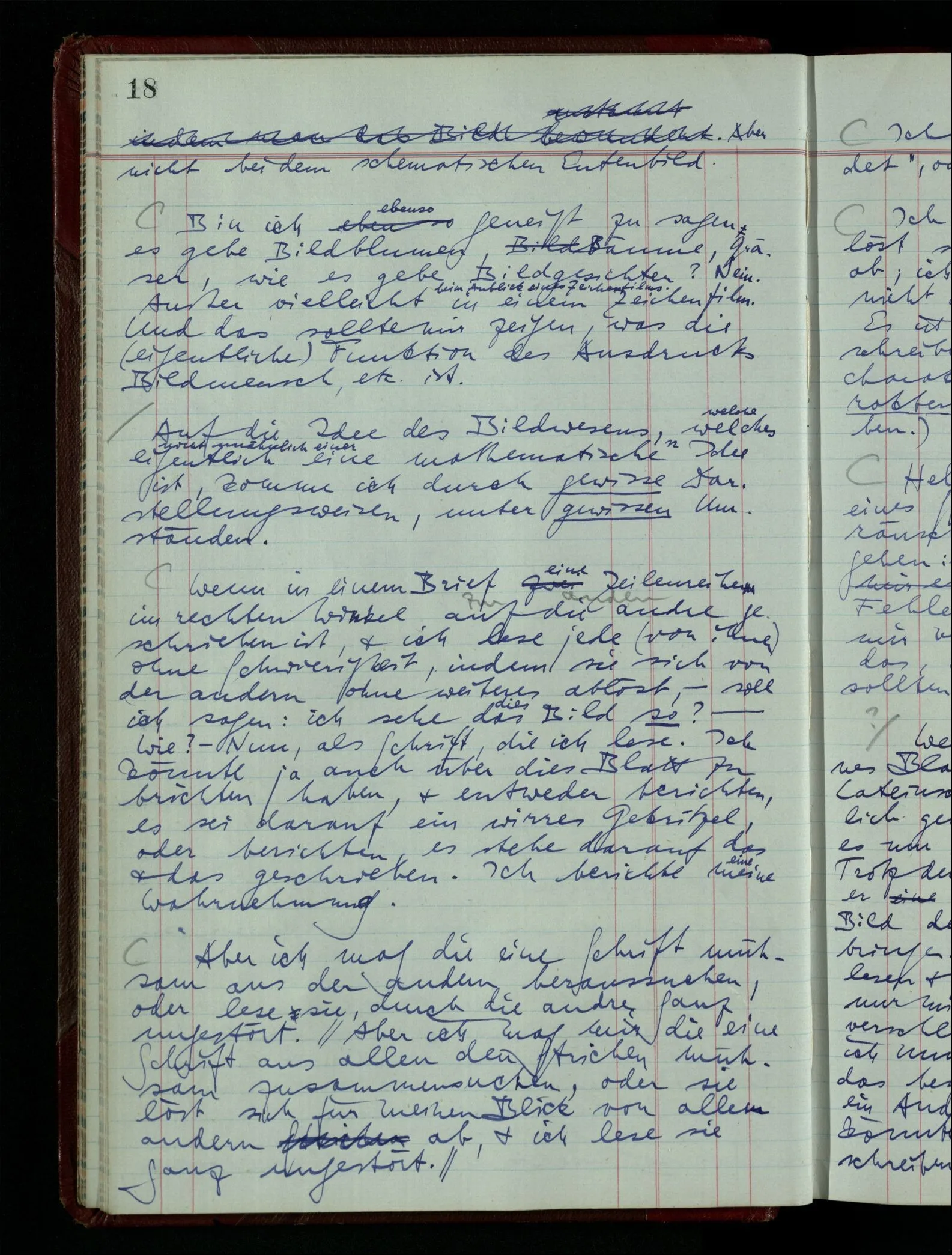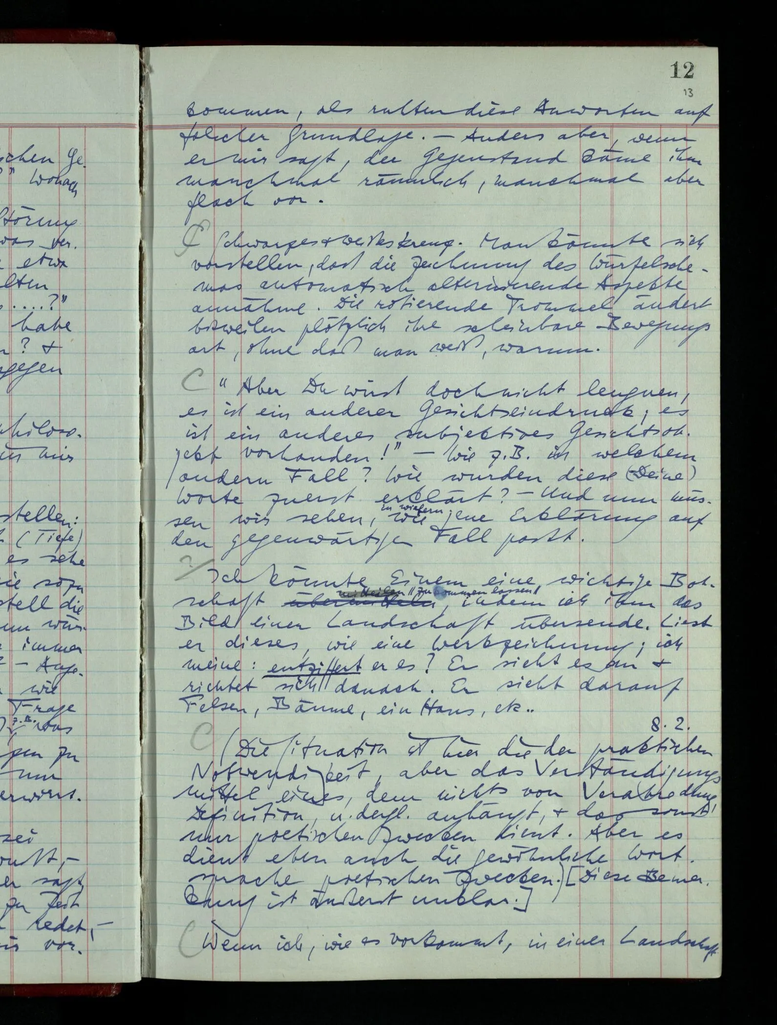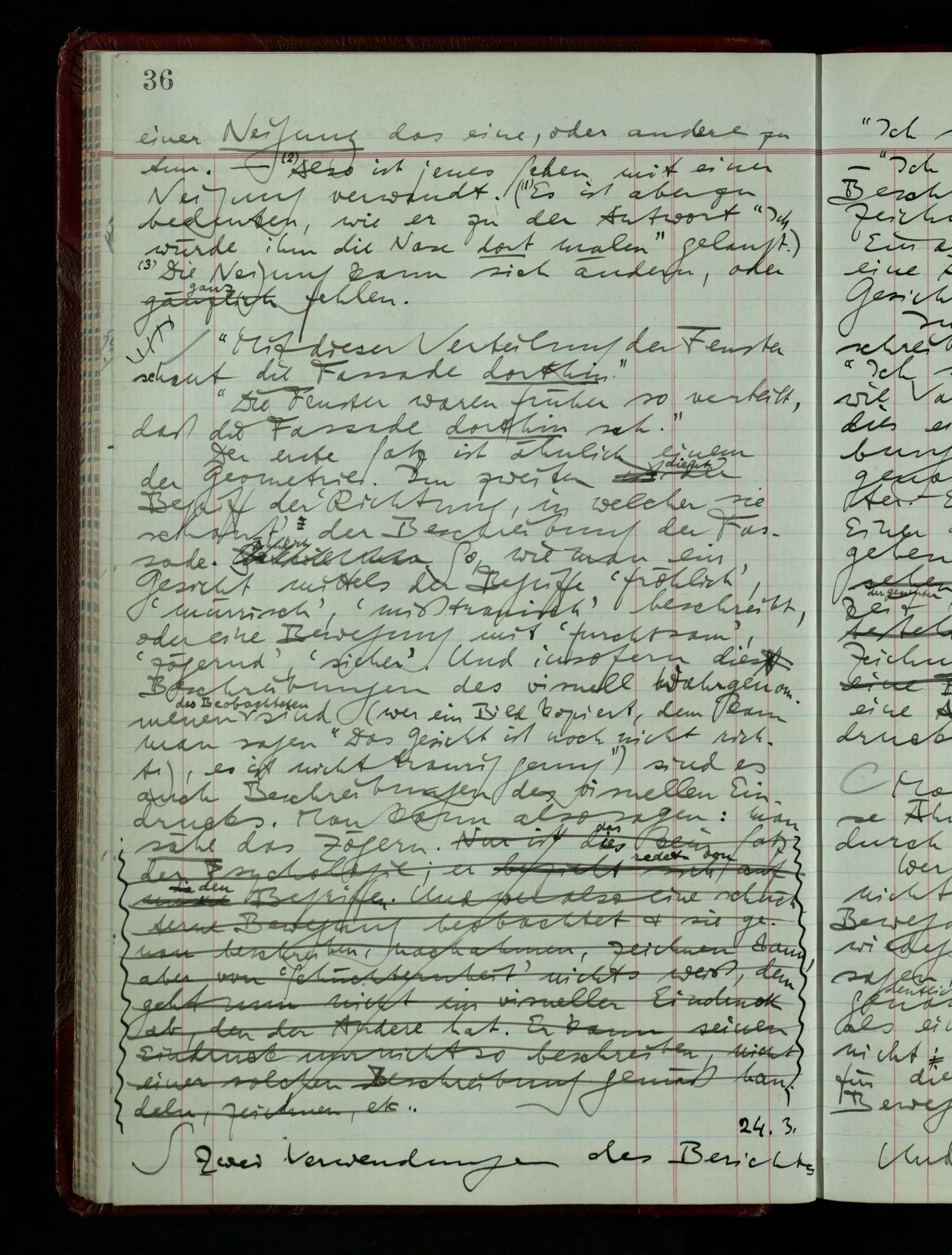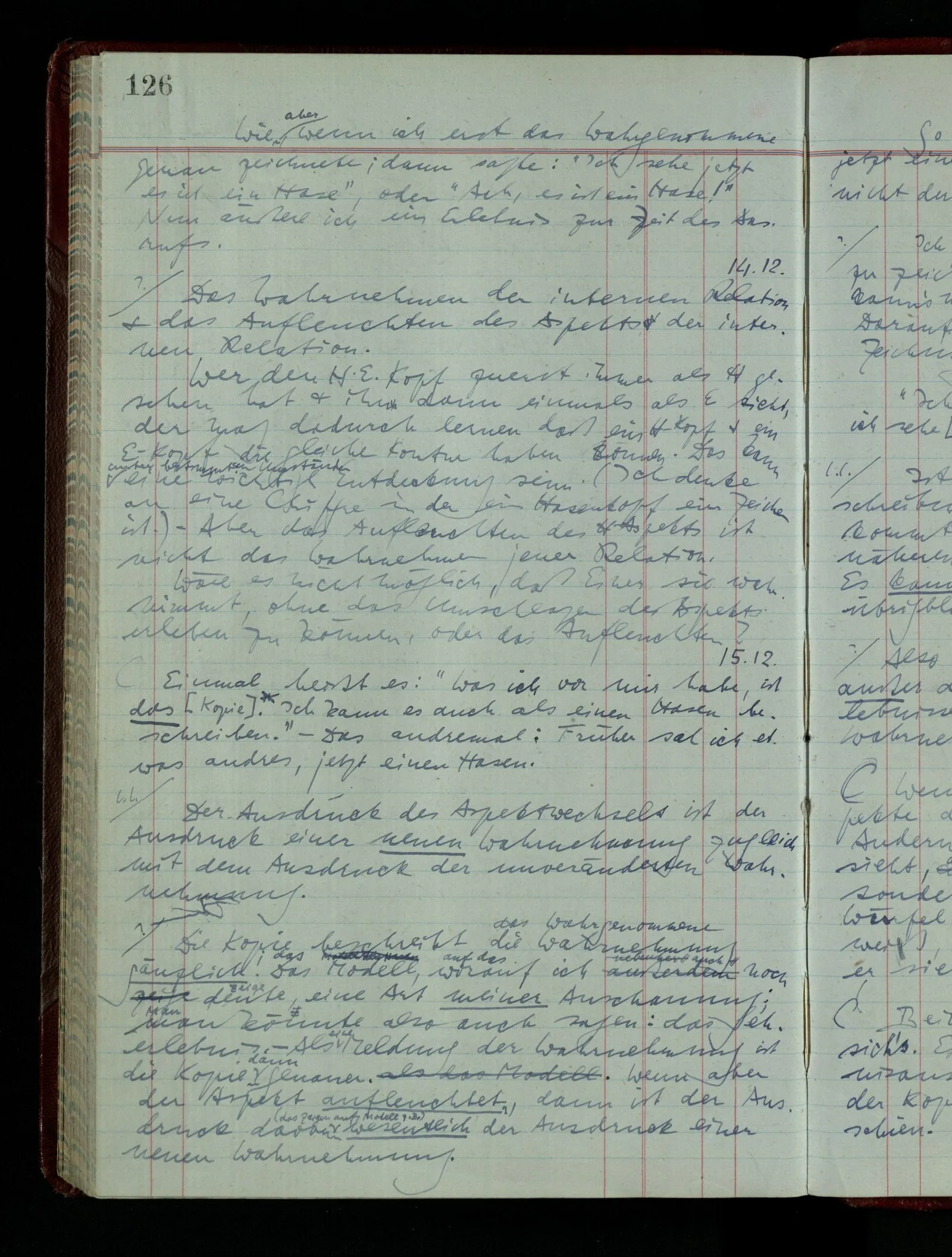 Wenn ich nun sage “Wir betrachten ein Portrait als Menschen”, – wann & wie lange tun wir dies? Immer, wenn wir es überhaupt sehen (& es nicht etwa als etwas andres sehen)? Ich könnte dies bejahen, & dadurch würde ich den Begriff des Betrachtens bestimmen. – Die Frage ist, ob ein anderer Begriff außer diesem für mich wichtig wird: ein Begriff des so-Sehens, das nur statt hat, während ich mich mit dem Bild als ‥‥ beschäftige.