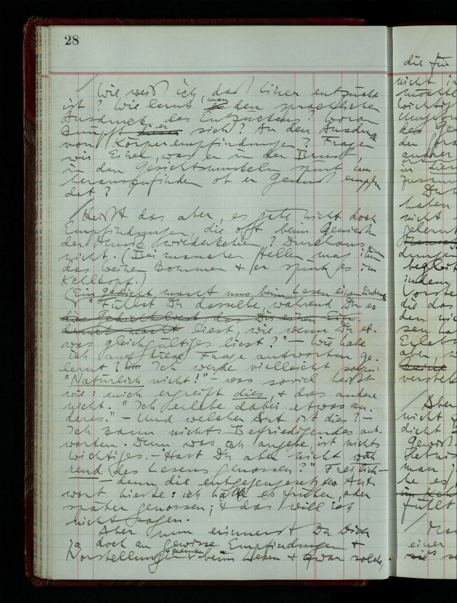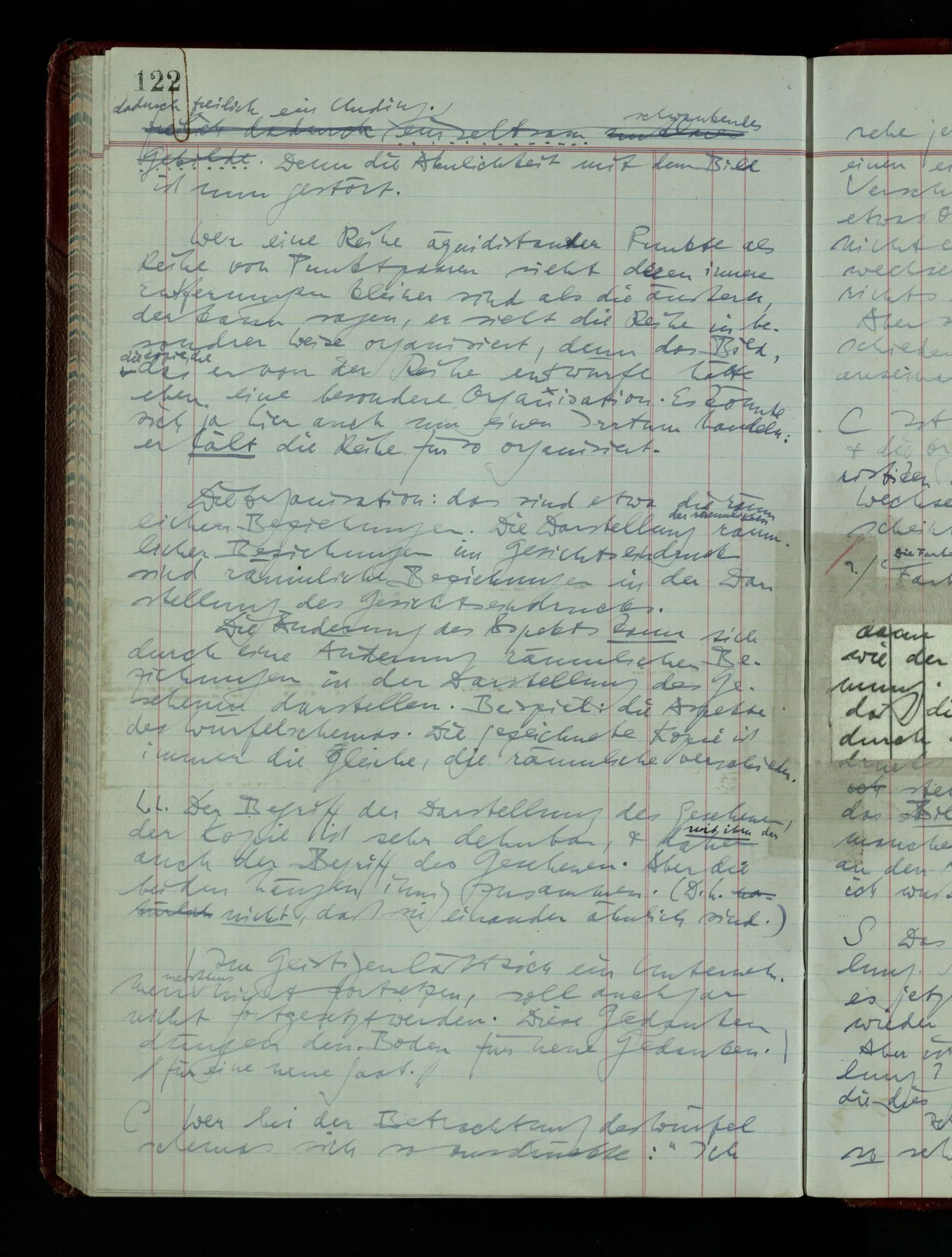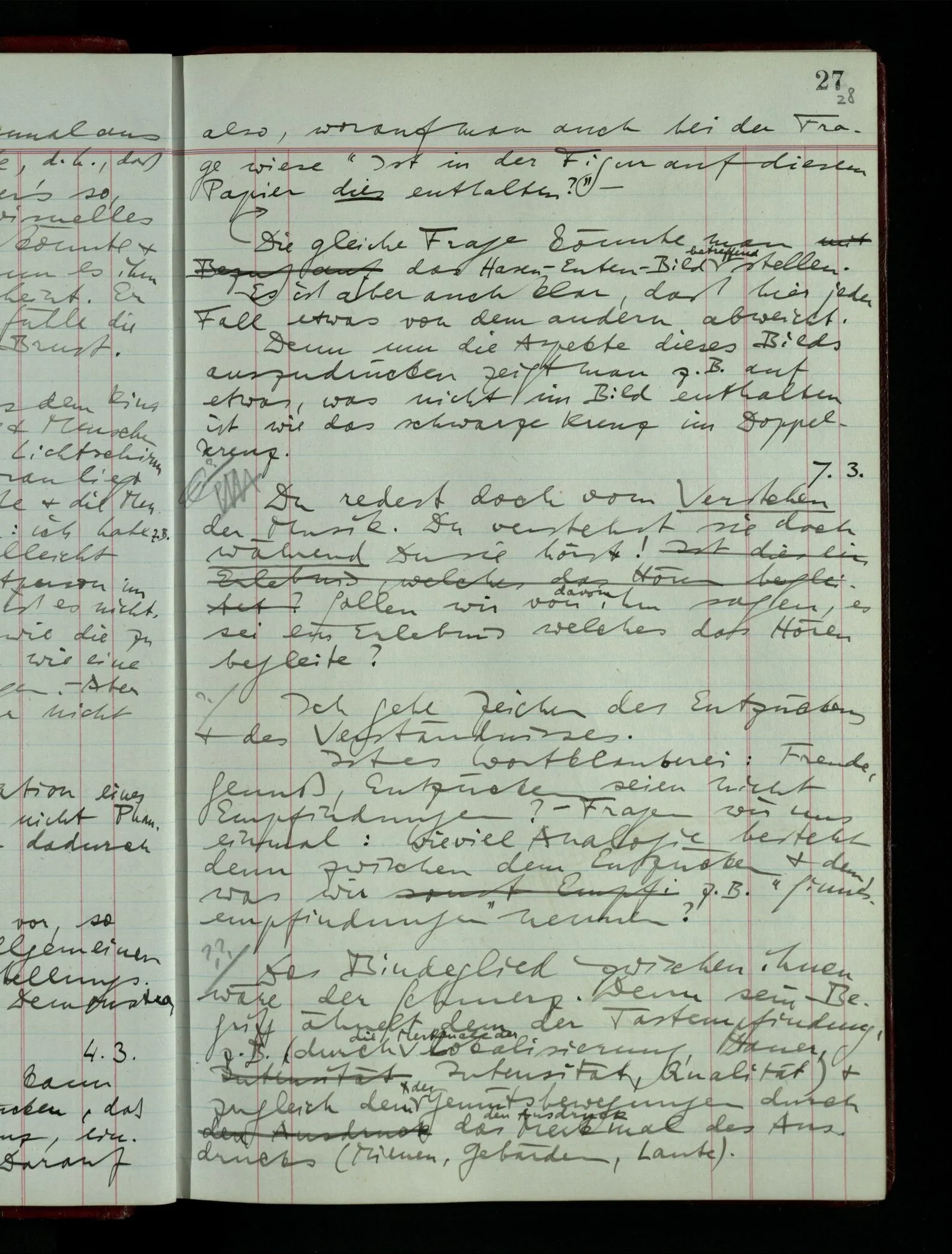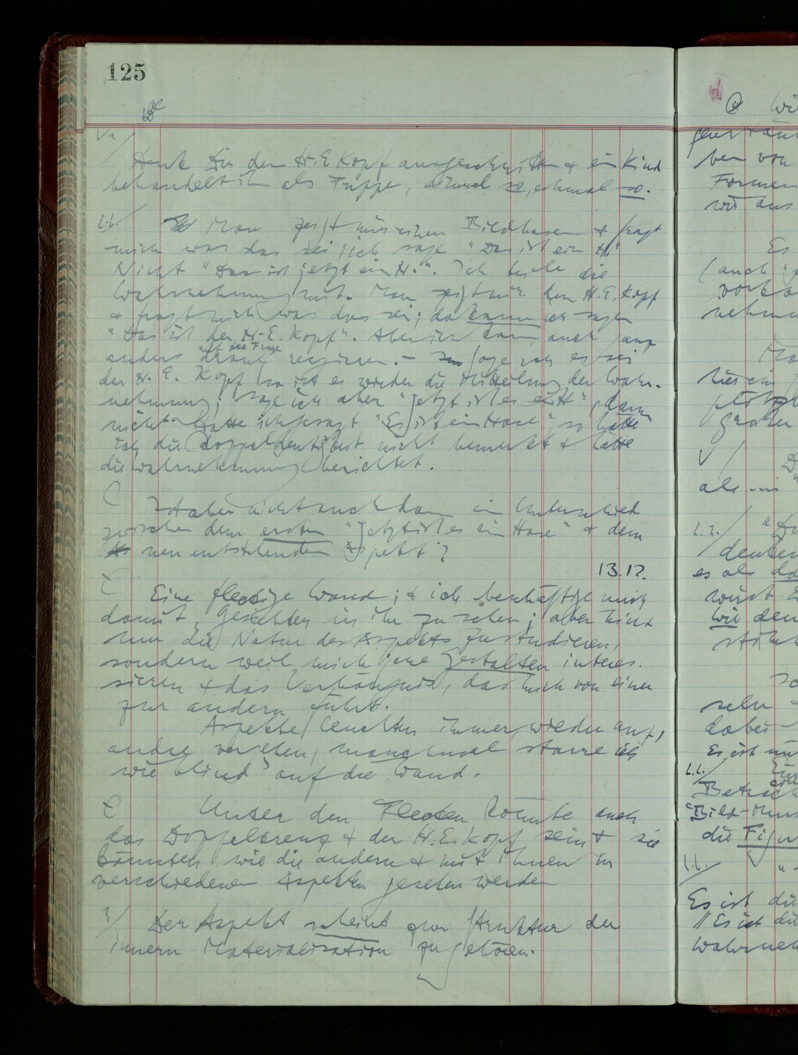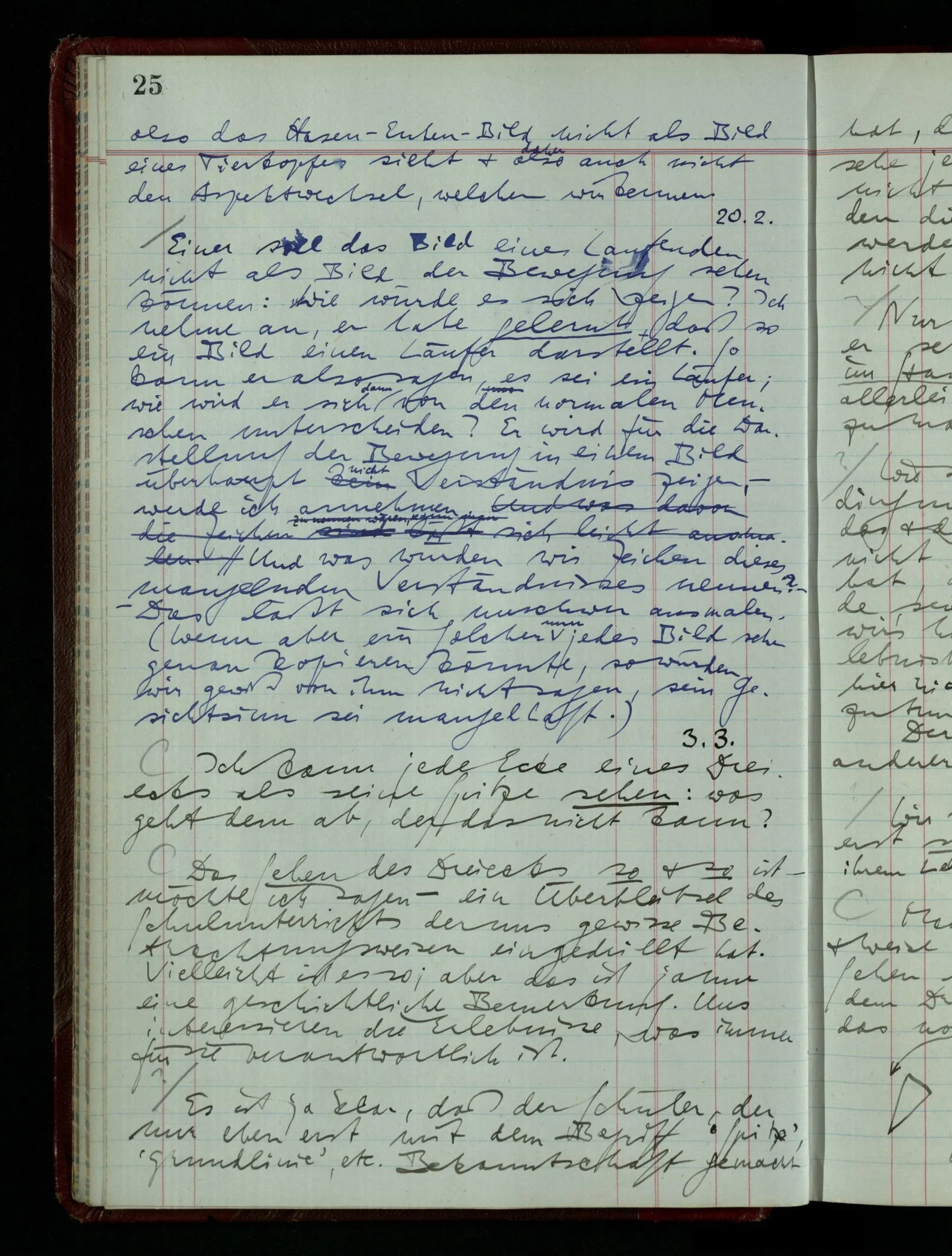 Wenn ich nun sage “Wir betrachten ein Portrait als Menschen”, – wann & wie lange tun wir dies? Immer, wenn wir es überhaupt sehen (& es nicht etwa als etwas andres sehen)? Ich könnte dies bejahen, & dadurch würde ich den Begriff des Betrachtens bestimmen. – Die Frage ist, ob ein anderer Begriff außer diesem für mich wichtig wird: ein Begriff des so-Sehens, das nur statt hat, während ich mich mit dem Bild als ‥‥ beschäftige.