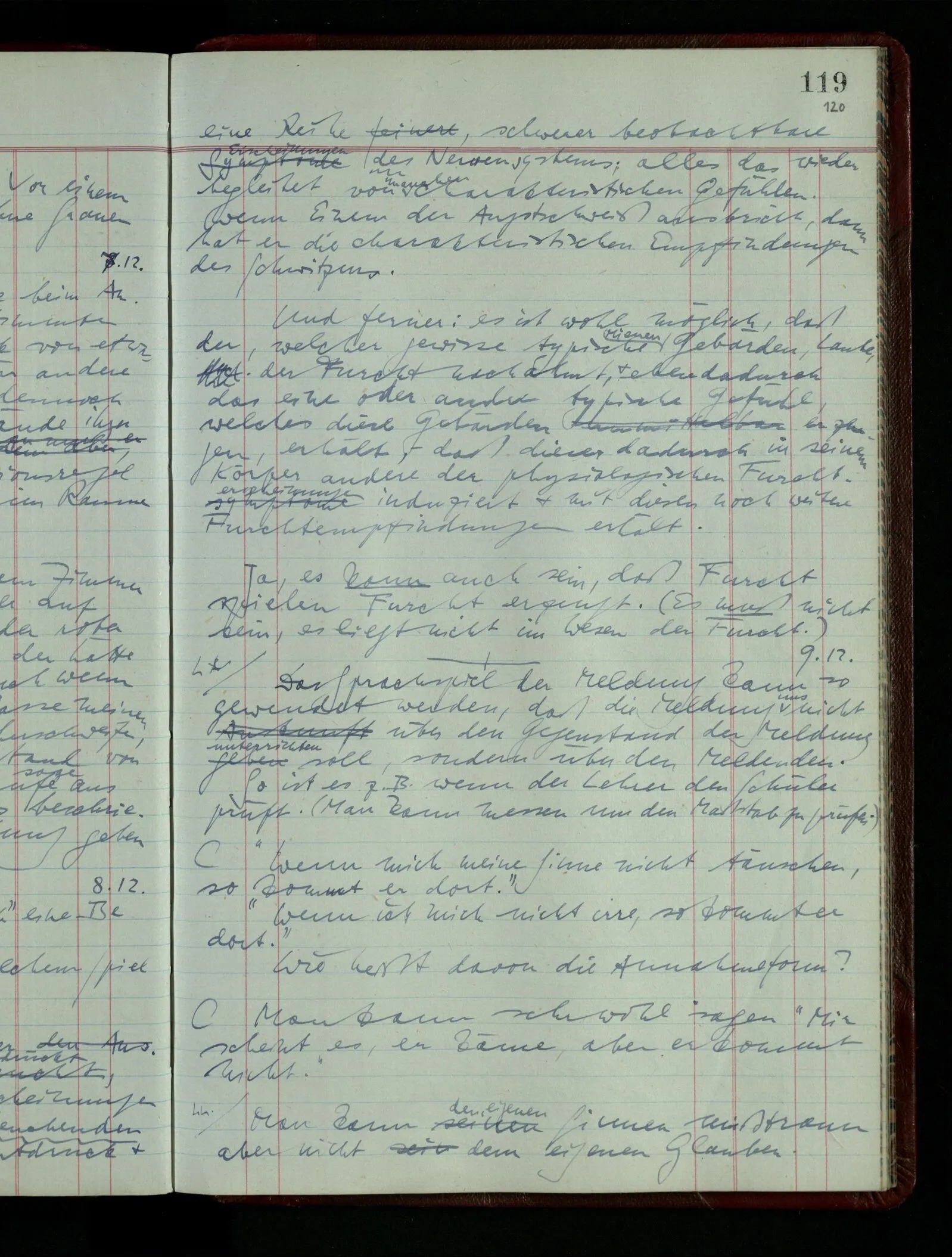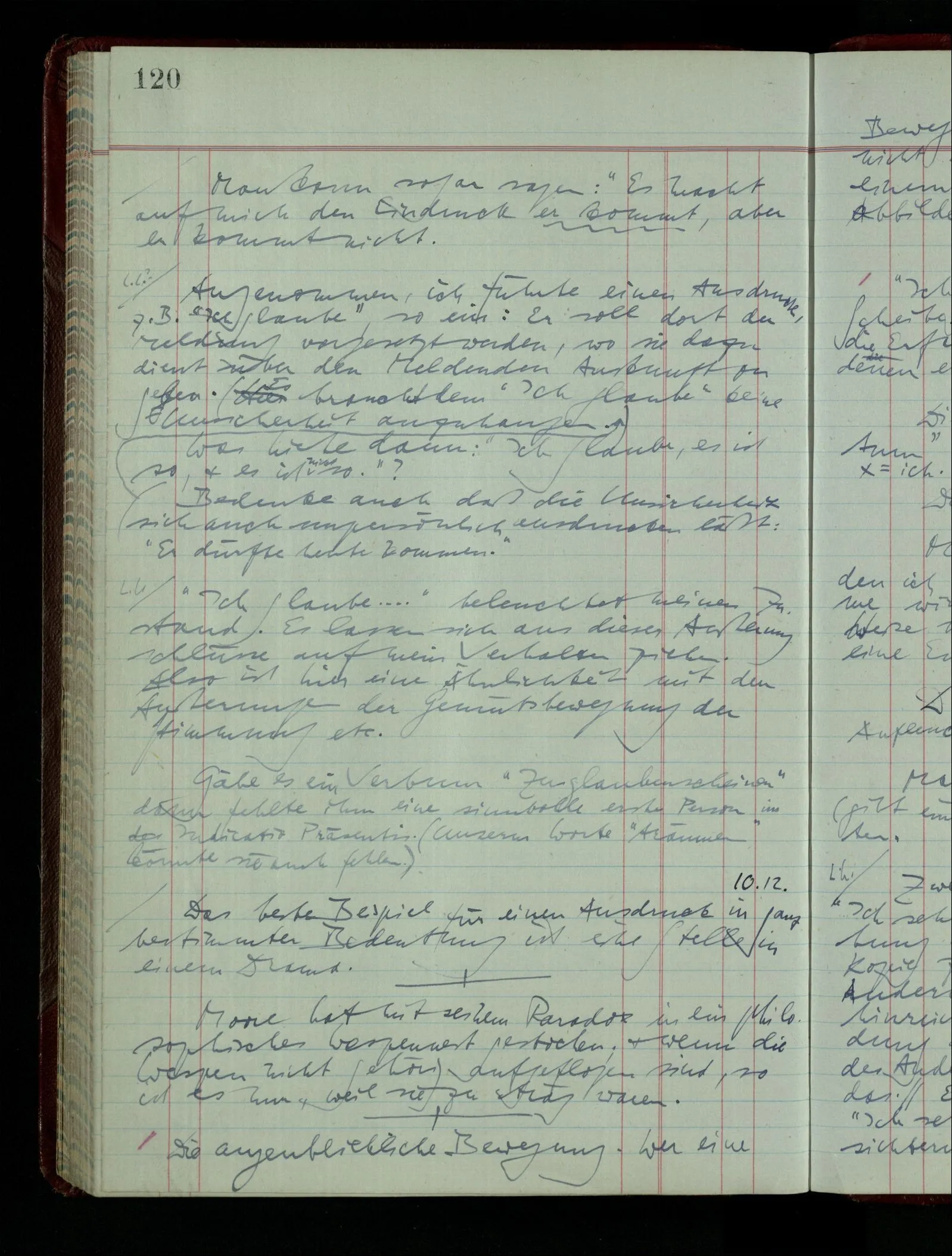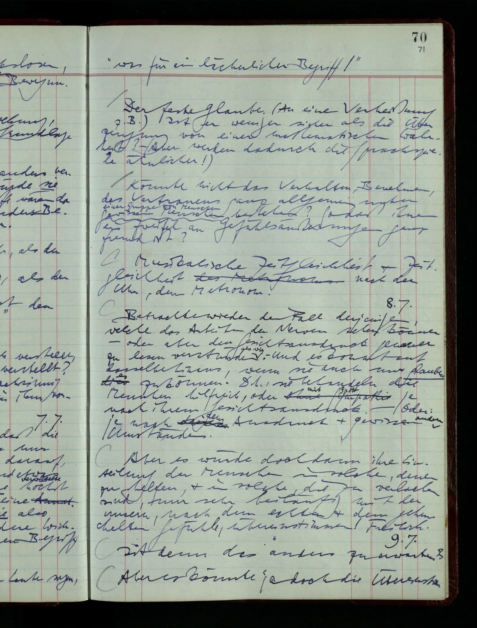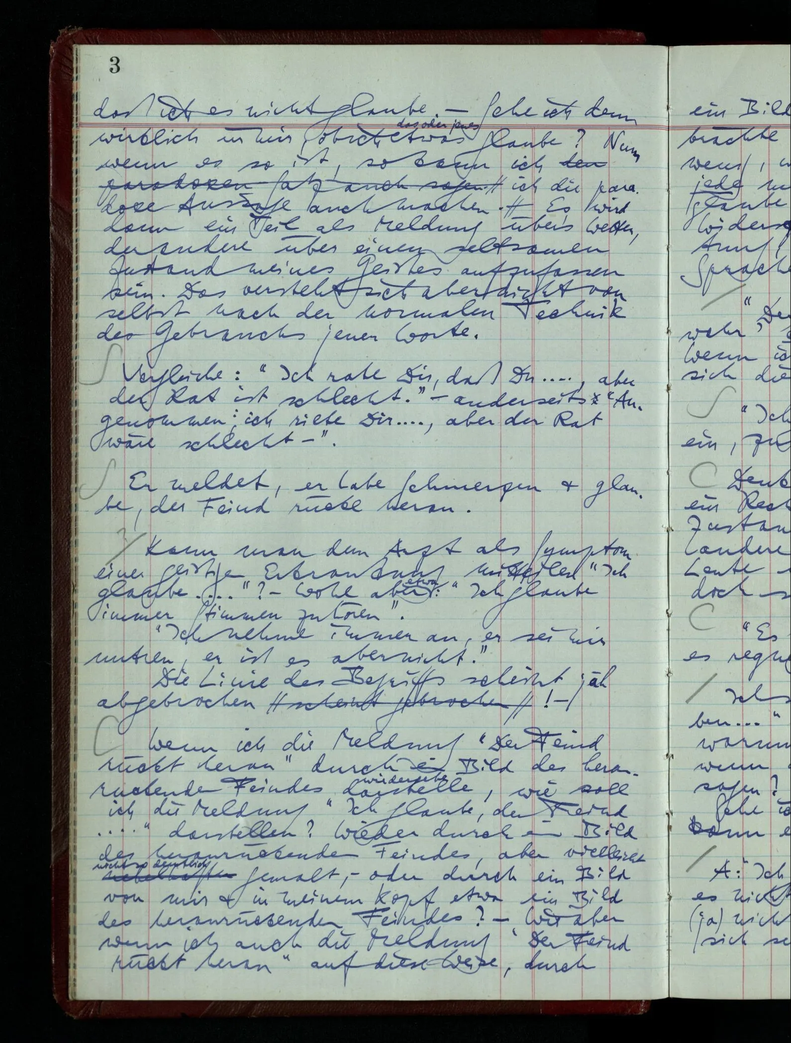 Kann man dem Arzt als Symptom einer geistigen Erkrankung mitteilen “Ich glaube …”? – Wohl aber etwa: “Ich glaube immer Stimmen zu hören”. “Ich nehme immer an, er sei mir untreu, er ist es aber nicht.” Die Linie des Begriffs scheint jäh abgebrochen! –