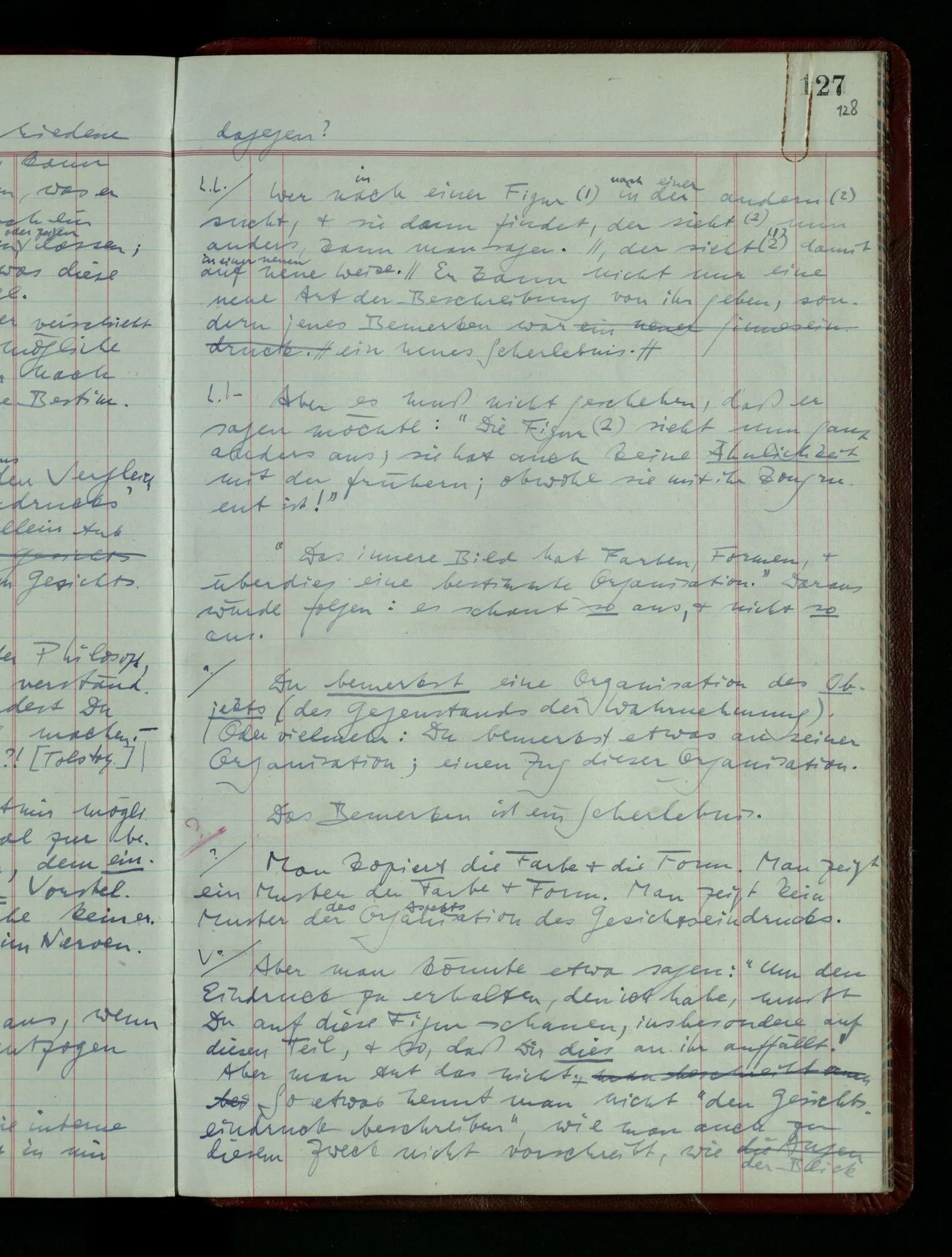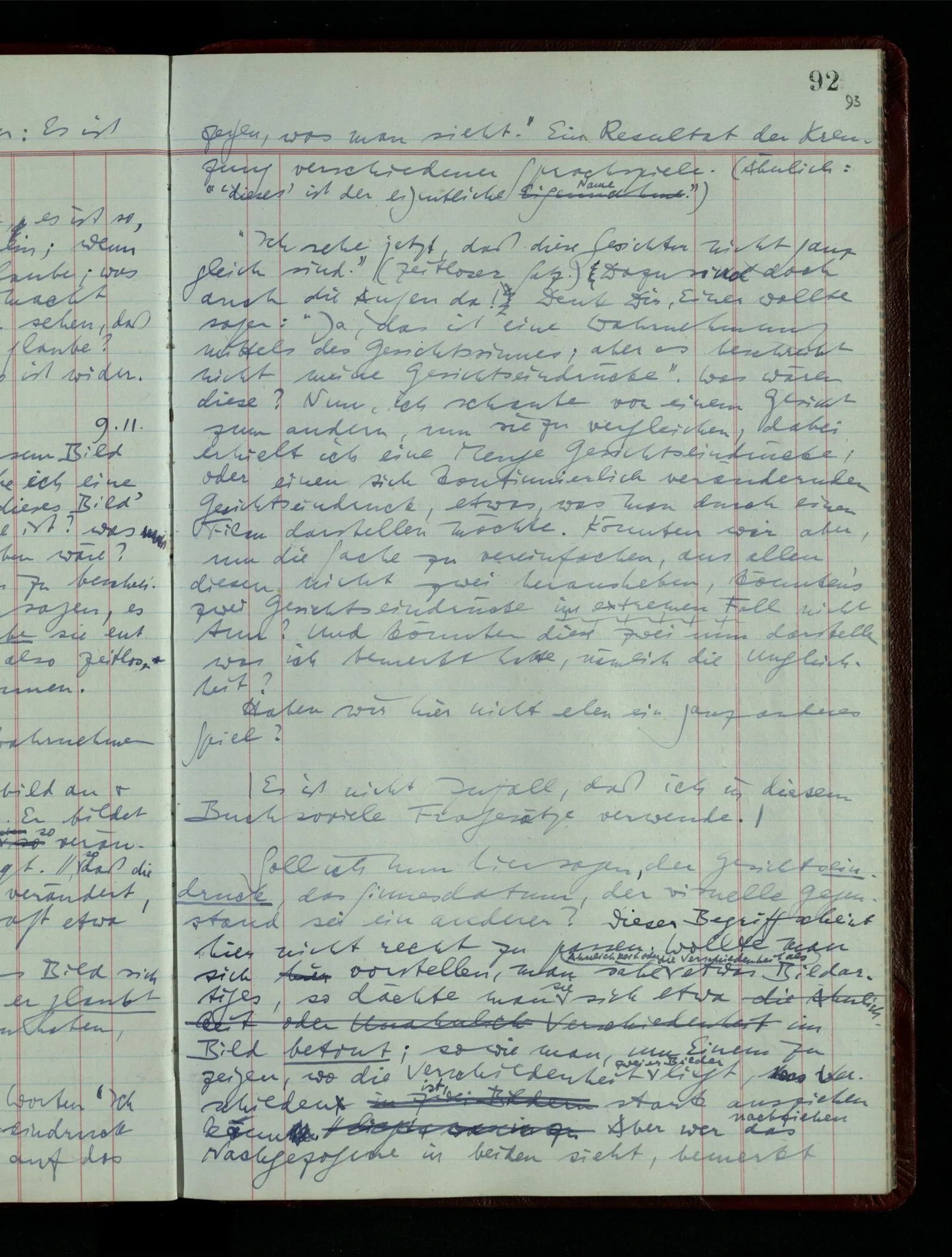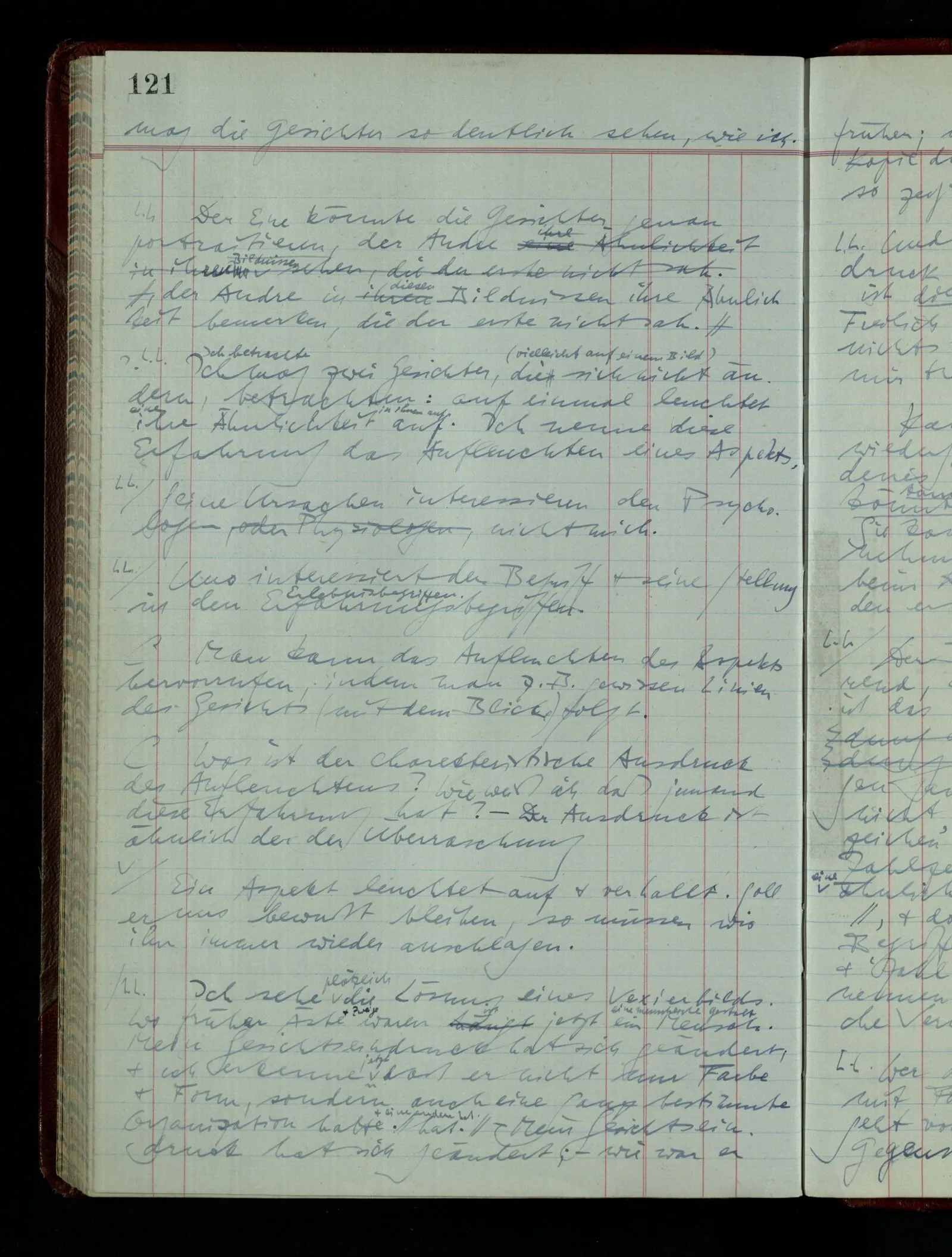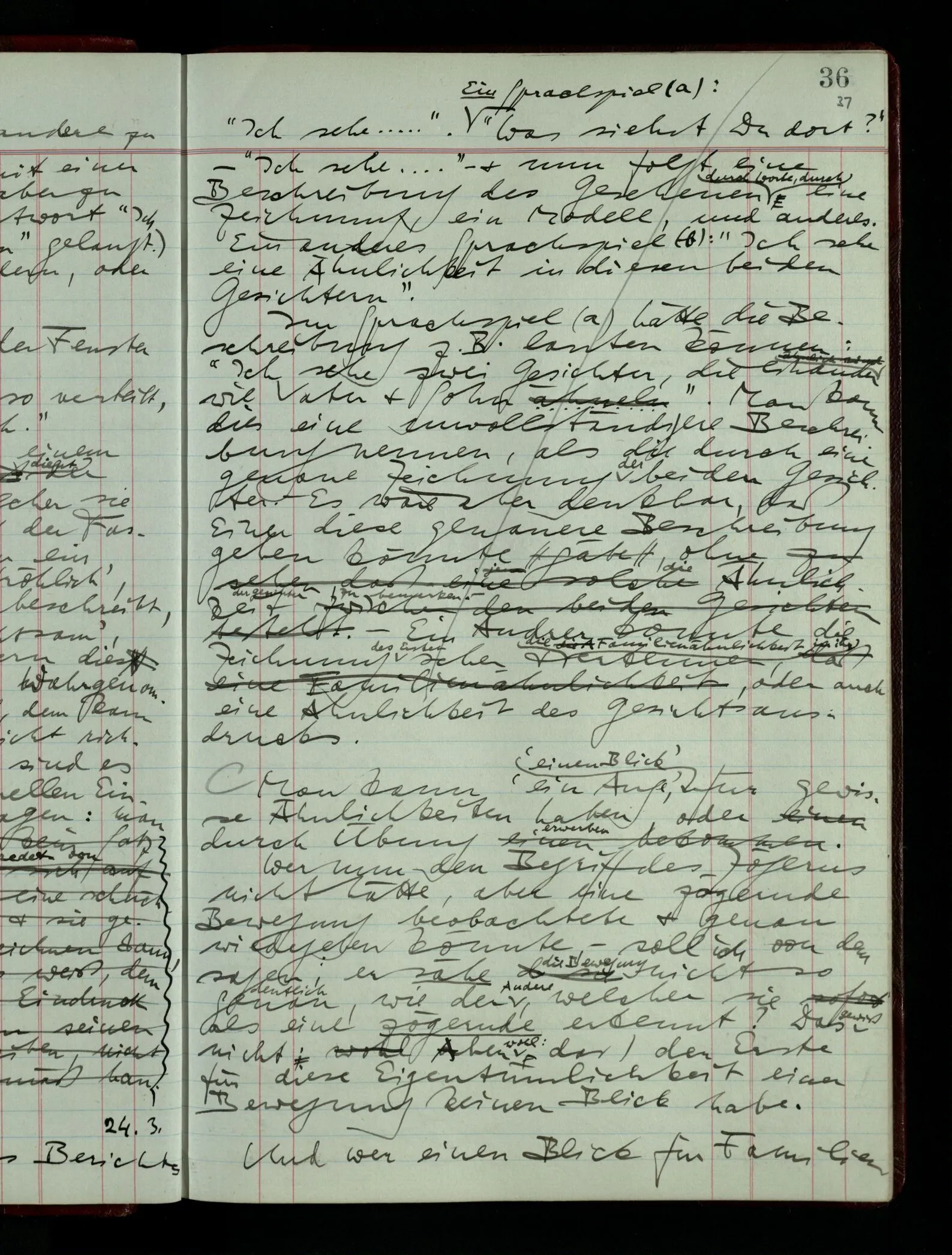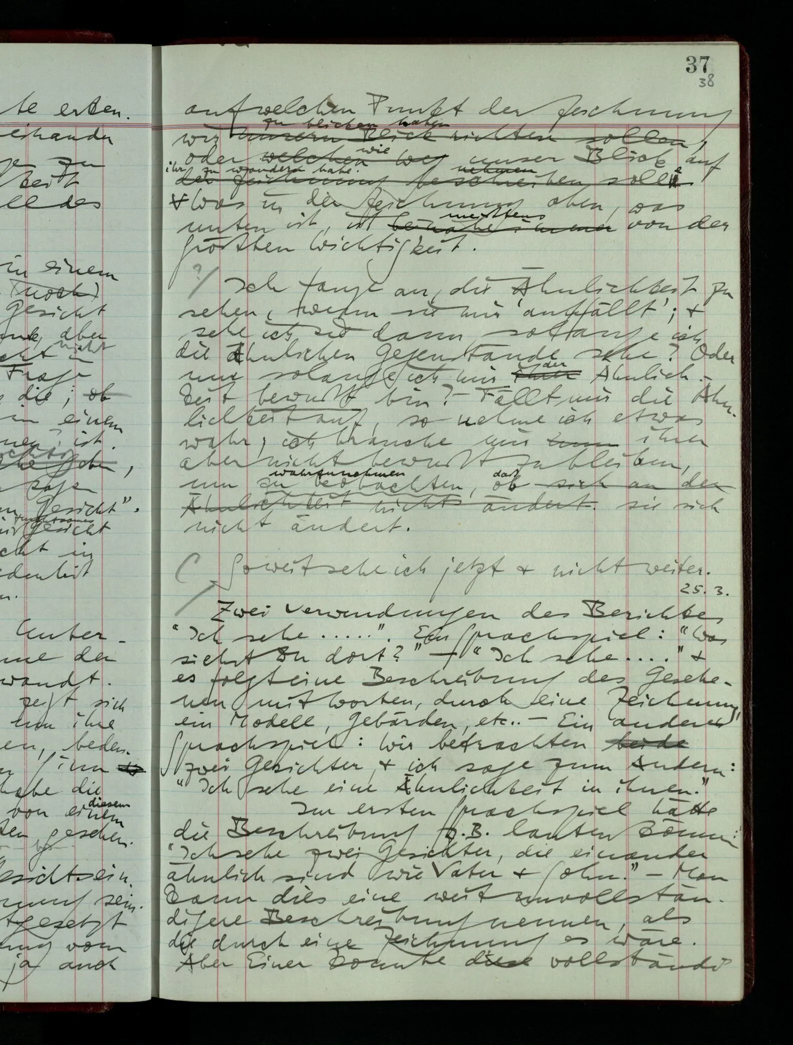 Ich möchte sagen, daß dasjenige, was hier aufleuchtet, nur so lange stehen bleibt, als eine bestimmte Beschäftigung mit dem Objekt dauert. (“Sieh, wie es blickt!”) (Das Bemerken der Familienähnlichkeit dieses Gesichts mit einem Abwesenden.) – ‘Ich möchte sagen’ – & ist es so? – Frage Dich: “Wie lange fällt mir etwas auf?” – Wie lange ist es mir neu?