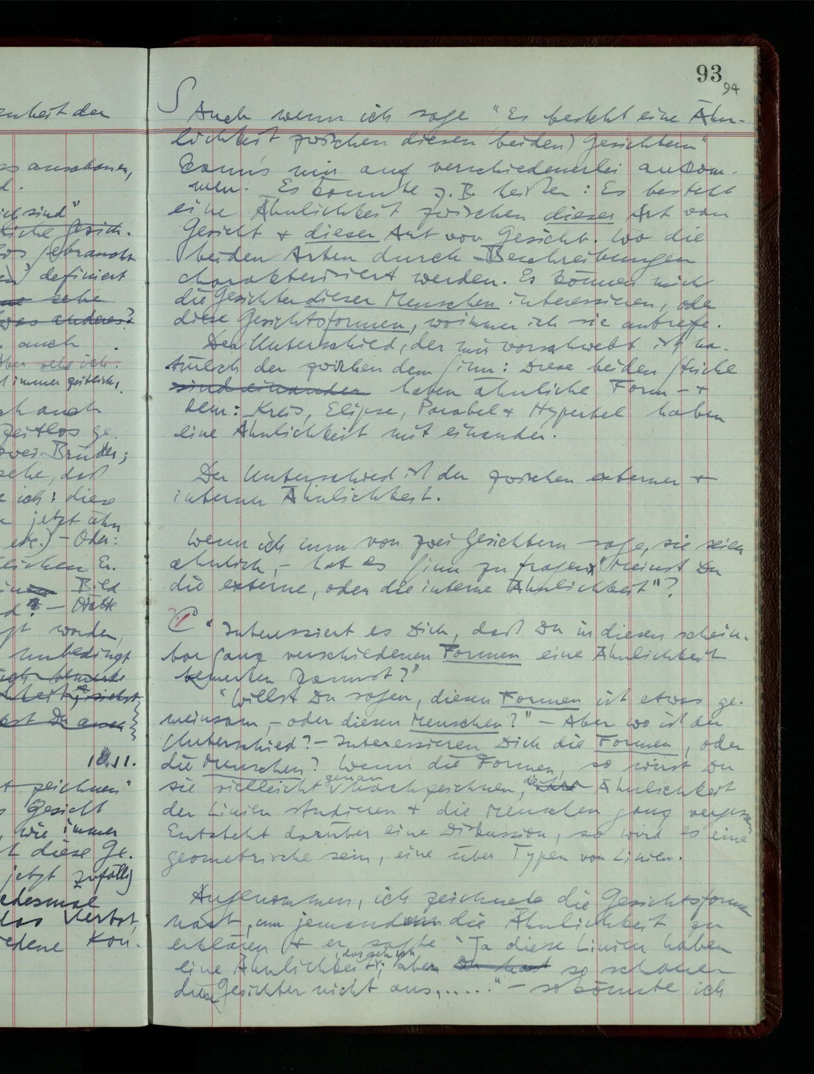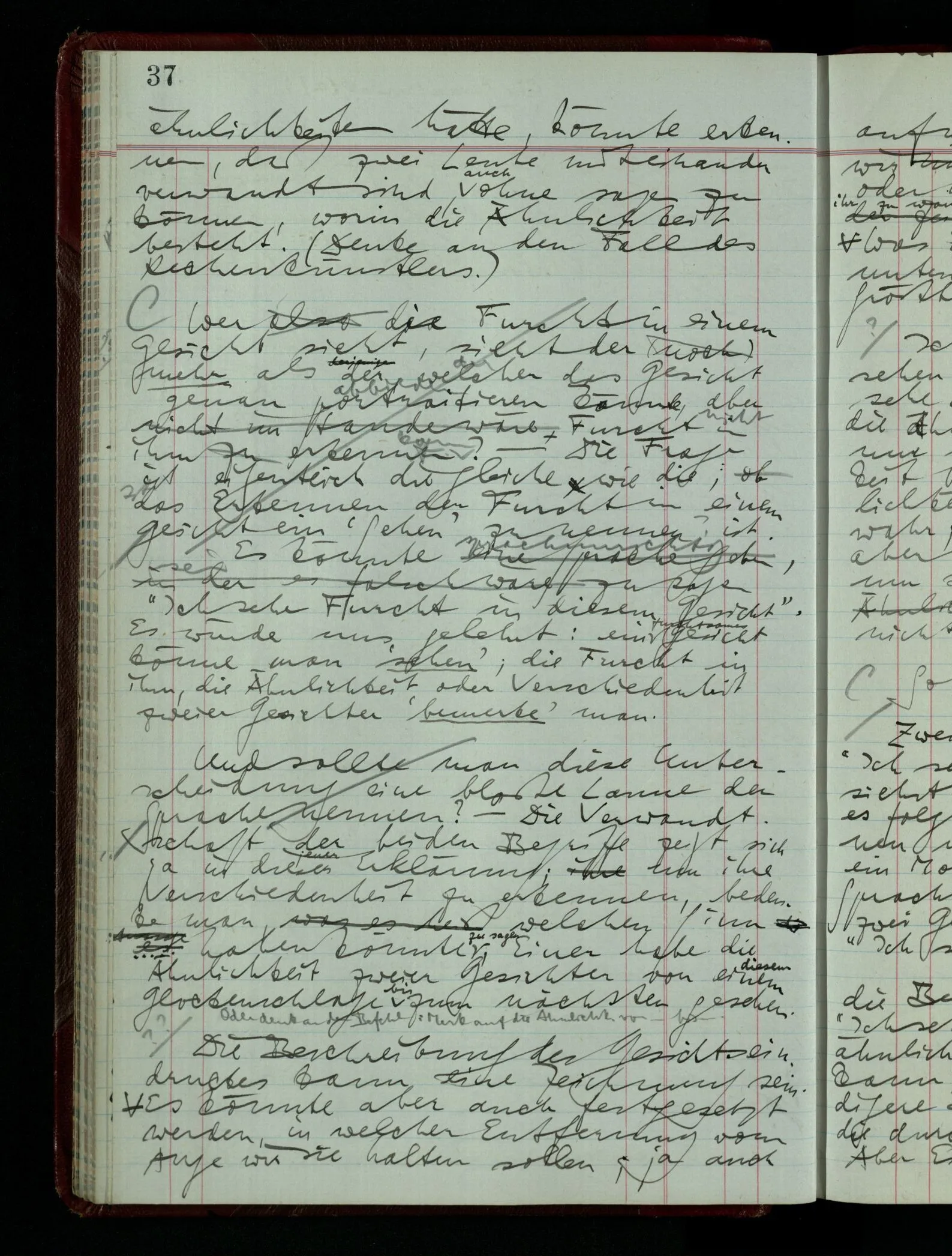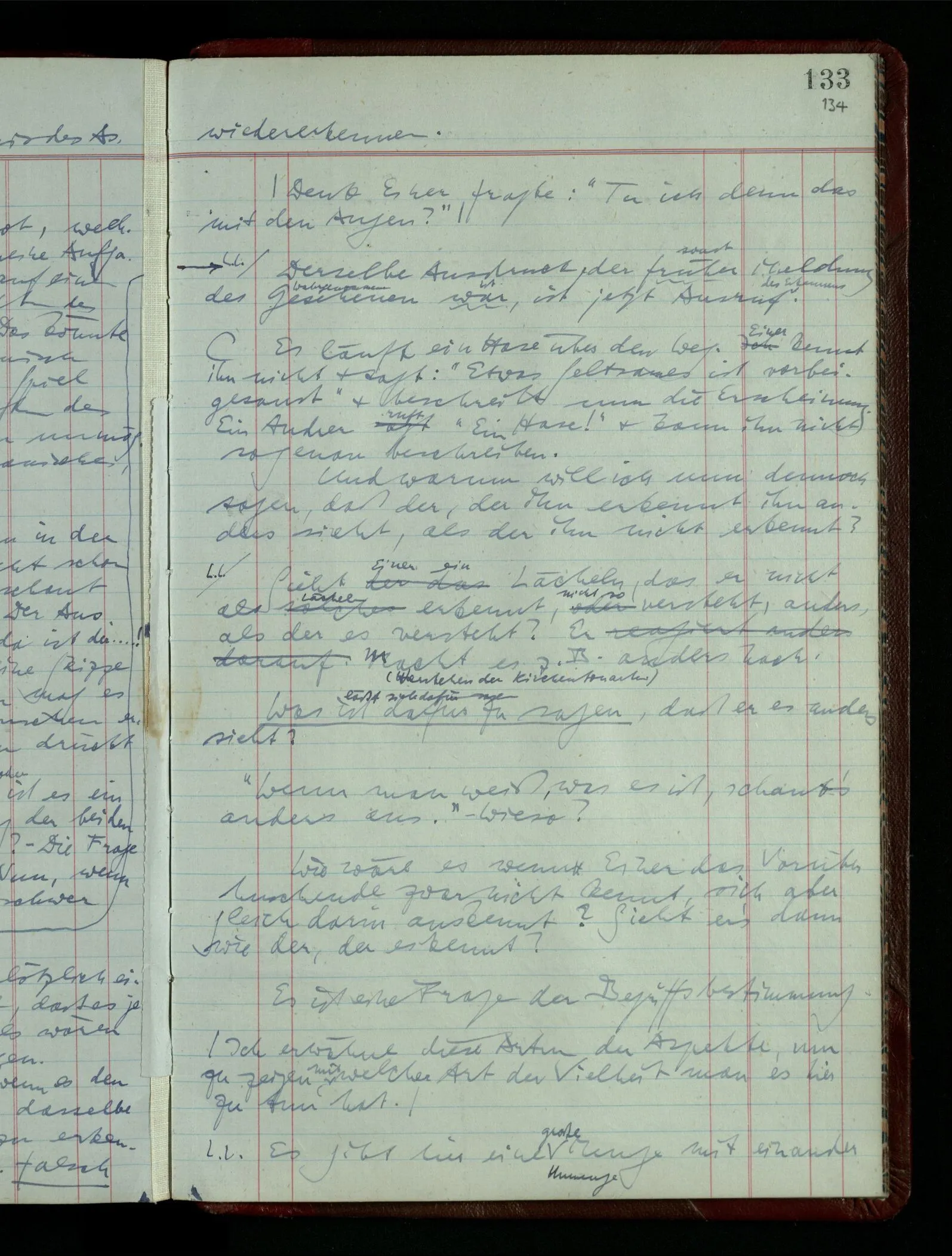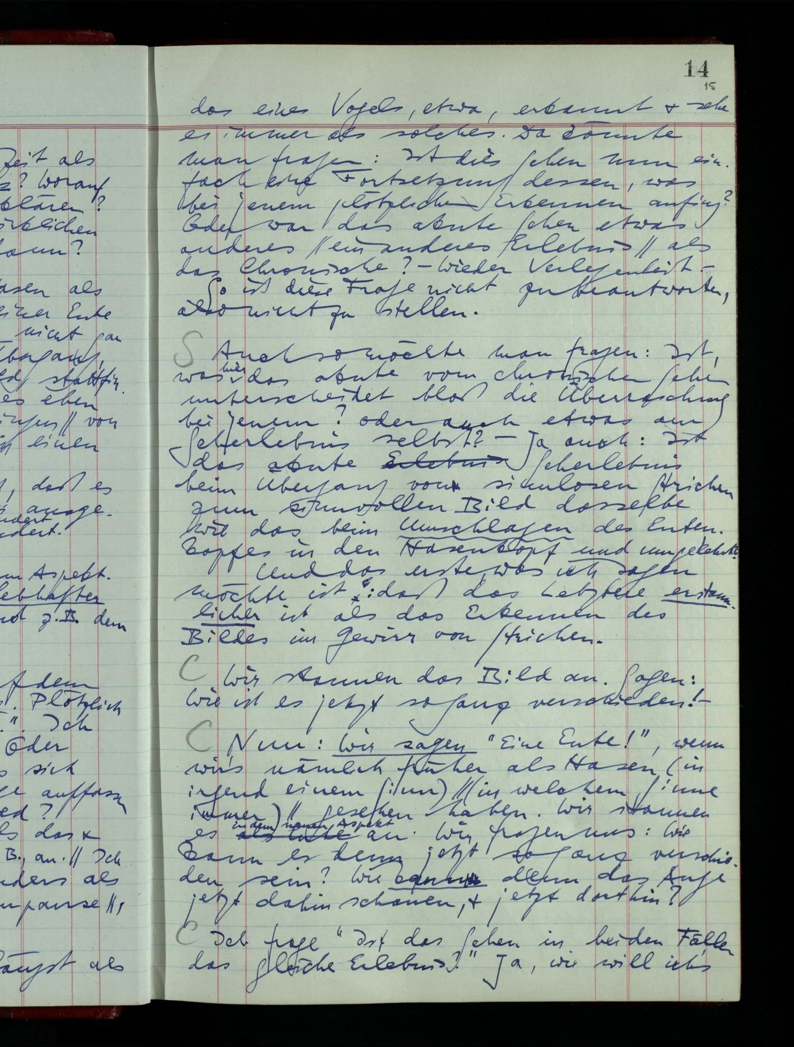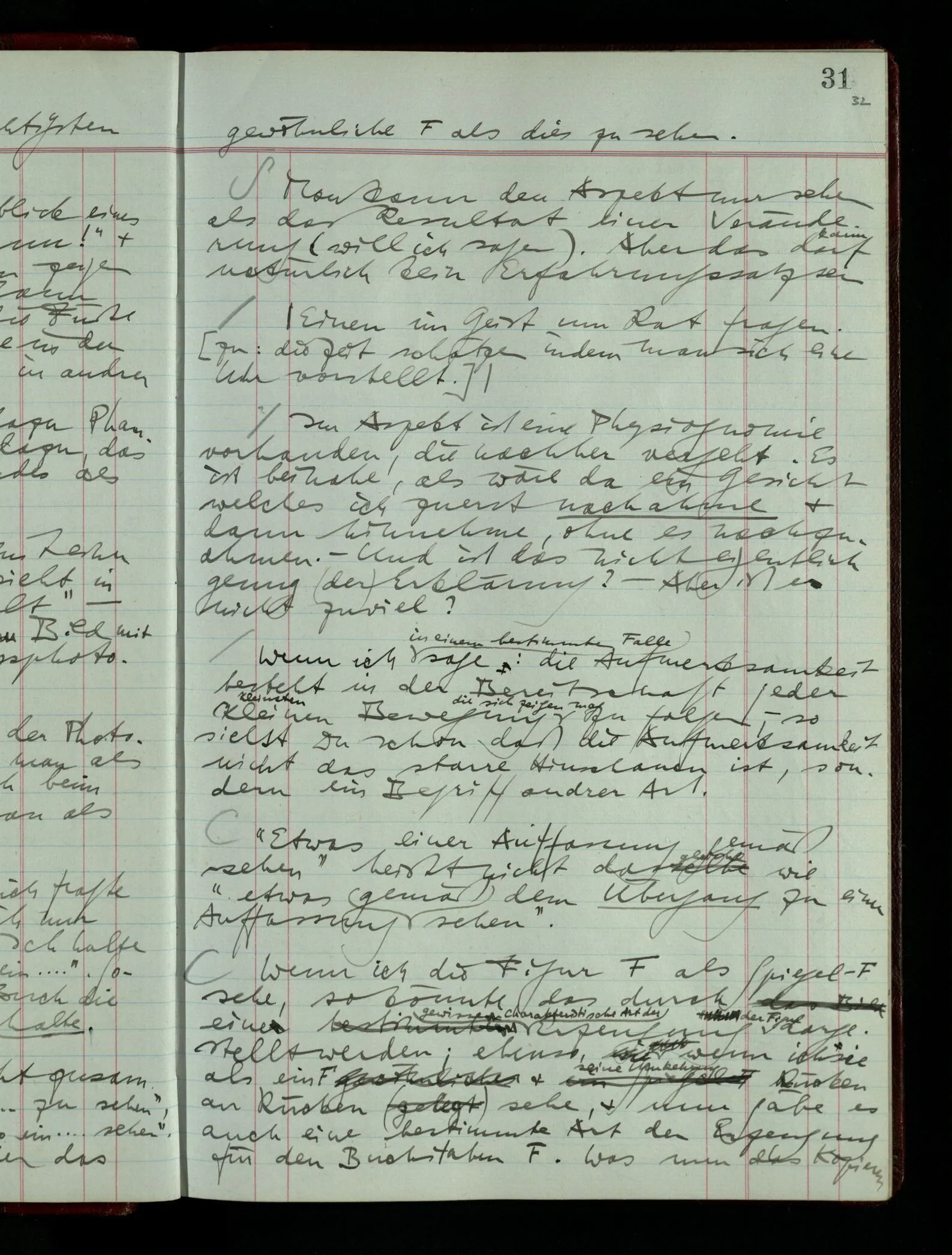 Ich möchte sagen, daß dasjenige, was hier aufleuchtet, nur so lange stehen bleibt, als eine bestimmte Beschäftigung mit dem Objekt dauert. (“Sieh, wie es blickt!”) (Das Bemerken der Familienähnlichkeit dieses Gesichts mit einem Abwesenden.) – ‘Ich möchte sagen’ – & ist es so? – Frage Dich: “Wie lange fällt mir etwas auf?” – Wie lange ist es mir neu?