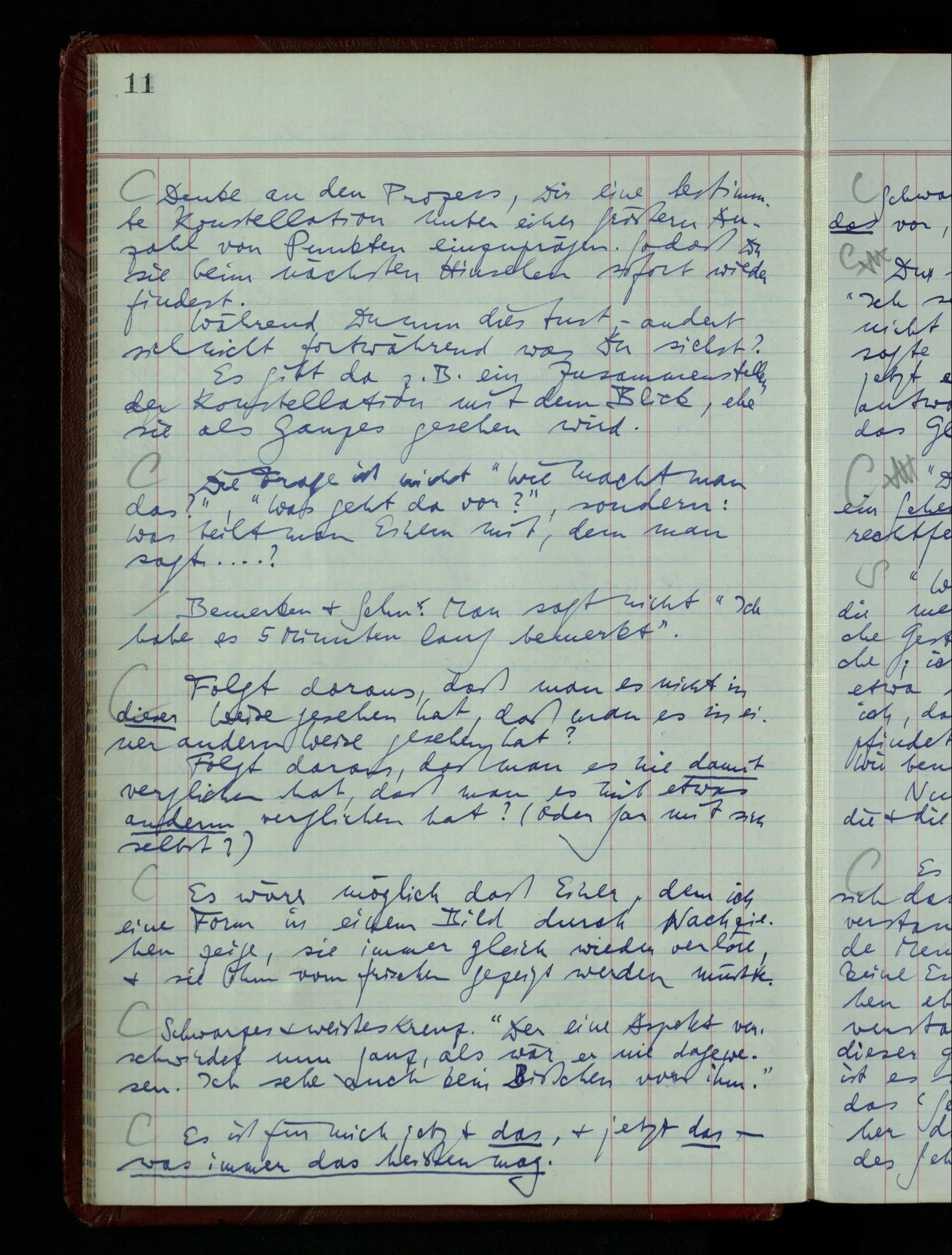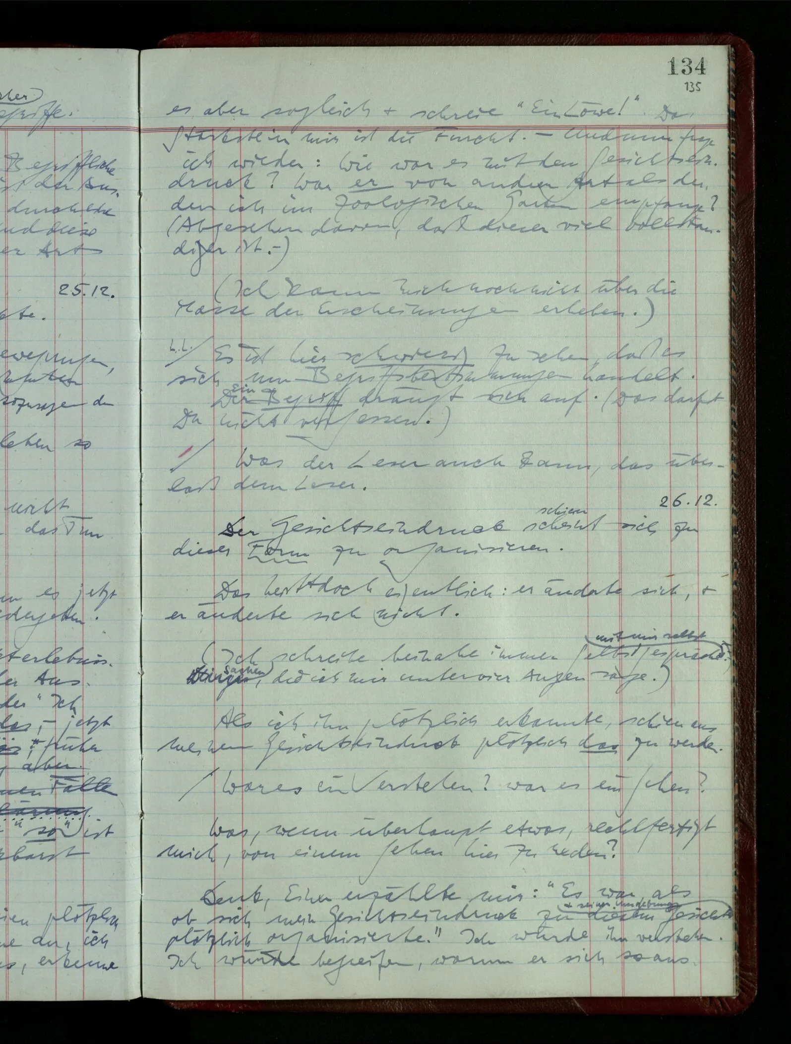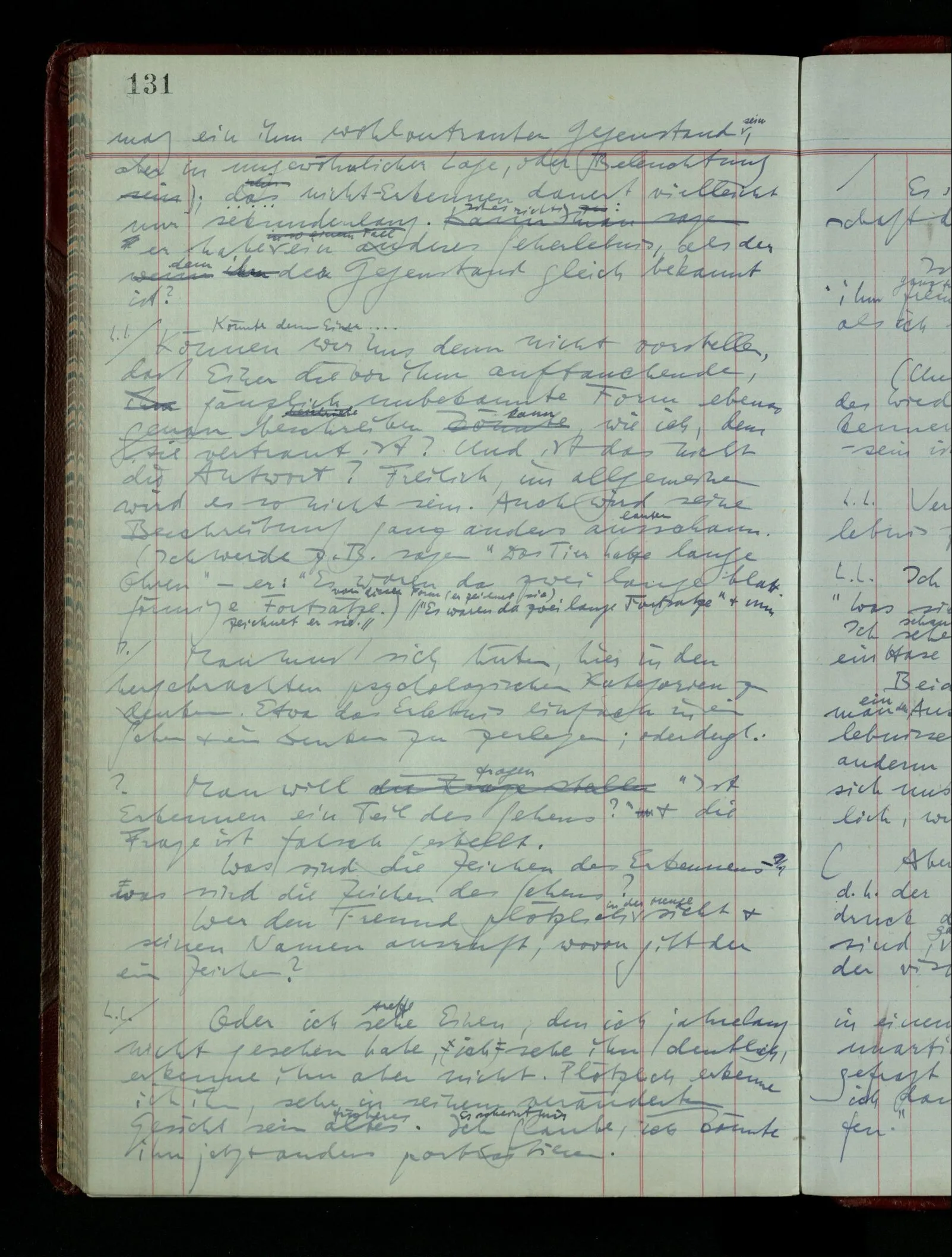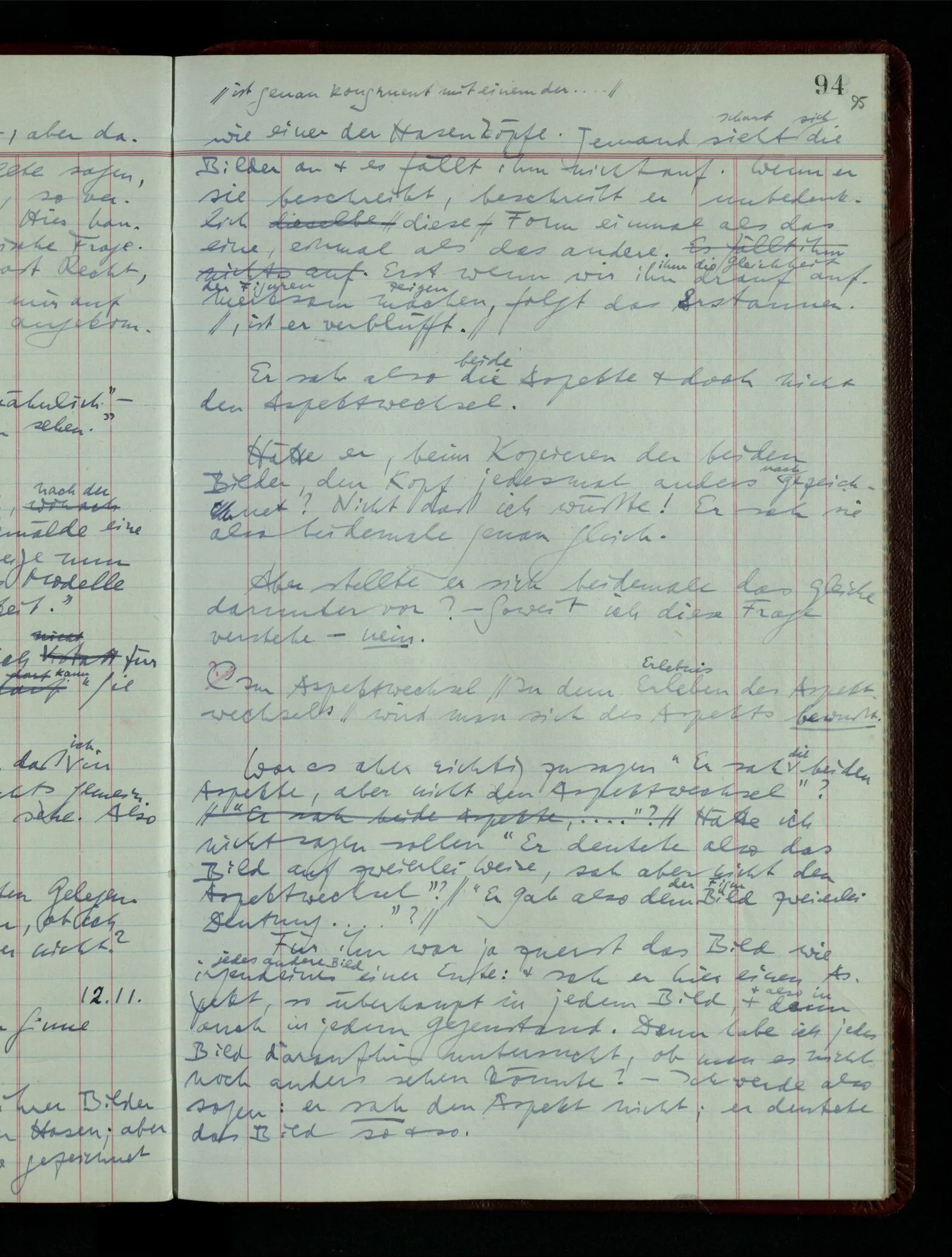 Ich möchte sagen, daß dasjenige, was hier aufleuchtet, nur so lange stehen bleibt, als eine bestimmte Beschäftigung mit dem Objekt dauert. (“Sieh, wie es blickt!”) (Das Bemerken der Familienähnlichkeit dieses Gesichts mit einem Abwesenden.) – ‘Ich möchte sagen’ – & ist es so? – Frage Dich: “Wie lange fällt mir etwas auf?” – Wie lange ist es mir neu?