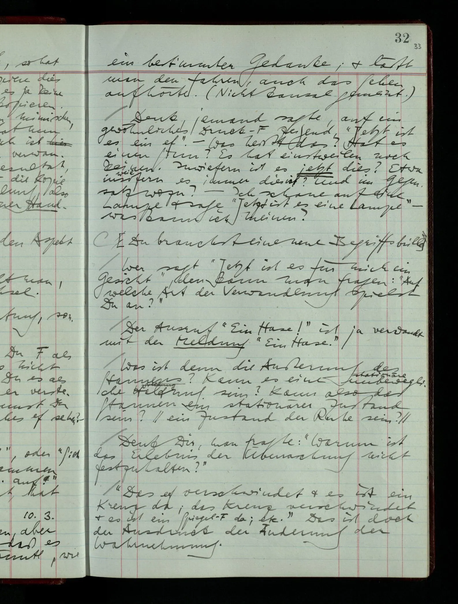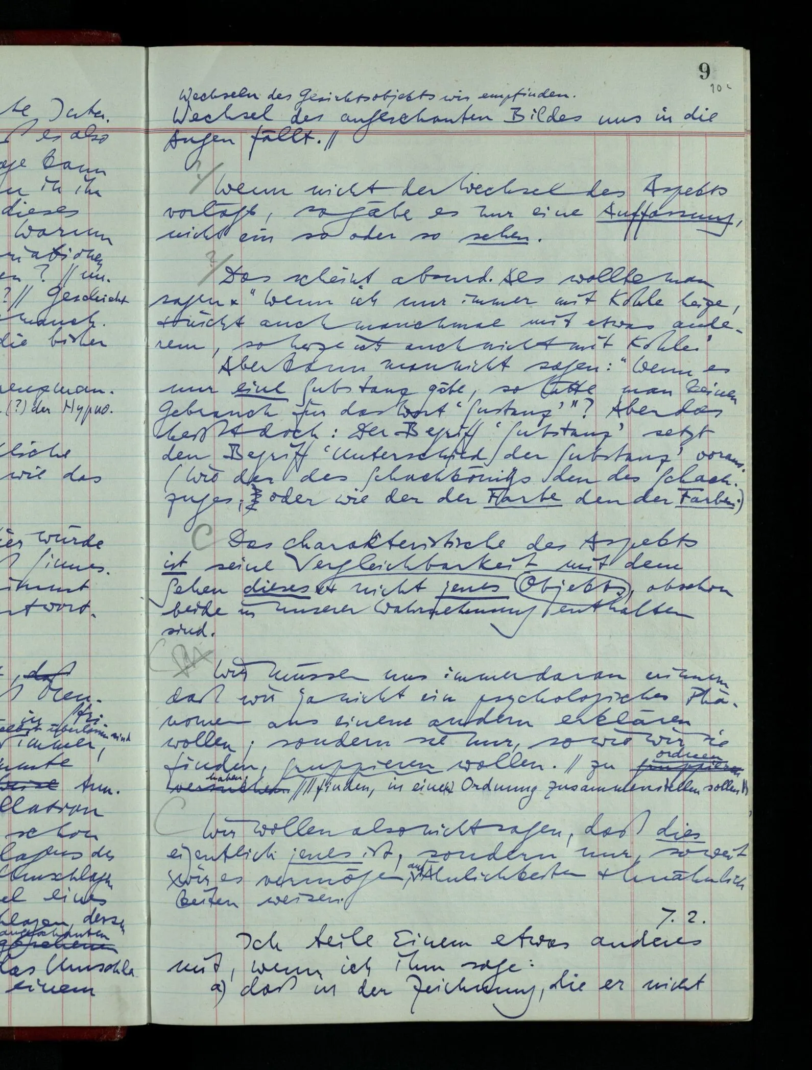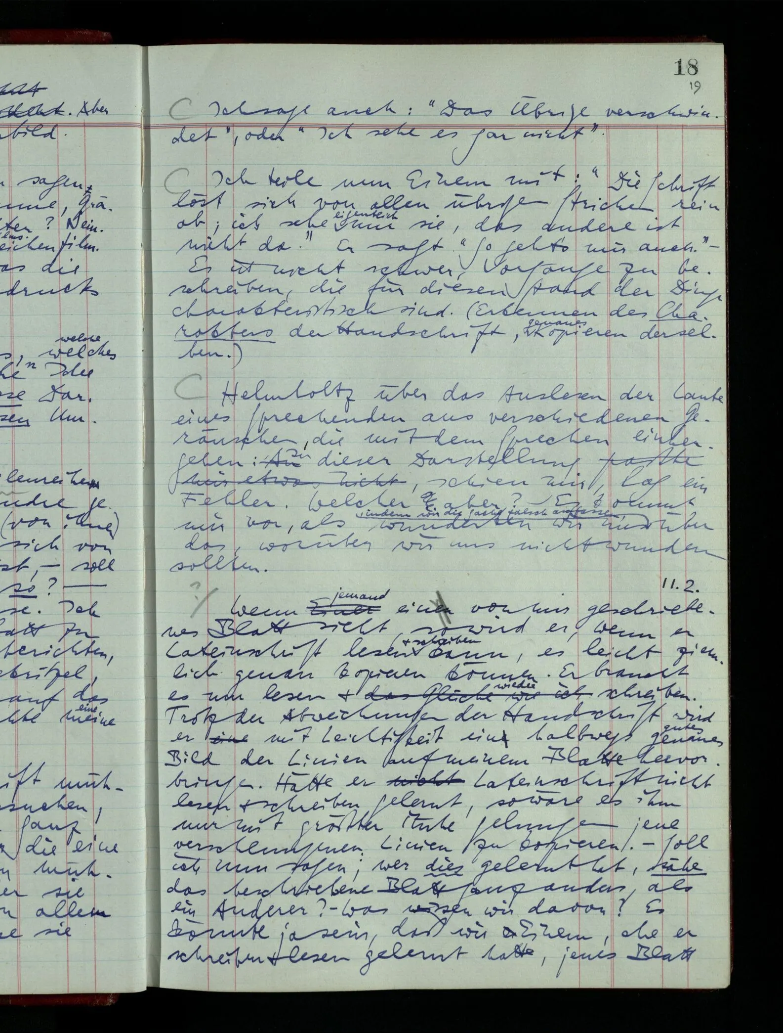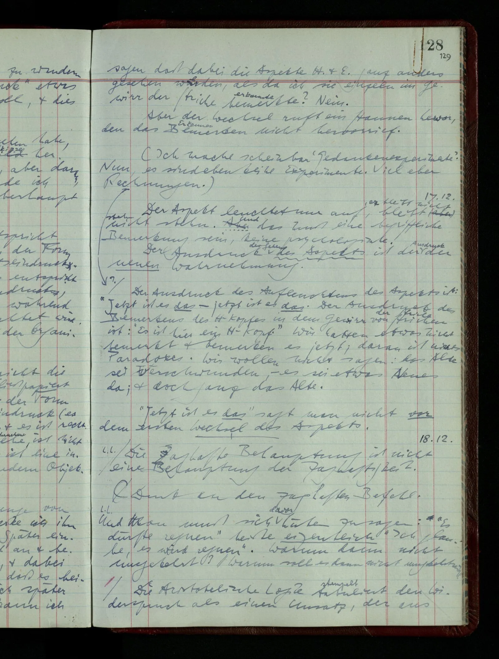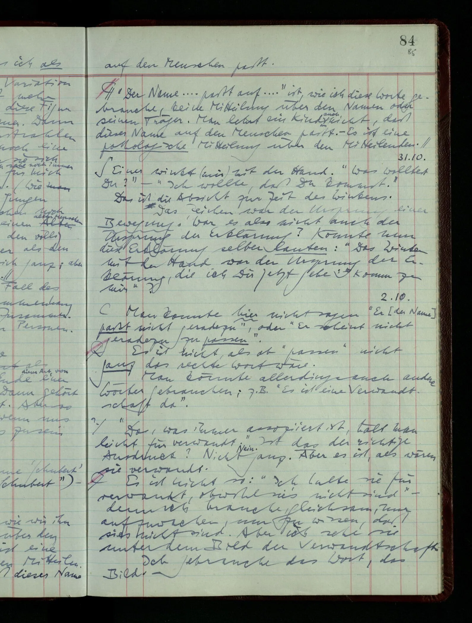 Ich möchte sagen, daß dasjenige, was hier aufleuchtet, nur so lange stehen bleibt, als eine bestimmte Beschäftigung mit dem Objekt dauert. (“Sieh, wie es blickt!”) (Das Bemerken der Familienähnlichkeit dieses Gesichts mit einem Abwesenden.) – ‘Ich möchte sagen’ – & ist es so? – Frage Dich: “Wie lange fällt mir etwas auf?” – Wie lange ist es mir neu?