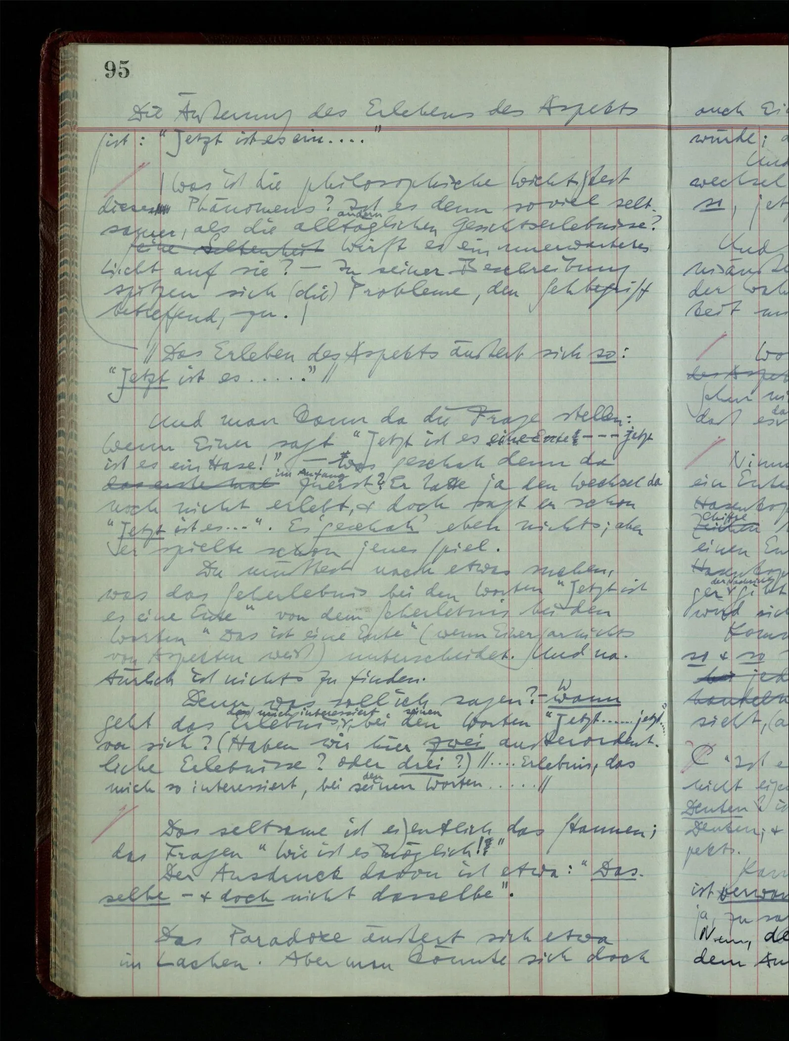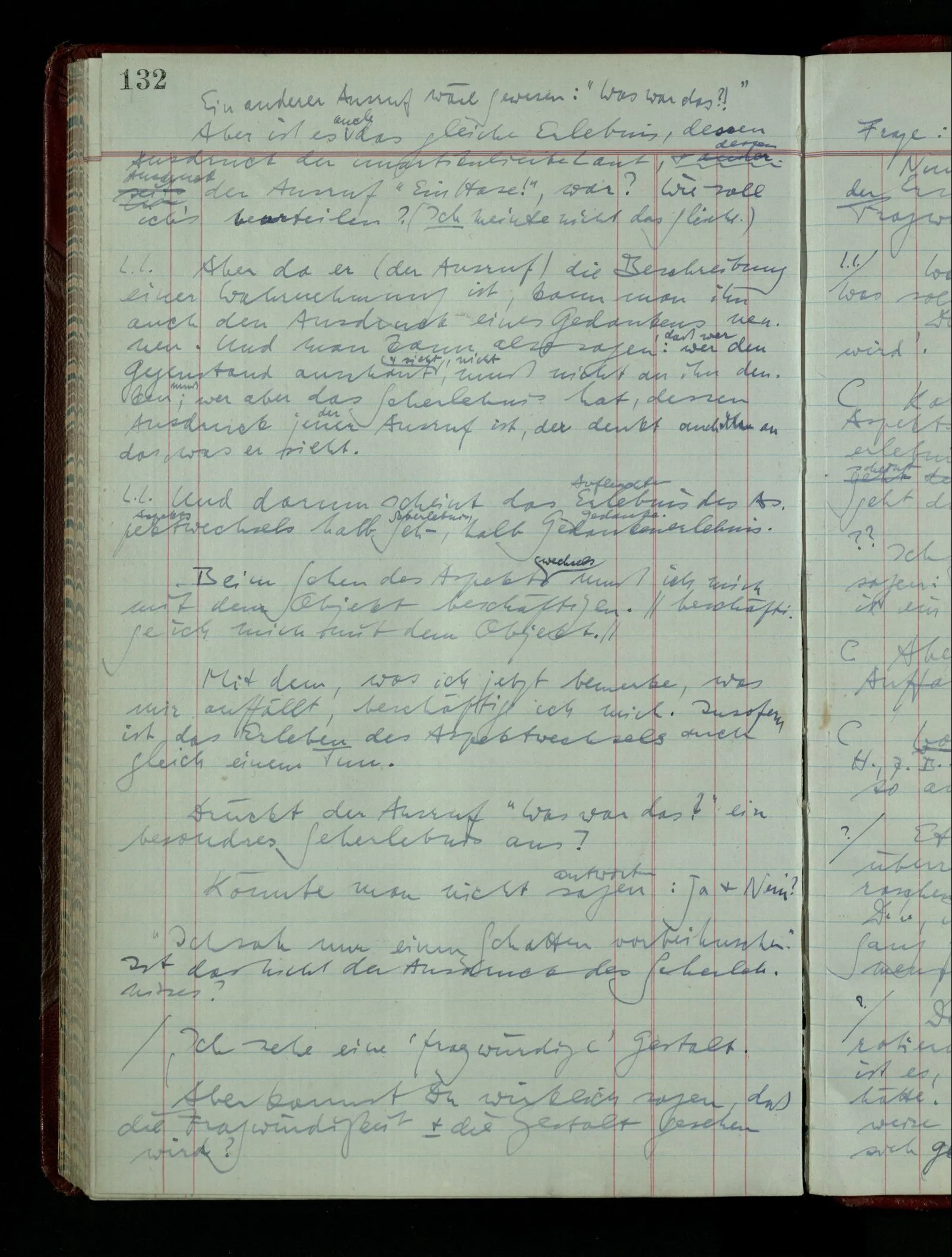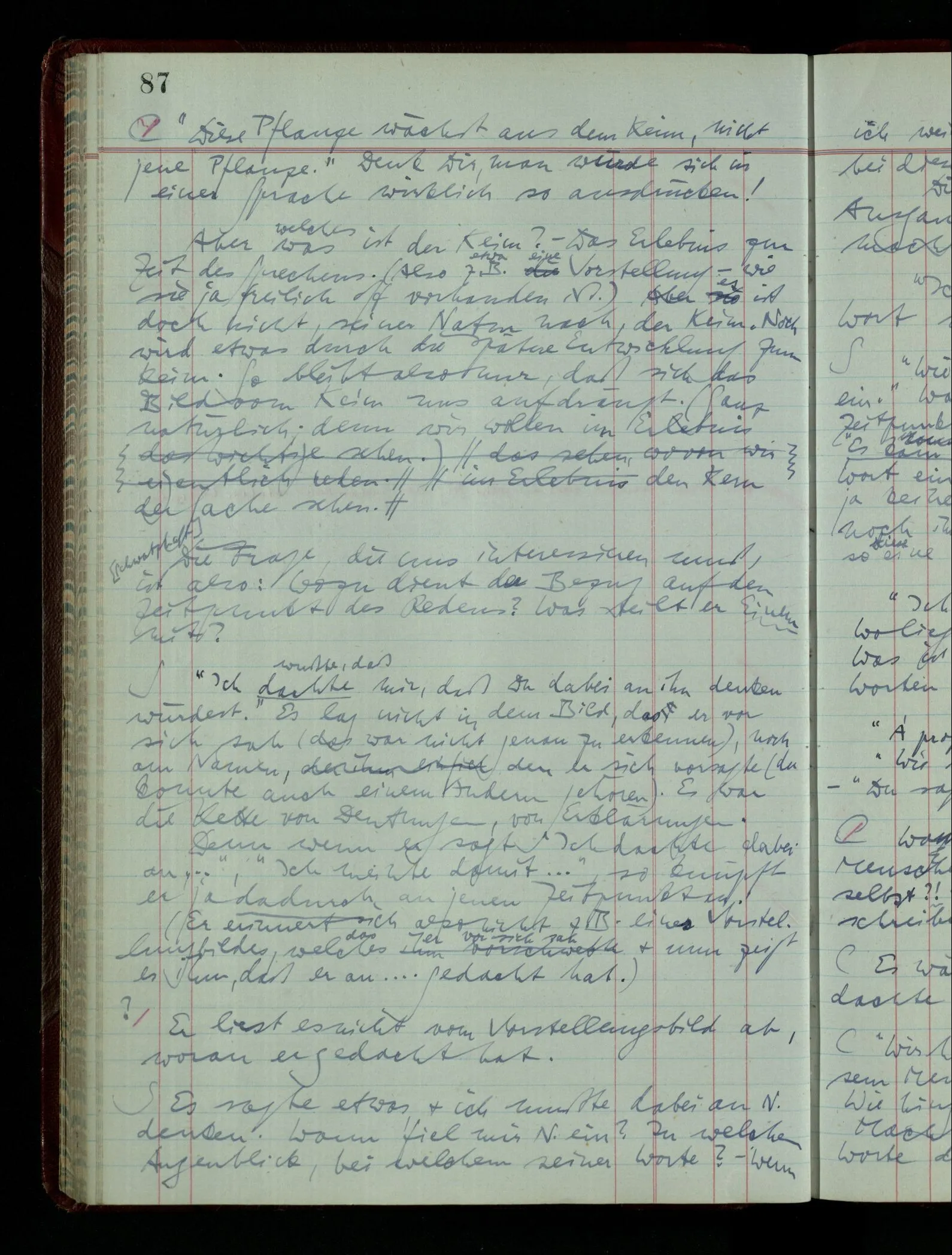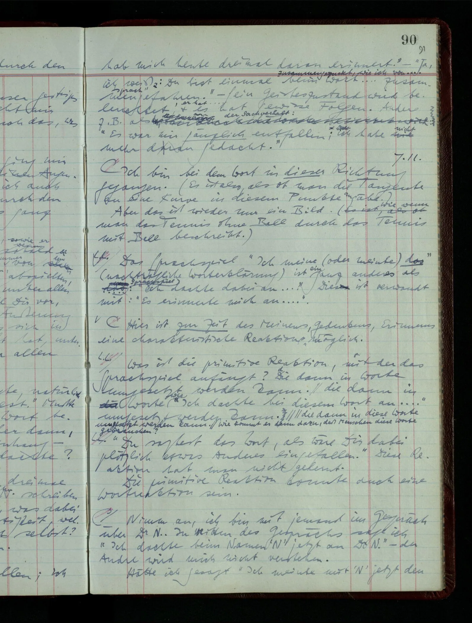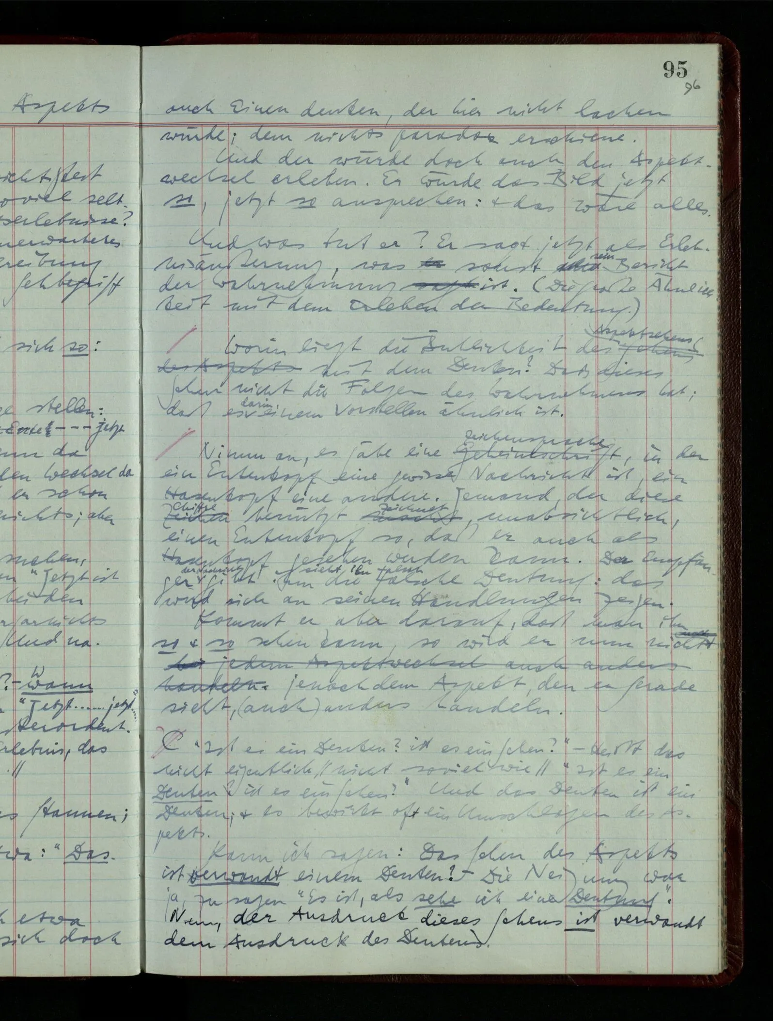 Ich möchte sagen, daß dasjenige, was hier aufleuchtet, nur so lange stehen bleibt, als eine bestimmte Beschäftigung mit dem Objekt dauert. (“Sieh, wie es blickt!”) (Das Bemerken der Familienähnlichkeit dieses Gesichts mit einem Abwesenden.) – ‘Ich möchte sagen’ – & ist es so? – Frage Dich: “Wie lange fällt mir etwas auf?” – Wie lange ist es mir neu?