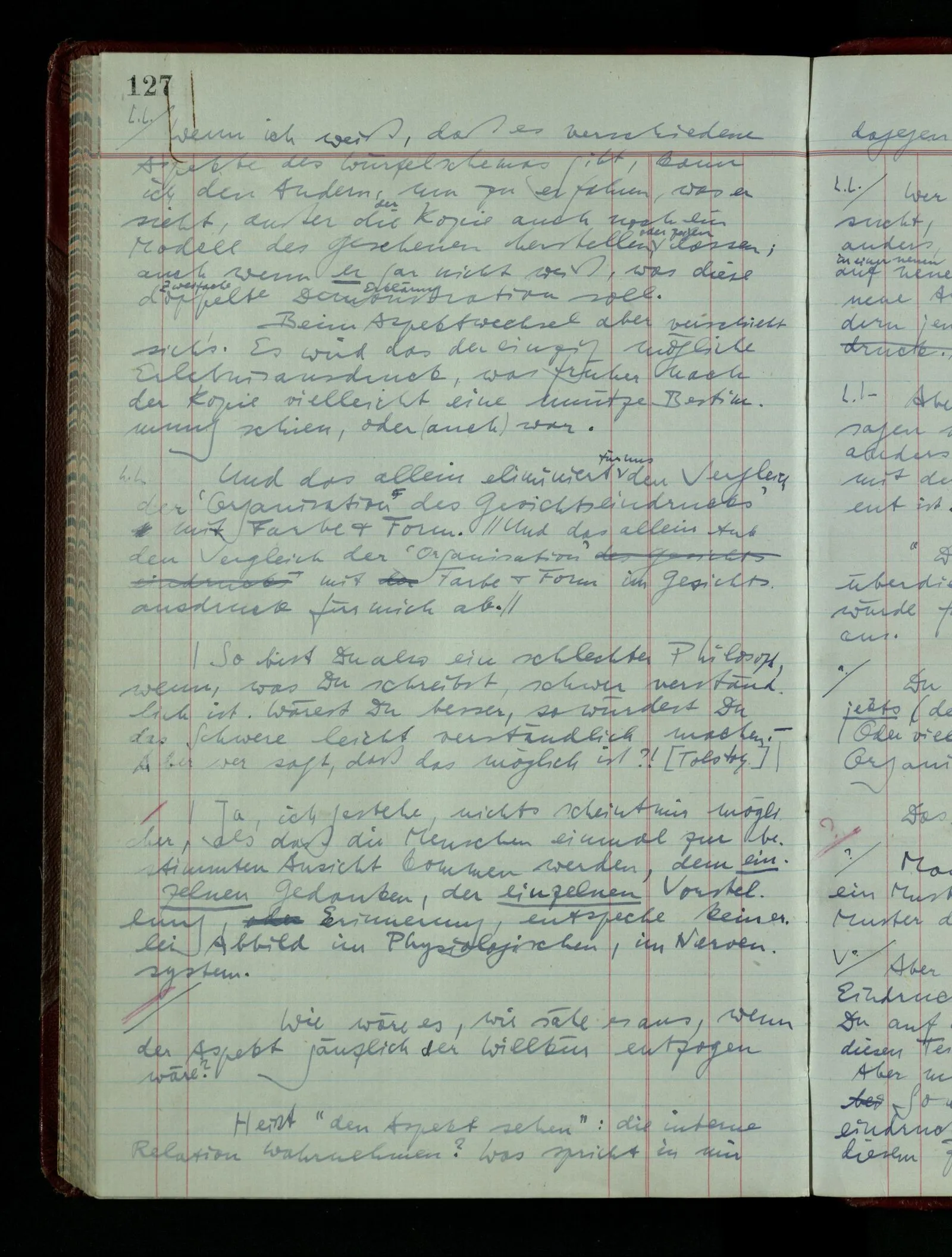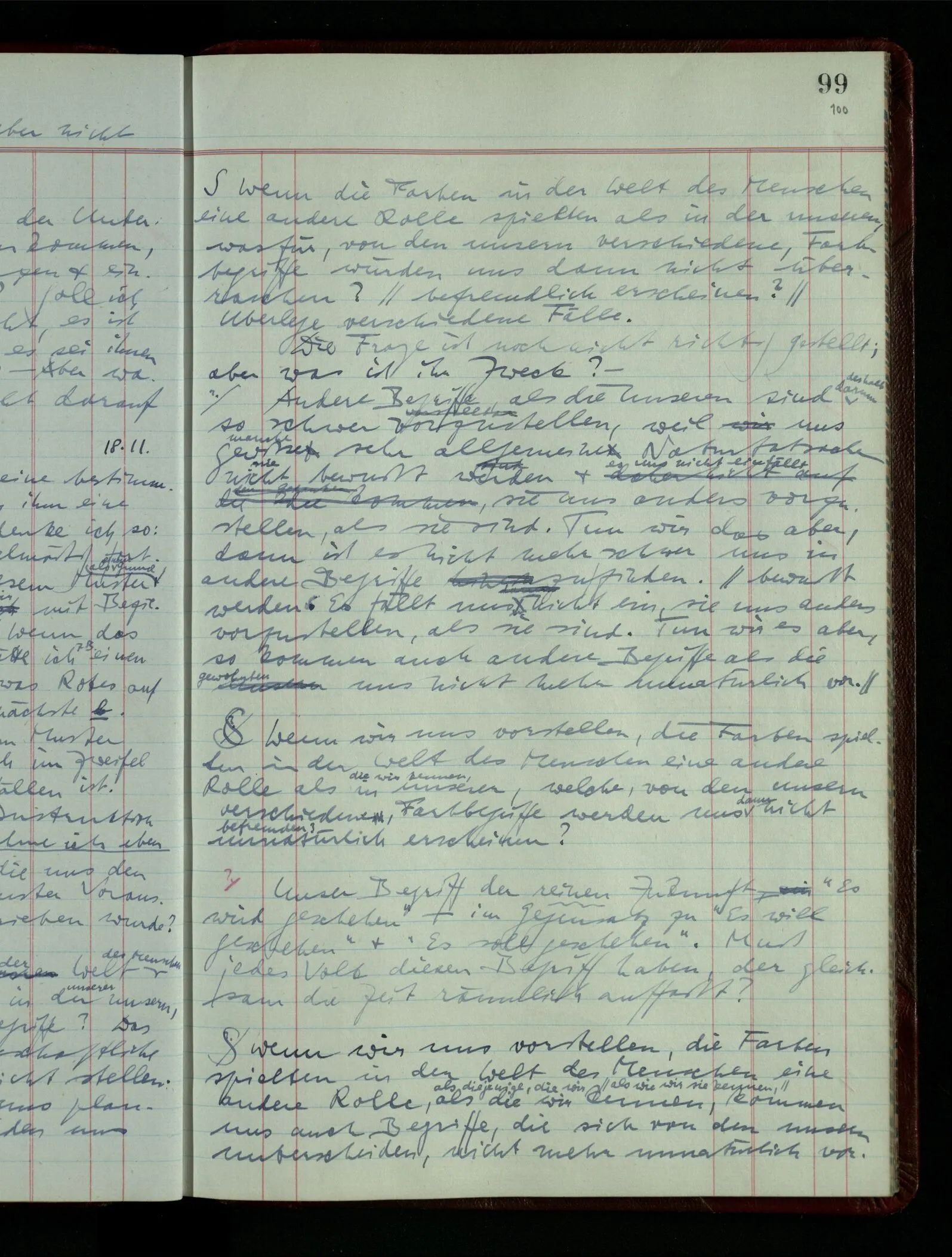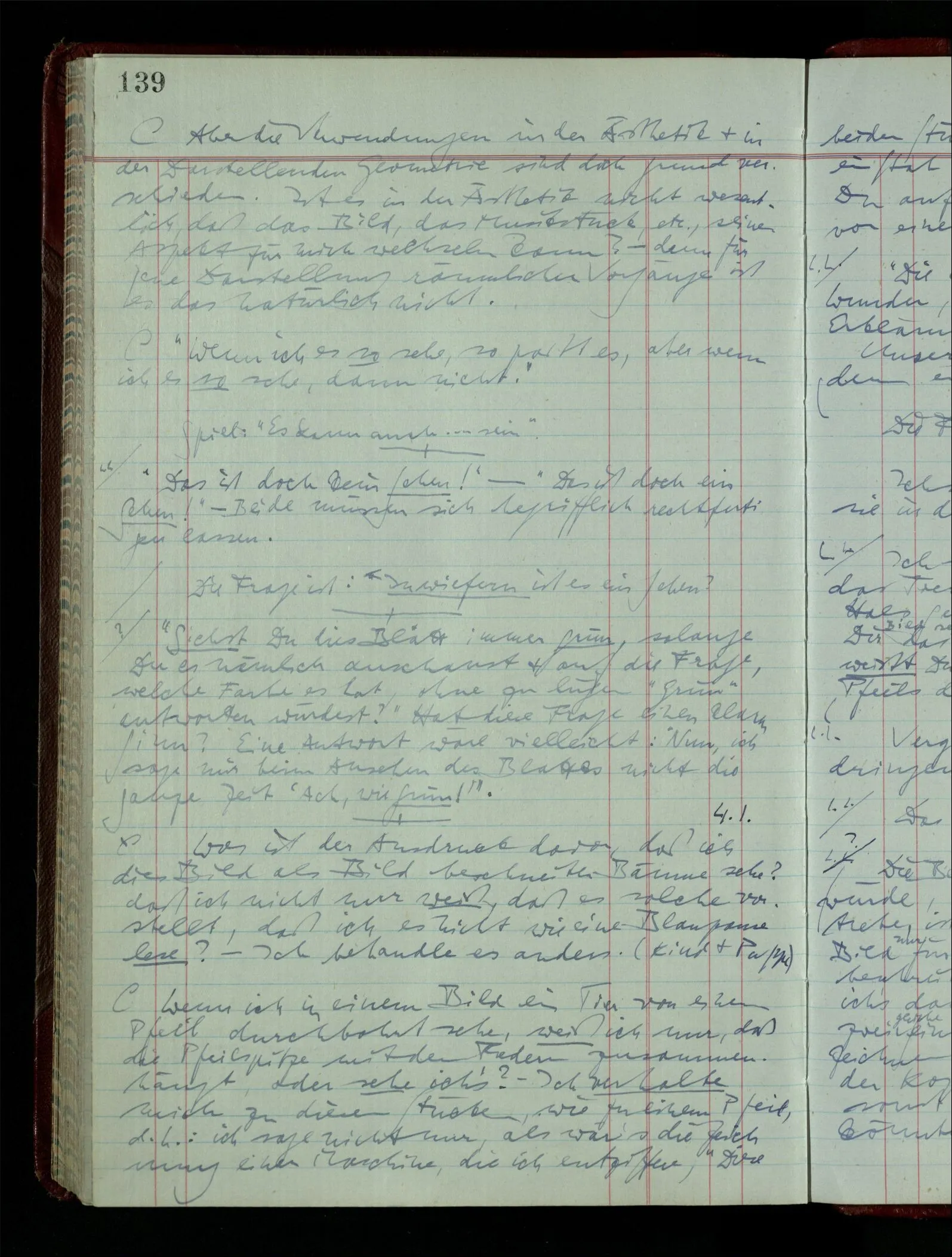 “Aber wenn ich mit ‘bläulich-gelb’ grün meine, so fasse ich eben diesen Ausdruck anders als nach der ursprünglichen Weise auf. Die ursprüngliche Auffassung bezeichnet einen andern & eben nicht gangbaren Weg.” Was ist aber hier das richtige Gleichnis? das vom physisch nicht gangbaren Weg, oder vom nicht-Existieren des Weges? Also das Gleichnis der physikalischen oder der mathematischen Unmöglichkeit?