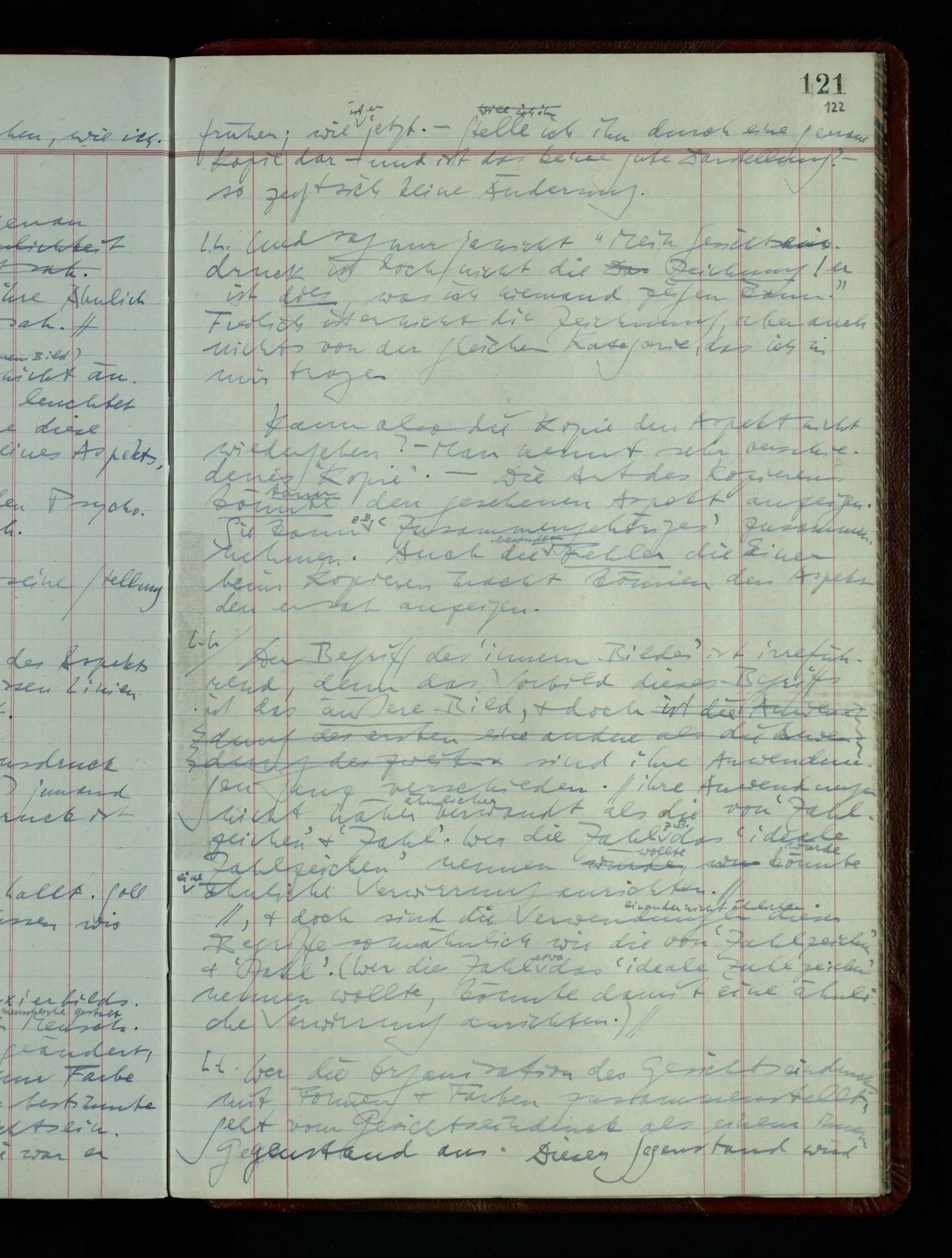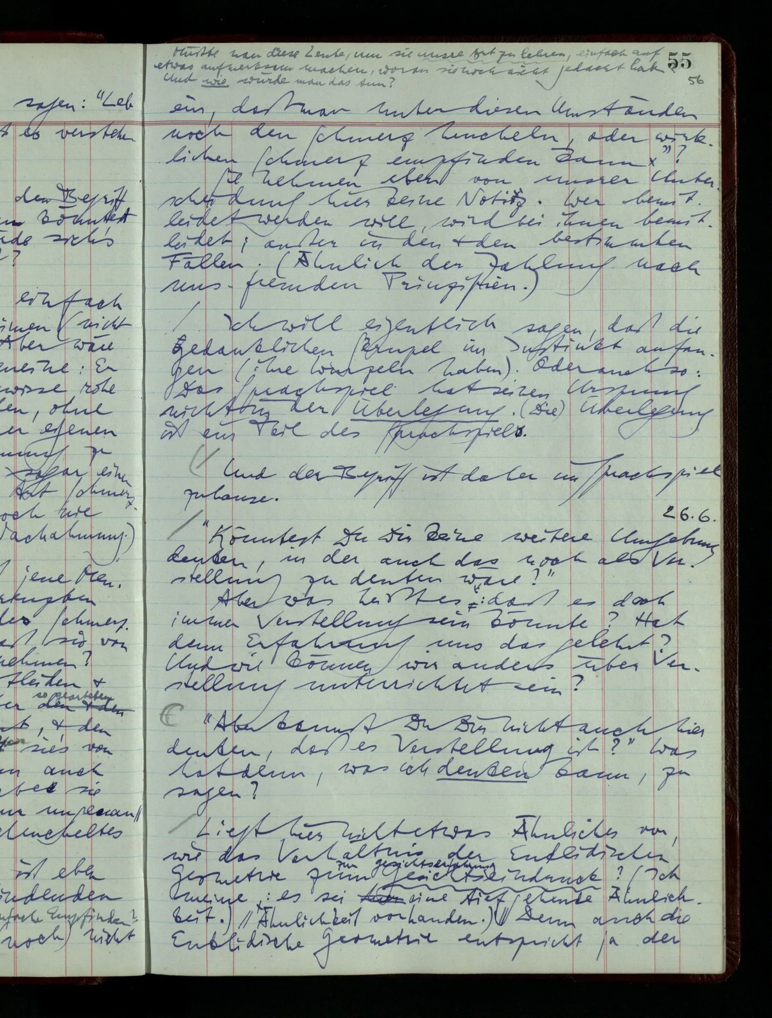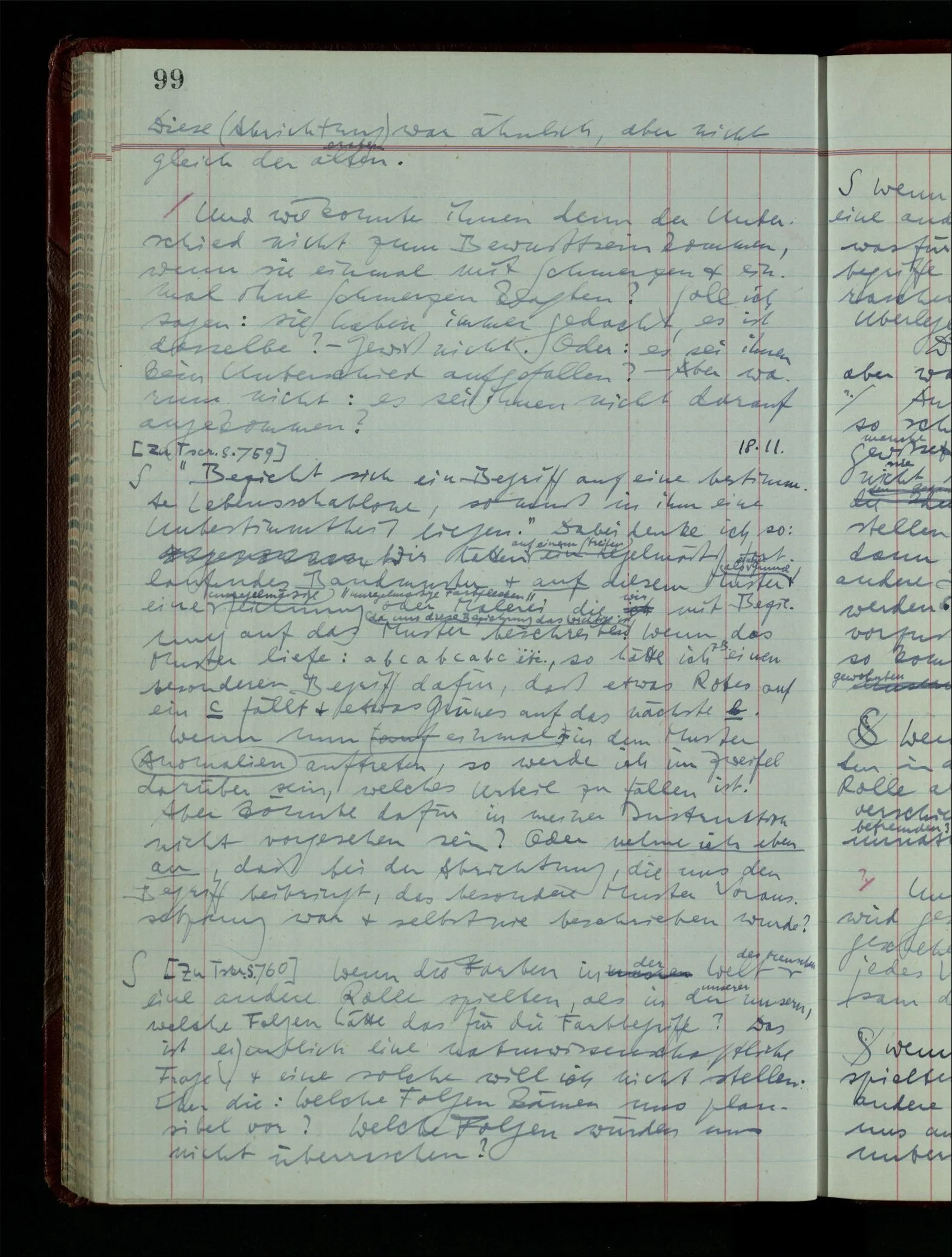 “Aber wenn ich mit ‘bläulich-gelb’ grün meine, so fasse ich eben diesen Ausdruck anders als nach der ursprünglichen Weise auf. Die ursprüngliche Auffassung bezeichnet einen andern & eben nicht gangbaren Weg.” Was ist aber hier das richtige Gleichnis? das vom physisch nicht gangbaren Weg, oder vom nicht-Existieren des Weges? Also das Gleichnis der physikalischen oder der mathematischen Unmöglichkeit?