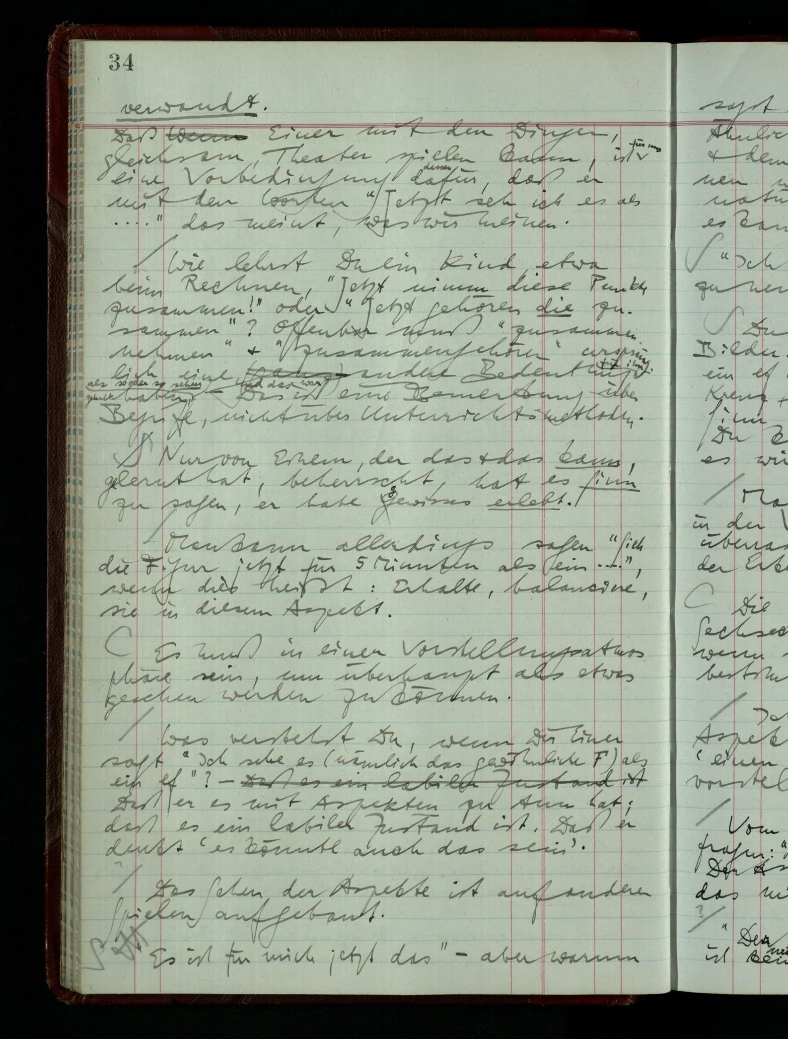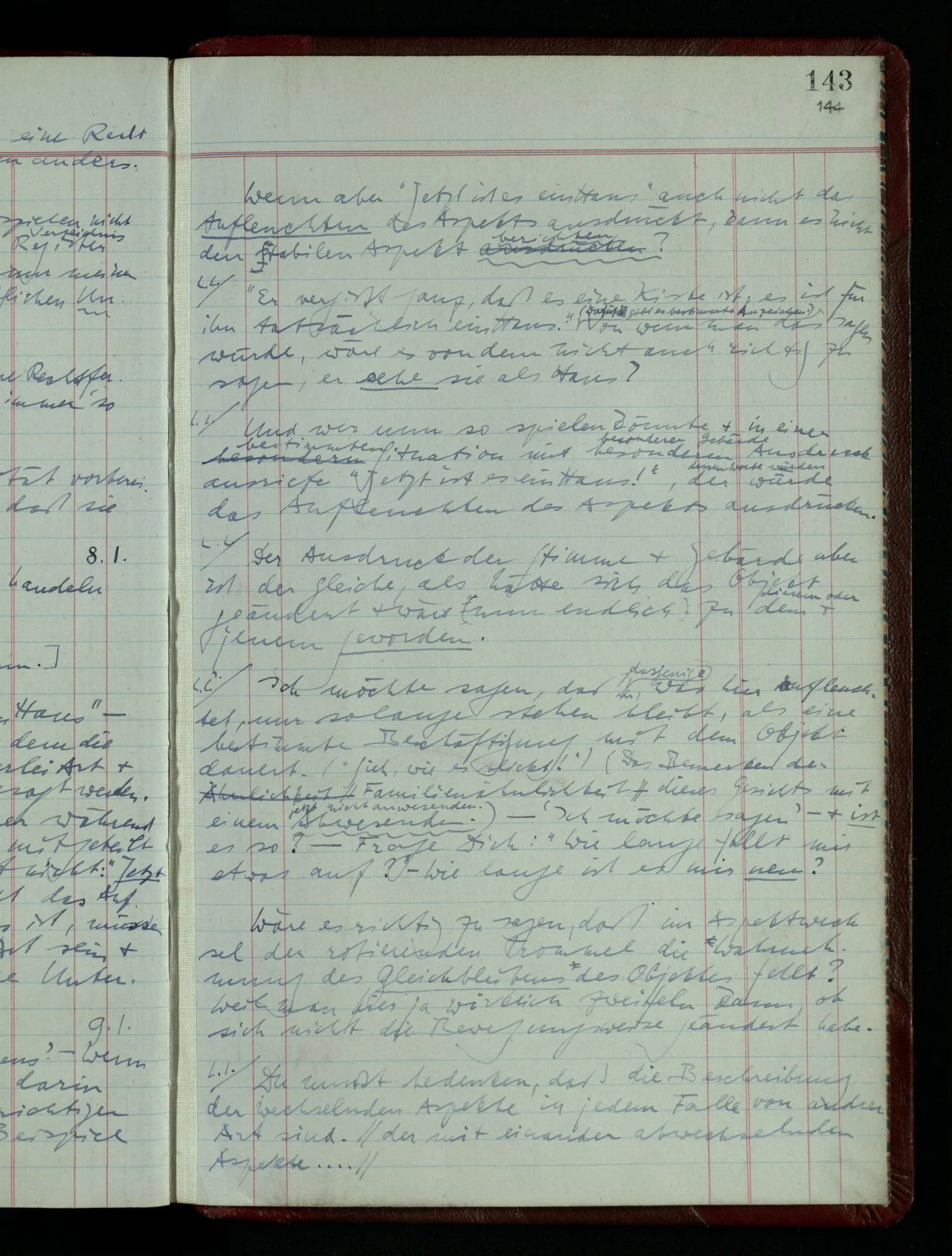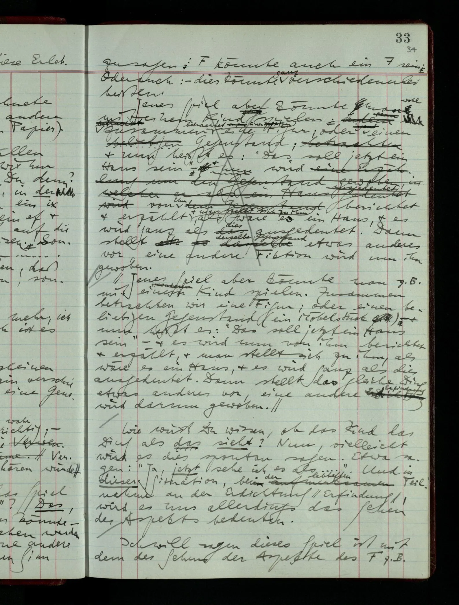 Das Kind sagt “Jetzt ist es ein Haus.” – das kann auch in dem Spiel, in dem die Kiste ein Haus ist, in mancherlei Art & in mancherlei Situationen gesagt werden. Jemand kommt in’s Zimmer während das Spiel im Gang ist; es wird ihm mitgeteilt “Jetzt ist es ein Haus”. Dies heißt nicht: “Jetzt wurde es für mich ein Haus”, nicht das Aufleuchten des Aspekts. Damit es das ist, müssen Ton & Situation von besonderer Art sein & es handelt sich wieder um feine Unterschiede des Benehmens.