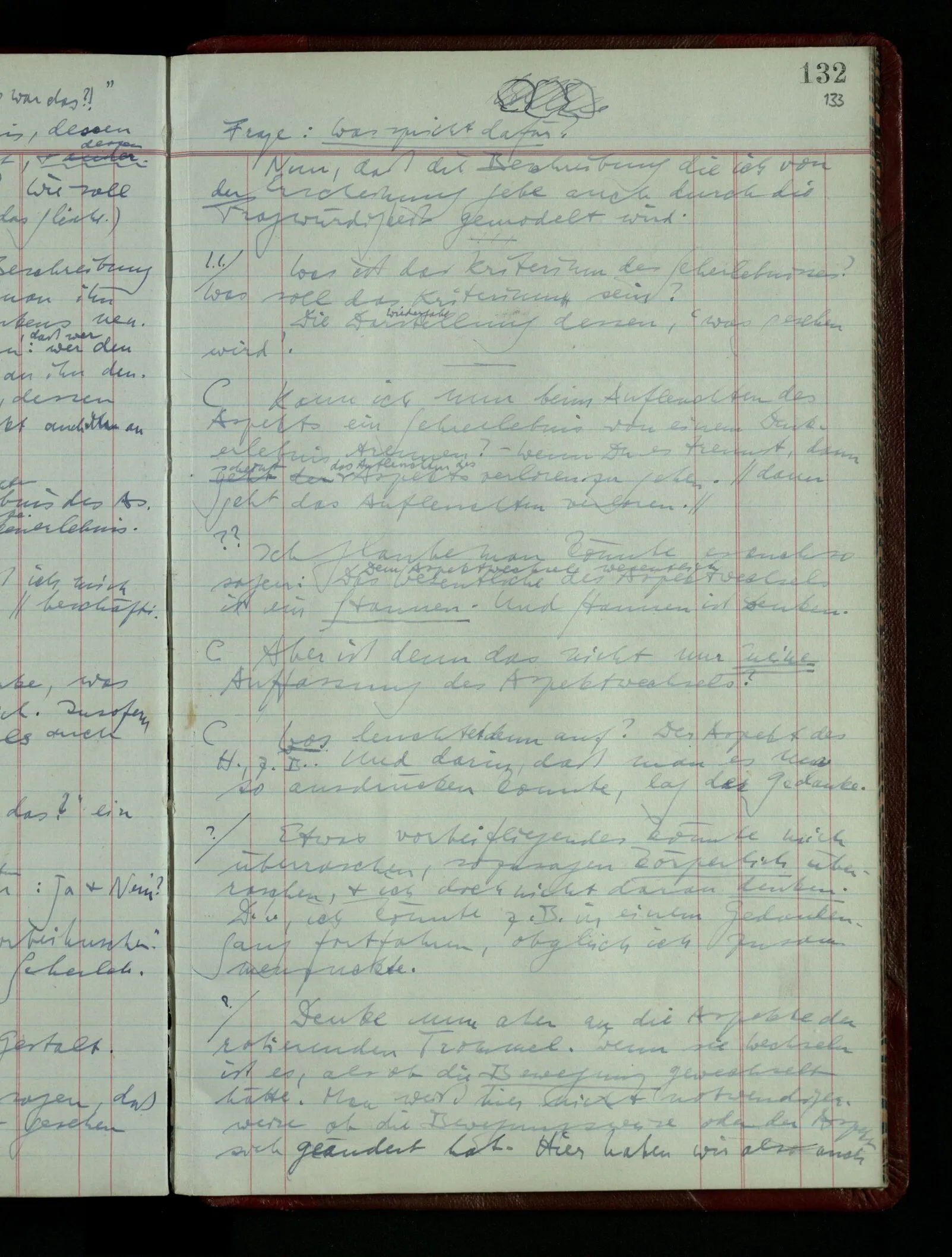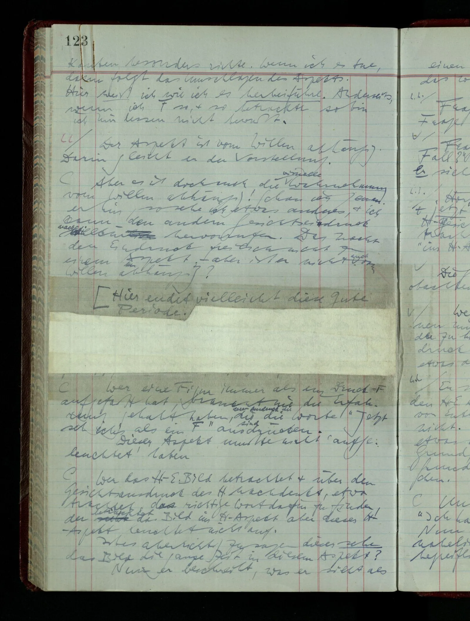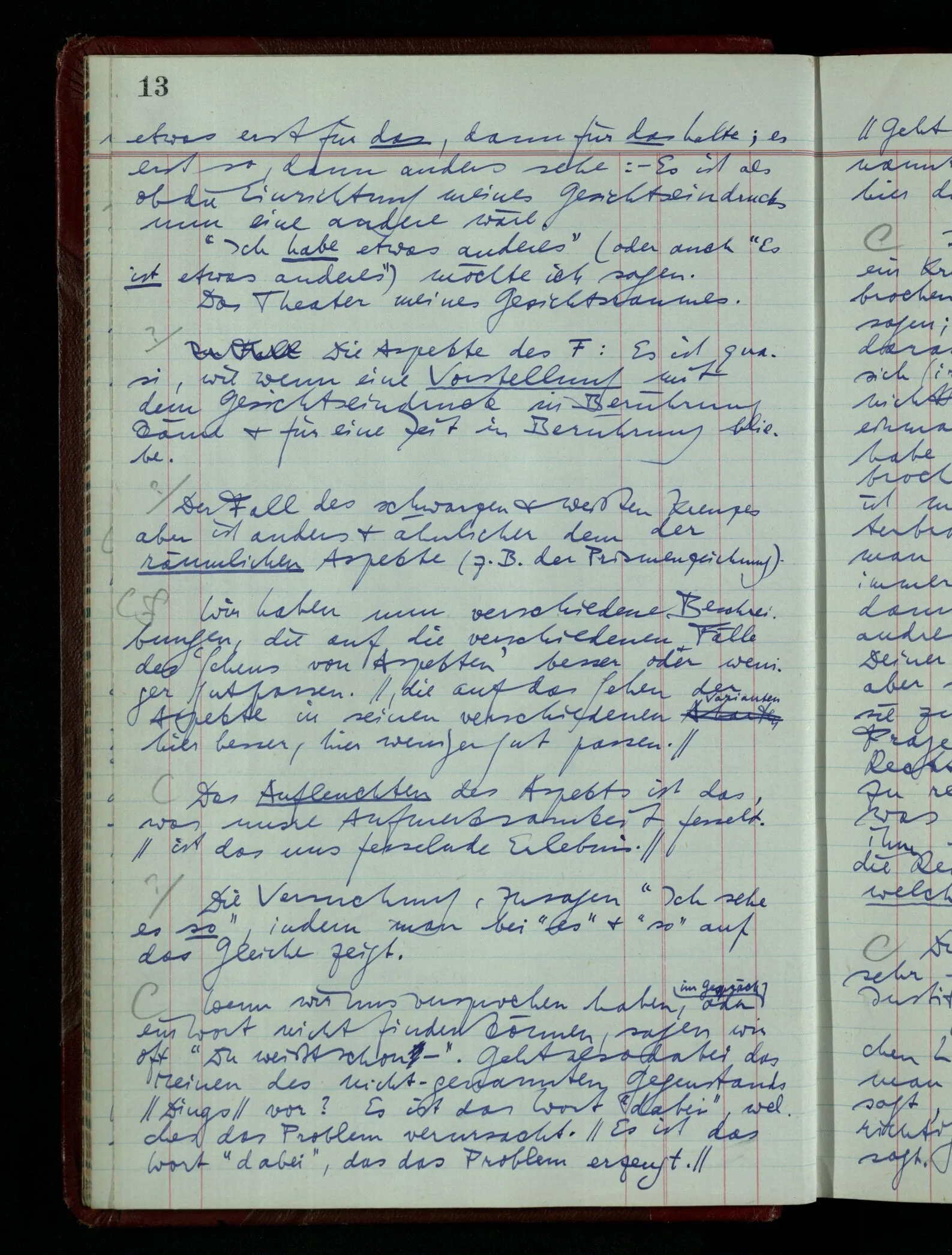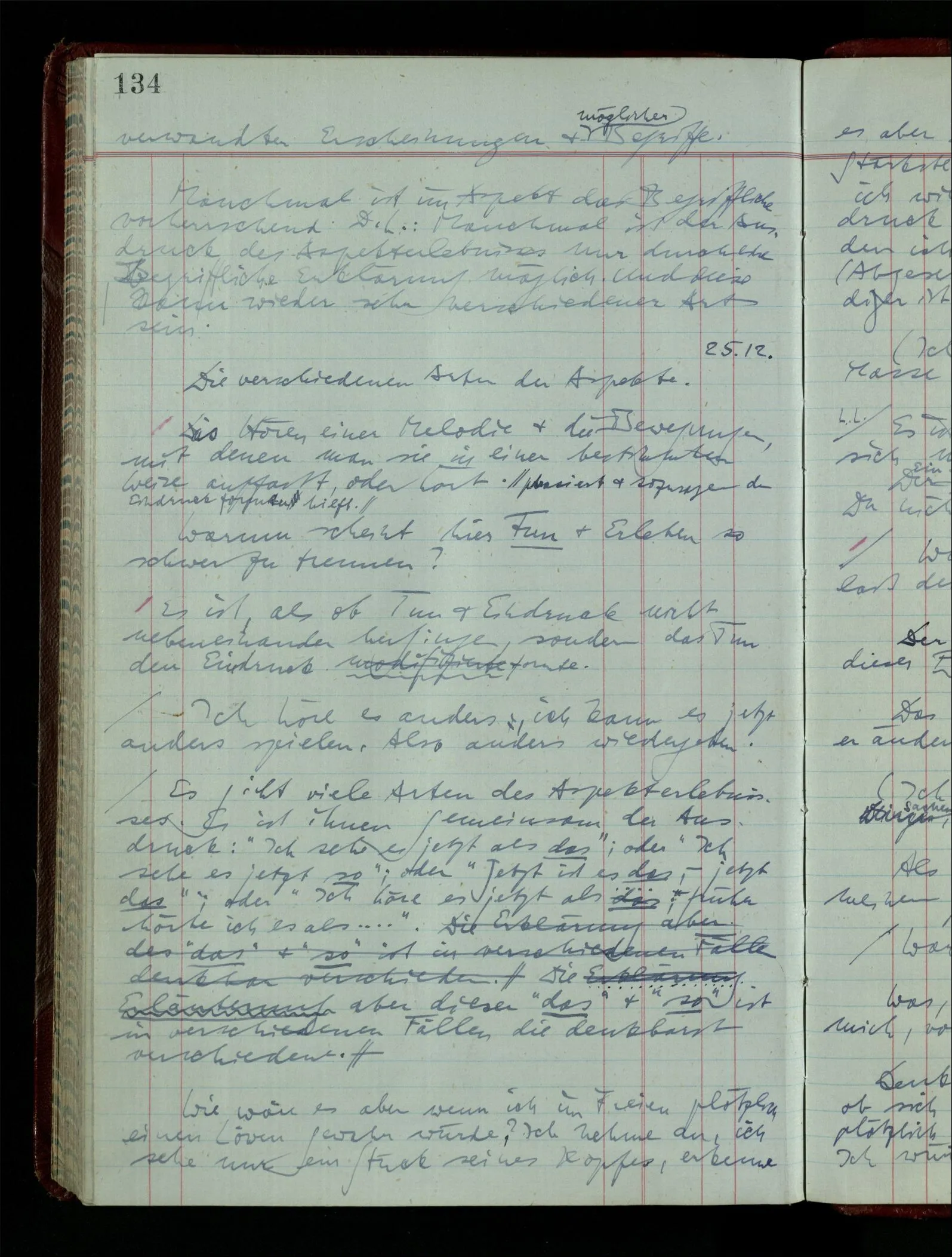 Das Kind sagt “Jetzt ist es ein Haus.” – das kann auch in dem Spiel, in dem die Kiste ein Haus ist, in mancherlei Art & in mancherlei Situationen gesagt werden. Jemand kommt in’s Zimmer während das Spiel im Gang ist; es wird ihm mitgeteilt “Jetzt ist es ein Haus”. Dies heißt nicht: “Jetzt wurde es für mich ein Haus”, nicht das Aufleuchten des Aspekts. Damit es das ist, müssen Ton & Situation von besonderer Art sein & es handelt sich wieder um feine Unterschiede des Benehmens.