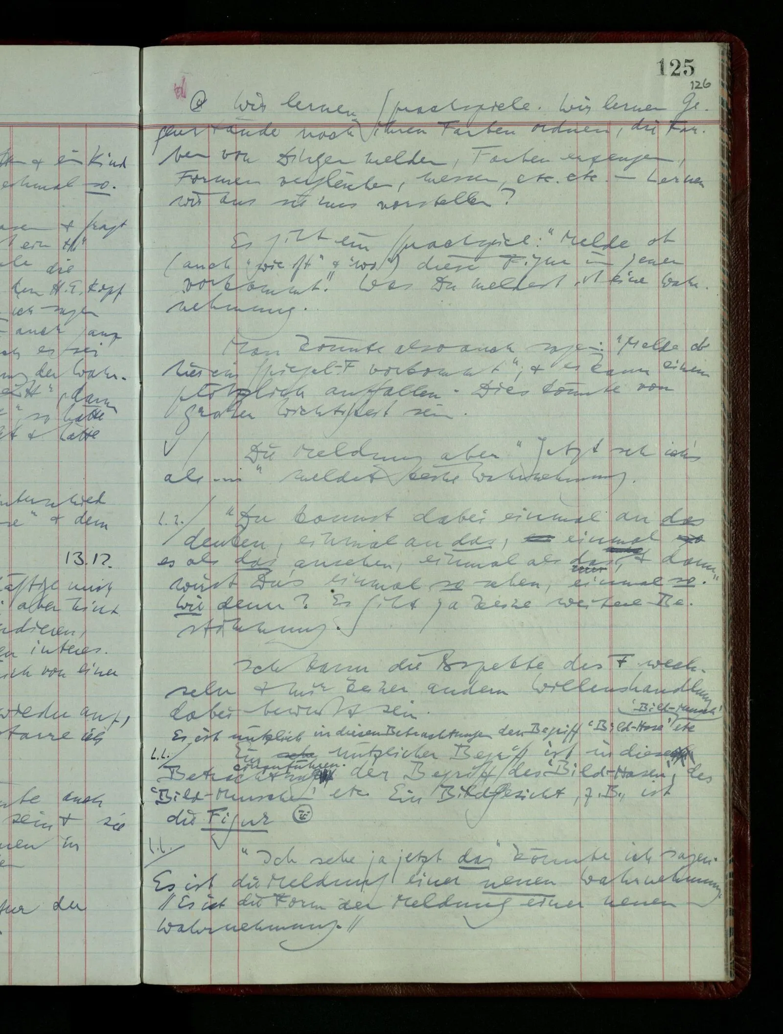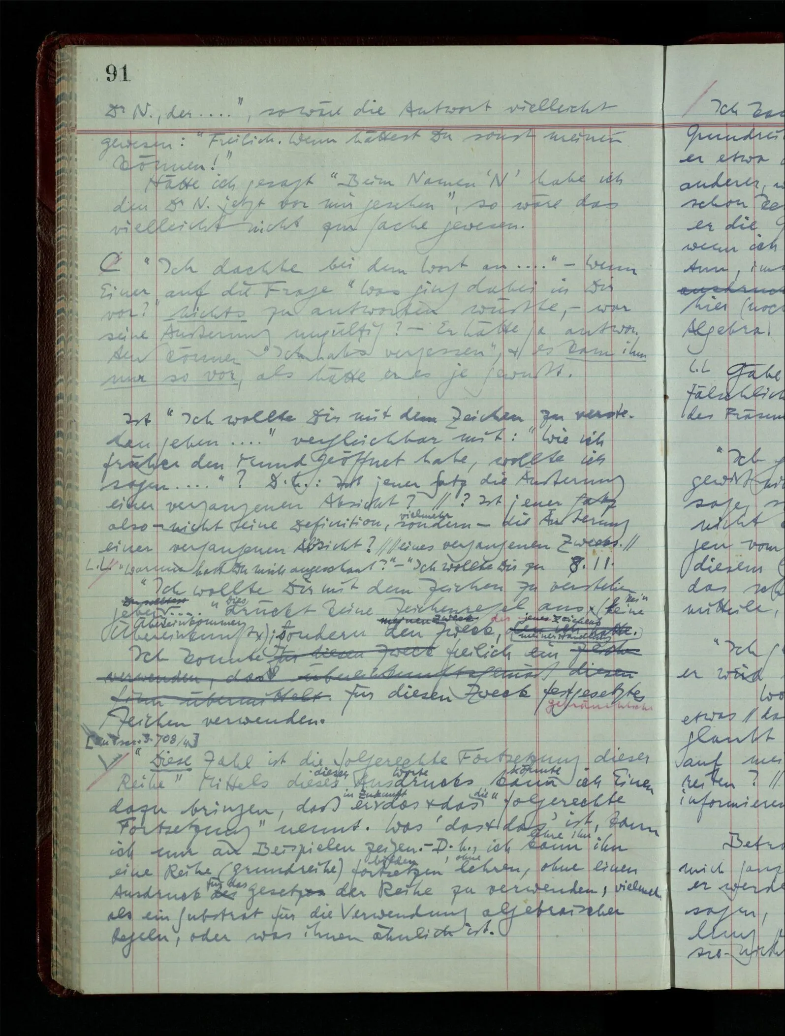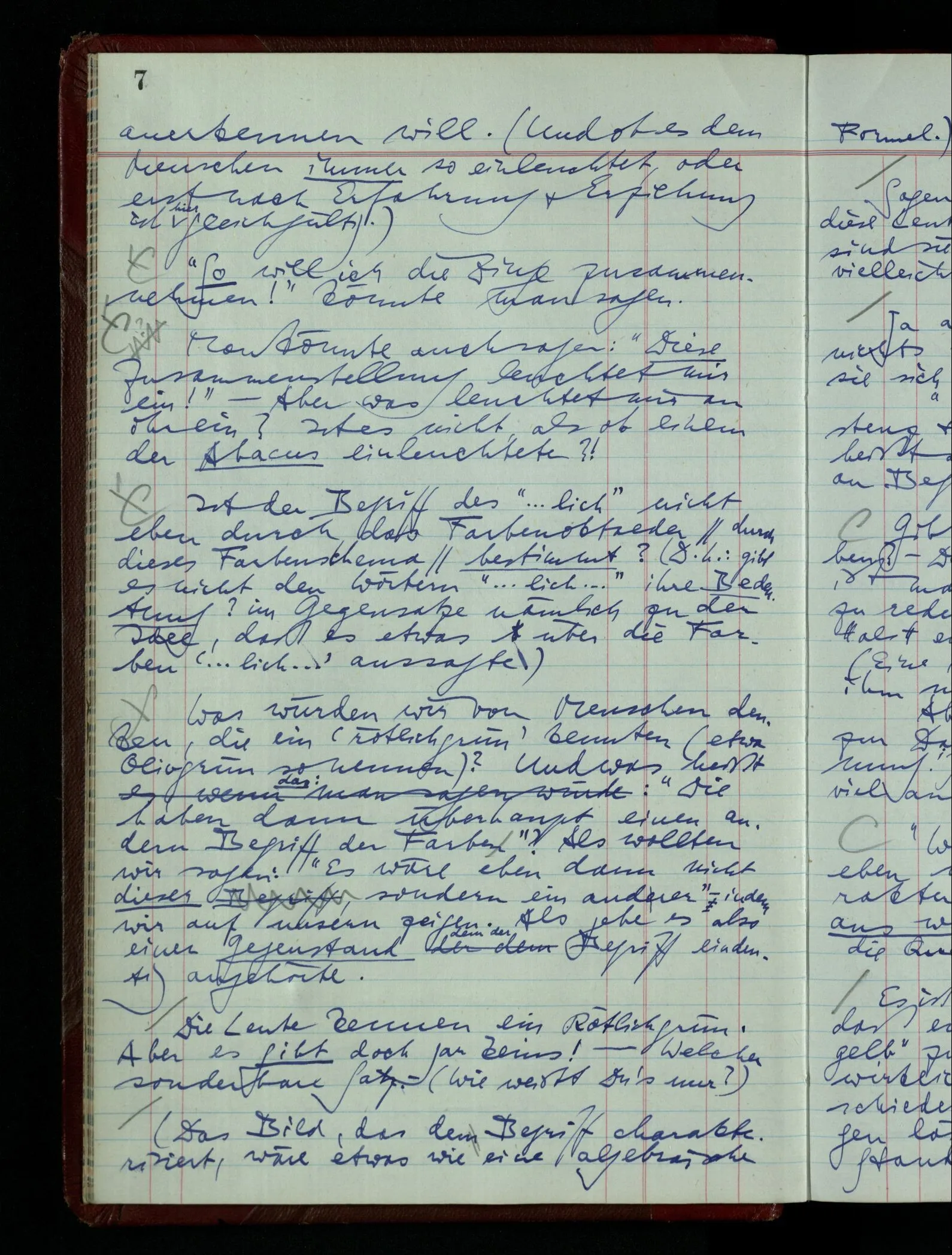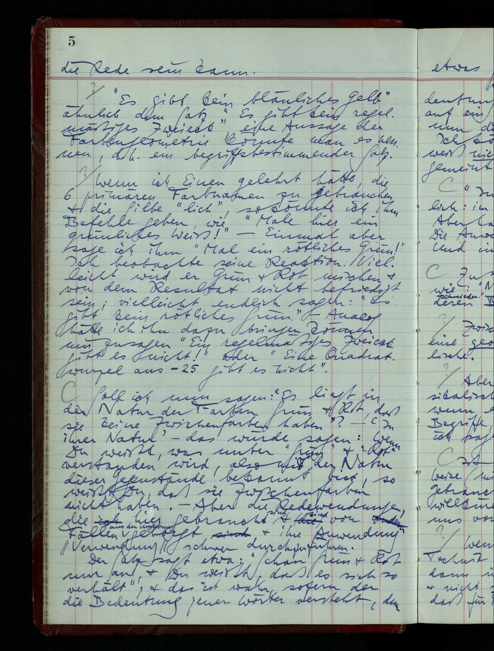 Wenn ich Einen gelehrt hätte, die 6 primären Farbnamen zu gebrauchen & die Silbe “lich”, so könnte ich ihm Befehle geben, wie “Male hier ein grünliches Weiß!” – Einmal aber sage ich ihm “Mal ein rötliches Grün!” Ich beobachte seine Reaktion. Vielleicht wird er Grün & Rot mischen & von dem Resultat nicht befriedigt sein; vielleicht endlich sagen: “Es gibt kein rötliches Grün.” – Analog hätte ich ihm dazu bringen können mir zu sagen “Ein regelmäßiges Zweieck gibt es nicht!” oder “Eine Quadratwurzel aus – 25 gibt es nicht”.