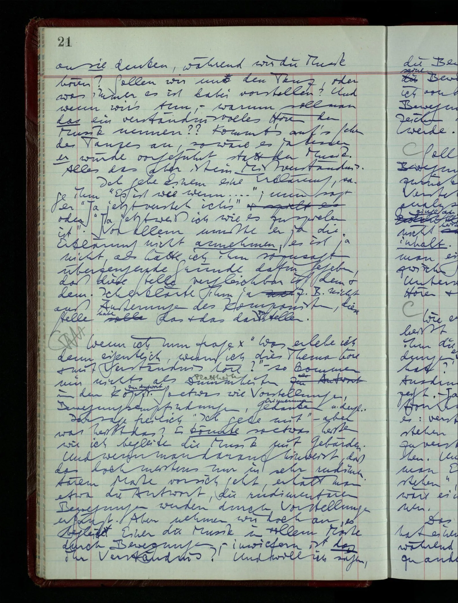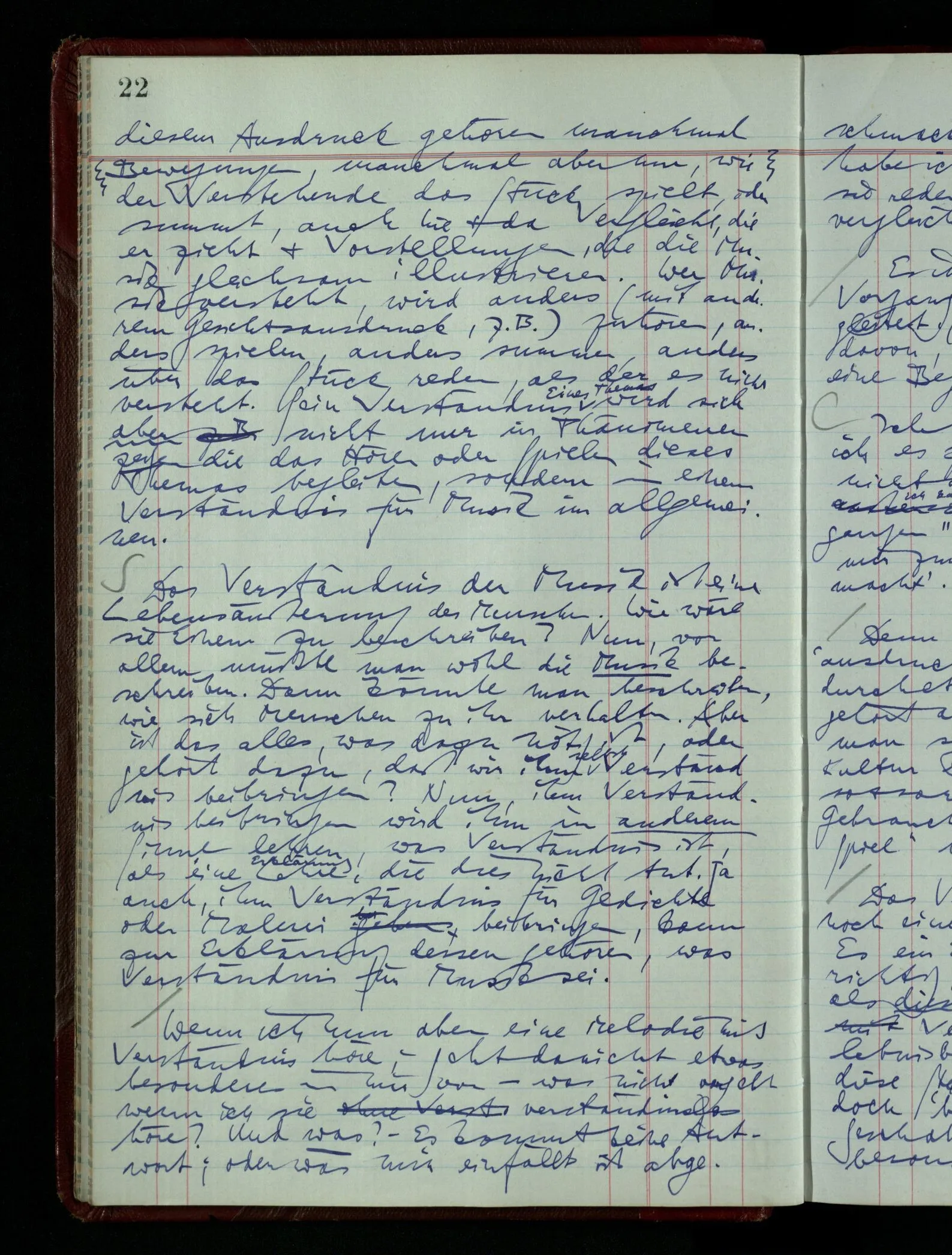 07.01.1949 Ich könnte von einem Bild von Picasso sagen, ich sehe es nicht als Menschen. Oder von manchem: Ich hätte es lange nicht als das, was es darstellt, sehen können, tue es aber jetzt. Das ist doch ähnlich dem: ich war lange nicht im Stande dies als Einheit zu hören, jetzt aber hör ich’s so. Früher schien es mir wie lauter kurze Stücke, die immer wieder abreißen, – jetzt hör ich’s als Organismus. (Bruckner.)