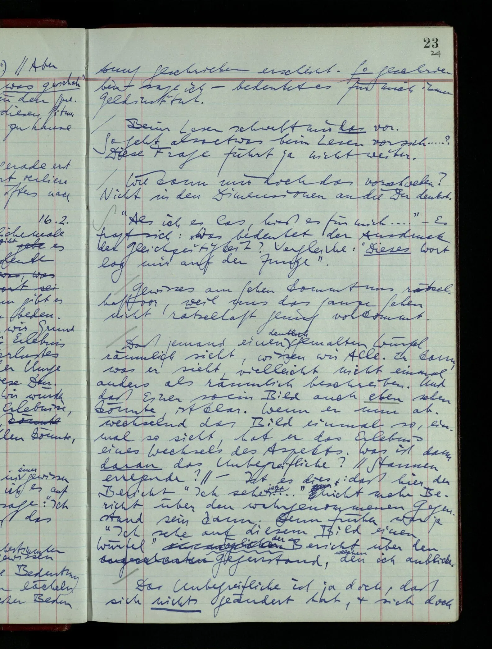 06.01.1949 Ich erkenne die 6-Ecke gleich als solche. Nun schau ich sie an & frage mich: “Seh ich sie wirklich als Sechsecke?” – & zwar: die ganze Zeit, während welcher ich sie sehe? – Und ich möchte antworten: Ich denke nicht die ganze Zeit an sie als Sechsecke.