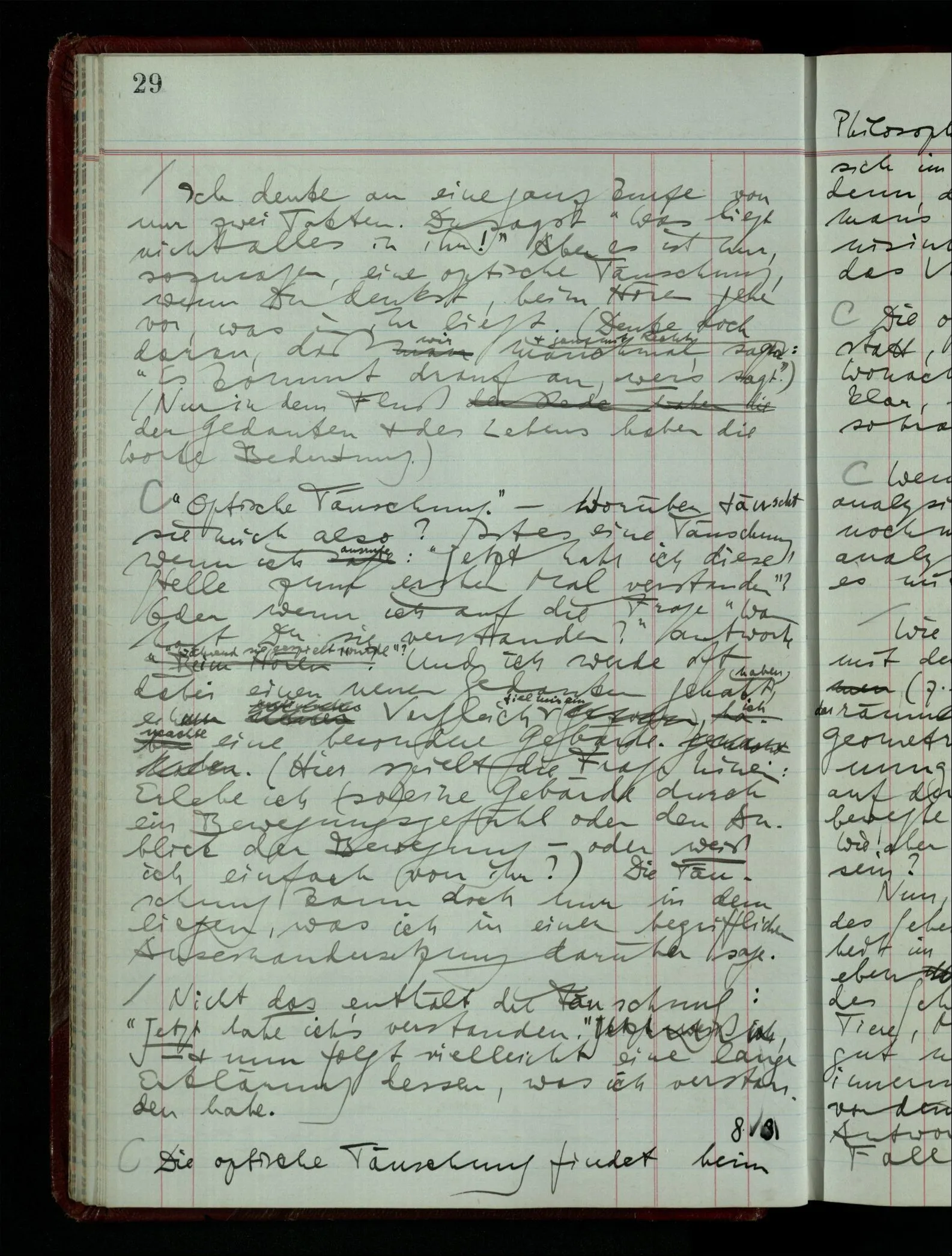 Ich sage vom Andern “Er scheint zu glauben …” & Andere sagen es von mir. Nun warum sage ich’s nie von mir, auch wenn die Andern es mit Recht von mir sagen? Ebenso: “Es ist offenbar er glaubt …” Sehe ich mich selbst denn nicht? – Man kann es sagen.