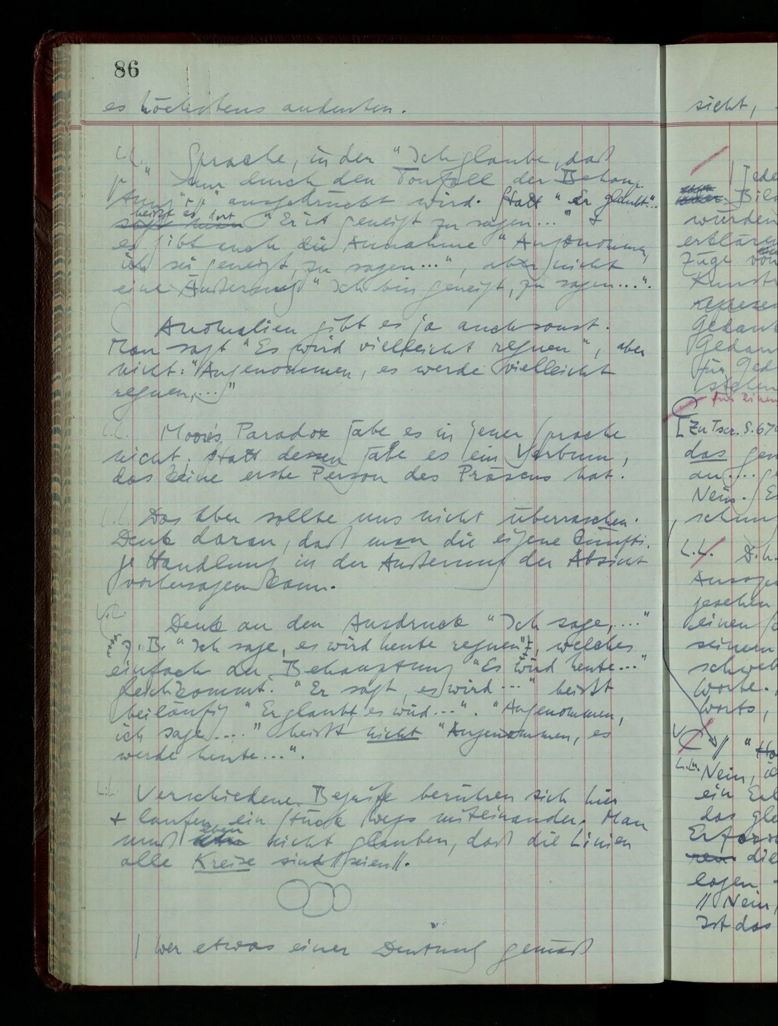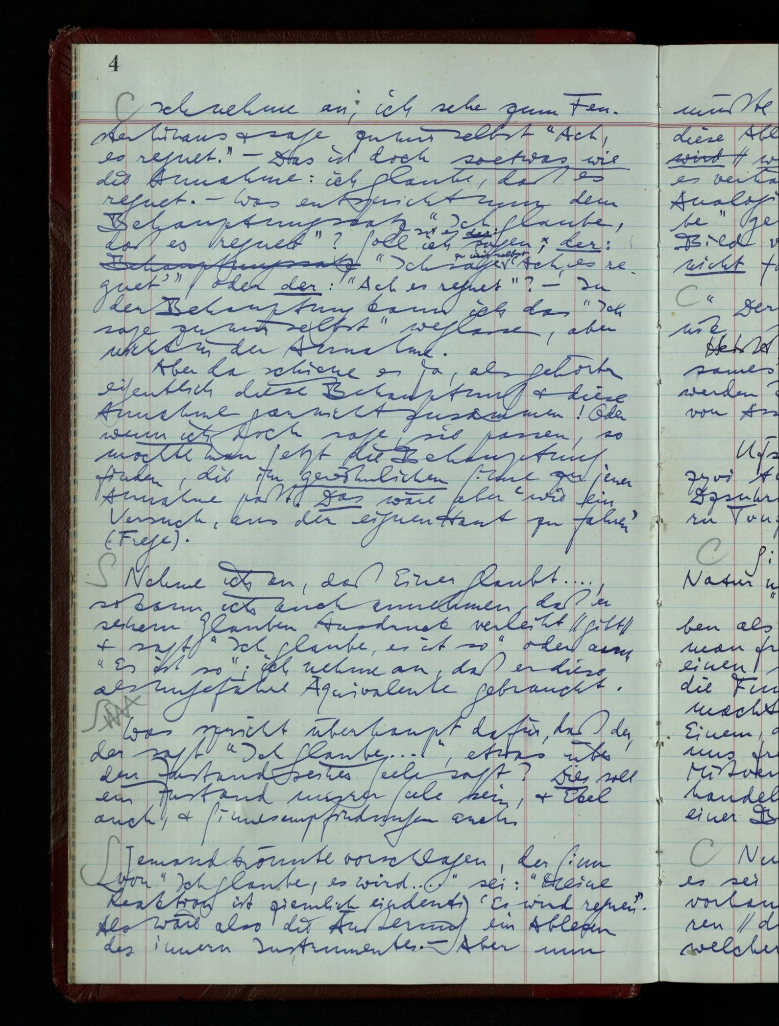 Nehme ich an, daß Einer glaubt …, so kann ich auch annehmen, daß er seinem Glauben Ausdruck verleiht & sagt “Ich glaube, es ist so” oder auch “Es ist so”; ich nehme an, daß er diese als ungefähre Äquivalente gebraucht.