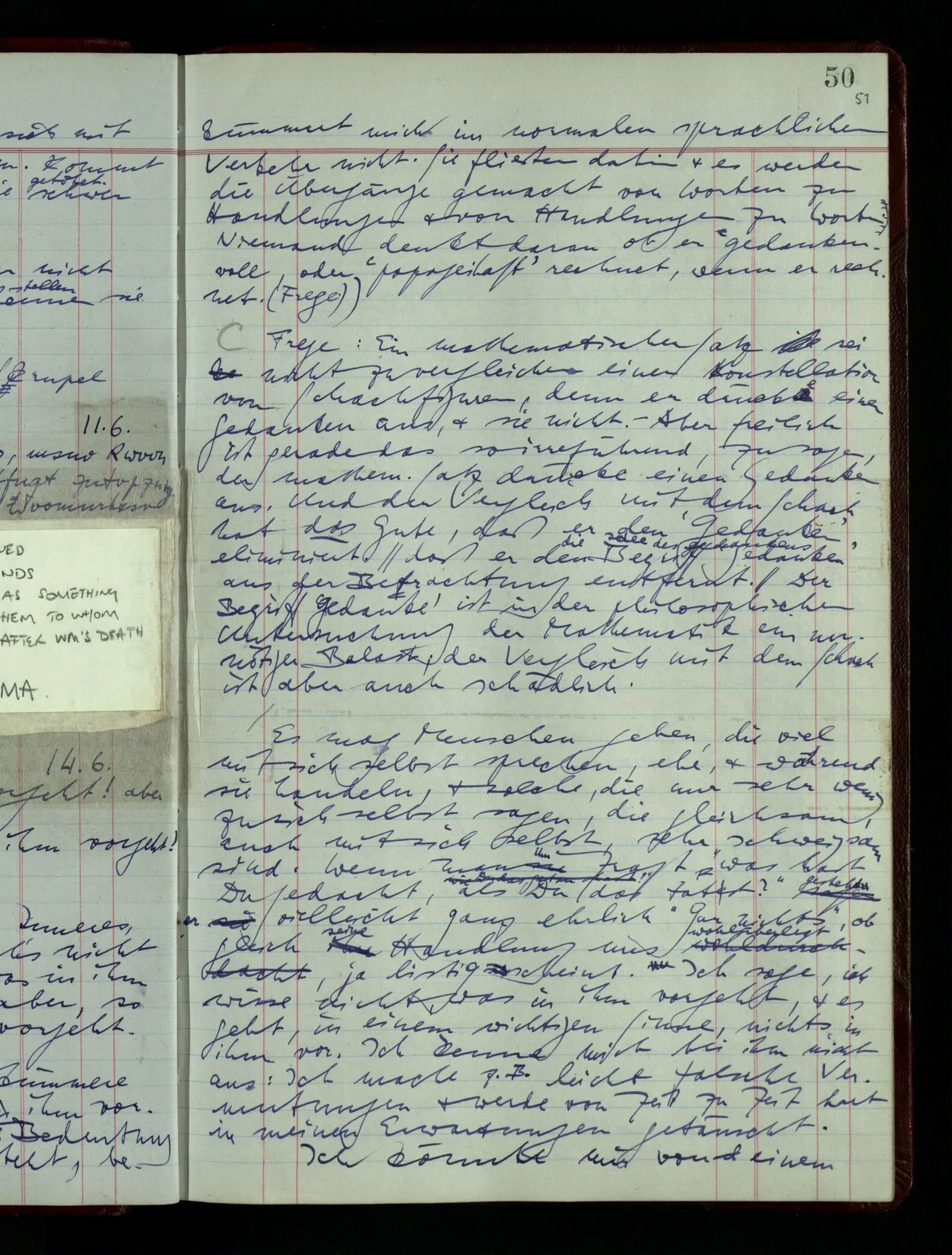 Ich nehme an, ich sehe zum Fenster hinaus & sage zu mir selbst “Ach, es regnet.” – Das ist doch so etwas wie die Annahme: ich glaube, daß es regnet. – Was entspricht nun dem Behauptungssatz “Ich glaube, daß es regnet”? Soll ich sagen, der: “Ich sage zu mir selbst ‘Ach, es regnet’”, oder der: “Ach es regnet”? – In der Behauptung kann ich das “Ich sage zu mir selbst” weglassen, aber nicht in der Annahme. Aber da schiene es ja, als gehörten eigentlich diese Behauptung & diese Annahme gar nicht zusammen! Oder wenn ich doch sage, sie passen, so möchte man jetzt die Behauptung finden, die im gewöhnlichen Sinne zu jener Annahme paßt. Das wäre aber ‘wie ein Versuch, aus der eignen Haut zu fahren’ (Frege).