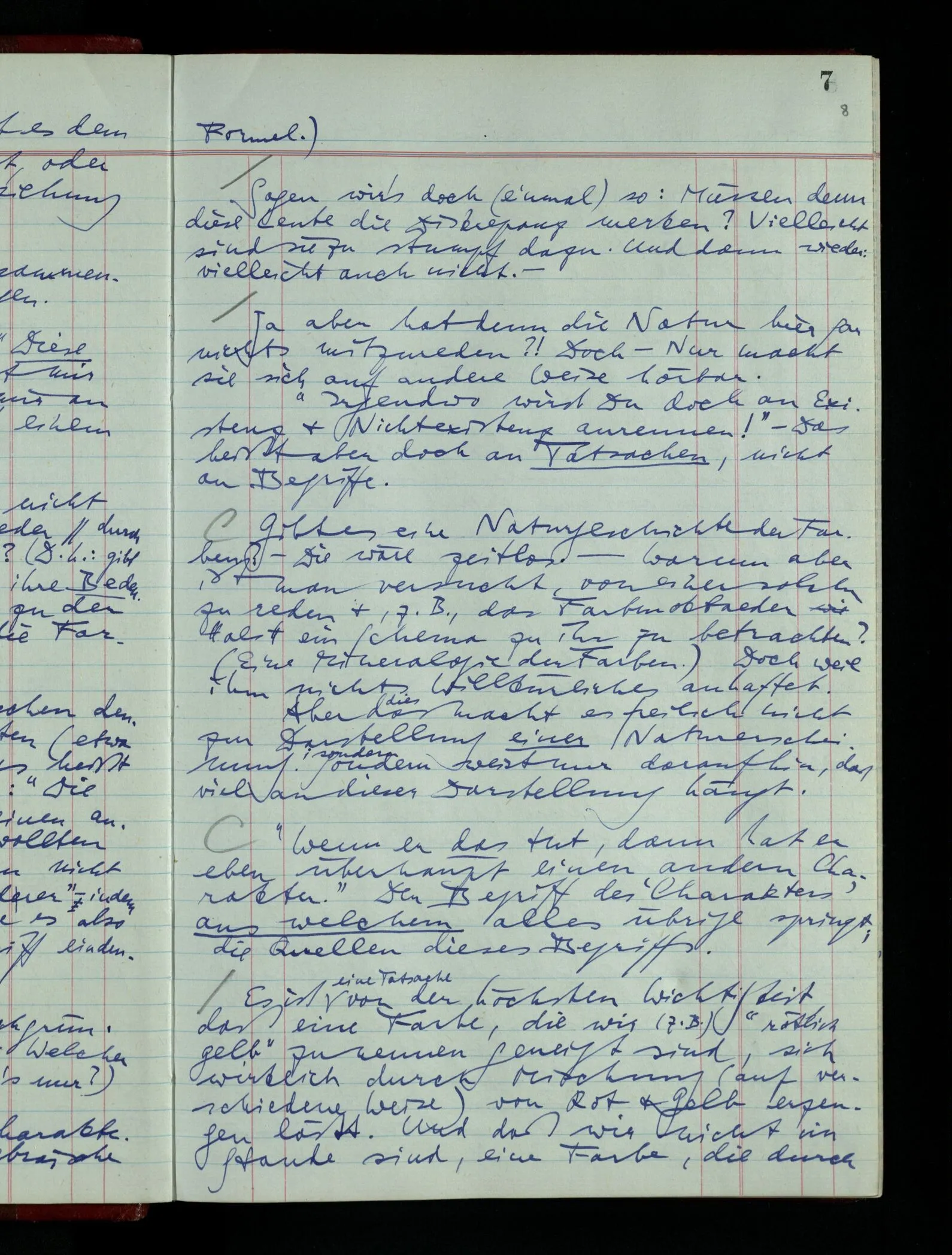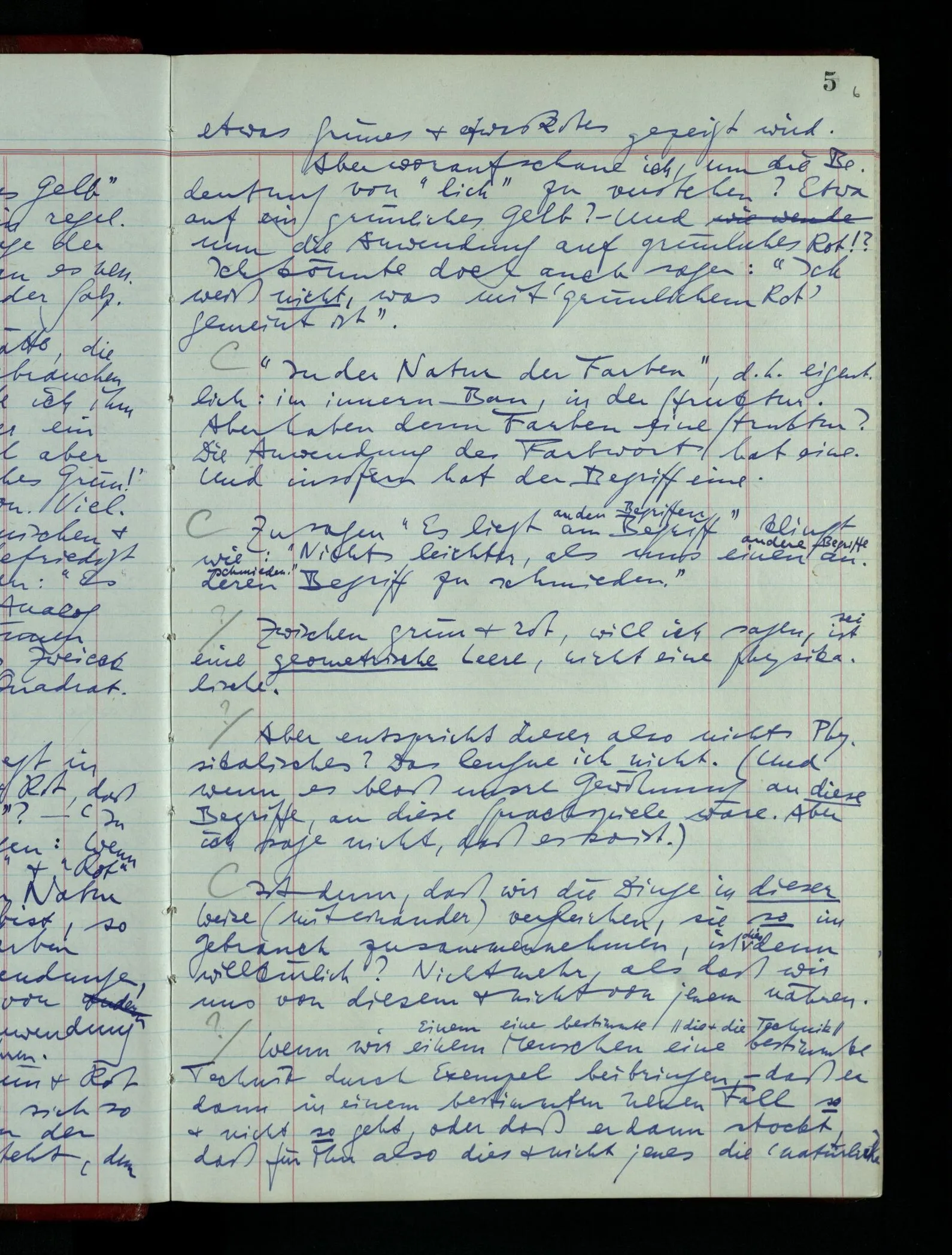 Soll ich nun sagen: “Es liegt in der Natur der Farben Grün & Rot, daß sie keine Zwischenfarben haben”? – ‘In ihrer Natur’ – das würde sagen: Wenn Du weißt, was unter “Grün” & “Rot” verstanden wird, also mit der Natur dieser Gegenstände bekannt bist, so weißt Du, daß sie Zwischenfarben nicht haben. – Aber die Redewendungen, die hier gebraucht sind sind von Fällen aus der Umgebung geborgt & ihre Anwendung schwer durchführen. Der Satz sagt etwa: “Schau Grün & Rot nur an, & Du weißt, daß es sich so verhält”; & das ist wahr, sofern der die Bedeutung jener Wörter versteht, dem etwas Grünes & etwas Rotes gezeigt wird. Aber worauf schaue ich, um die Bedeutung von “lich” zu verstehen? Etwa auf ein grünliches Gelb? – Und nun die Anwendung auf grünliches Rot!? Ich könnte doch auch sagen: “Ich weiß nicht, was mit ‘grünlichem Rot’ gemeint ist”.