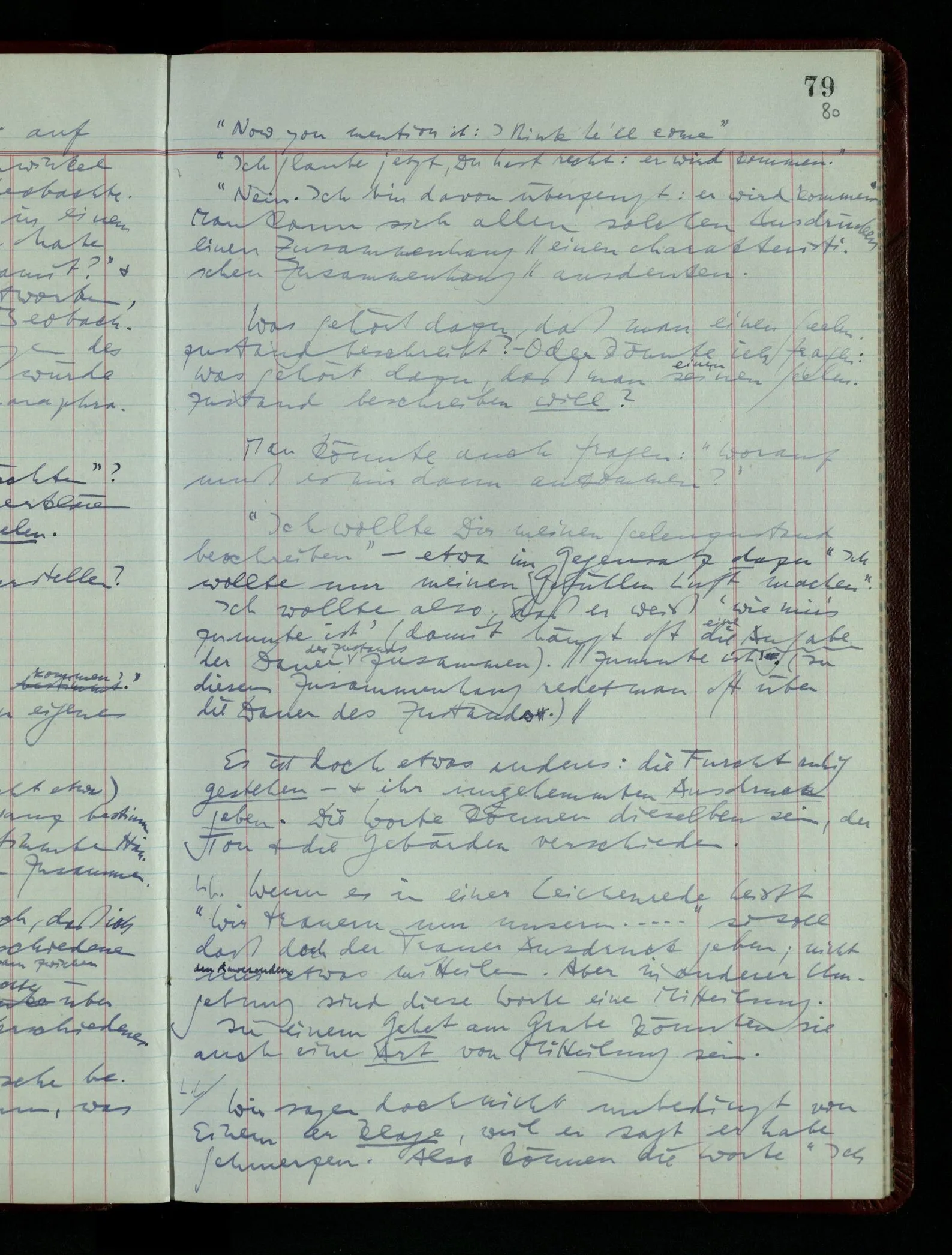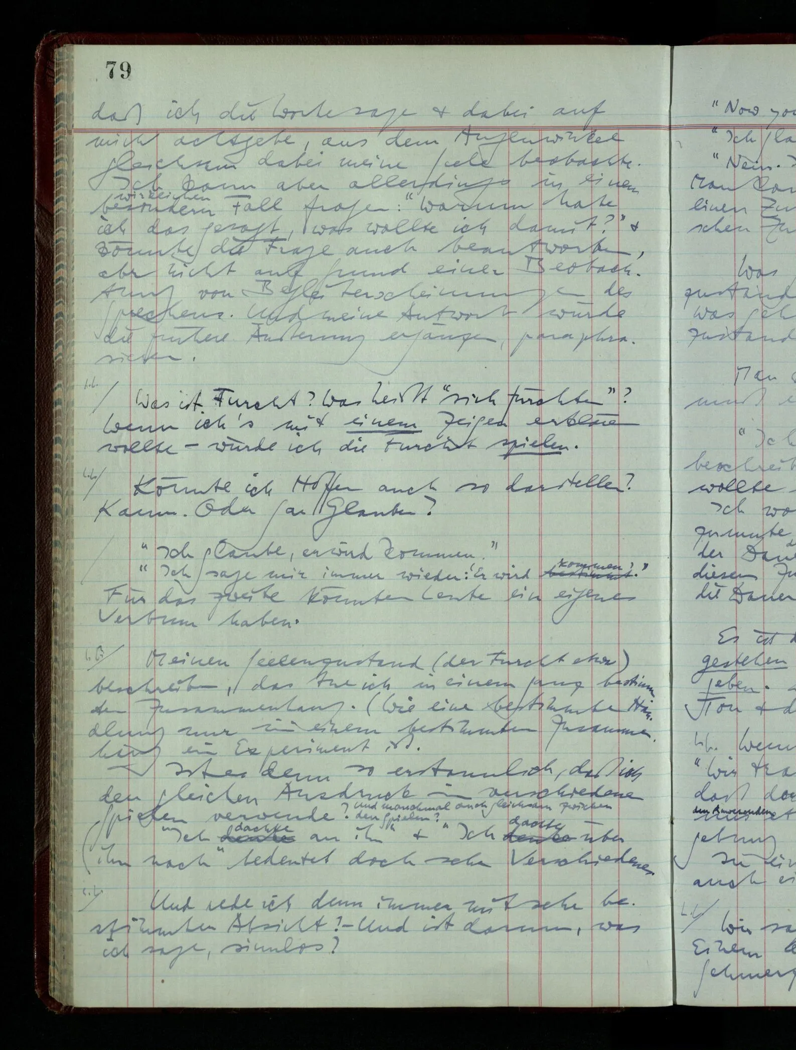 Was spricht überhaupt dafür, daß der, der sagt “Ich glaube …”, etwas über den Zustand seiner Seele sagt? Dies soll ein Zustand unsrer Seele sein, & Ekel auch, & Sinnesempfindungen auch.