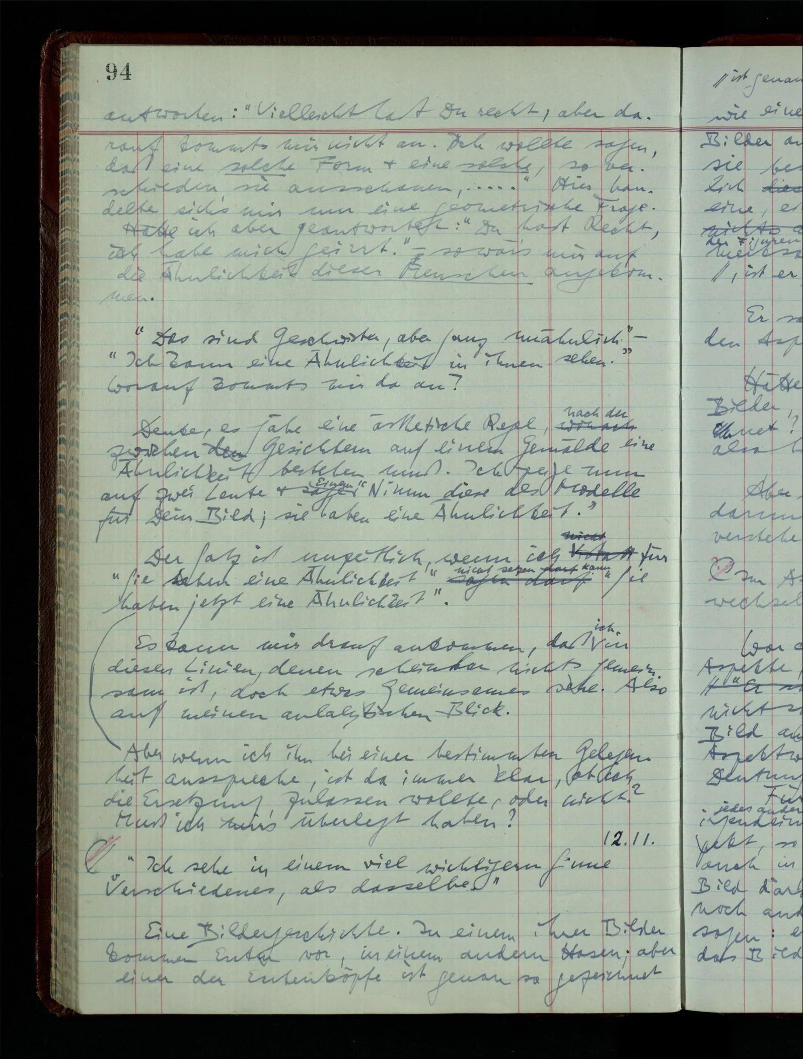 Der Begriff des Bemerkens. Ich kann sagen ich bemerke manchmal die Ähnlichkeit dieses Bilds mit ‥‥, & dergleichen; aber ich sage nicht ich bemerke manchmal daß diese Photographie ein Gesicht ist. Ich könnte sagen: Ein Bild lebt nicht immer für mich, während ich es sehe.