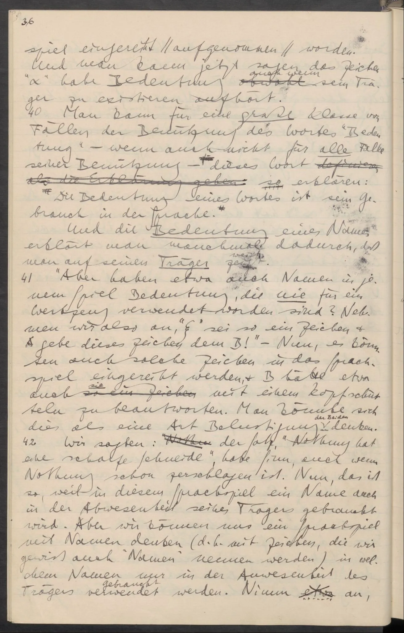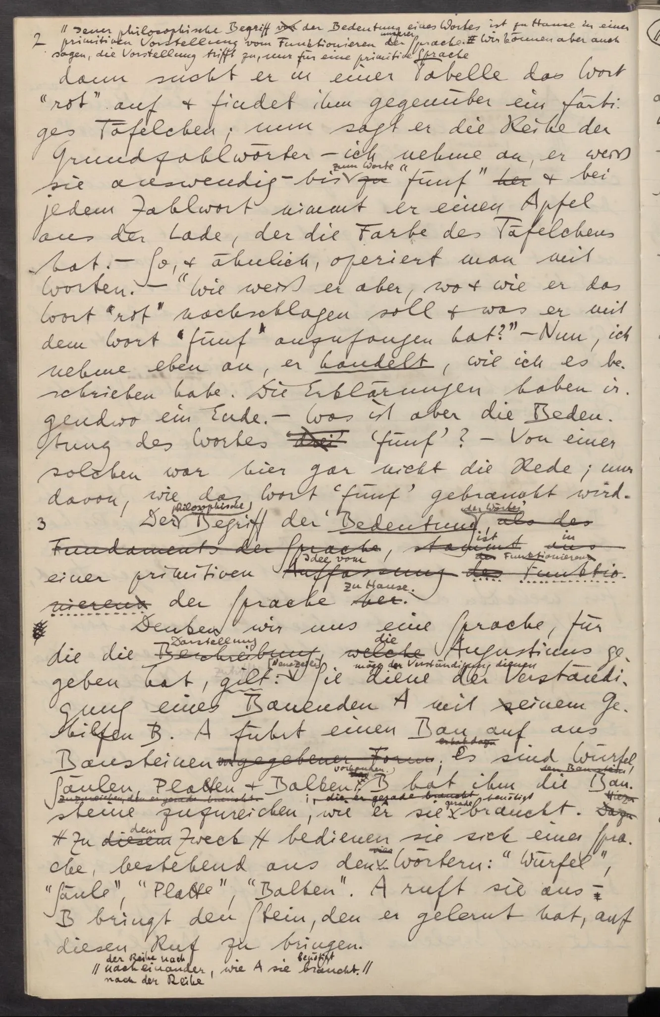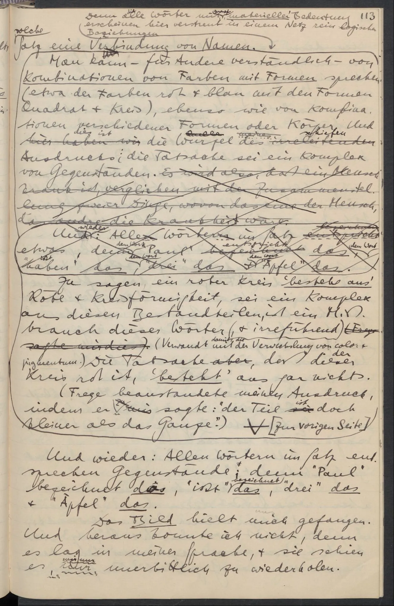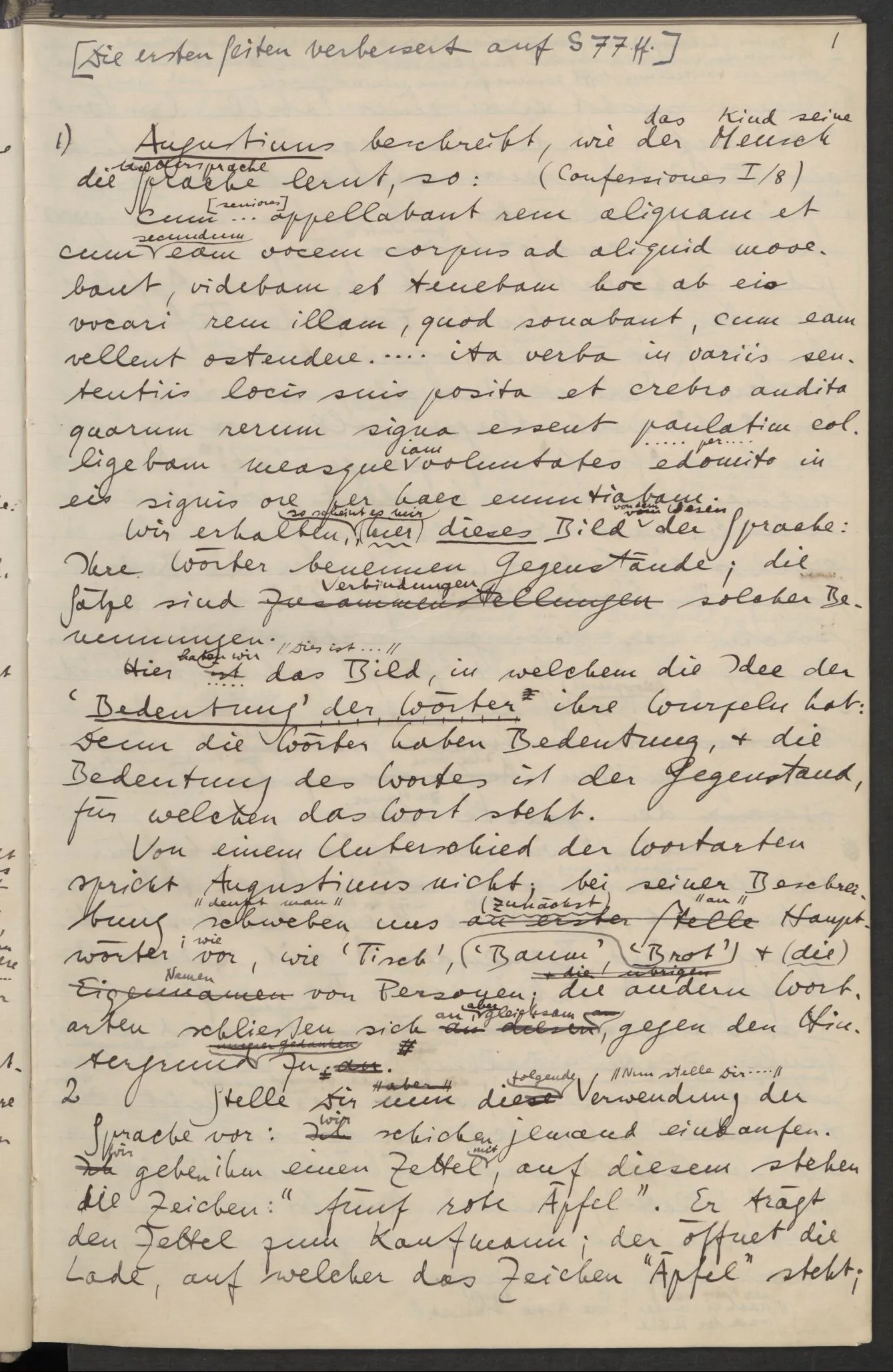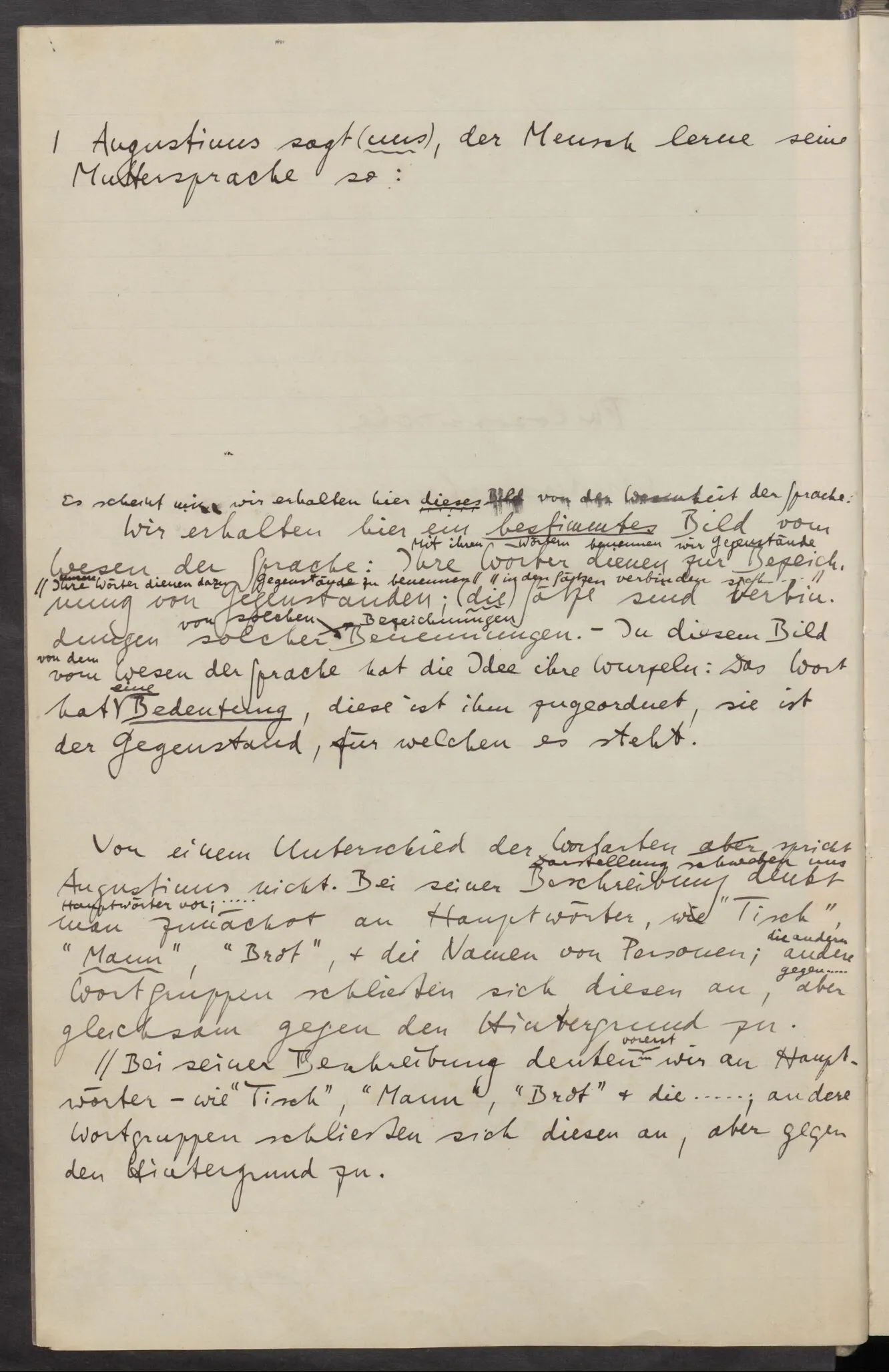 Wir erhalten, so scheint es mir, (hier) dieses Bild vom Wesen der Sprache: Ihre Wörter benennen Gegenstände; die Sätze sind Verbindungen solcher Benennungen. Hier ist das Bild, in welchem die Idee der ‘Bedeutung’ der Wörter ihre Wurzeln hat: Denn die Wörter haben Bedeutung, & die Bedeutung des Wortes ist der Gegenstand, für welchen das Wort steht.