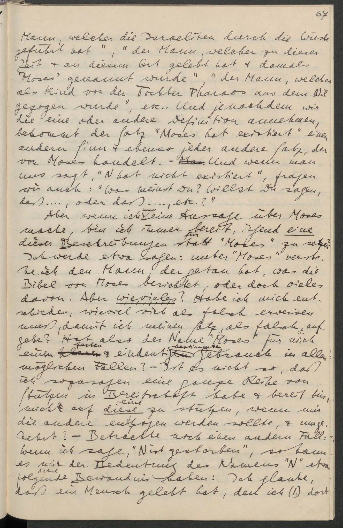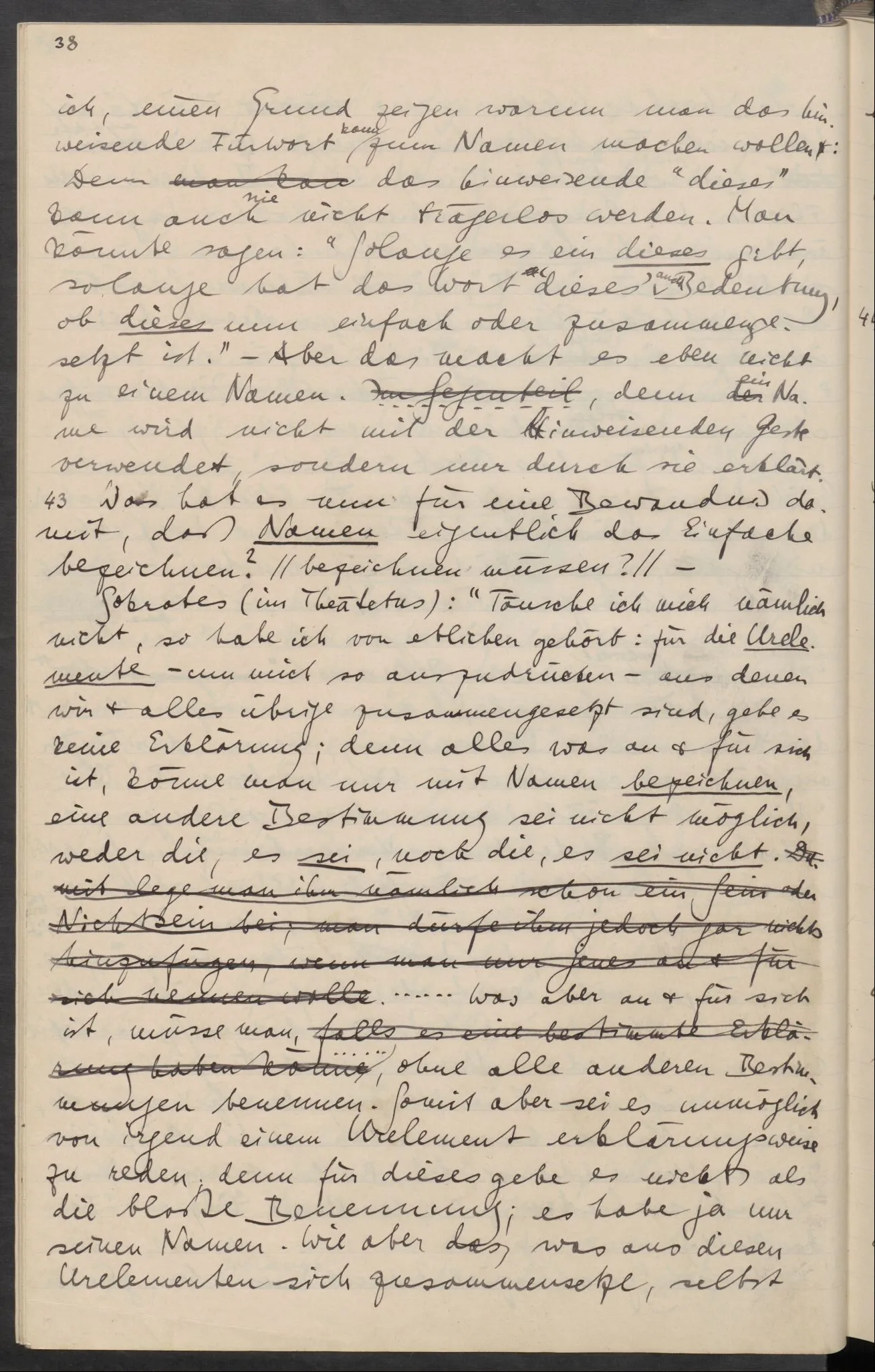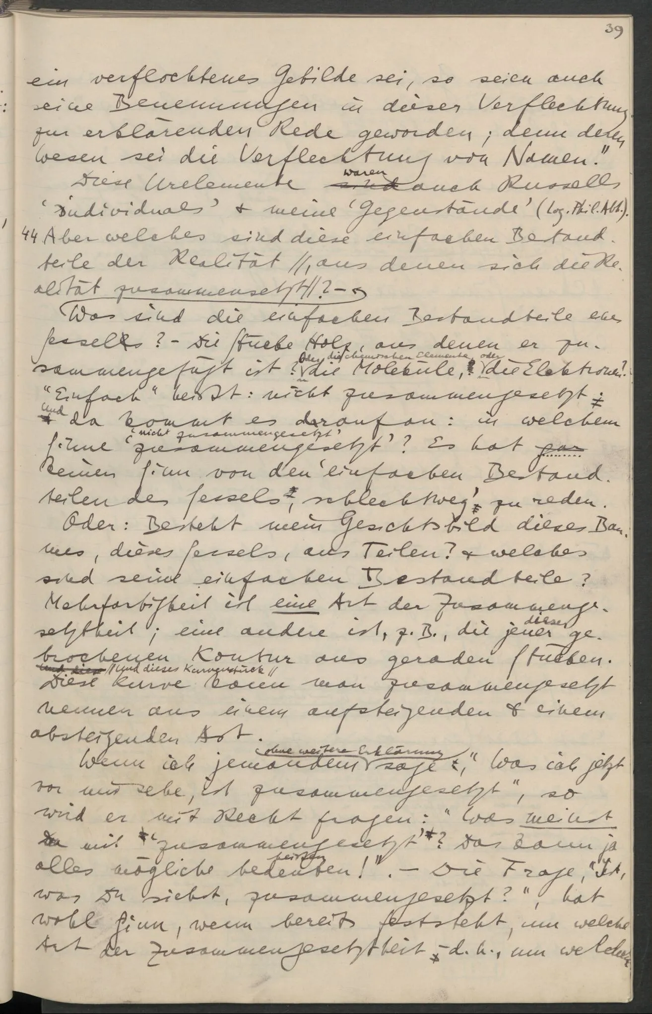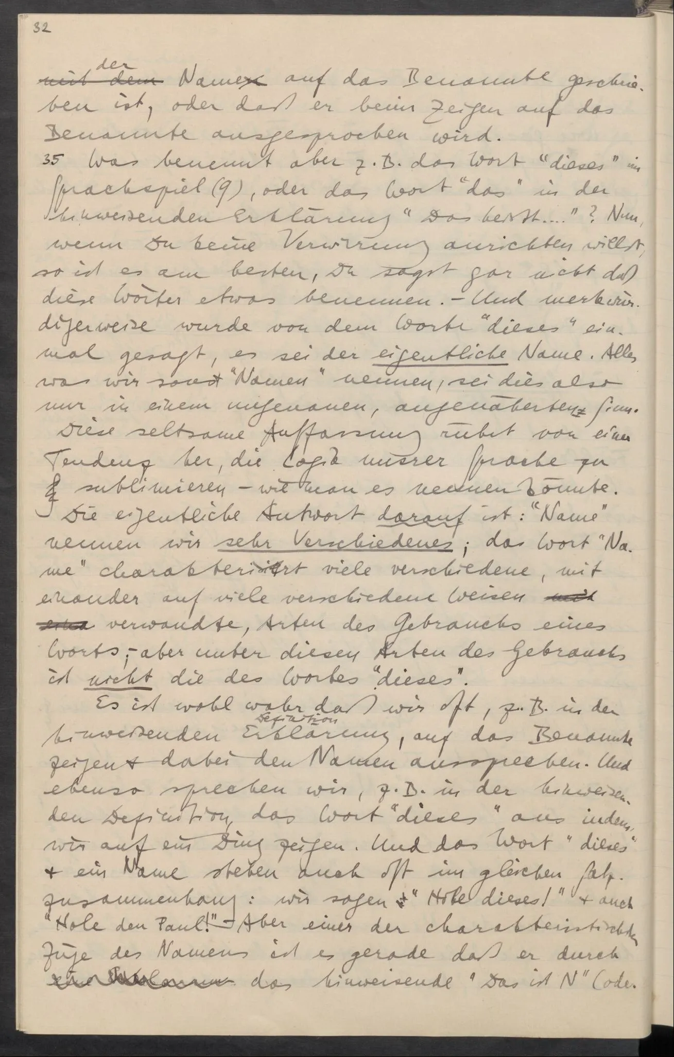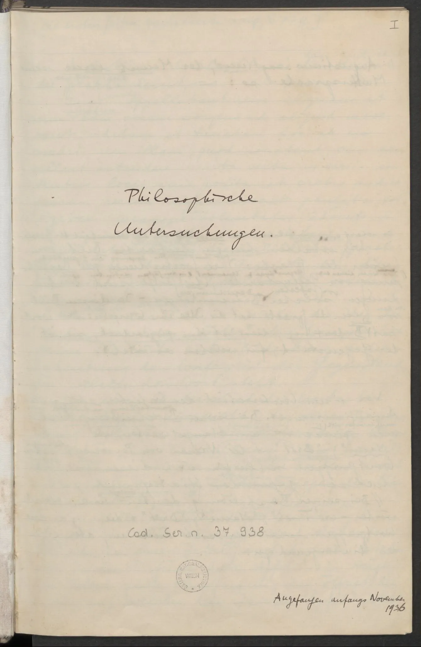 Wir erhalten, so scheint es mir, (hier) dieses Bild vom Wesen der Sprache: Ihre Wörter benennen Gegenstände; die Sätze sind Verbindungen solcher Benennungen. Hier ist das Bild, in welchem die Idee der ‘Bedeutung’ der Wörter ihre Wurzeln hat: Denn die Wörter haben Bedeutung, & die Bedeutung des Wortes ist der Gegenstand, für welchen das Wort steht.