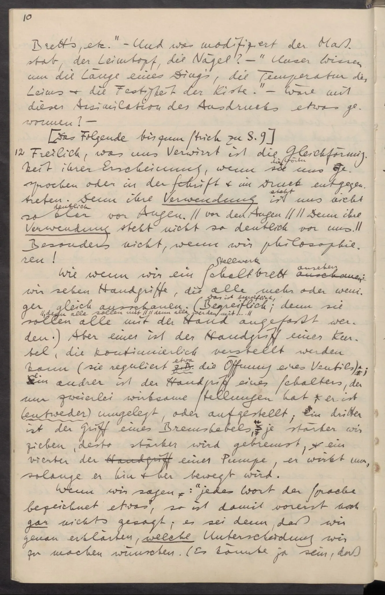 12 Freilich, was uns verwirrt ist die Gleichförmigkeit ihrer Erscheinung, wenn sie uns gesprochen oder in der Schrift & im Druck entgegentreten. Denn ihre Verwendung ist nicht so klar vor Augen Besonders nicht, wenn wir philosophieren! Wie wenn wir ein Schaltbrett ansehen: wir sehen Handgriffe, die alle mehr oder weniger gleich ausschauen. (Begreiflich; denn sie sollen alle mit der Hand angefaßt werden.) Aber einer ist der Handgriff einer Kurbel, die kontinuierlich verstellt werden kann (sie reguliert etwa die Öffnung eines Ventils); ein andrer ist der Handgriff eines Schalters, der nur zweierlei wirksame Stellungen hat, er ist (entweder) umgelegt, oder aufgestellt; ein dritter ist der Griff eines Bremshebels, je stärker wir ziehen, desto stärker wird gebremst; ein vierter der einer Pumpe, er wirkt nur, solange er hin & her bewegt wird. Wenn wir sagen: “jedes Wort der Sprache bezeichnet etwas”, so ist damit vorerst noch gar nichts gesagt; es sei denn, daß wir genau erklärten, welche Unterscheidung wir zu machen wünschen. (Es könnte ja sein, daß wir die Wörter der Sprache (9) von Wörtern ‘ohne Bedeutung’ unterscheiden wollen, wie sie in Gedichten Lewis Carrolls vorkommen.)