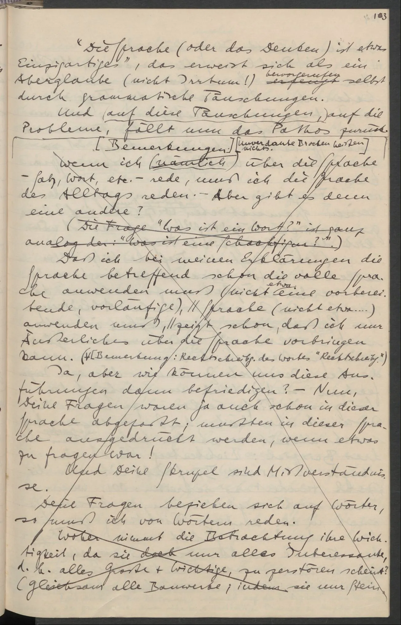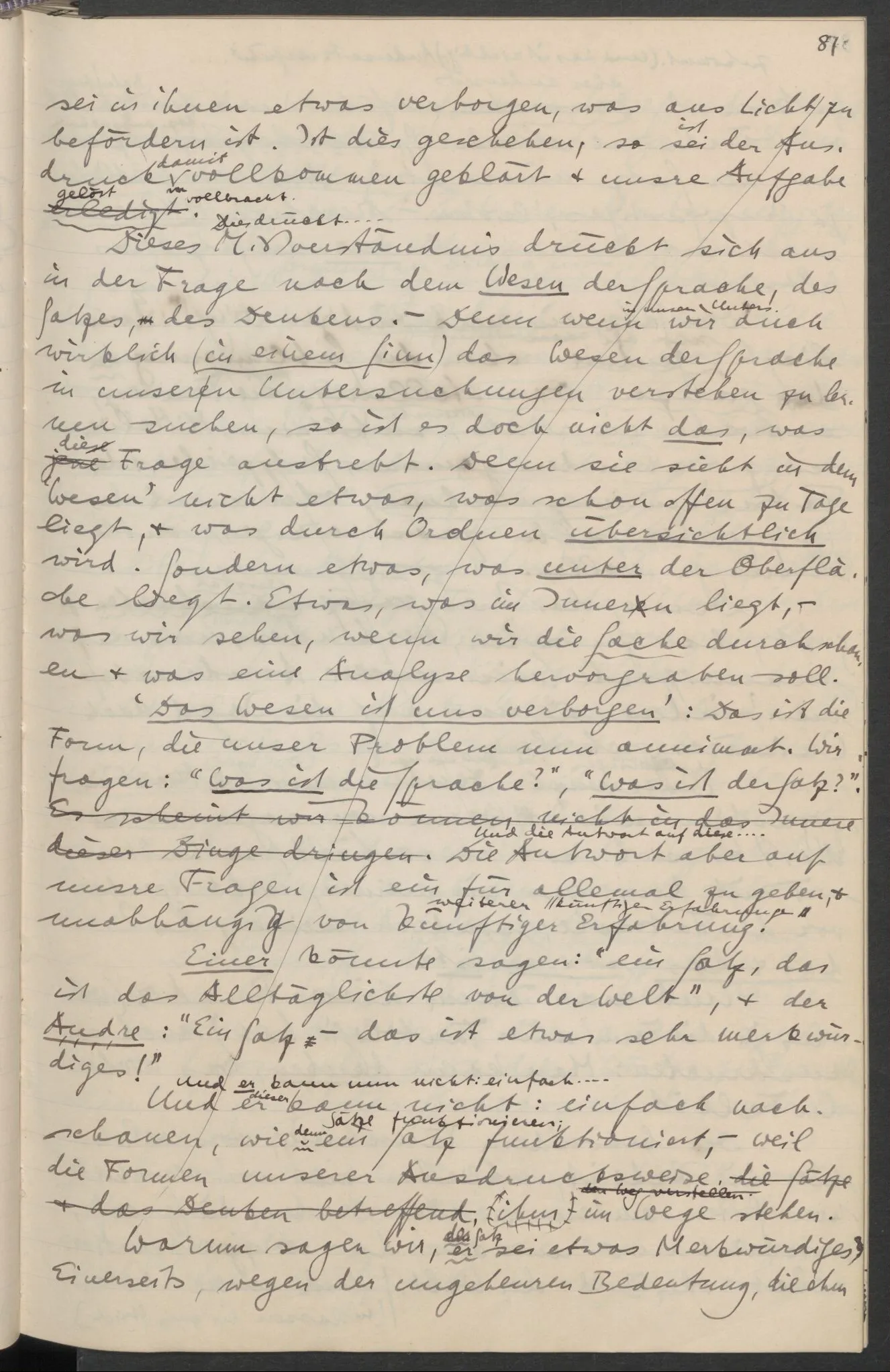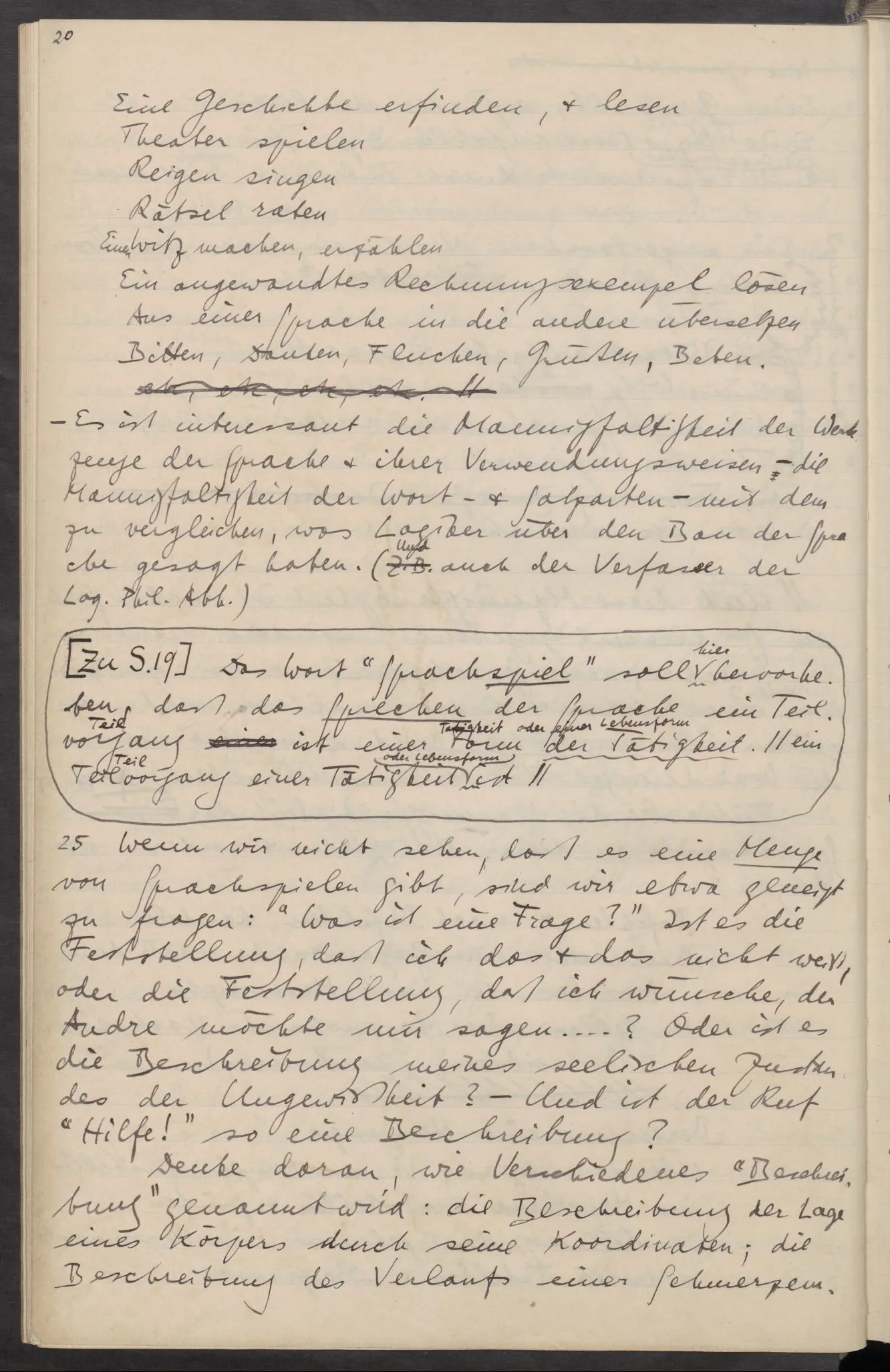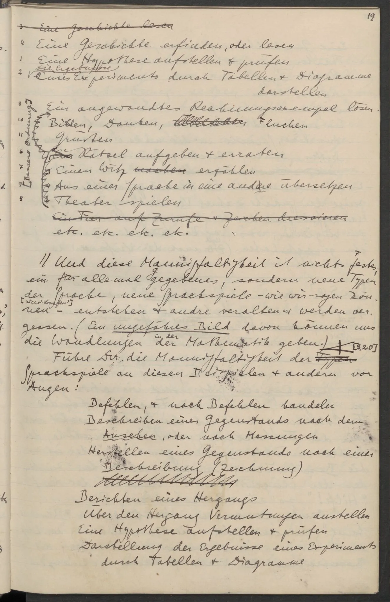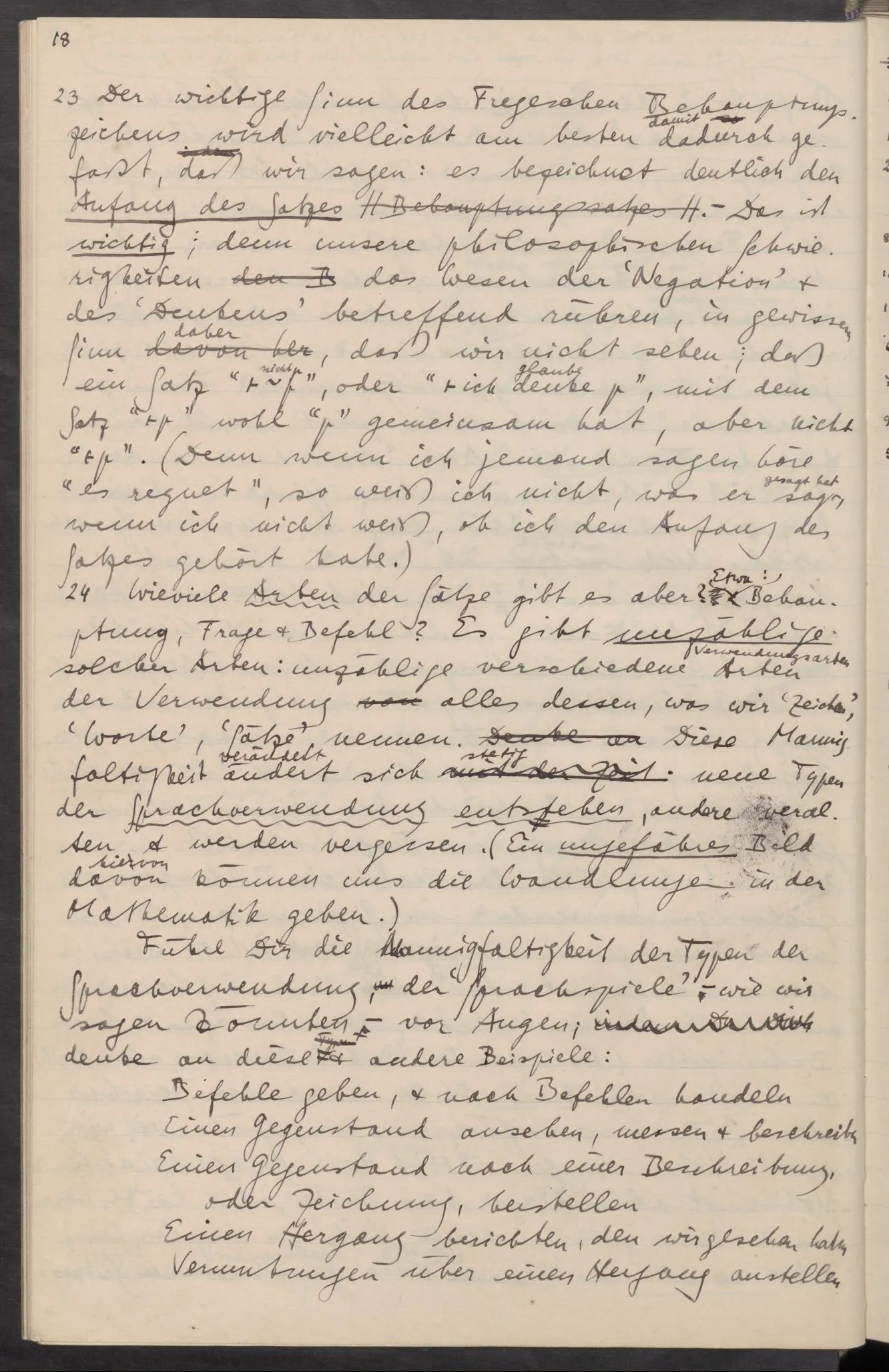 – Es ist interessant die Mannigfaltigkeit der Werkzeuge der Sprache & ihrer Verwendungsweisen – die Mannigfaltigkeit der Wort- & Satzarten – mit dem zu vergleichen, was Logiker über den Bau der Sprache gesagt haben. (Und auch der Verfasser der Log. Phil. Abh..)