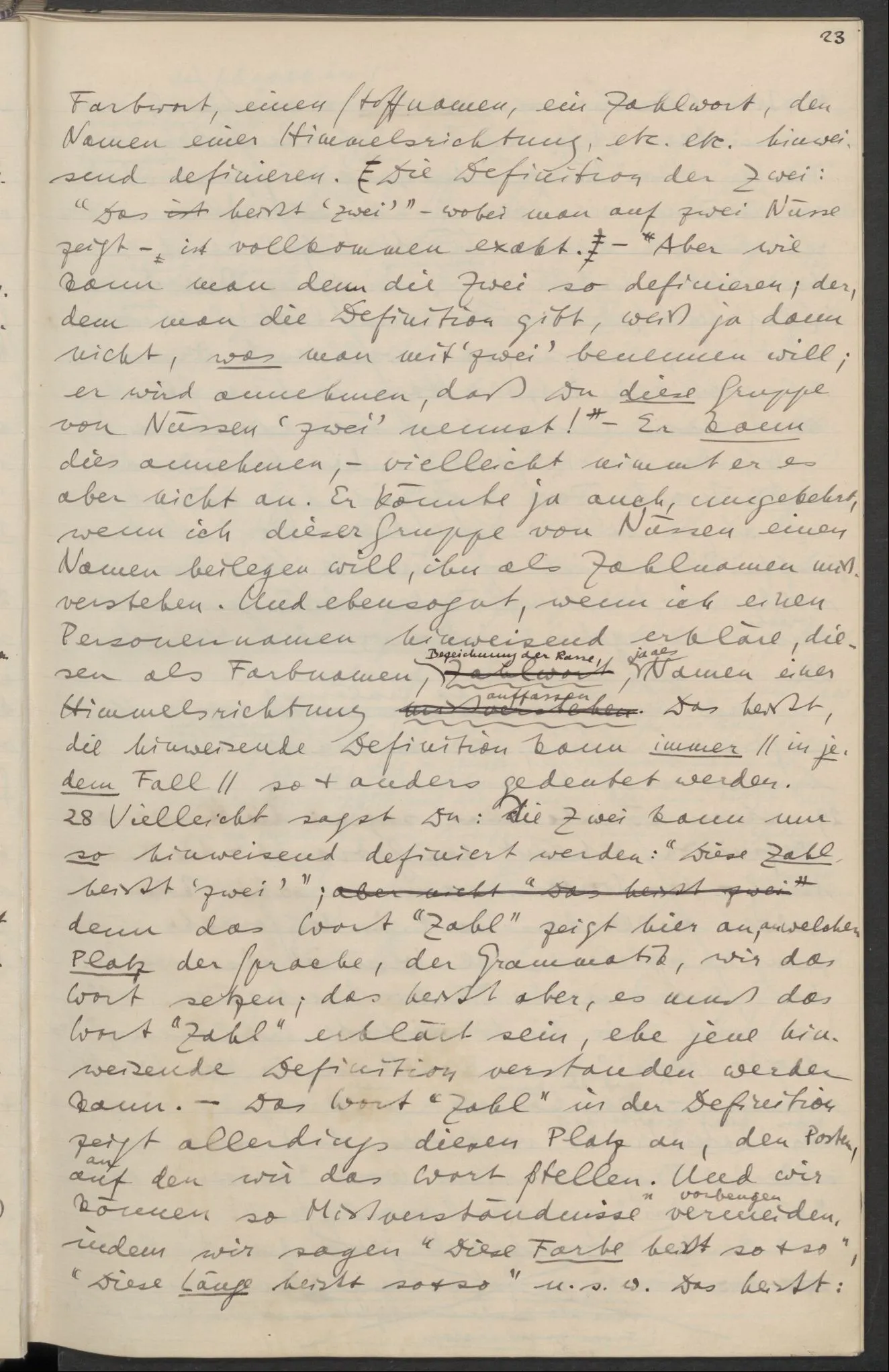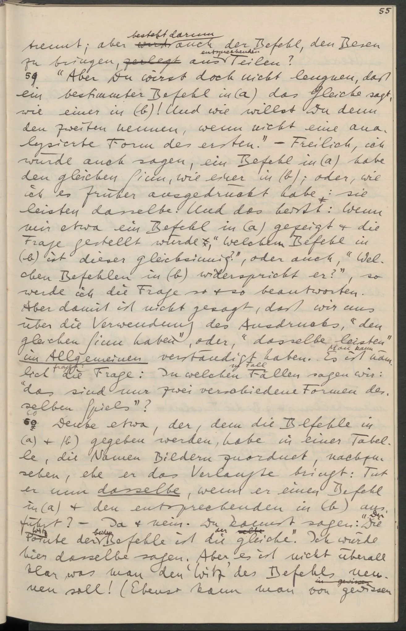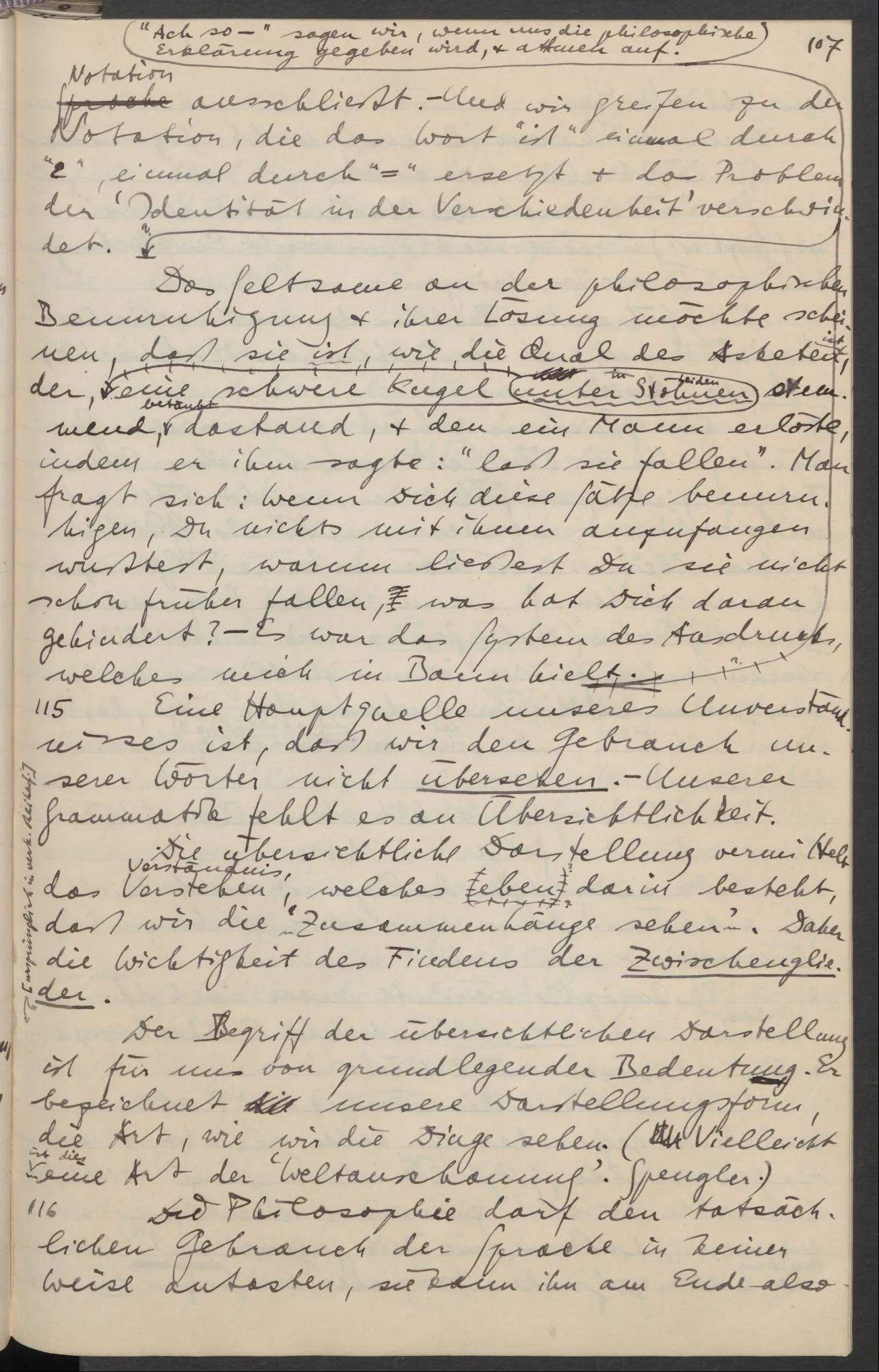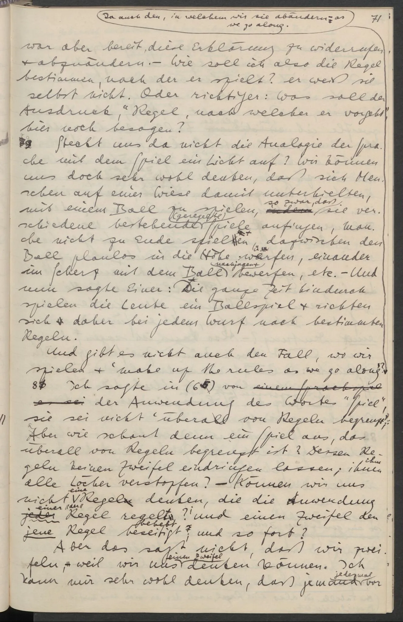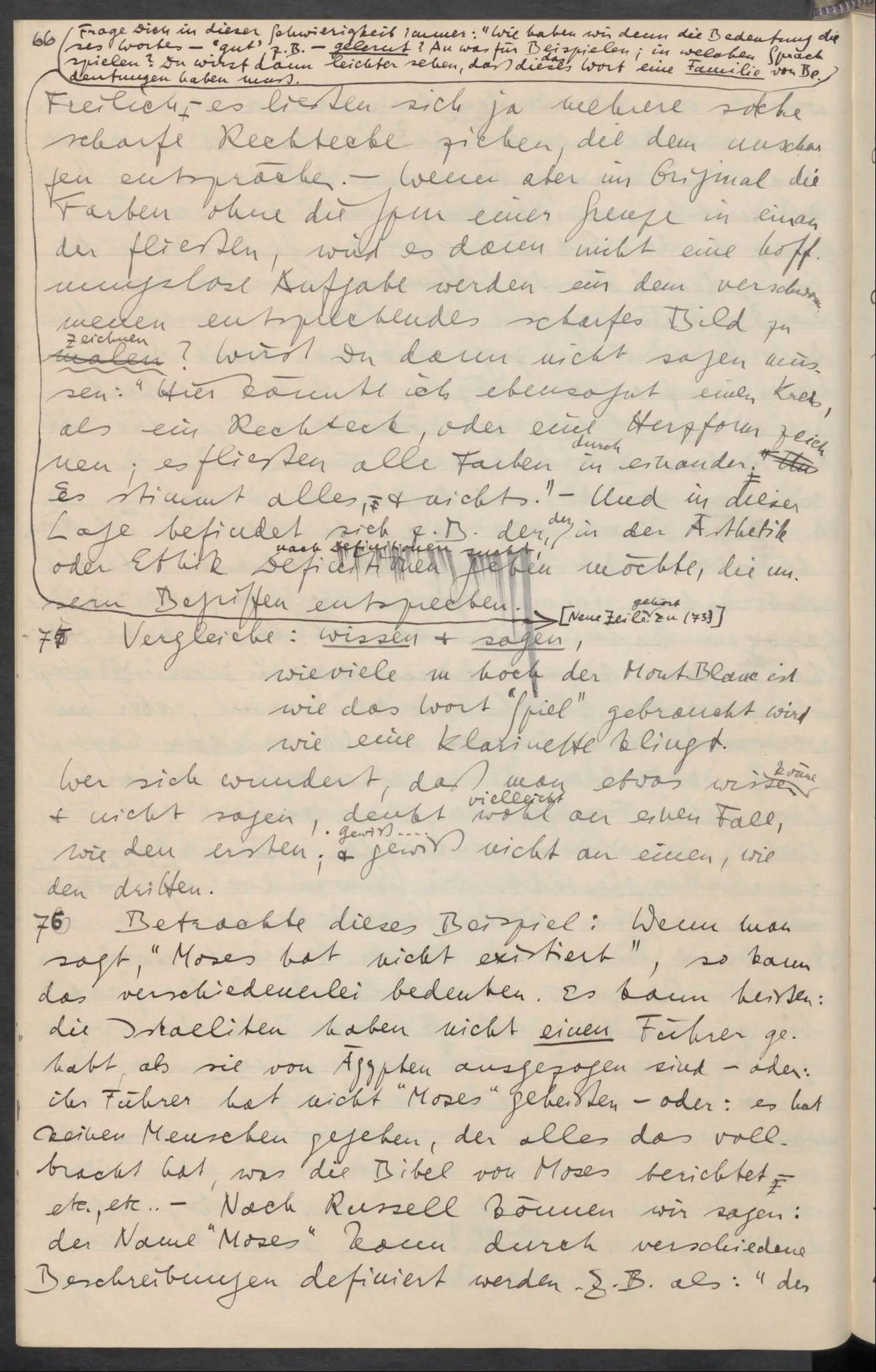 – Es ist interessant die Mannigfaltigkeit der Werkzeuge der Sprache & ihrer Verwendungsweisen – die Mannigfaltigkeit der Wort- & Satzarten – mit dem zu vergleichen, was Logiker über den Bau der Sprache gesagt haben. (Und auch der Verfasser der Log. Phil. Abh..)