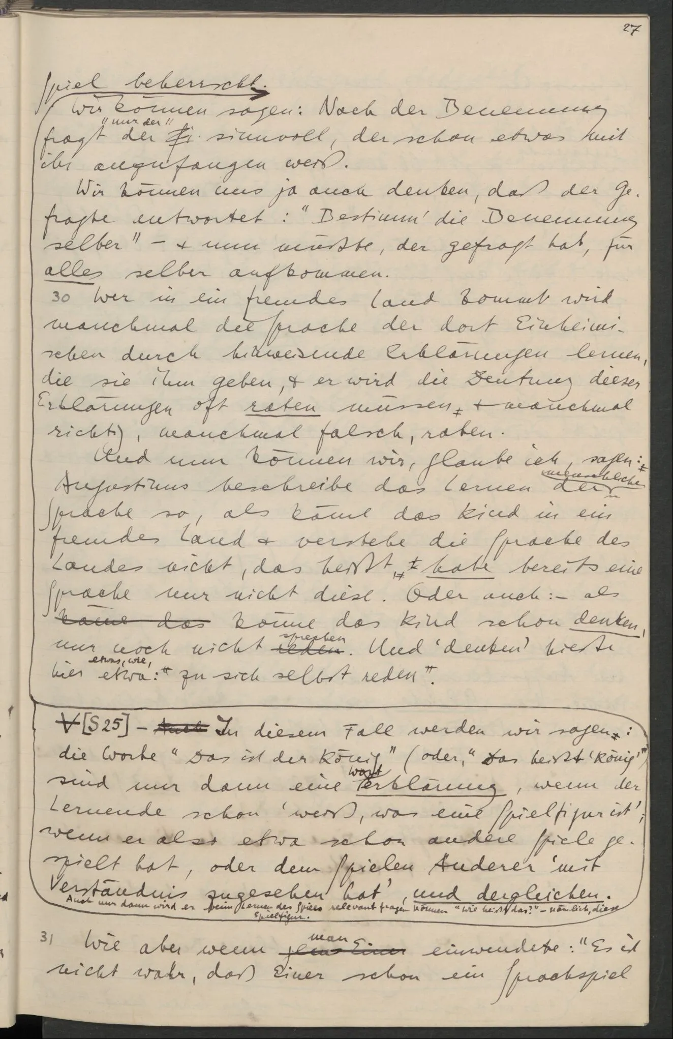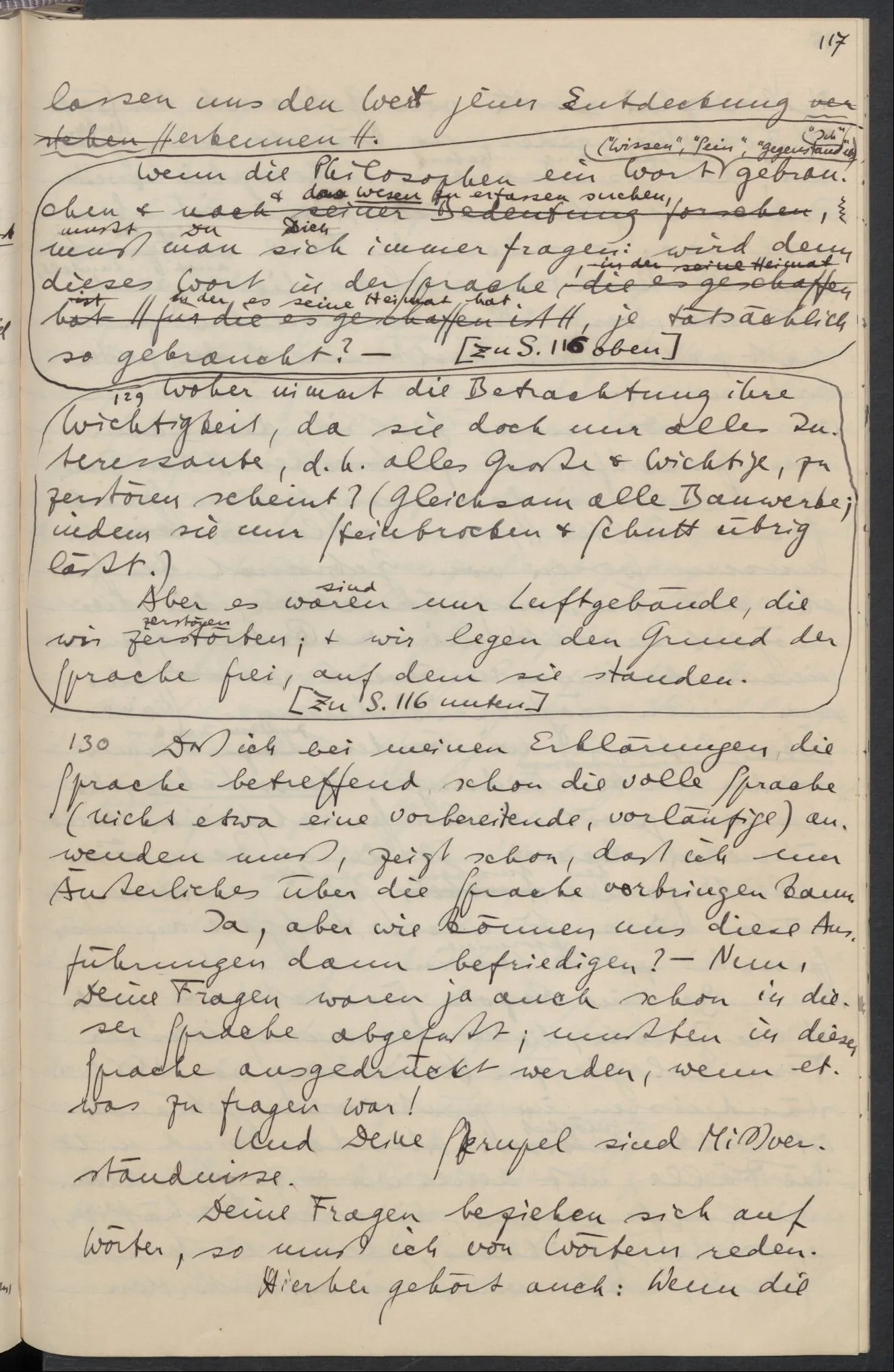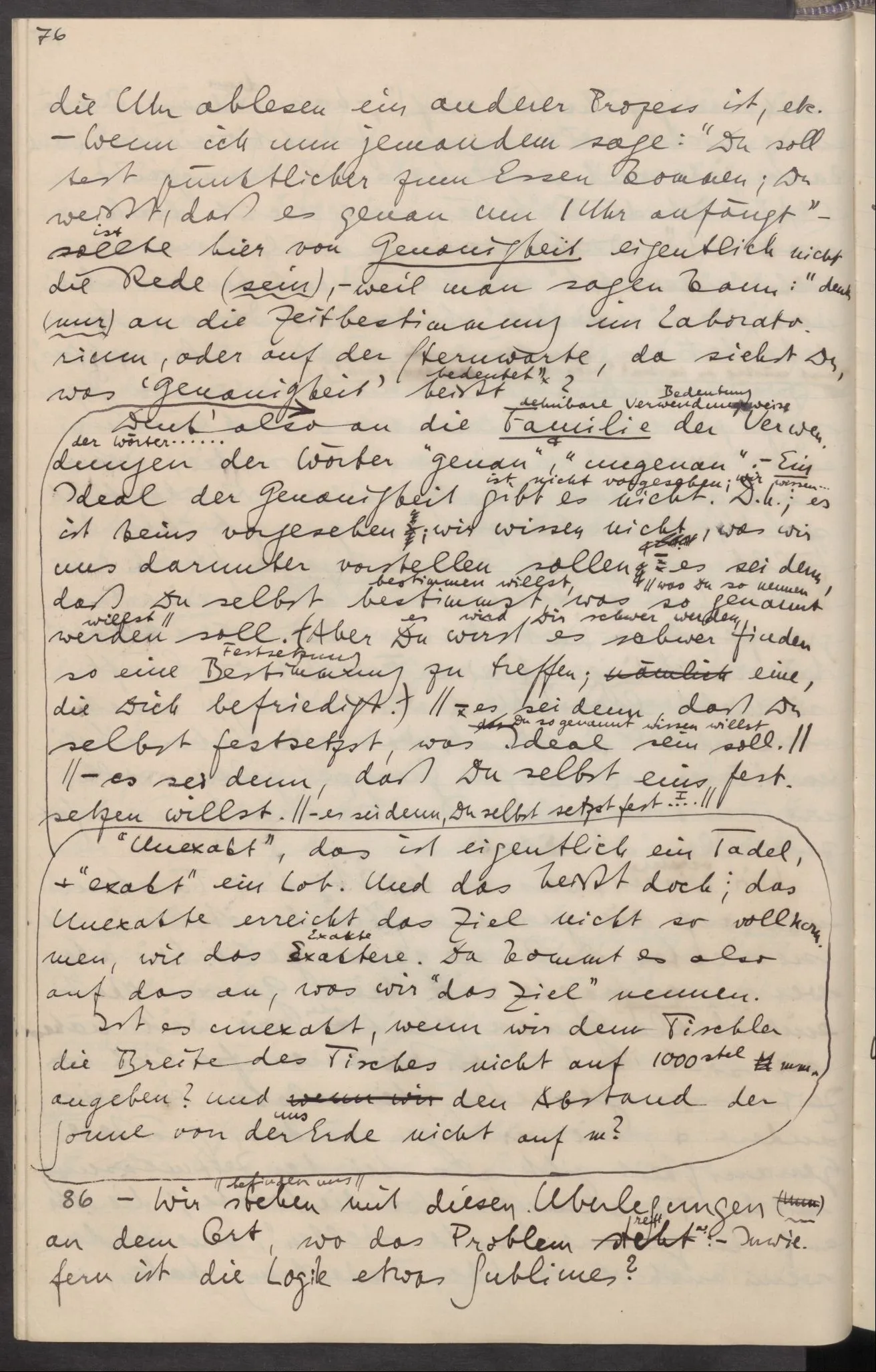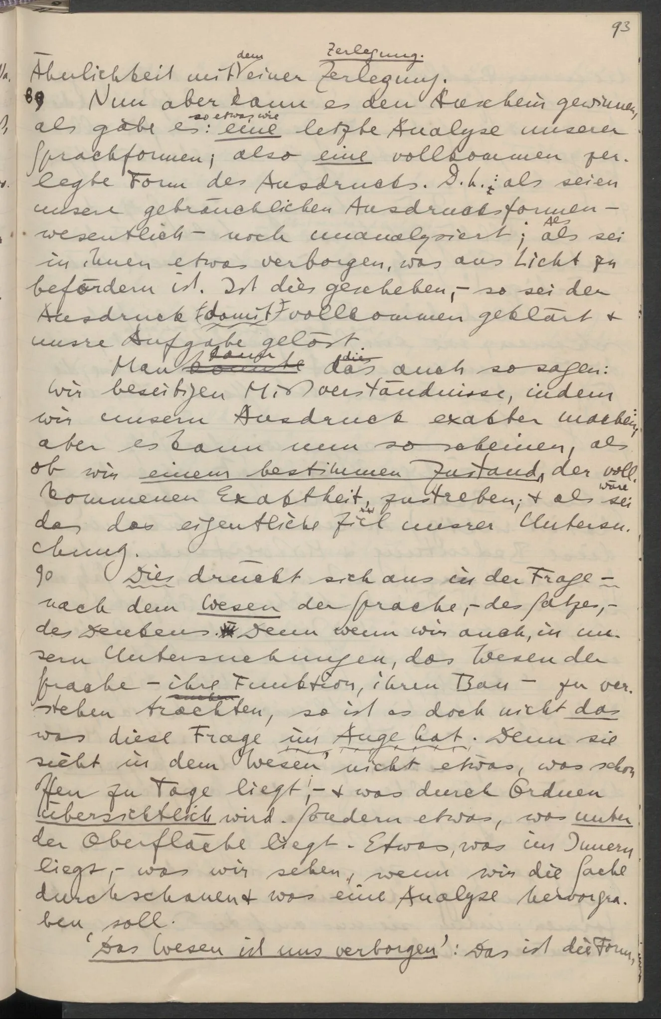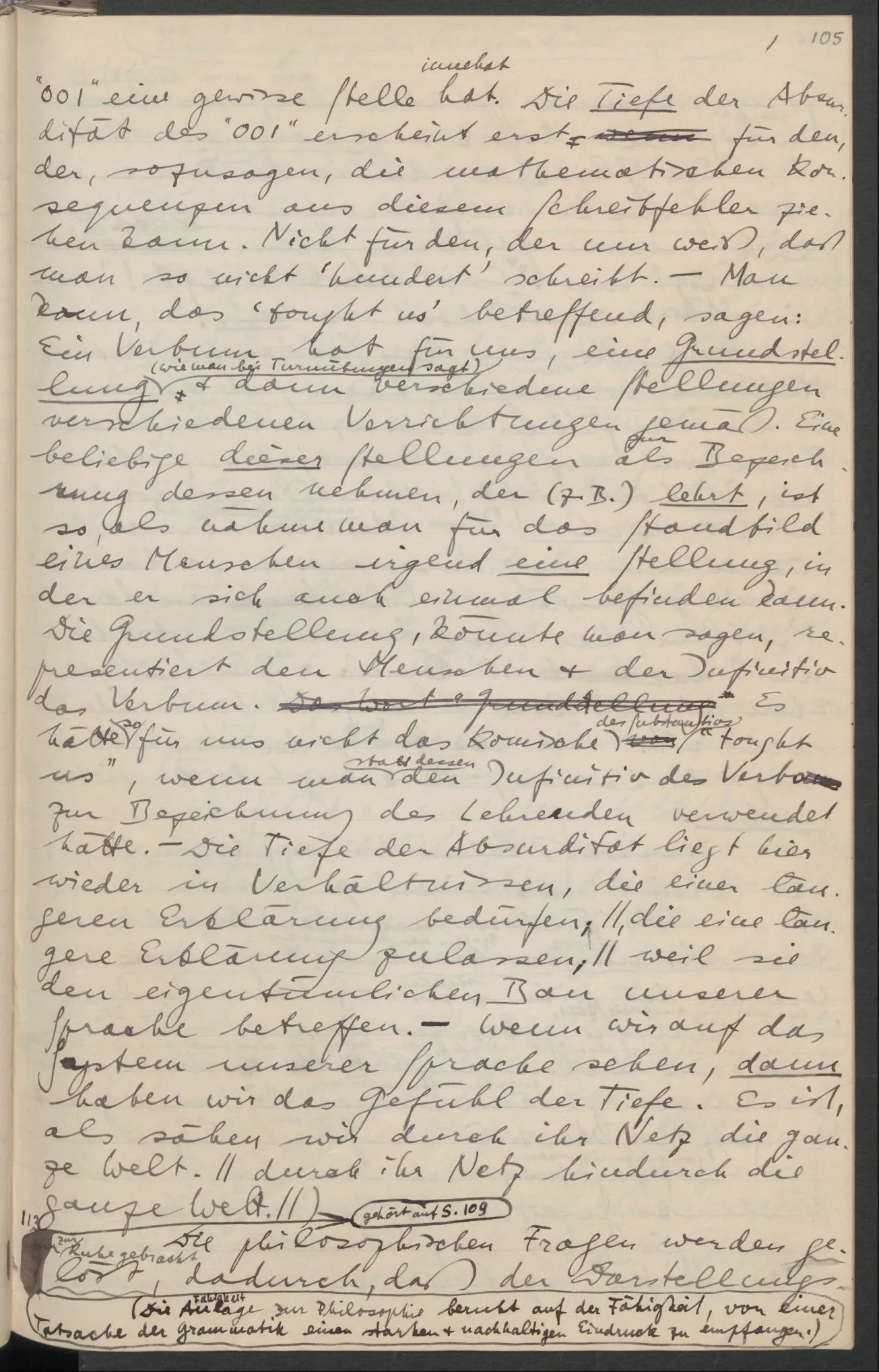– Es ist interessant die Mannigfaltigkeit der Werkzeuge der Sprache & ihrer Verwendungsweisen – die Mannigfaltigkeit der Wort- & Satzarten – mit dem zu vergleichen, was Logiker über den Bau der Sprache gesagt haben. (Und auch der Verfasser der Log. Phil. Abh..)