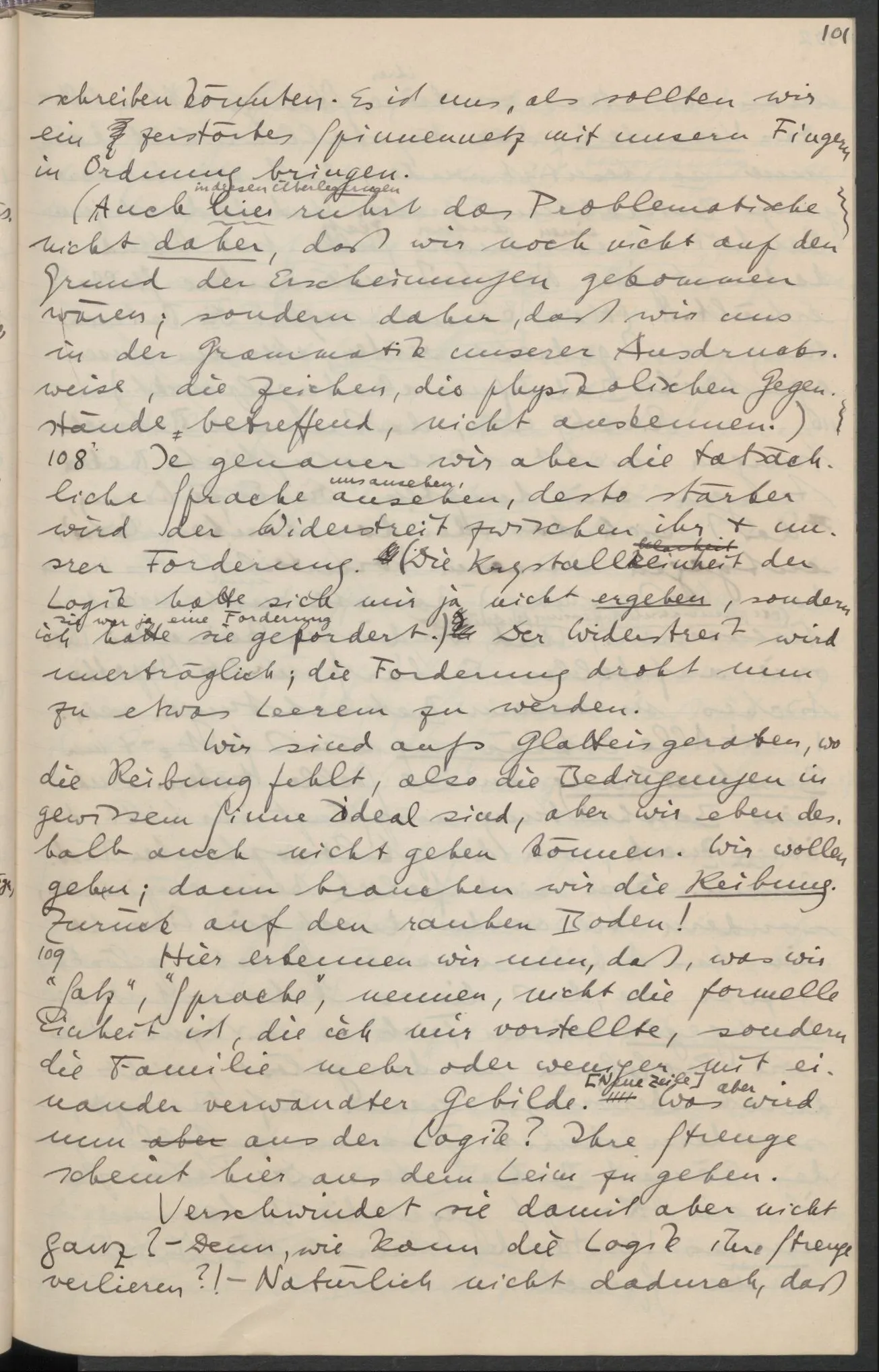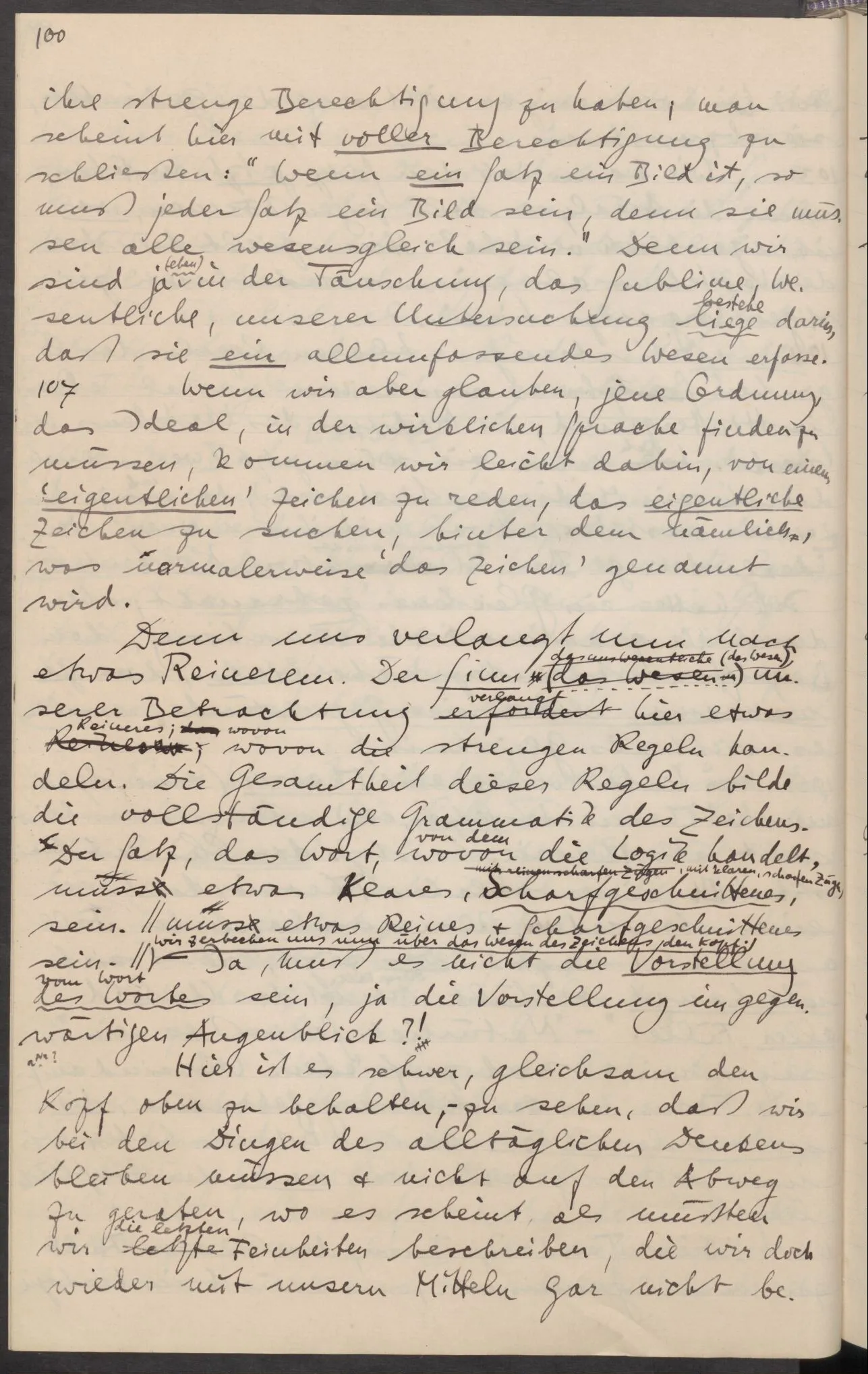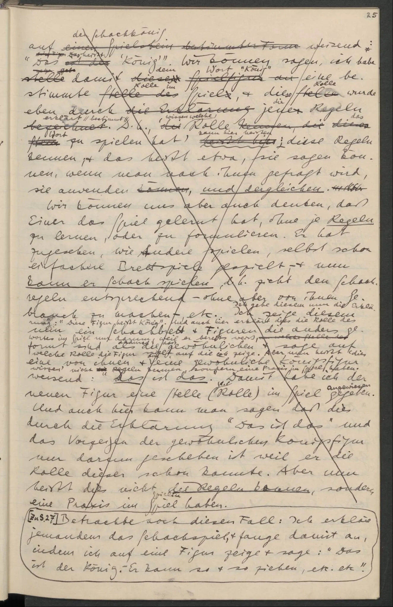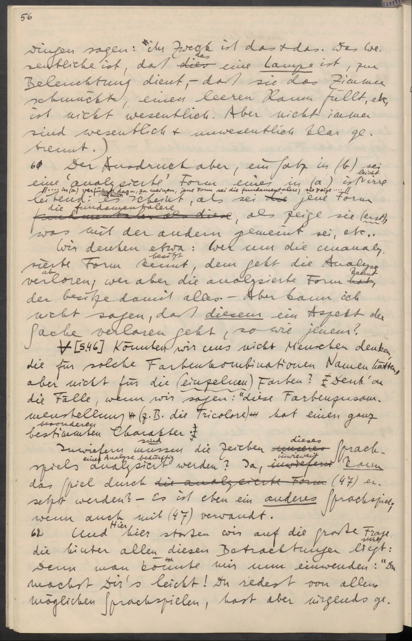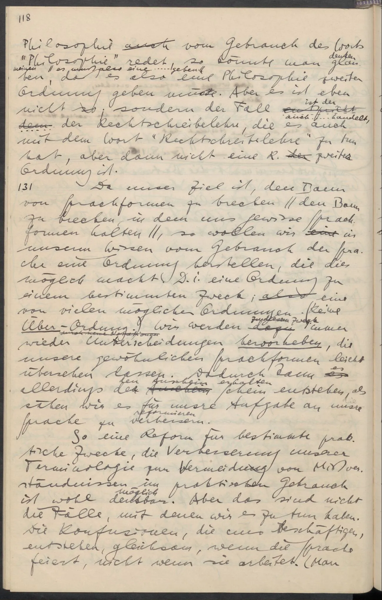 – Es ist interessant die Mannigfaltigkeit der Werkzeuge der Sprache & ihrer Verwendungsweisen – die Mannigfaltigkeit der Wort- & Satzarten – mit dem zu vergleichen, was Logiker über den Bau der Sprache gesagt haben. (Und auch der Verfasser der Log. Phil. Abh..)