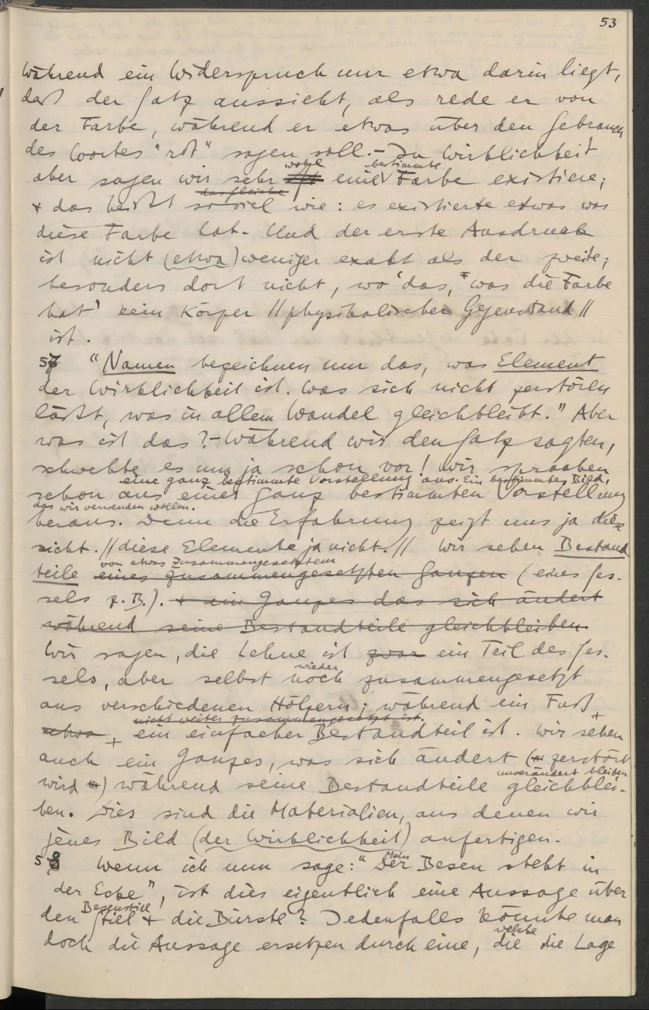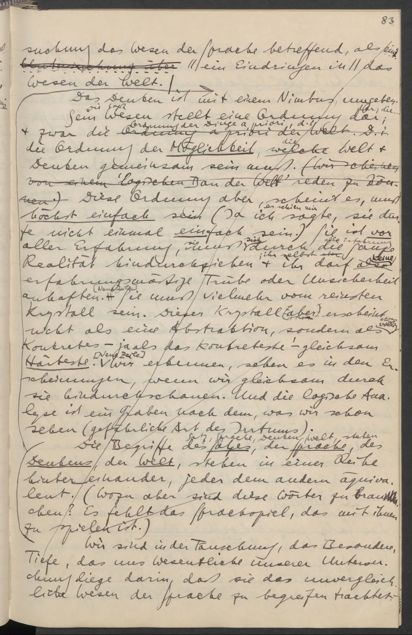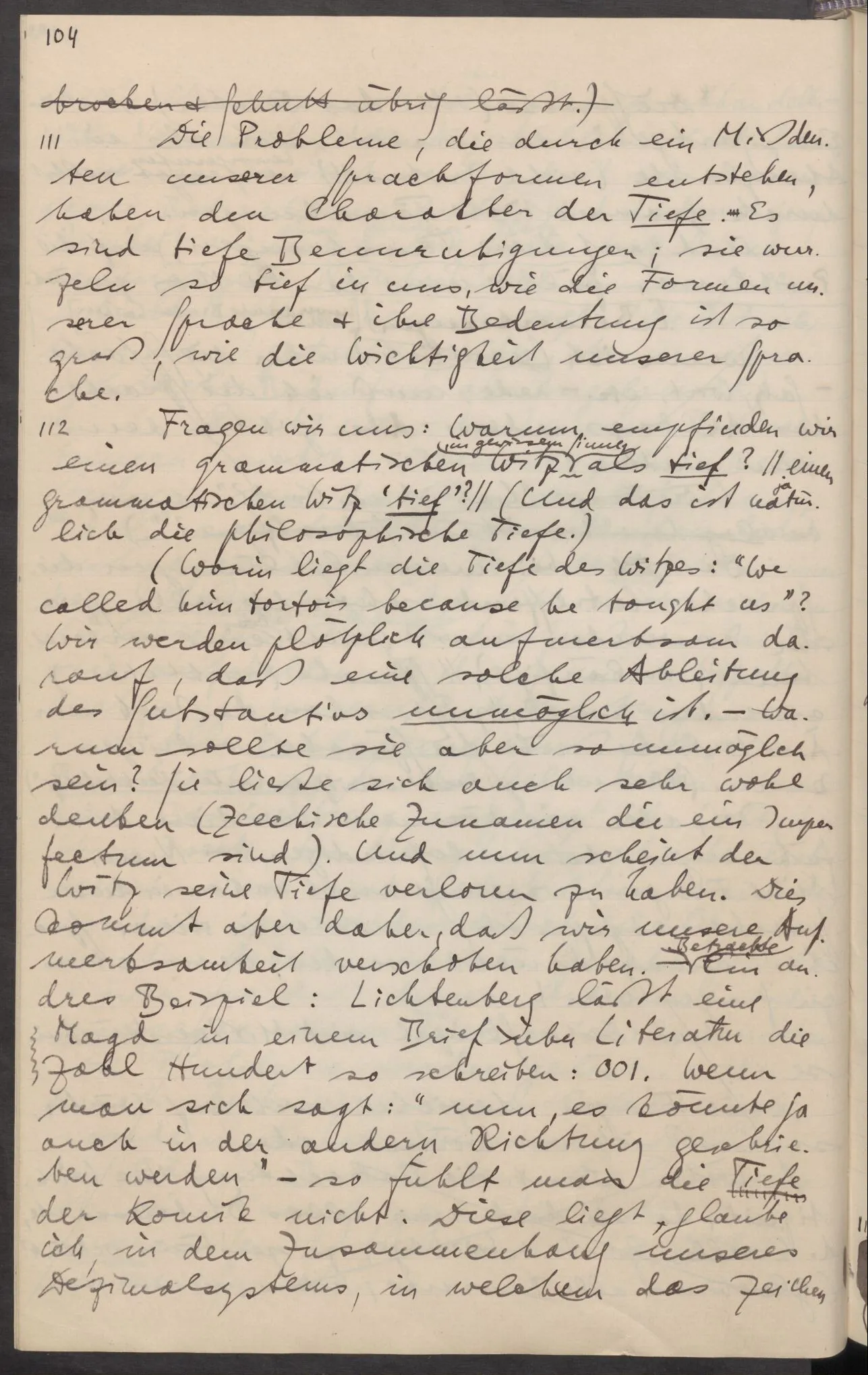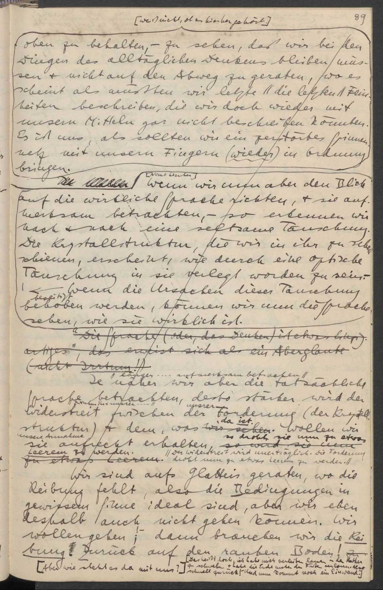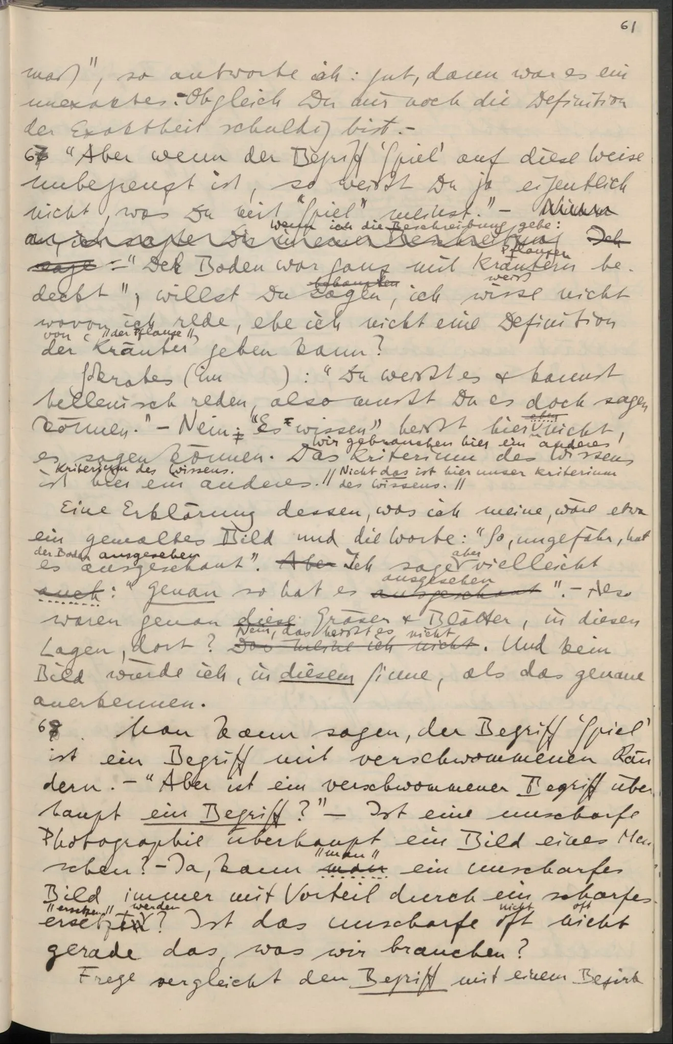– Es ist interessant die Mannigfaltigkeit der Werkzeuge der Sprache & ihrer Verwendungsweisen – die Mannigfaltigkeit der Wort- & Satzarten – mit dem zu vergleichen, was Logiker über den Bau der Sprache gesagt haben. (Und auch der Verfasser der Log. Phil. Abh..)