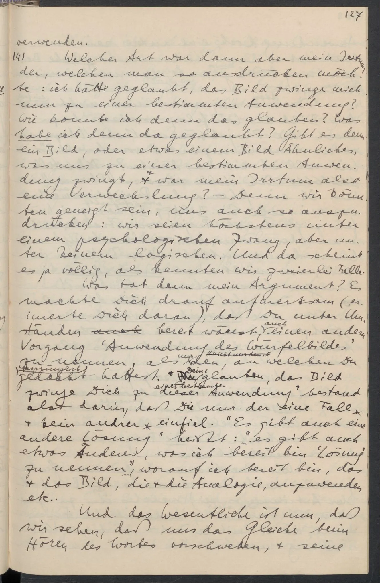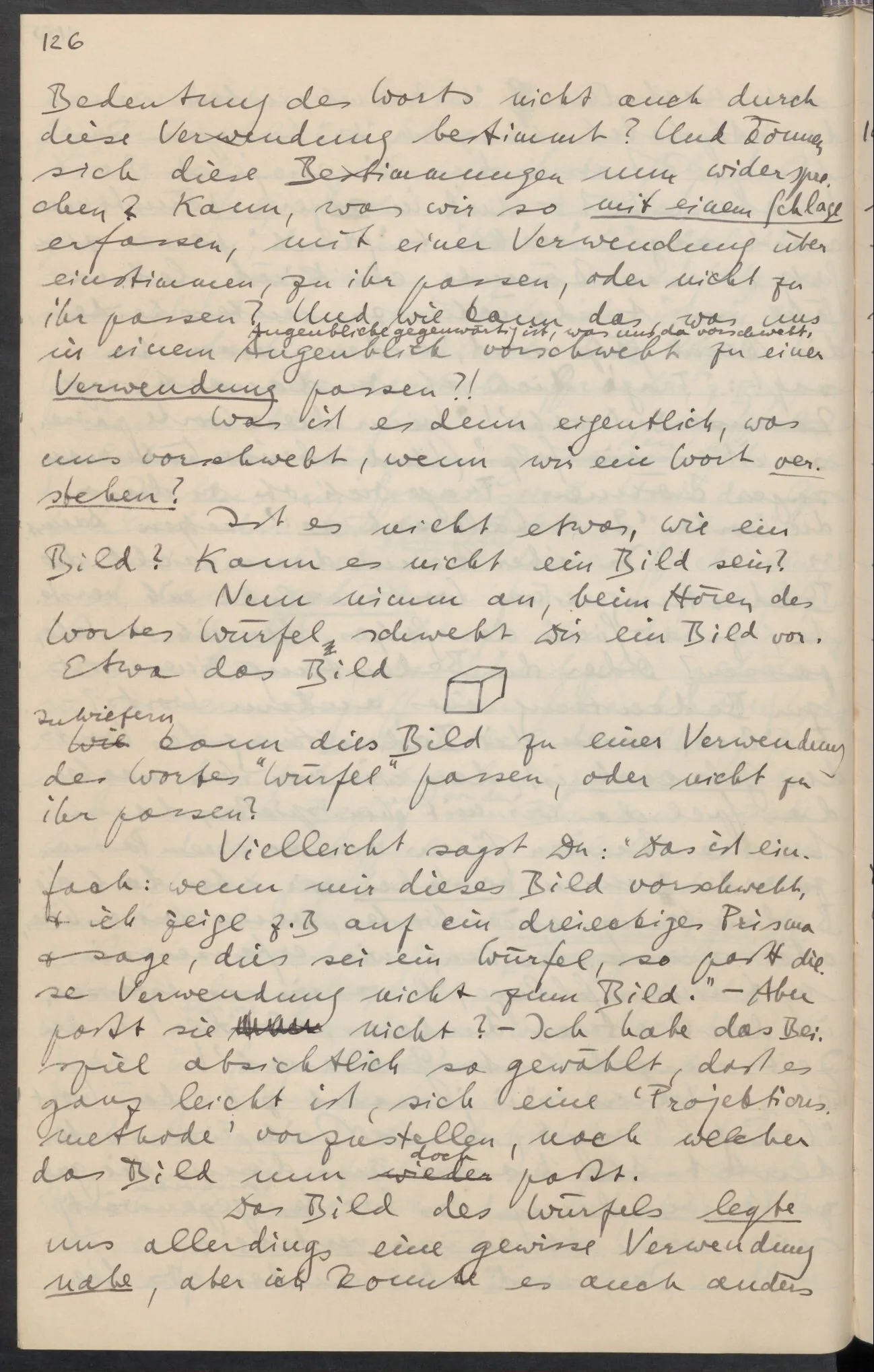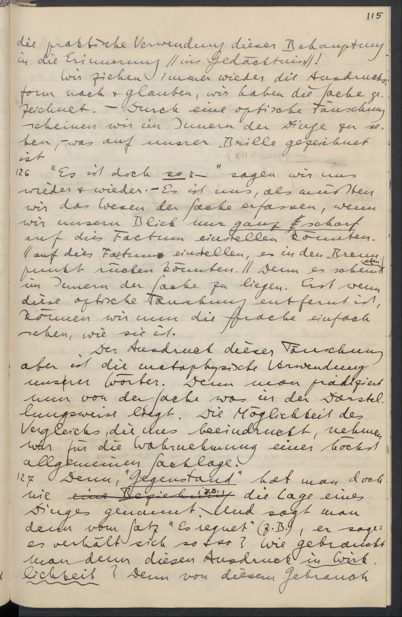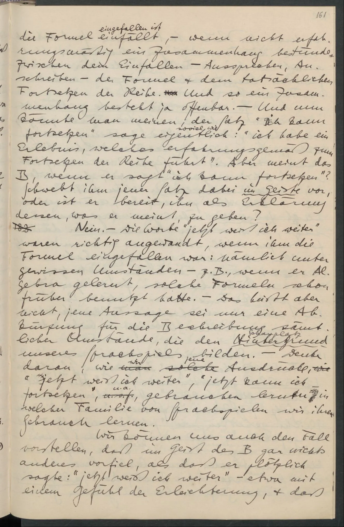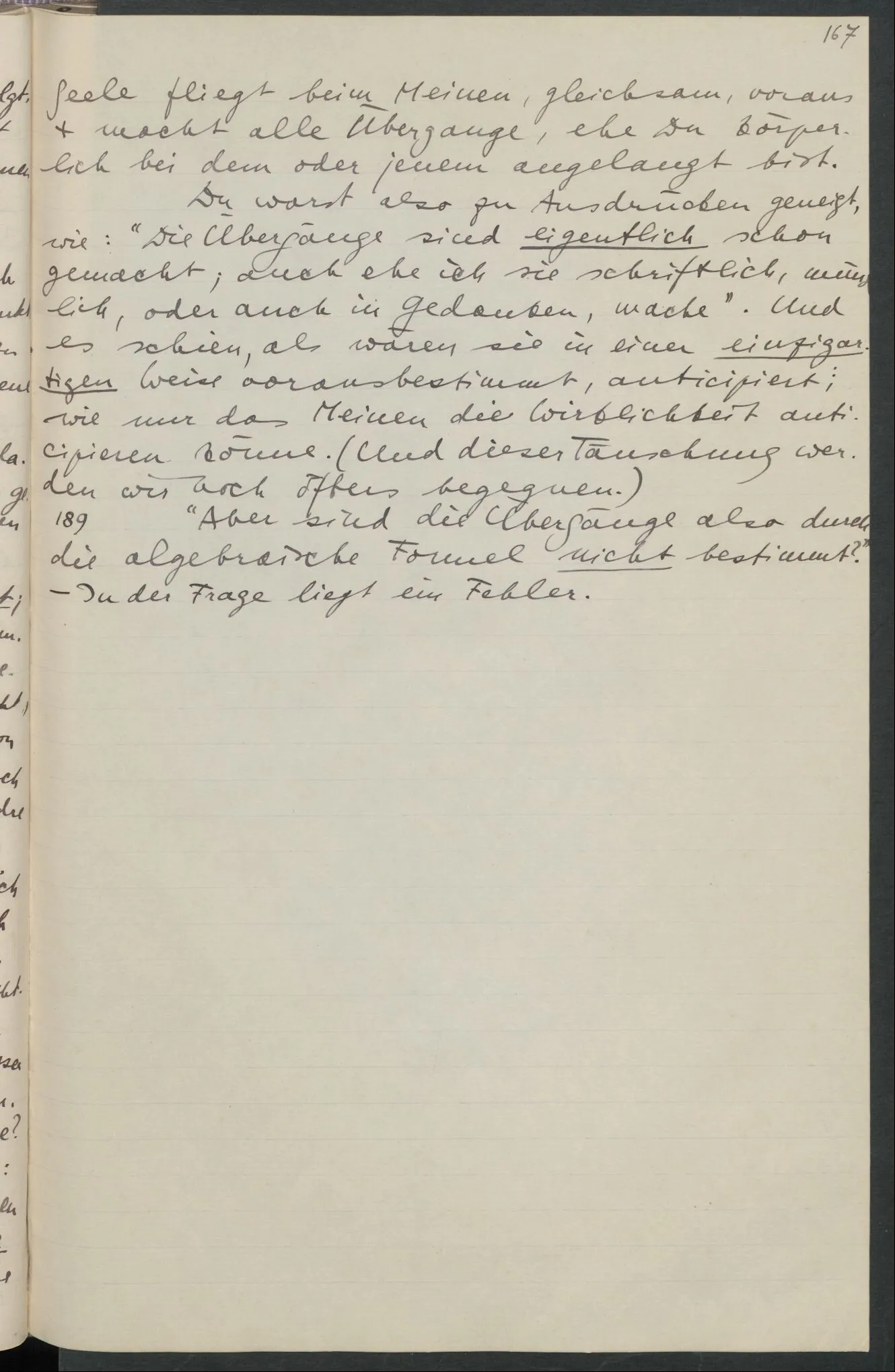 188 Da möchte ich zuerst sagen: Deine Idee sei die gewesen, jenes Meinen des Befehls habe auf seine Weise alle die Übergänge doch schon gemacht: Deine Seele fliegt beim Meinen, gleichsam, voraus & macht alle Übergänge, ehe Du körperlich bei dem oder jenem angelangt bist. Du warst also zu Ausdrücken geneigt, wie: “Die Übergänge sind eigentlich schon gemacht; auch ehe ich sie schriftlich, mündlich, oder auch in Gedanken, mache”. Und es schien, als wären sie in einer einzigartigen Weise vorausbestimmt, antizipiert, wie nur das Meinen die Wirklichkeit antizipieren könne. (Und dieser Täuschung werden wir noch öfters begegnen.)